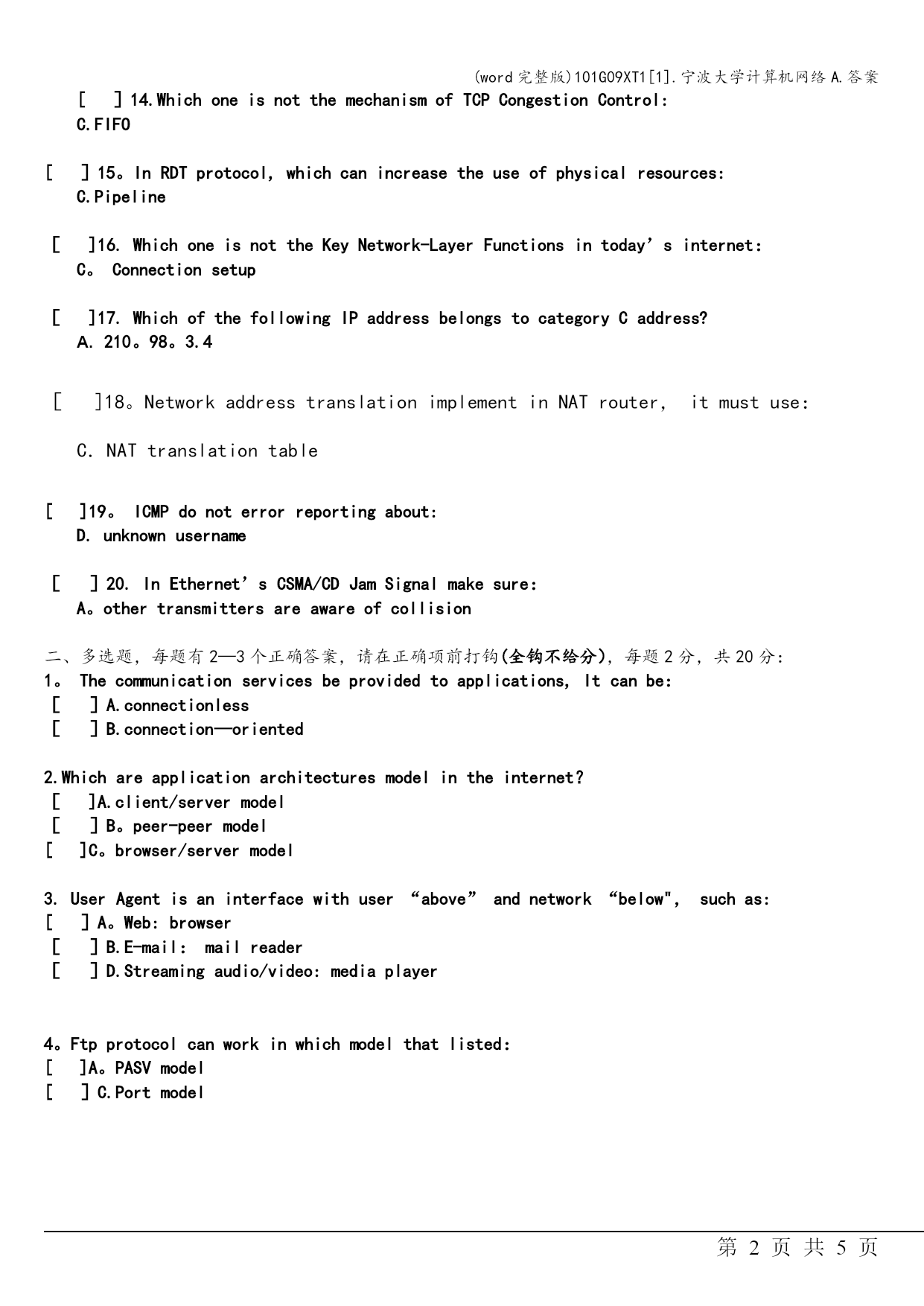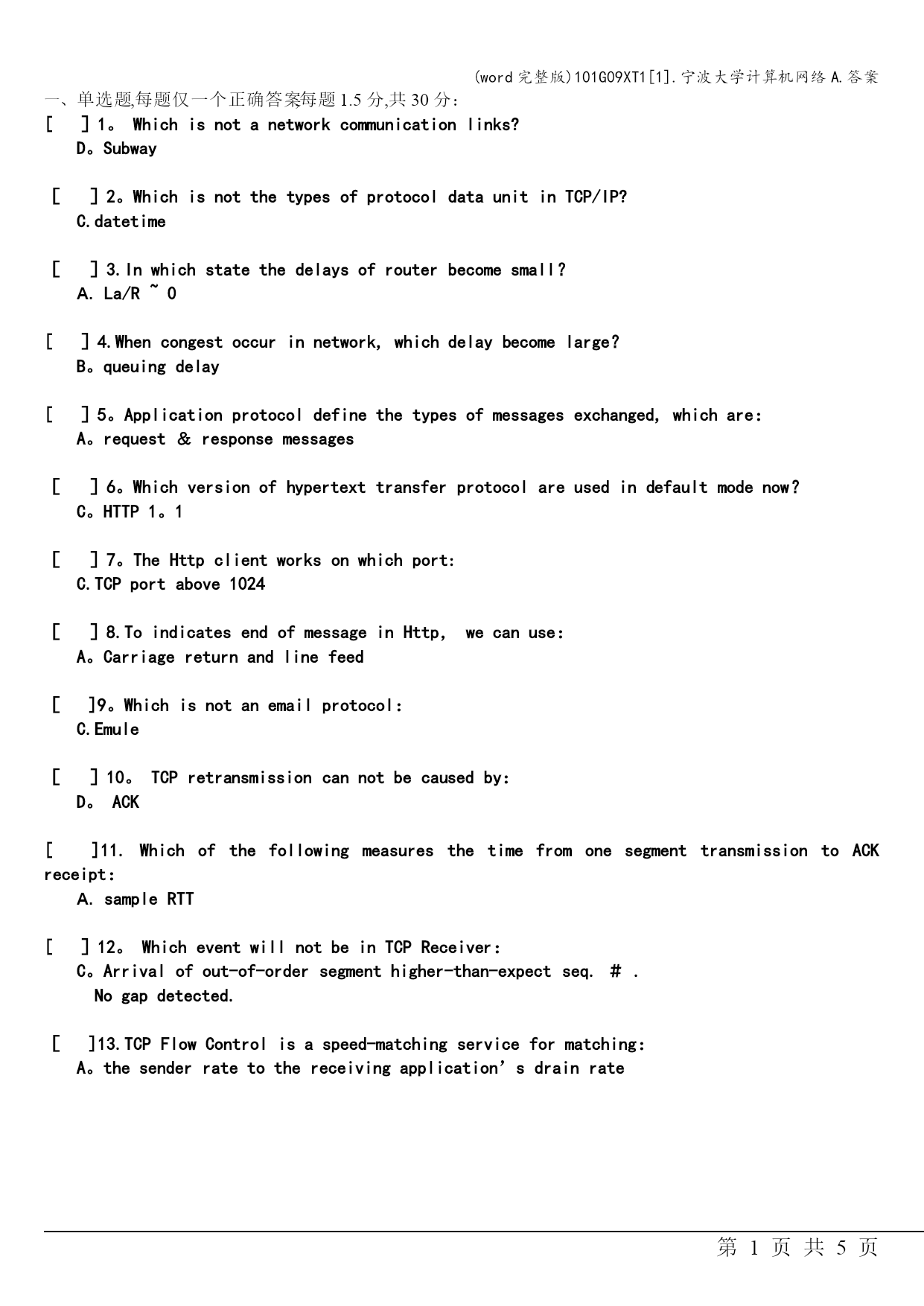 (word完整版)101G09XT1[1].宁波大学计算机网络A.答案 (word完整版)101G09XT1[1].宁波大学计算机网络A.答案 第页共NUMPAGES5页 (word完整版)101G09XT1[1].宁波大学计算机网络A.答案 单选题,每题仅一个正确答案,每题1.5分,共30分: []1。Whichisnotanetworkcommunicationlinks? D。Subway []2。WhichisnotthetypesofprotocoldataunitinTCP/IP? C.datetime []3.Inwhichstatethedelaysofrouterbecomesmall? La/R~0 []4.Whencongestoccurinnetwork,whichdelaybecomelarge? B。queuingdelay []5。Applicationprotocoldefinethetypesofmessagesexchanged,whichare: A。request&responsemessages []6。Whichversionofhypertexttransferprotocolareusedindefaultmodenow? C。HTTP1。1 []7。TheHttpclientworksonwhichport: C.TCPportabove1024 []8.ToindicatesendofmessageinHttp,wecanuse: A。Carriagereturnandlinefeed []9。Whichisnotanemailprotocol: C.Emule []10。TCPretransmissioncannotbecausedby: D。ACK []11.WhichofthefollowingmeasuresthetimefromonesegmenttransmissiontoACKreceipt: sampleRTT []12。WhicheventwillnotbeinTCPReceiver: C。Arrivalofout-of-ordersegmenthigher-than-expectseq.#. Nogapdetected. []13.TCPFlowControlisaspeed-matchingserviceformatching: A。thesenderratetothereceivingapplication’sdrainrate []14.WhichoneisnotthemechanismofTCPCongestionControl: C.FIFO []15。InRDTprotocol,whichcanincreasetheuseofphysicalresources: C.Pipeline []16.WhichoneisnottheKeyNetwork-LayerFunctionsintoday’sinternet: C。Connectionsetup []17.WhichofthefollowingIPaddressbelongstocategoryCaddress? 210。98。3.4 []18。NetworkaddresstranslationimplementinNATrouter,itmustuse: C.NATtranslationtable []19。ICMPdonoterrorreportingabout: D.unknownusername []20.InEthernet’sCSMA/CDJamSignalmakesure: A。othertransmittersareawareofcollision 二、多选题,每题有2—3个正确答案,请在正确项前打钩(全钩不给分),每题2分,共20分: 1。Thecommunicationservicesbeprovidedtoapplications,Itcanbe: []A.connectionless []B.connection—oriented 2.Whichareapplicationarchitecturesmodelintheinternet? []A.client/servermodel []B。peer-peermodel []C。browser/servermodel 3.UserAgentisaninterfacewithuser“above”andnetwork“below",suchas: []A。Web:browser []B.E-mail:mailreader []D.Streamin