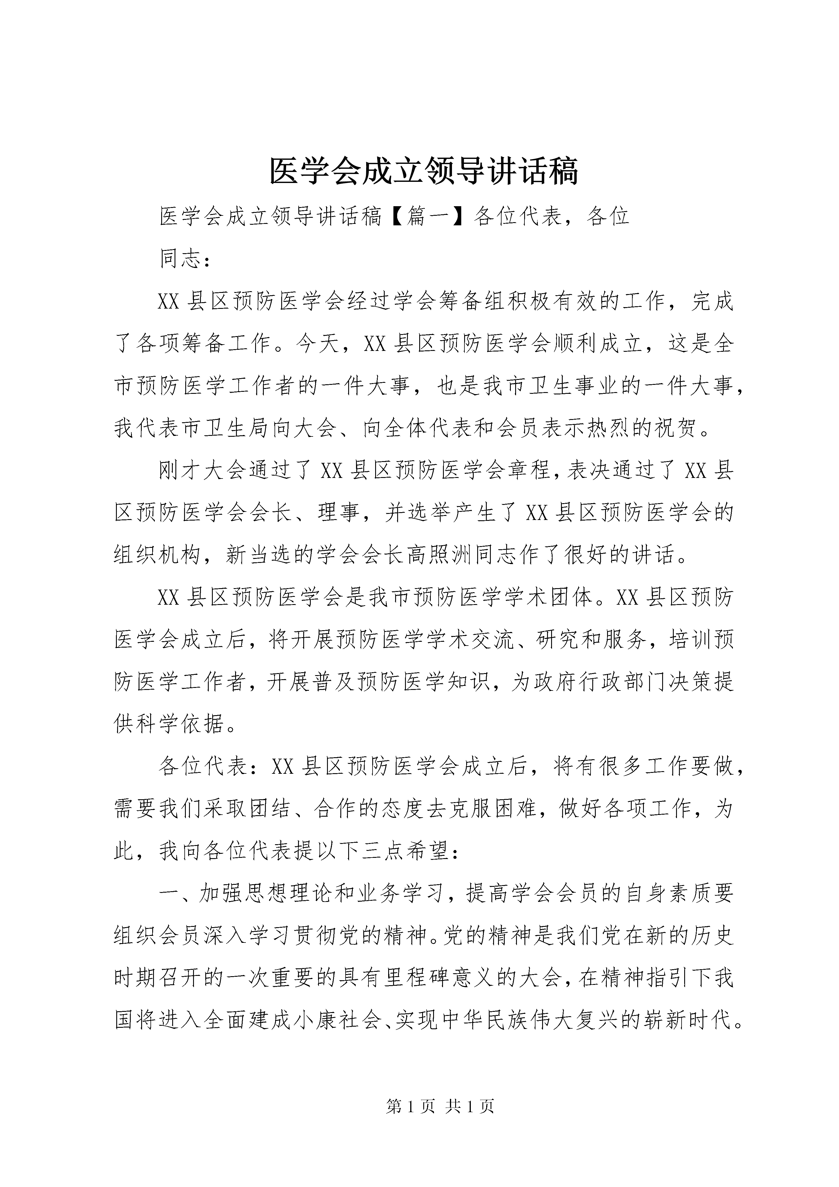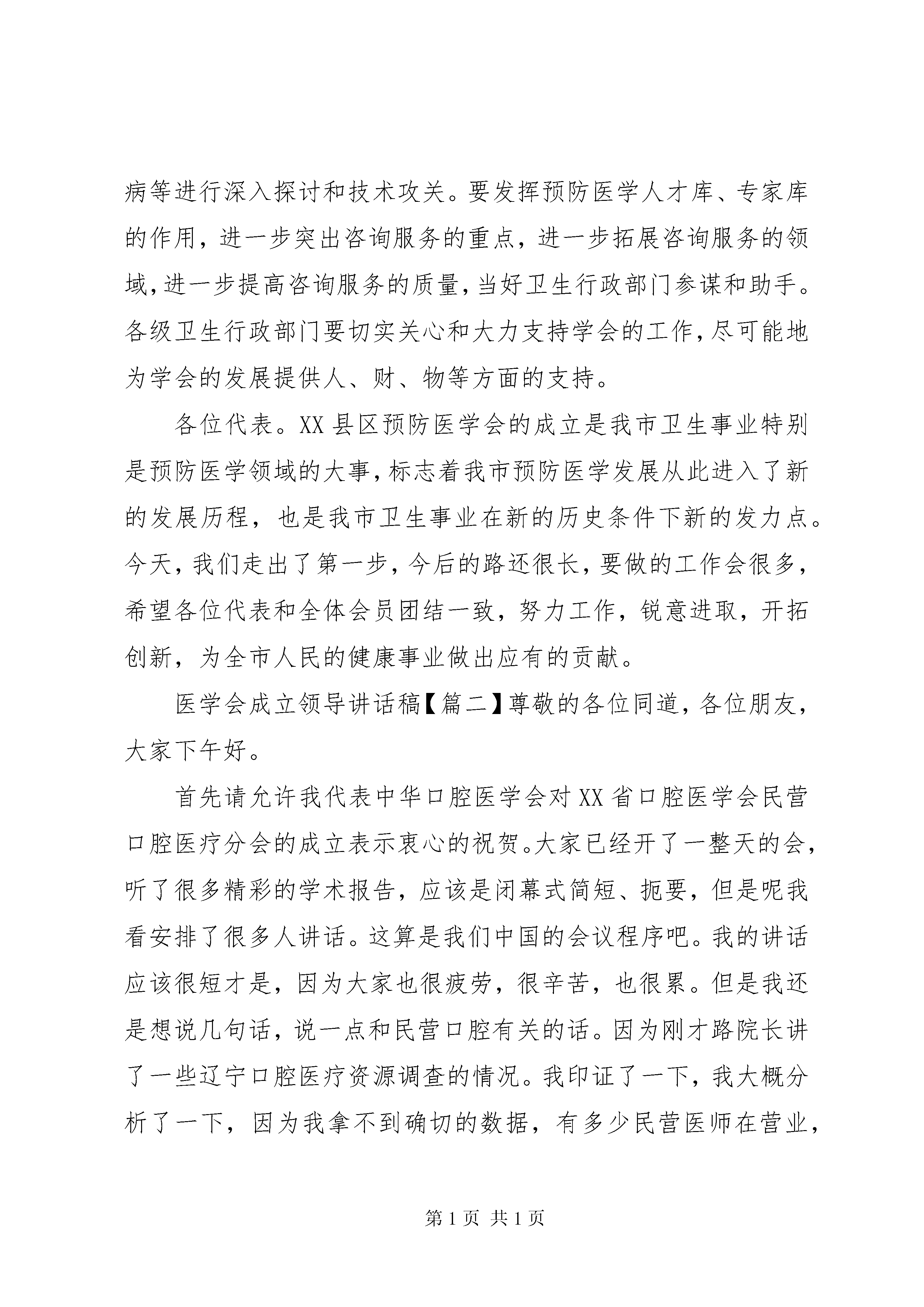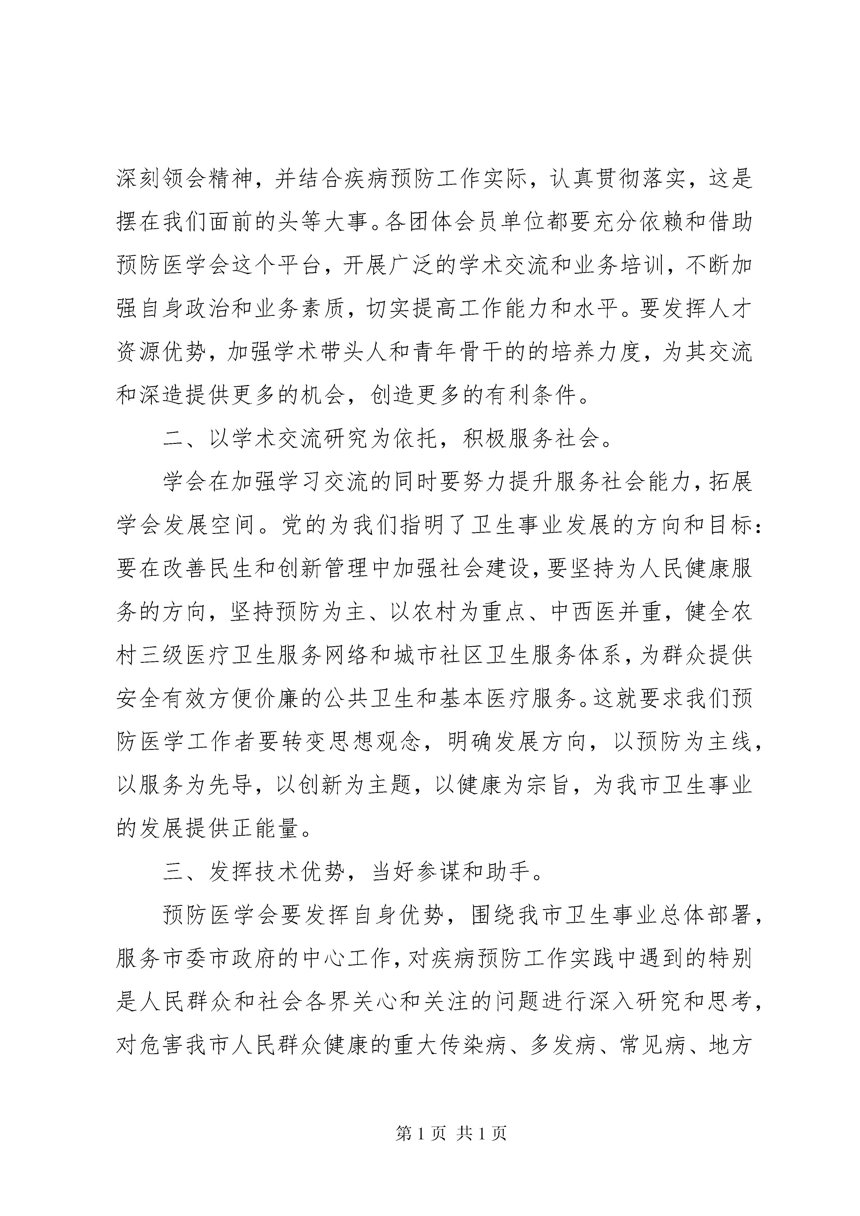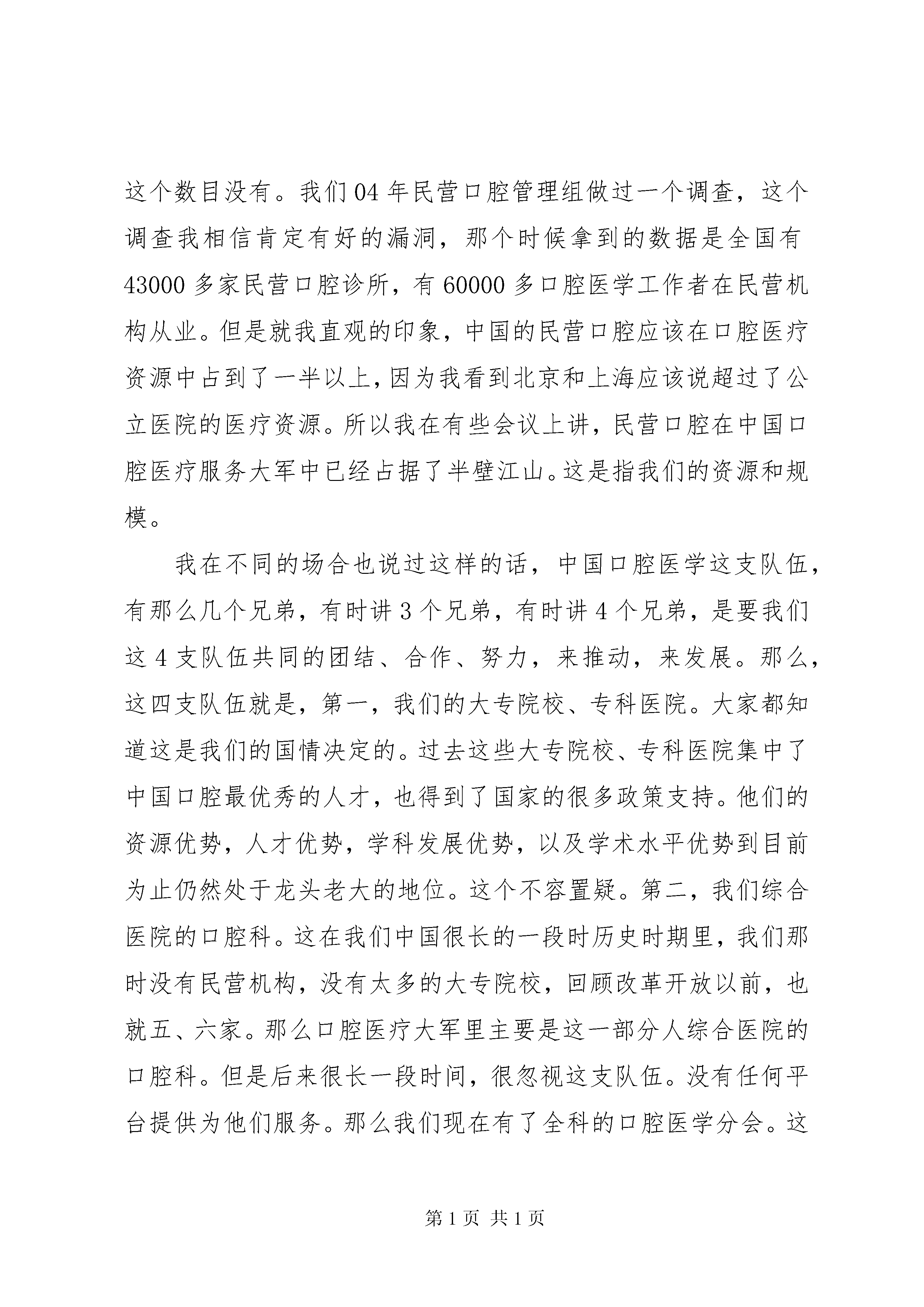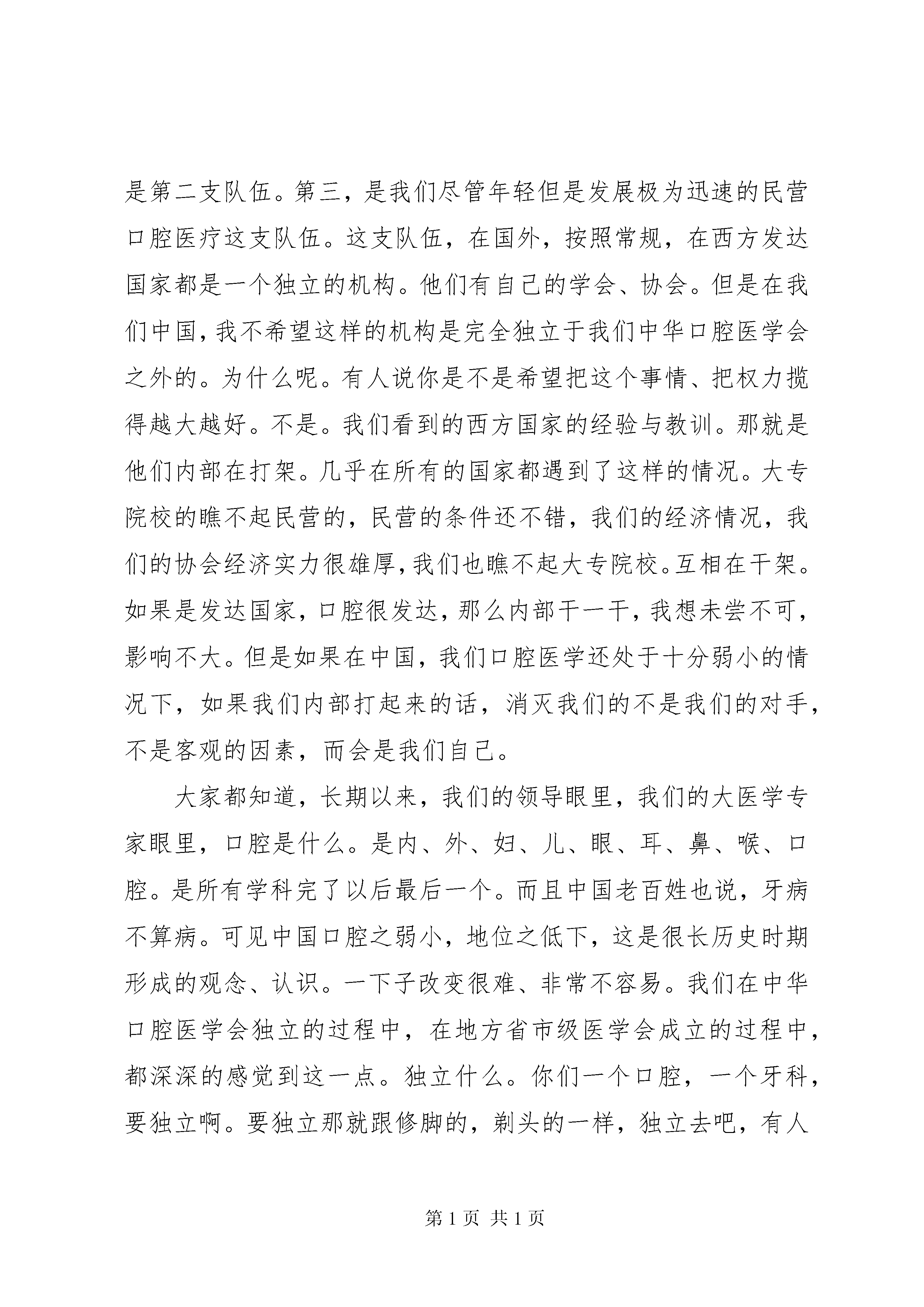 医学会成立领导讲话稿医学会成立领导讲话稿【篇一】各位代表,各位同志:XX县区预防医学会经过学会筹备组积极有效的工作,完成了各项筹备工作。今天,XX县区预防医学会顺利成立,这是全市预防医学工作者的一件大事,也是我市卫生事业的一件大事,我代表市卫生局向大会、向全体代表和会员表示热烈的祝贺。刚才大会通过了XX县区预防医学会章程,表决通过了XX县区预防医学会会长、理事,并选举产生了XX县区预防医学会的组织机构,新当选的学会会长高照洲同志作了很好的讲话。XX县区预防医学会是我市预防医学学术团体。XX县区预防医学会成立后,将开展预防医学学术交流、研究和服务,培训预防医学工作者,开展普及预防医学知识,为政府行政部门决策提供科学依据。各位代表:XX县区预防医学会成立后,将有很多工作要做,需要我们采取团结、合作的态度去克服困难,做好各项工作,为此,我向各位代表提以下三点希望:一、加强思想理论和业务学习,提高学会会员的自身素质要组织会员深入学习贯彻党的精神。党的精神是我们党在新的历史时期召开的一次重要的具有里程碑意义的大会,在精神指引下我国将进入全面建成小康社会、实现中华民族伟大复兴的崭新时代。深刻领会精神,并结合疾病预防工作实际,认真贯彻落实,这是摆在我们面前的头等大事。各团体会员单位都要充分依赖和借助预防医学会这个平台,开展广泛的学术交流和业务培训,不断加强自身政治和业务素质,切实提高工作能力和水平。要发挥人才资源优势,加强学术带头人和青年骨干的的培养力度,为其交流和深造提供更多的机会,创造更多的有利条件。二、以学术交流研究为依托,积极服务社会。学会在加强学习交流的同时要努力提升服务社会能力,拓展学会发展空间。党的为我们指明了卫生事业发展的方向和目标:要在改善民生和创新管理中加强社会建设,要坚持为人民健康服务的方向,坚持预防为主、以农村为重点、中西医并重,健全农村三级医疗卫生服务网络和城市社区卫生服务体系,为群众提供安全有效方便价廉的公共卫生和基本医疗服务。这就要求我们预防医学工作者要转变思想观念,明确发展方向,以预防为主线,以服务为先导,以创新为主题,以健康为宗旨,为我市卫生事业的发展提供正能量。三、发挥技术优势,当好参谋和助手。预防医学会要发挥自身优势,围绕我市卫生事业总体部署,服务市委市政府的中心工作,对疾病预防工作实践中遇到的特别是人民群众和社会各界关心和关注的问题进行深入研究和思考,对危害我市人民群众健康的重大传染病、多发病、常见病、地方病等进行深入探讨和技术攻关。要发挥预防医学人才库、专家库的作用,进一步突出咨询服务的重点,进一步拓展咨询服务的领域,进一步提高咨询服务的质量,当好卫生行政部门参谋和助手。各级卫生行政部门要切实关心和大力支持学会的工作,尽可能地为学会的发展提供人、财、物等方面的支持。各位代表。XX县区预防医学会的成立是我市卫生事业特别是预防医学领域的大事,标志着我市预防医学发展从此进入了新的发展历程,也是我市卫生事业在新的历史条件下新的发力点。今天,我们走出了第一步,今后的路还很长,要做的工作会很多,希望各位代表和全体会员团结一致,努力工作,锐意进取,开拓创新,为全市人民的健康事业做出应有的贡献。医学会成立领导讲话稿【篇二】尊敬的各位同道,各位朋友,大家下午好。首先请允许我代表中华口腔医学会对XX省口腔医学会民营口腔医疗分会的成立表示衷心的祝贺。大家已经开了一整天的会,听了很多精彩的学术报告,应该是闭幕式简短、扼要,但是呢我看安排了很多人讲话。这算是我们中国的会议程序吧。我的讲话应该很短才是,因为大家也很疲劳,很辛苦,也很累。但是我还是想说几句话,说一点和民营口腔有关的话。因为刚才路院长讲了一些辽宁口腔医疗资源调查的情况。我印证了一下,我大概分析了一下,因为我拿不到确切的数据,有多少民营医师在营业,这个数目没有。我们04年民营口腔管理组做过一个调查,这个调查我相信肯定有好的漏洞,那个时候拿到的数据是全国有43000多家民营口腔诊所,有60000多口腔医学工作者在民营机构从业。但是就我直观的印象,中国的民营口腔应该在口腔医疗资源中占到了一半以上,因为我看到北京和上海应该说超过了公立医院的医疗资源。所以我在有些会议上讲,民营口腔在中国口腔医疗服务大军中已经占据了半壁江山。这是指我们的资源和规模。我在不同的场合也说过这样的话,中国口腔医学这支队伍,有那么几个兄弟,有时讲3个兄弟,有时讲4个兄弟,是要我们这4支队伍共同的团结、合作、努力,来推动,来发展。那么,这四支队伍就是,第一,我们的大专院校、专科医院。大家都知道这是我们的国情决定的。过去这些大专院校、专科医院集中了中国口腔最优秀的人才,也得到了国家的很多政策支持。他们的资源优势,人才优势,学科发展优势,以及学术水平优势到目前为止仍然处于龙头老大