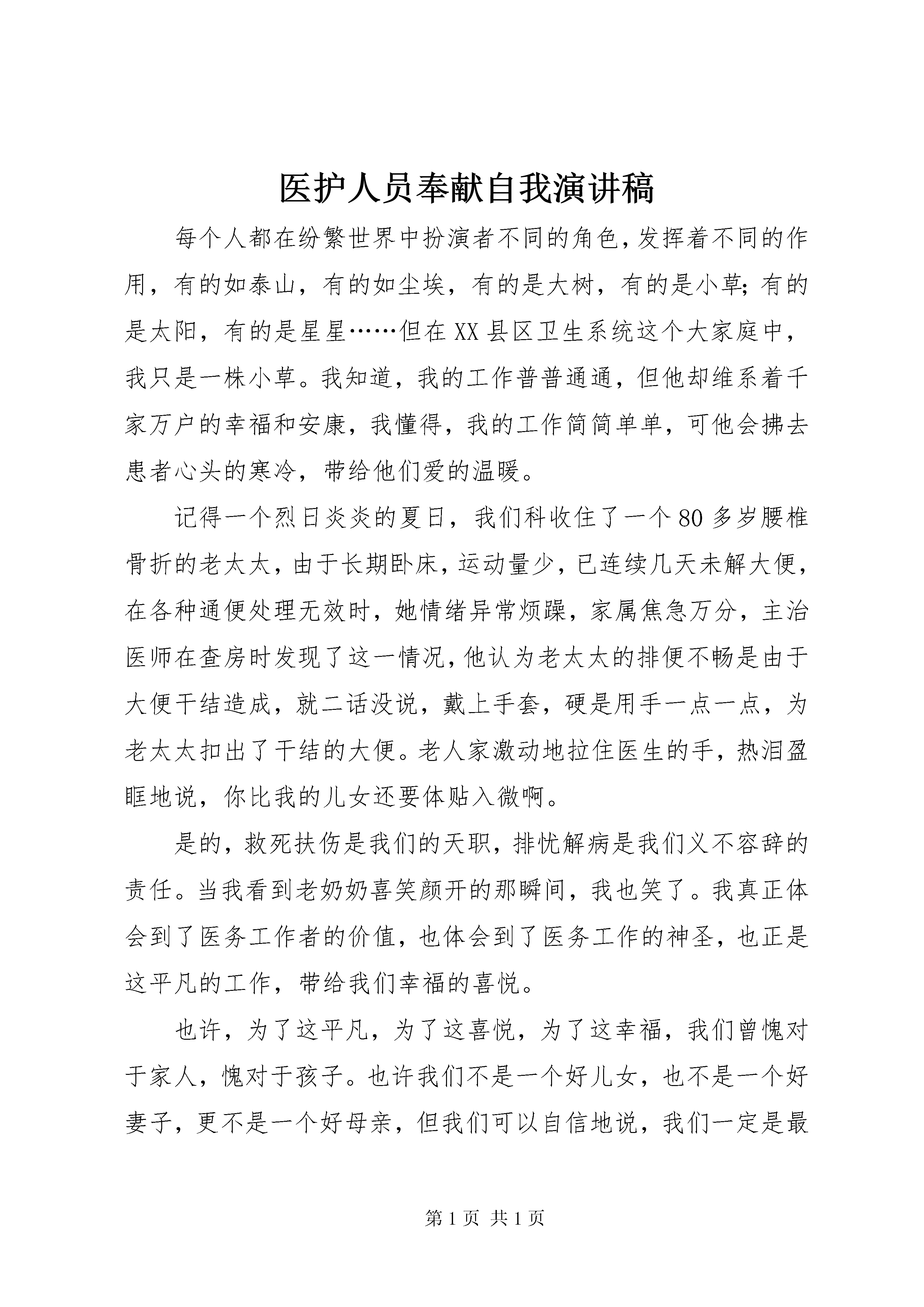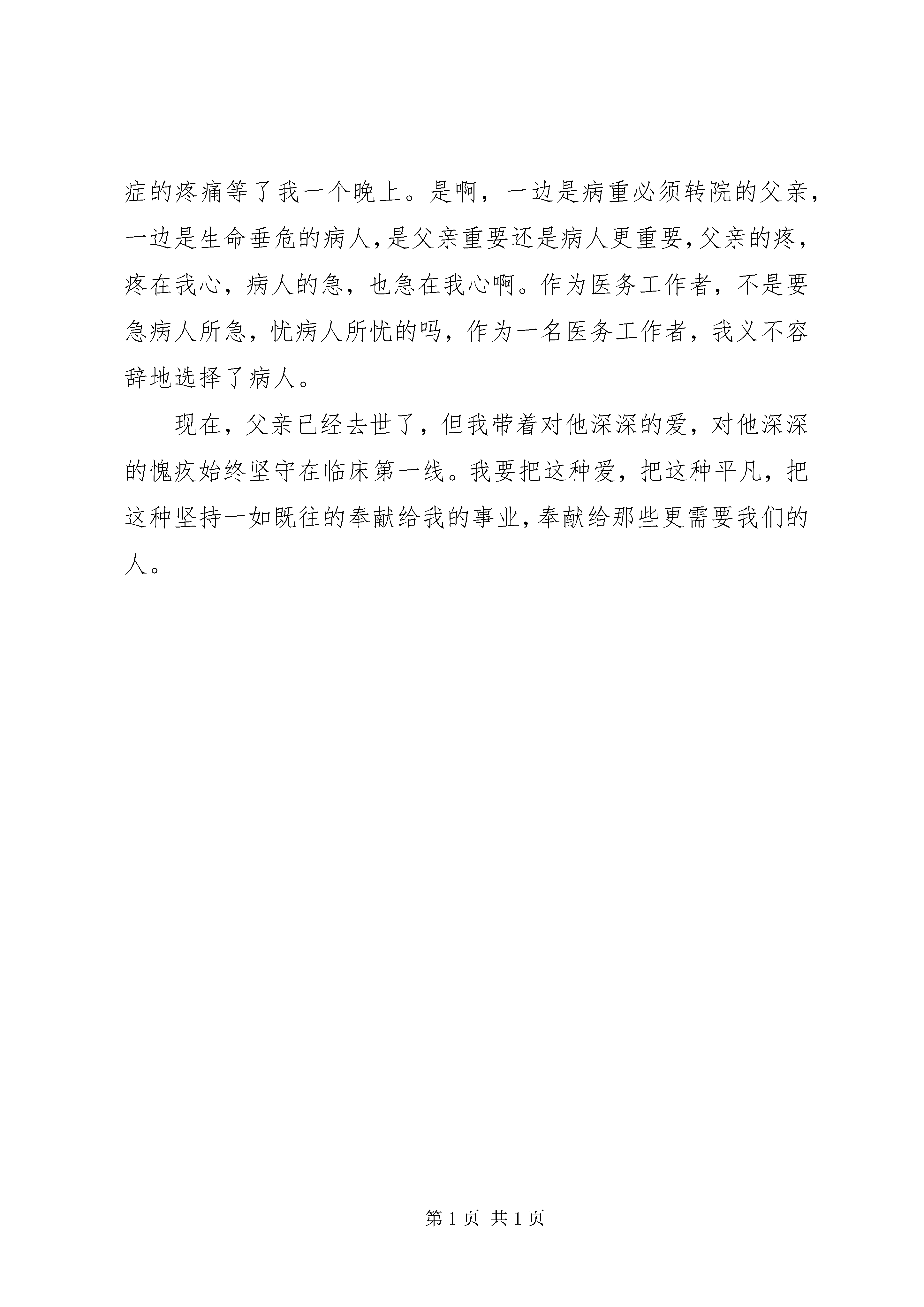 医护人员奉献自我演讲稿每个人都在纷繁世界中扮演者不同的角色,发挥着不同的作用,有的如泰山,有的如尘埃,有的是大树,有的是小草;有的是太阳,有的是星星……但在XX县区卫生系统这个大家庭中,我只是一株小草。我知道,我的工作普普通通,但他却维系着千家万户的幸福和安康,我懂得,我的工作简简单单,可他会拂去患者心头的寒冷,带给他们爱的温暖。记得一个烈日炎炎的夏日,我们科收住了一个80多岁腰椎骨折的老太太,由于长期卧床,运动量少,已连续几天未解大便,在各种通便处理无效时,她情绪异常烦躁,家属焦急万分,主治医师在查房时发现了这一情况,他认为老太太的排便不畅是由于大便干结造成,就二话没说,戴上手套,硬是用手一点一点,为老太太扣出了干结的大便。老人家激动地拉住医生的手,热泪盈眶地说,你比我的儿女还要体贴入微啊。是的,救死扶伤是我们的天职,排忧解病是我们义不容辞的责任。当我看到老奶奶喜笑颜开的那瞬间,我也笑了。我真正体会到了医务工作者的价值,也体会到了医务工作的神圣,也正是这平凡的工作,带给我们幸福的喜悦。也许,为了这平凡,为了这喜悦,为了这幸福,我们曾愧对于家人,愧对于孩子。也许我们不是一个好儿女,也不是一个好妻子,更不是一个好母亲,但我们可以自信地说,我们一定是最美的天使。初春,我被任命为急诊科护士长。在这之前,父亲因为身体不适让我带他去大医院检查。但我因为自己刚担任护士长,对科室管理和业务工作都还不太熟悉,就一直推脱父亲说再等一段时间,等一段时间我一定陪您去检查。大概过了一个月的时间,我终于带着父亲去西京医院就诊,但检查的结果却如晴天霹雳一下子击的我喘不过气来,父亲得了胆囊癌并已经肝转移。望着手中的诊断结果,自责、愧疚让我不能自已,我失声痛哭,我悔恨自己当初为什么不早点带父亲去看病,我害怕如何面对我的父亲和家人。当时我就下定决心,回家第一件事就是去请长假,陪父亲治病,在父亲剩余的时间里陪在他身边,进女儿最后的孝心。但当我准备请假时,看着科室收住的危重病人,由于科室人手不足同事们个个憔悴的脸庞,我又犹豫了,我默默地选择了放弃。我知道,这里的患者更需要我。之后的又一个夜晚,我正在值夜班,弟弟打来电话,父亲双下肢忽然不能活动,作为医务工作者,我明白,那是癌症转移引起的下肢静脉栓塞,必须立即转院。但就在这时候,科室忽然来了一个口服农药中毒患者,也必须立即洗胃、吸氧、抢救,我能选择吗,我没有半点迟疑,立即投身到抢救工作中去。弟弟的电话一个接一个,他哭着骂我没人性,难道病人比爸爸更重要吗。我没有理会,硬是将手机关了。病人脱离了危险,父亲却忍着癌症的疼痛等了我一个晚上。是啊,一边是病重必须转院的父亲,一边是生命垂危的病人,是父亲重要还是病人更重要,父亲的疼,疼在我心,病人的急,也急在我心啊。作为医务工作者,不是要急病人所急,忧病人所忧的吗,作为一名医务工作者,我义不容辞地选择了病人。现在,父亲已经去世了,但我带着对他深深的爱,对他深深的愧疚始终坚守在临床第一线。我要把这种爱,把这种平凡,把这种坚持一如既往的奉献给我的事业,奉献给那些更需要我们的人。