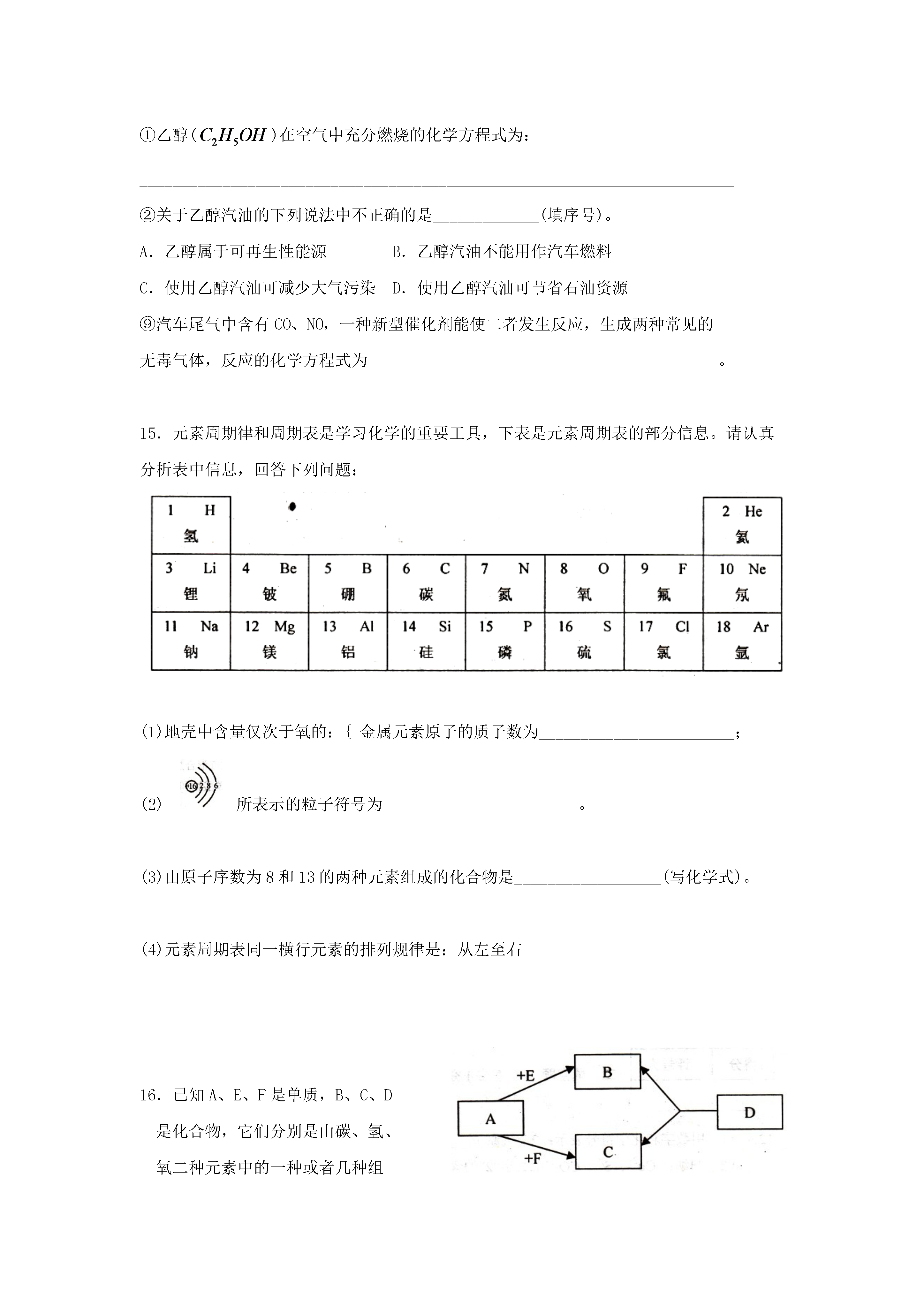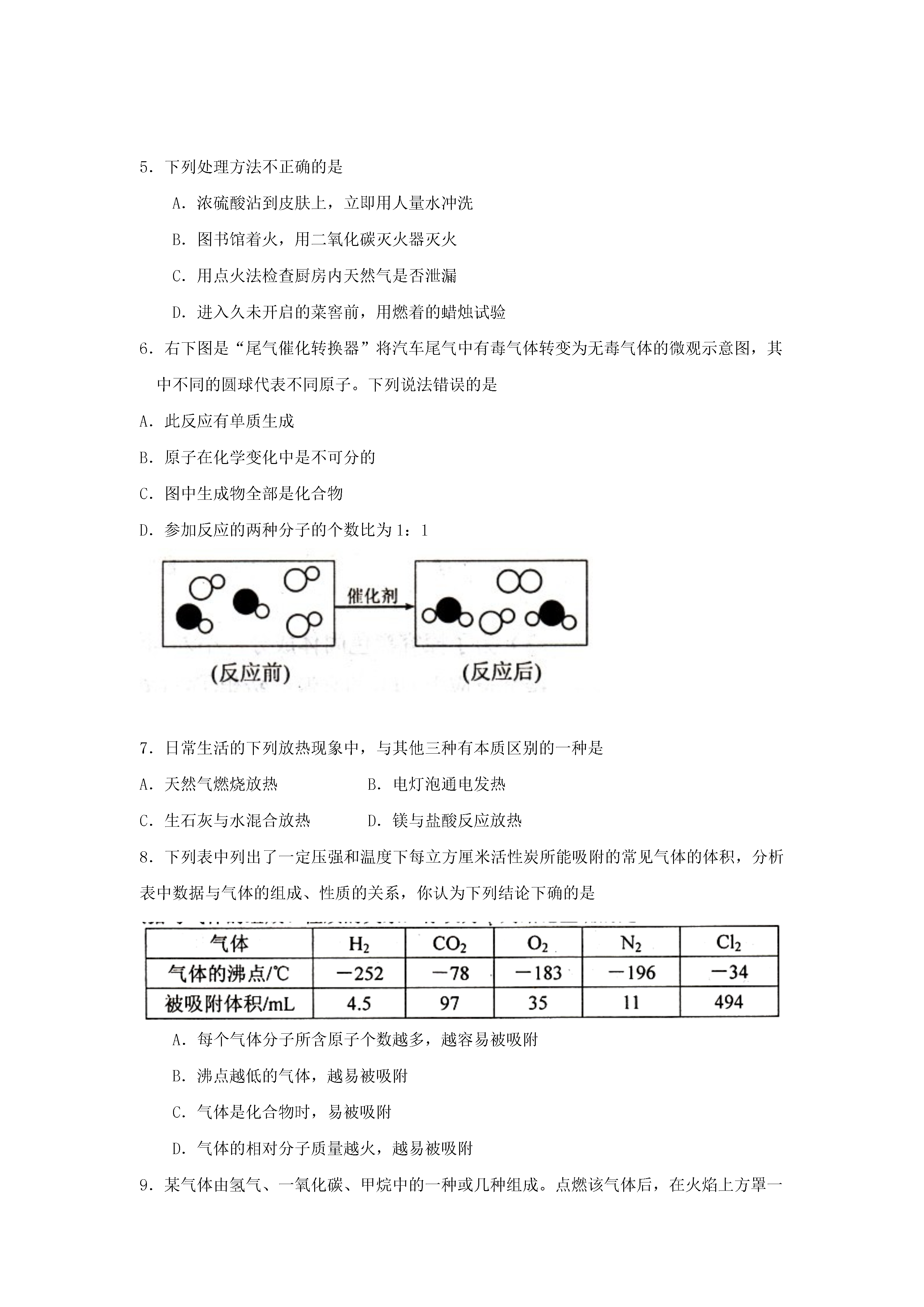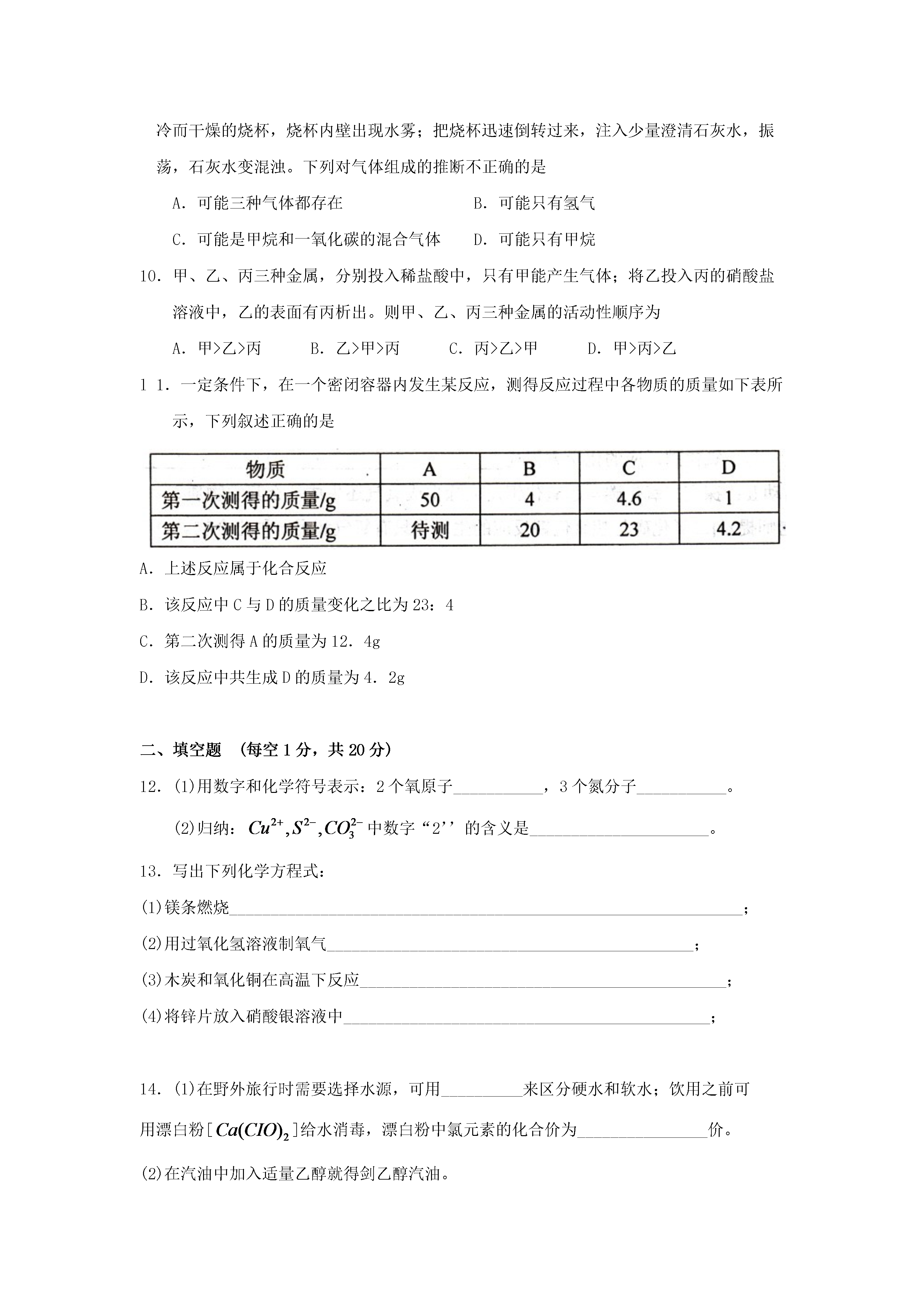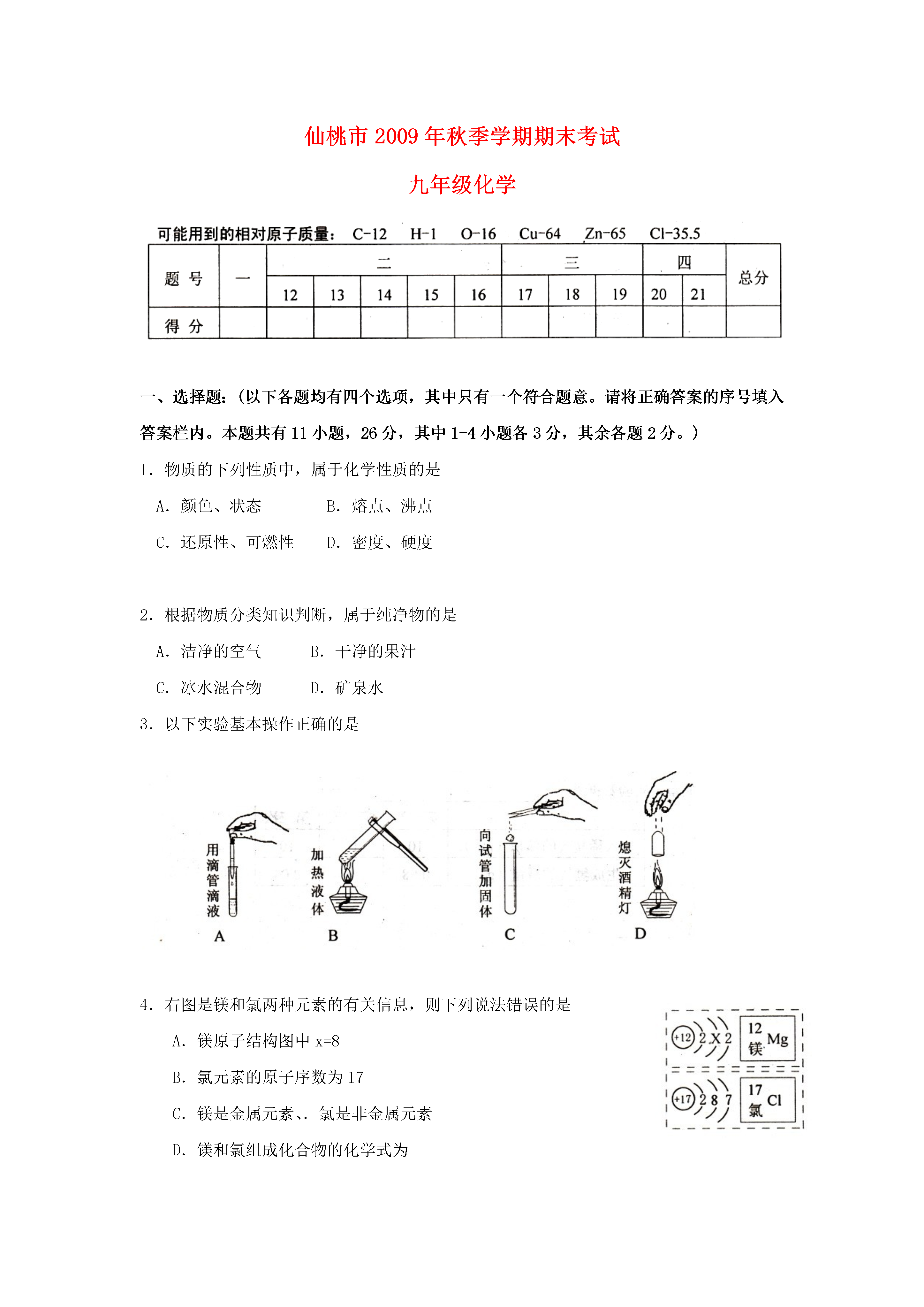 仙桃市2009年秋季学期期末考试九年级化学一、选择题:(以下各题均有四个选项,其中只有一个符合题意。请将正确答案的序号填入答案栏内。本题共有11小题,26分,其中1-4小题各3分,其余各题2分。)1.物质的下列性质中,属于化学性质的是A.颜色、状态B.熔点、沸点C.还原性、可燃性D.密度、硬度2.根据物质分类知识判断,属于纯净物的是A.洁净的空气B.干净的果汁C.冰水混合物D.矿泉水3.以下实验基本操作正确的是4.右图是镁和氯两种元素的有关信息,则下列说法错误的是A.镁原子结构图中x=8B.氯元素的原子序数为17C.镁是金属元素、.氯是非金属元素D.镁和氯组成化合物的化学式为5.下列处理方法不正确的是A.浓硫酸沾到皮肤上,立即用人量水冲洗B.图书馆着火,用二氧化碳灭火器灭火C.用点火法检查厨房内天然气是否泄漏D.进入久未开启的菜窖前,用燃着的蜡烛试验6.右下图是“尾气催化转换器”将汽车尾气中有毒气体转变为无毒气体的微观示意图,其中不同的圆球代表不同原子。下列说法错误的是A.此反应有单质生成B.原子在化学变化中是不可分的C.图中生成物全部是化合物D.参加反应的两种分子的个数比为1:17.日常生活的下列放热现象中,与其他三种有本质区别的一种是A.天然气燃烧放热B.电灯泡通电发热C.生石灰与水混合放热D.镁与盐酸反应放热8.下列表中列出了一定压强和温度下每立方厘米活性炭所能吸附的常见气体的体积,分析表中数据与气体的组成、性质的关系,你认为下列结论下确的是A.每个气体分子所含原子个数越多,越容易被吸附B.沸点越低的气体,越易被吸附C.气体是化合物时,易被吸附D.气体的相对分子质量越火,越易被吸附9.某气体由氢气、一氧化碳、甲烷中的一种或几种组成。点燃该气体后,在火焰上方罩一冷而干燥的烧杯,烧杯内壁出现水雾;把烧杯迅速倒转过来,注入少量澄清石灰水,振荡,石灰水变混浊。下列对气体组成的推断不正确的是A.可能三种气体都存在B.可能只有氢气C.可能是甲烷和一氧化碳的混合气体D.可能只有甲烷10.甲、乙、丙三种金属,分别投入稀盐酸中,只有甲能产生气体;将乙投入丙的硝酸盐溶液中,乙的表面有丙析出。则甲、乙、丙三种金属的活动性顺序为A.甲>乙>丙B.乙>甲>丙C.丙>乙>甲D.甲>丙>乙l1.一定条件下,在一个密闭容器内发生某反应,测得反应过程中各物质的质量如下表所示,下列叙述正确的是A.上述反应属于化合反应B.该反应中C与D的质量变化之比为23:4C.第二次测得A的质量为12.4gD.该反应中共生成D的质量为4.2g二、填空题(每空1分,共20分)12.(1)用数字和化学符号表示:2个氧原子___________,3个氮分子___________。(2)归纳:中数字“2’’的含义是______________________。13.写出下列化学方程式:(1)镁条燃烧_______________________________________________________________;(2)用过氧化氢溶液制氧气_____________________________________________;(3)木炭和氧化铜在高温下反应_____________________________________________;(4)将锌片放入硝酸银溶液中_____________________________________________;14.(1)在野外旅行时需要选择水源,可用__________来区分硬水和软水;饮用之前可用漂白粉[]给水消毒,漂白粉中氯元素的化合价为________________价。(2)在汽油中加入适量乙醇就得剑乙醇汽油。①乙醇()在空气中充分燃烧的化学方程式为:_________________________________________________________________________②关于乙醇汽油的下列说法中不正确的是_____________(填序号)。A.乙醇属于可再生性能源B.乙醇汽油不能用作汽车燃料C.使用乙醇汽油可减少大气污染D.使用乙醇汽油可节省石油资源⑨汽车尾气中含有CO、NO,一种新型催化剂能使二者发生反应,生成两种常见的无毒气体,反应的化学方程式为___________________________________________。15.元素周期律和周期表是学习化学的重要工具,下表是元素周期表的部分信息。请认真分析表中信息,回答下列问题:(1)地壳中含量仅次于氧的:{|金属元素原子的质子数为______________