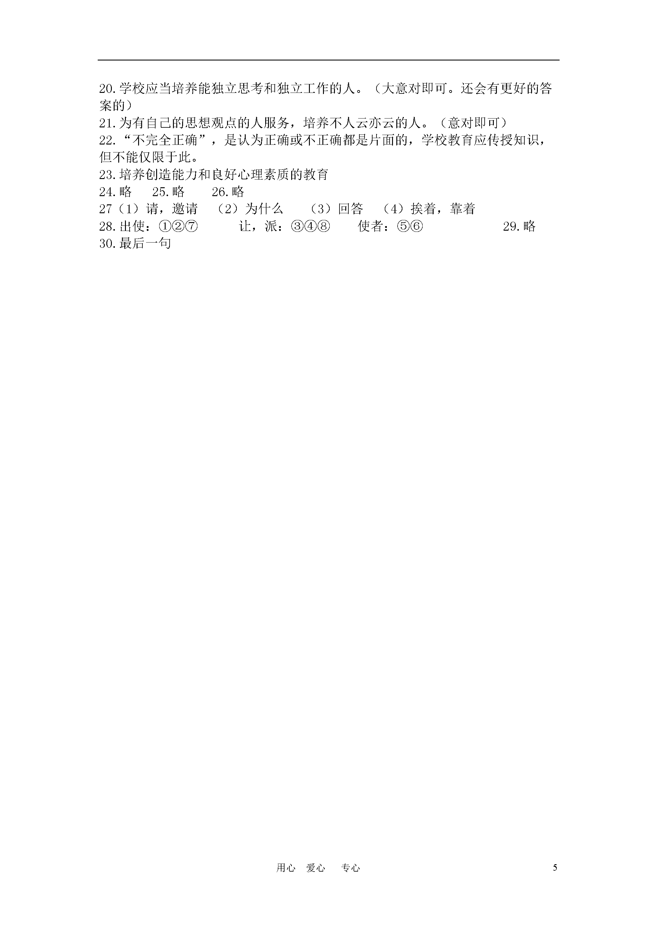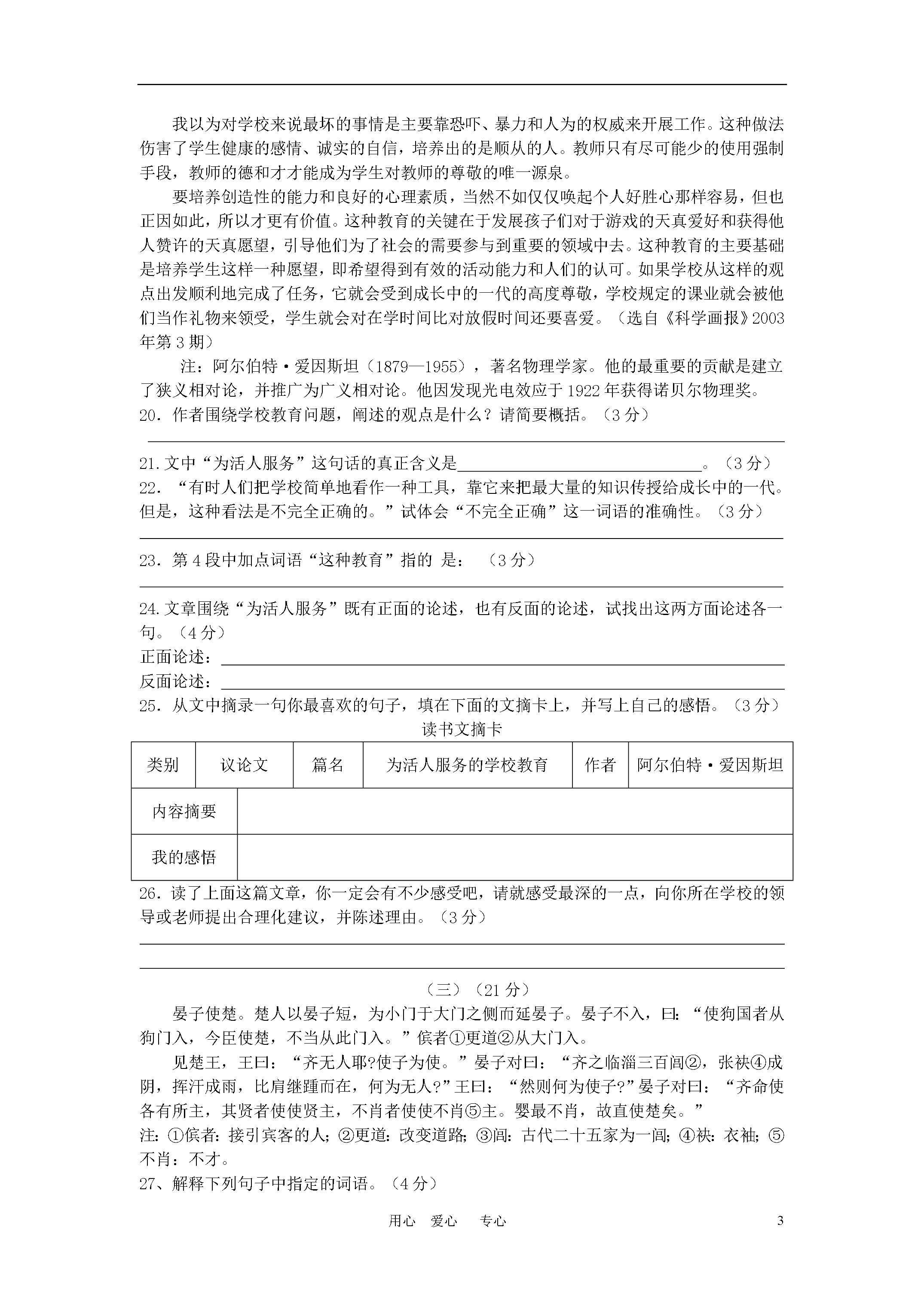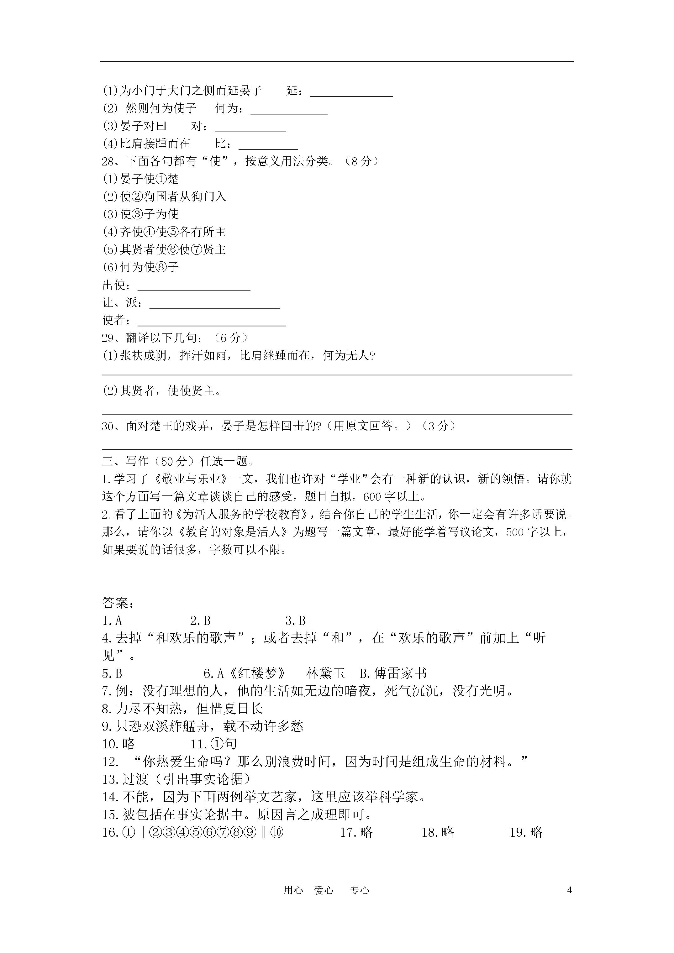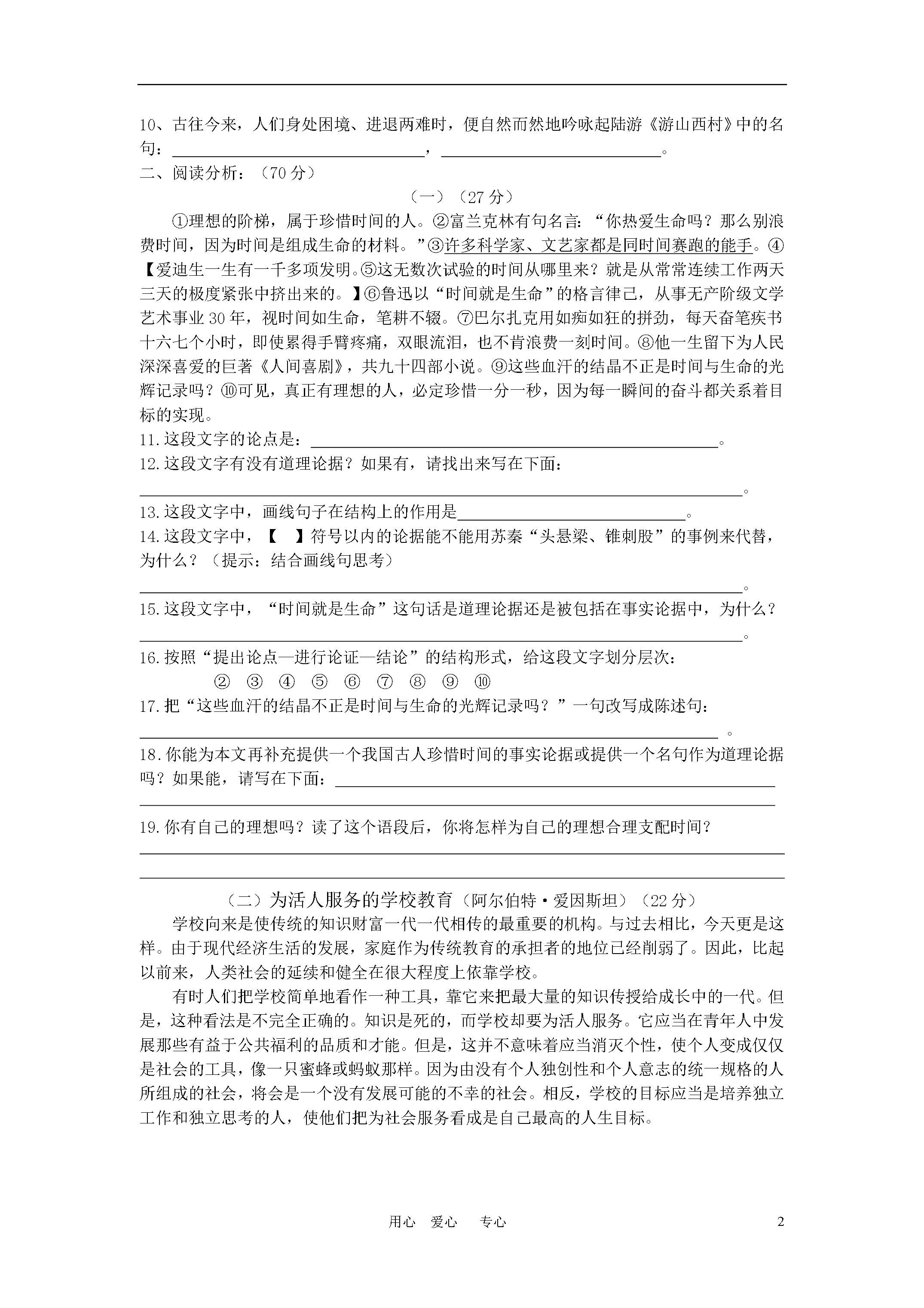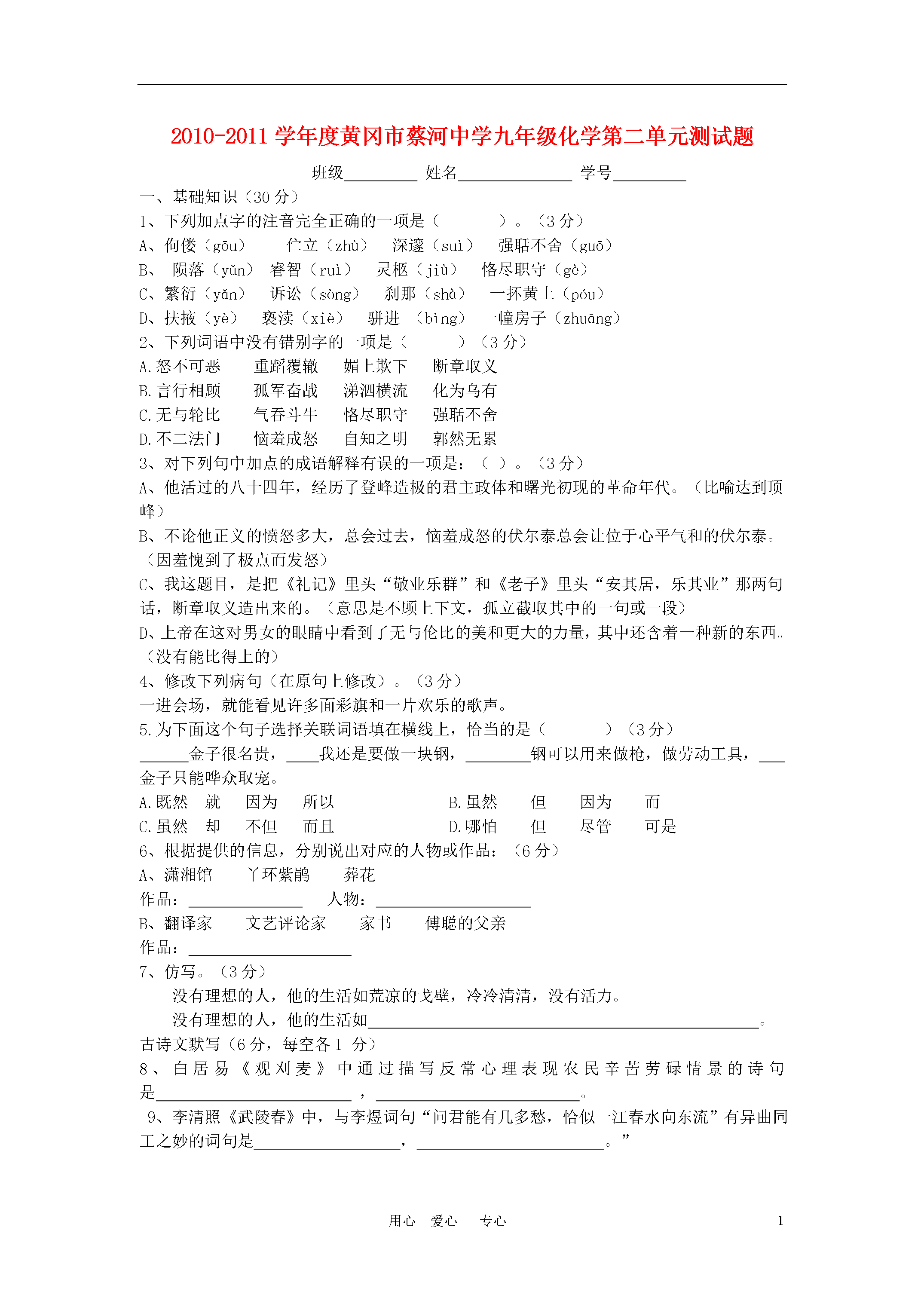 5用心爱心专心2010-2011学年度黄冈市蔡河中学九年级化学第二单元测试题班级姓名学号一、基础知识(30分)1、下列加点字的注音完全正确的一项是()。(3分)A、佝偻(gōu)伫立(zhù)深邃(suì)强聒不舍(guō)B、陨落(yǔn)睿智(ruì)灵柩(jiù)恪尽职守(gè)C、繁衍(yǎn)诉讼(sòng)刹那(shà)一抔黄土(póu)D、扶掖(yè)亵渎(xiè)骈进(bìng)一幢房子(zhuāng)2、下列词语中没有错别字的一项是()(3分)A.怒不可恶重蹈覆辙媚上欺下断章取义B.言行相顾孤军奋战涕泗横流化为乌有C.无与轮比气吞斗牛恪尽职守强聒不舍D.不二法门恼羞成怒自知之明郭然无累3、对下列句中加点的成语解释有误的一项是:()。(3分)A、他活过的八十四年,经历了登峰造极的君主政体和曙光初现的革命年代。(比喻达到顶峰)B、不论他正义的愤怒多大,总会过去,恼羞成怒的伏尔泰总会让位于心平气和的伏尔泰。(因羞愧到了极点而发怒)C、我这题目,是把《礼记》里头“敬业乐群”和《老子》里头“安其居,乐其业”那两句话,断章取义造出来的。(意思是不顾上下文,孤立截取其中的一句或一段)D、上帝在这对男女的眼睛中看到了无与伦比的美和更大的力量,其中还含着一种新的东西。(没有能比得上的)4、修改下列病句(在原句上修改)。(3分)一进会场,就能看见许多面彩旗和一片欢乐的歌声。5.为下面这个句子选择关联词语填在横线上,恰当的是()(3分)金子很名贵,我还是要做一块钢,钢可以用来做枪,做劳动工具,金子只能哗众取宠。A.既然就因为所以B.虽然但因为而C.虽然却不但而且D.哪怕但尽管可是6、根据提供的信息,分别说出对应的人物或作品:(6分)A、潇湘馆丫环紫鹃葬花作品:人物:B、翻译家文艺评论家家书傅聪的父亲作品:7、仿写。(3分)没有理想的人,他的生活如荒凉的戈壁,冷冷清清,没有活力。没有理想的人,他的生活如。古诗文默写(6分,每空各1分)8、白居易《观刈麦》中通过描写反常心理表现农民辛苦劳碌情景的诗句是,。9、李清照《武陵春》中,与李煜词句“问君能有几多愁,恰似一江春水向东流”有异曲同工之妙的词句是,。”10、古往今来,人们身处困境、进退两难时,便自然而然地吟咏起陆游《游山西村》中的名句:,。二、阅读分析:(70分)(一)(27分)①理想的阶梯,属于珍惜时间的人。②富兰克林有句名言:“你热爱生命吗?那么别浪费时间,因为时间是组成生命的材料。”③许多科学家、文艺家都是同时间赛跑的能手。④【爱迪生一生有一千多项发明。⑤这无数次试验的时间从哪里来?就是从常常连续工作两天三天的极度紧张中挤出来的。】⑥鲁迅以“时间就是生命”的格言律己,从事无产阶级文学艺术事业30年,视时间如生命,笔耕不辍。⑦巴尔扎克用如痴如狂的拼劲,每天奋笔疾书十六七个小时,即使累得手臂疼痛,双眼流泪,也不肯浪费一刻时间。⑧他一生留下为人民深深喜爱的巨著《人间喜剧》,共九十四部小说。⑨这些血汗的结晶不正是时间与生命的光辉记录吗?⑩可见,真正有理想的人,必定珍惜一分一秒,因为每一瞬间的奋斗都关系着目标的实现。11.这段文字的论点是:。12.这段文字有没有道理论据?如果有,请找出来写在下面:。13.这段文字中,画线句子在结构上的作用是。14.这段文字中,【】符号以内的论据能不能用苏秦“头悬梁、锥刺股”的事例来代替,为什么?(提示:结合画线句思考)。15.这段文字中,“时间就是生命”这句话是道理论据还是被包括在事实论据中,为什么?。16.按照“提出论点—进行论证—结论”的结构形式,给这段文字划分层次:②③④⑤⑥⑦⑧⑨⑩17.把“这些血汗的结晶不正是时间与生命的光辉记录吗?”一句改写成陈述句:。18.你能为本文再补充提供一个我国古人珍惜时间的事实论据或提供一个名句作为道理论据吗?如果能,请写在下面:19.你有自己的理想吗?读了这个语段后,你将怎样为自己的理想合理支配时间?(二)为活人服务的学校教育(阿尔伯特·爱因斯坦)(22分)学校向来是使传统的知识财富一代一代相传的最重要的机构。与过去相比,今天更是这样。由于现代经济生活的发展,家庭作为传统教育的承担者的地位已经削弱了。因此,比起以前来,人类社会的延续和健全在很大程度上依靠学校。有时人们把学校简单地看作一种工具,靠它来把最大量的知识传授给成长中的一代。但是,这种看法是不完全正确的。知识是死的,而学校却要为活人服务。它应当在青年人中发展那些有益于公共福利的品质和才能。但是,这并不意味着应当消灭个性,使个人变成仅仅是社会的工具,像一只蜜蜂或蚂蚁那样。因为由没有个人独创性和个人意志的统一规格的人所组成的社会,将会是一个没有发展可能的不幸的社会。相反,学校的目标应当是培养独立工作和独立思考的人,使他们把为社会服务看成是自己最高的人生目标。我以