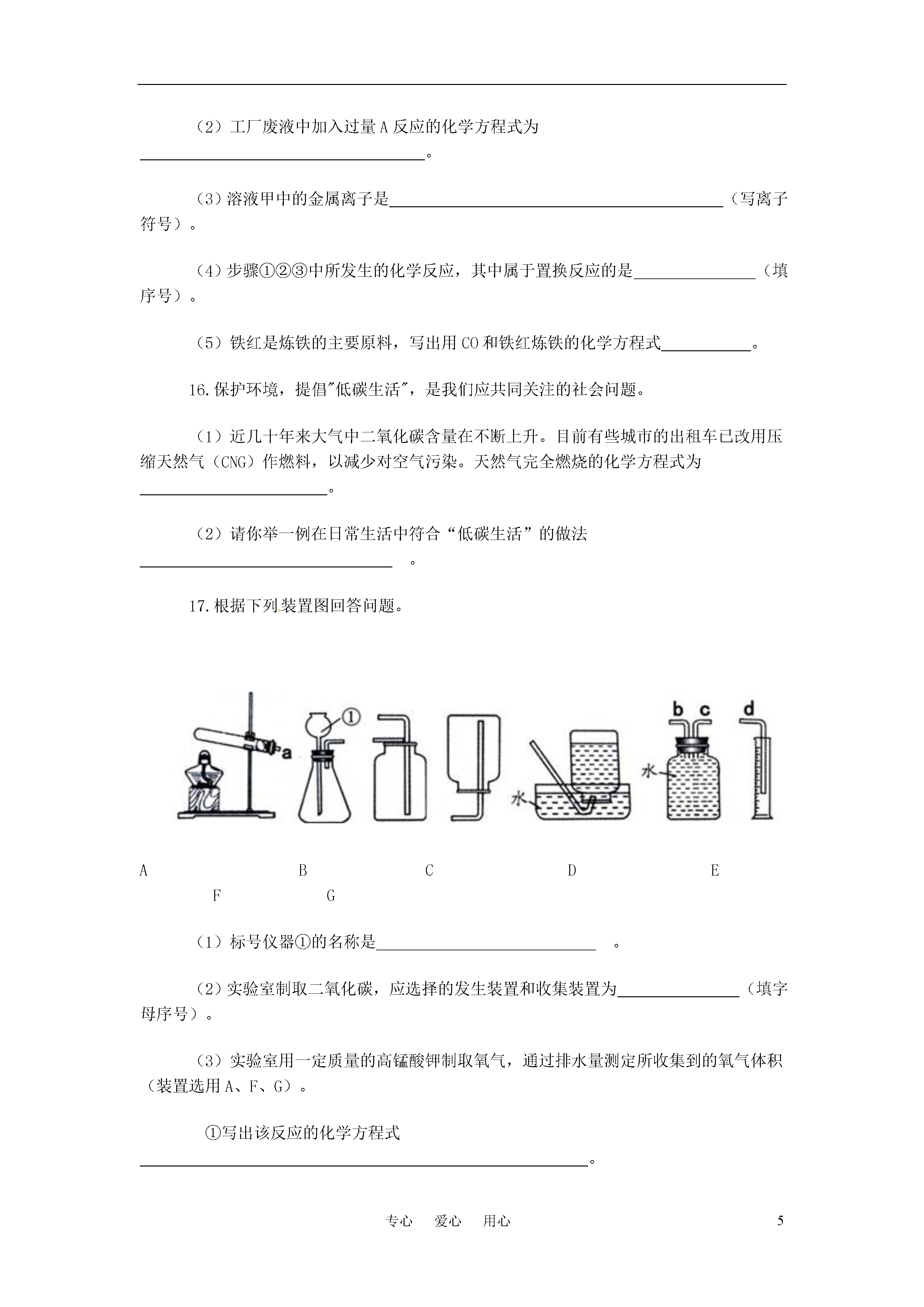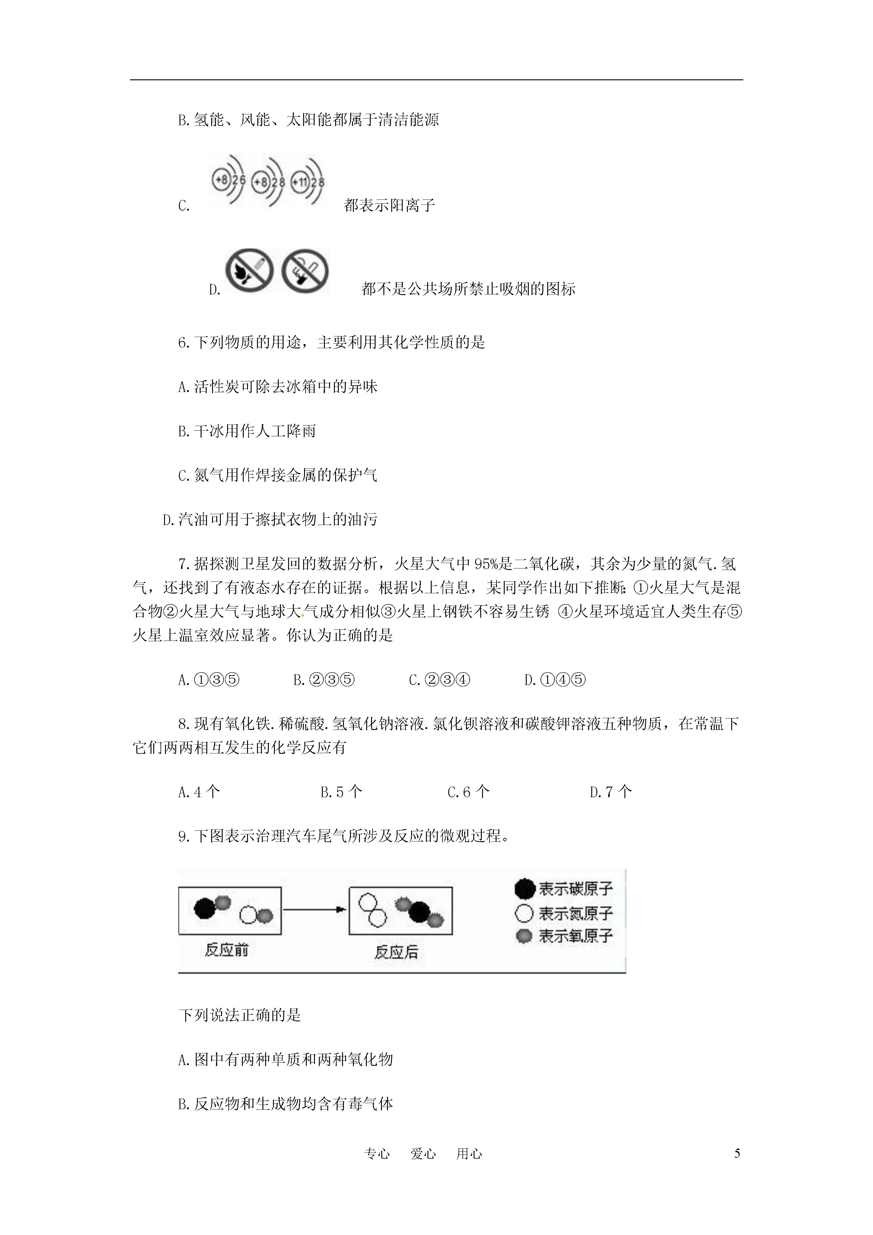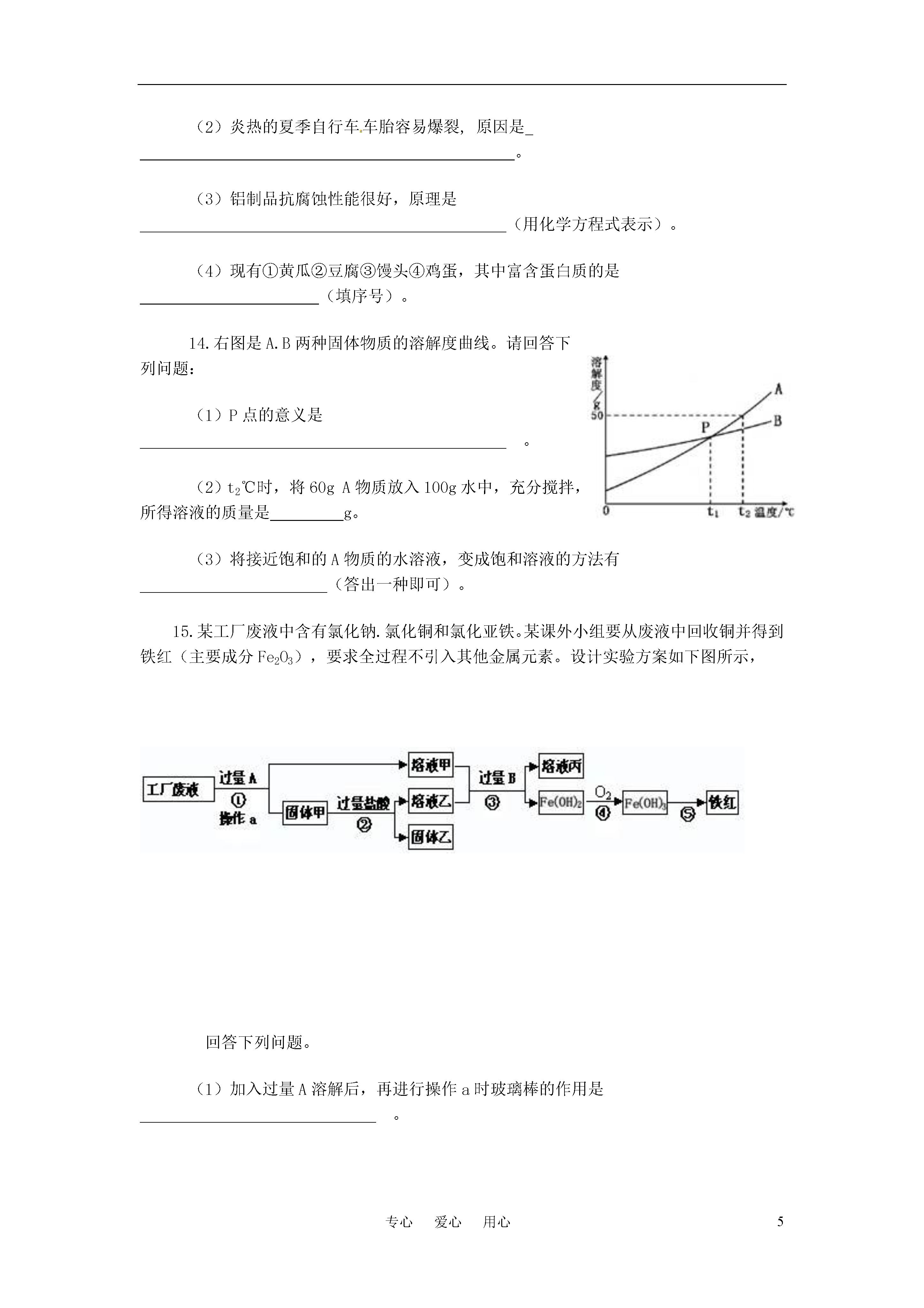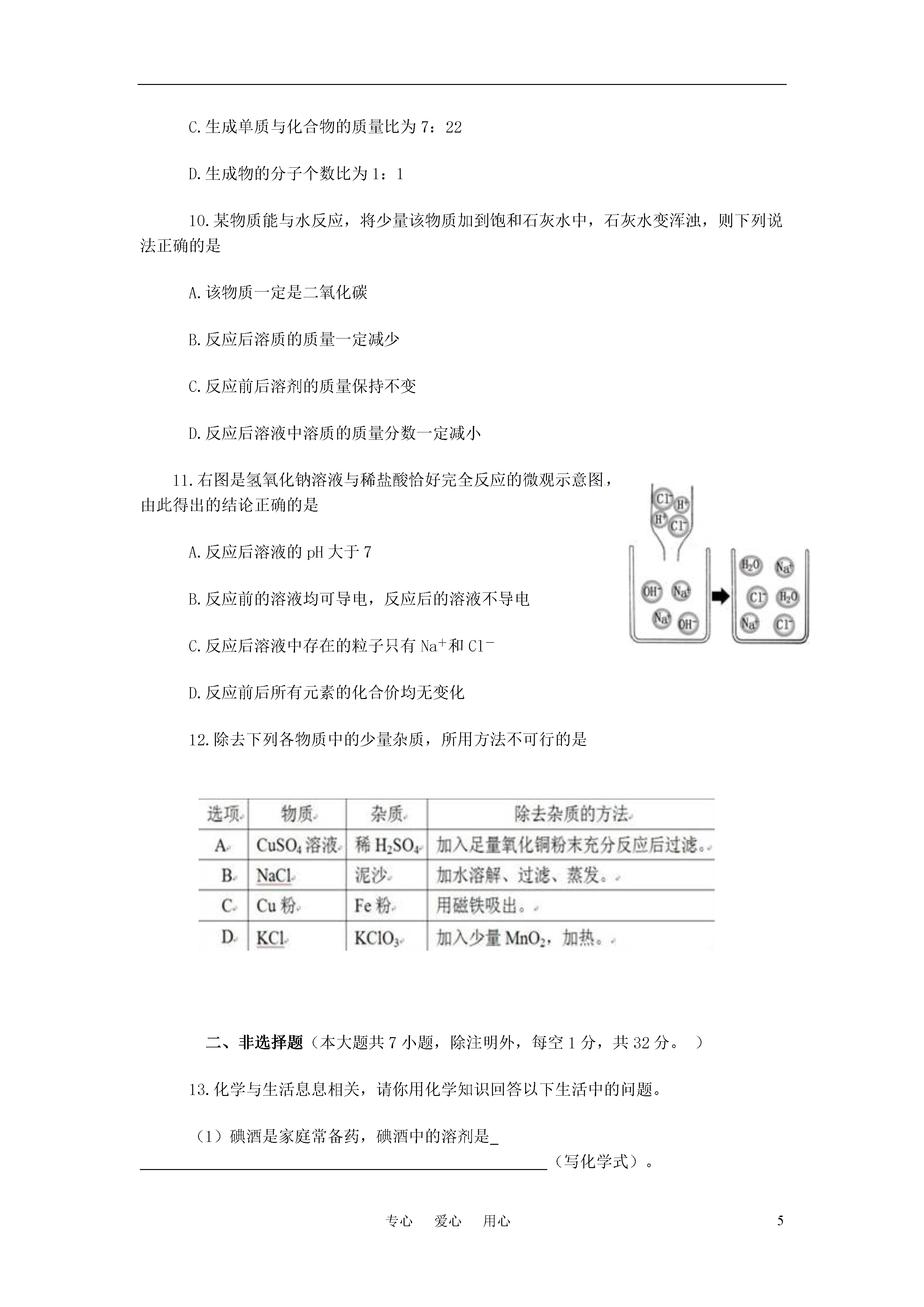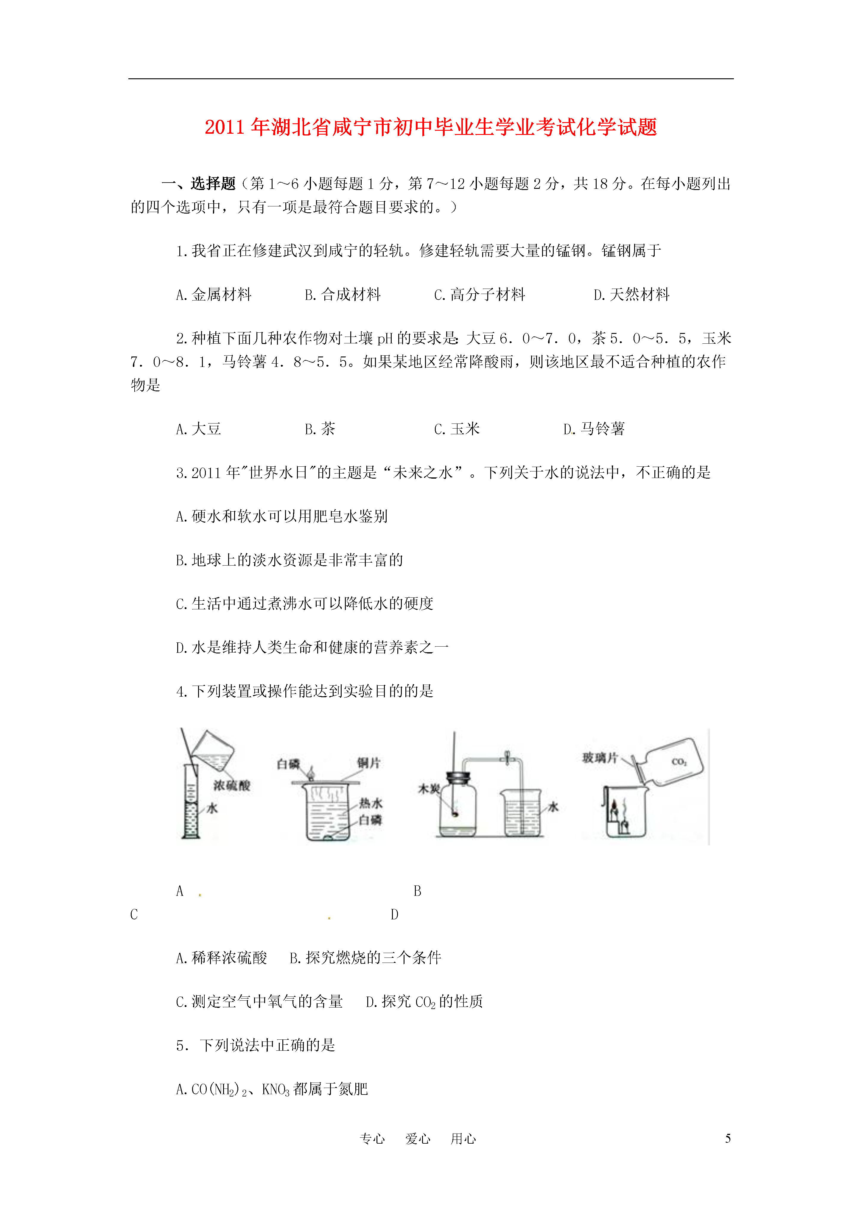 5专心爱心用心2011年湖北省咸宁市初中毕业生学业考试化学试题一、选择题(第1~6小题每题1分,第7~12小题每题2分,共18分。在每小题列出的四个选项中,只有一项是最符合题目要求的。)1.我省正在修建武汉到咸宁的轻轨。修建轻轨需要大量的锰钢。锰钢属于A.金属材料B.合成材料C.高分子材料D.天然材料2.种植下面几种农作物对土壤pH的要求是:大豆6.0~7.0,茶5.0~5.5,玉米7.0~8.1,马铃薯4.8~5.5。如果某地区经常降酸雨,则该地区最不适合种植的农作物是A.大豆B.茶C.玉米D.马铃薯3.2011年"世界水日"的主题是“未来之水”。下列关于水的说法中,不正确的是A.硬水和软水可以用肥皂水鉴别B.地球上的淡水资源是非常丰富的C.生活中通过煮沸水可以降低水的硬度D.水是维持人类生命和健康的营养素之一4.下列装置或操作能达到实验目的的是ABCDA.稀释浓硫酸B.探究燃烧的三个条件C.测定空气中氧气的含量D.探究CO2的性质5.下列说法中正确的是A.CO(NH2)2、KNO3都属于氮肥B.氢能、风能、太阳能都属于清洁能源C.都表示阳离子D.都不是公共场所禁止吸烟的图标6.下列物质的用途,主要利用其化学性质的是A.活性炭可除去冰箱中的异味B.干冰用作人工降雨C.氮气用作焊接金属的保护气D.汽油可用于擦拭衣物上的油污7.据探测卫星发回的数据分析,火星大气中95%是二氧化碳,其余为少量的氮气.氢气,还找到了有液态水存在的证据。根据以上信息,某同学作出如下推断:①火星大气是混合物②火星大气与地球大气成分相似③火星上钢铁不容易生锈④火星环境适宜人类生存⑤火星上温室效应显著。你认为正确的是A.①③⑤B.②③⑤C.②③④D.①④⑤8.现有氧化铁.稀硫酸.氢氧化钠溶液.氯化钡溶液和碳酸钾溶液五种物质,在常温下它们两两相互发生的化学反应有A.4个B.5个C.6个D.7个9.下图表示治理汽车尾气所涉及反应的微观过程。下列说法正确的是A.图中有两种单质和两种氧化物B.反应物和生成物均含有毒气体C.生成单质与化合物的质量比为7:22D.生成物的分子个数比为1:110.某物质能与水反应,将少量该物质加到饱和石灰水中,石灰水变浑浊,则下列说法正确的是A.该物质一定是二氧化碳B.反应后溶质的质量一定减少C.反应前后溶剂的质量保持不变D.反应后溶液中溶质的质量分数一定减小11.右图是氢氧化钠溶液与稀盐酸恰好完全反应的微观示意图,由此得出的结论正确的是A.反应后溶液的pH大于7B.反应前的溶液均可导电,反应后的溶液不导电C.反应后溶液中存在的粒子只有Na+和Cl―D.反应前后所有元素的化合价均无变化12.除去下列各物质中的少量杂质,所用方法不可行的是二、非选择题(本大题共7小题,除注明外,每空1分,共32分。)13.化学与生活息息相关,请你用化学知识回答以下生活中的问题。(1)碘酒是家庭常备药,碘酒中的溶剂是(写化学式)。(2)炎热的夏季自行车车胎容易爆裂,原因是。(3)铝制品抗腐蚀性能很好,原理是(用化学方程式表示)。(4)现有①黄瓜②豆腐③馒头④鸡蛋,其中富含蛋白质的是(填序号)。14.右图是A.B两种固体物质的溶解度曲线。请回答下列问题:(1)P点的意义是。(2)t2℃时,将60gA物质放入100g水中,充分搅拌,所得溶液的质量是g。(3)将接近饱和的A物质的水溶液,变成饱和溶液的方法有(答出一种即可)。15.某工厂废液中含有氯化钠.氯化铜和氯化亚铁。某课外小组要从废液中回收铜并得到铁红(主要成分Fe2O3),要求全过程不引入其他金属元素。设计实验方案如下图所示,回答下列问题。(1)加入过量A溶解后,再进行操作a时玻璃棒的作用是。(2)工厂废液中加入过量A反应的化学方程式为。(3)溶液甲中的金属离子是