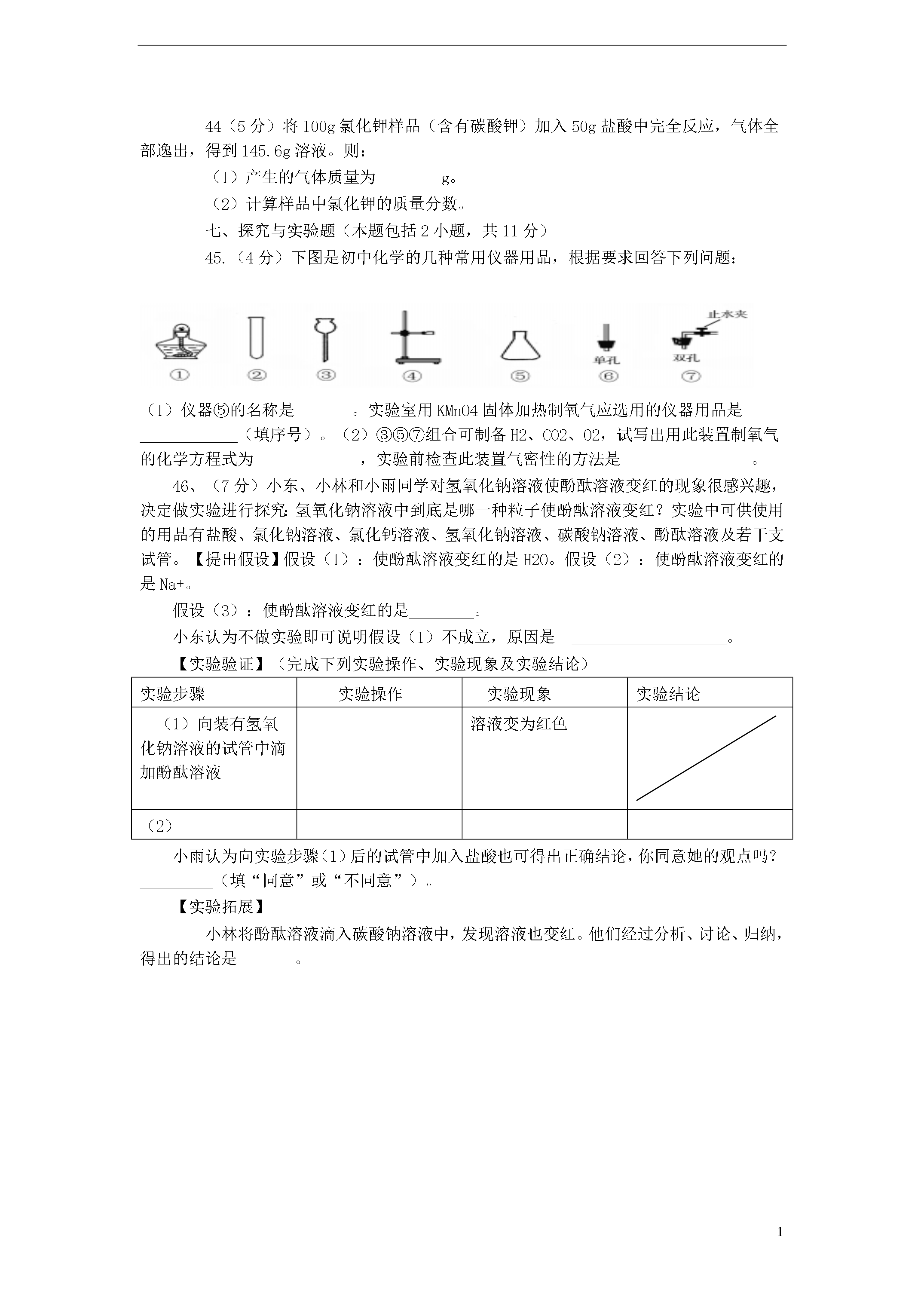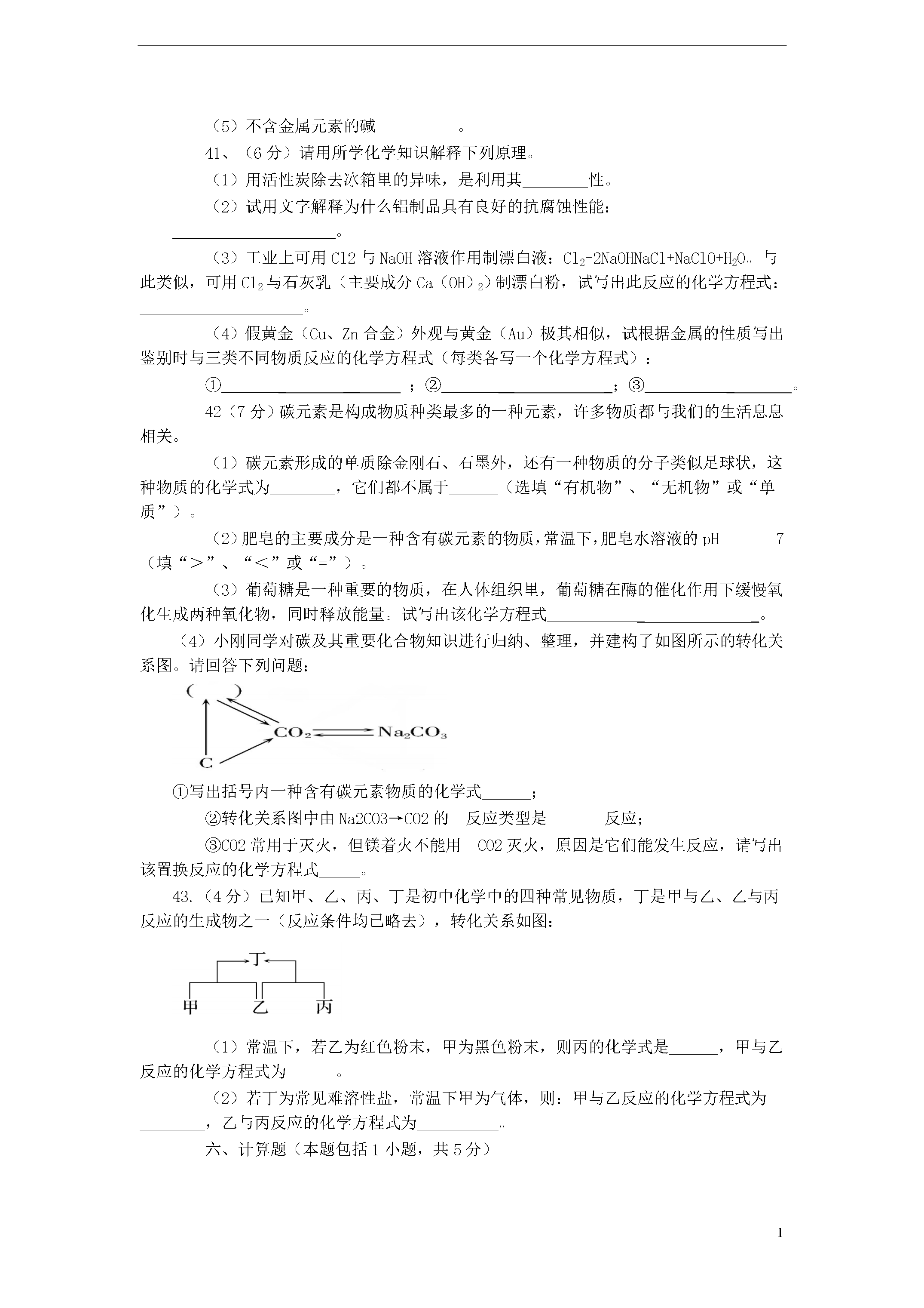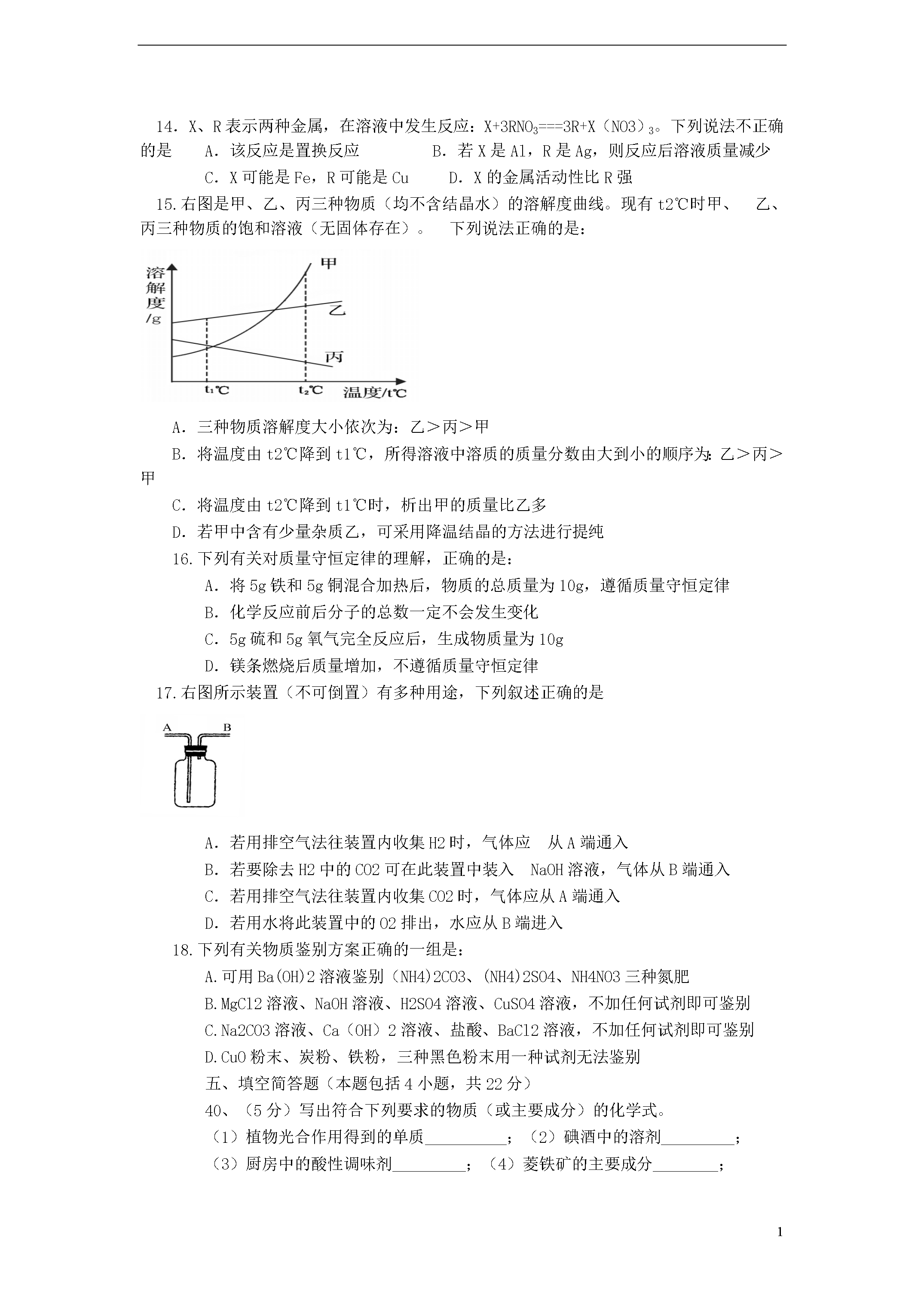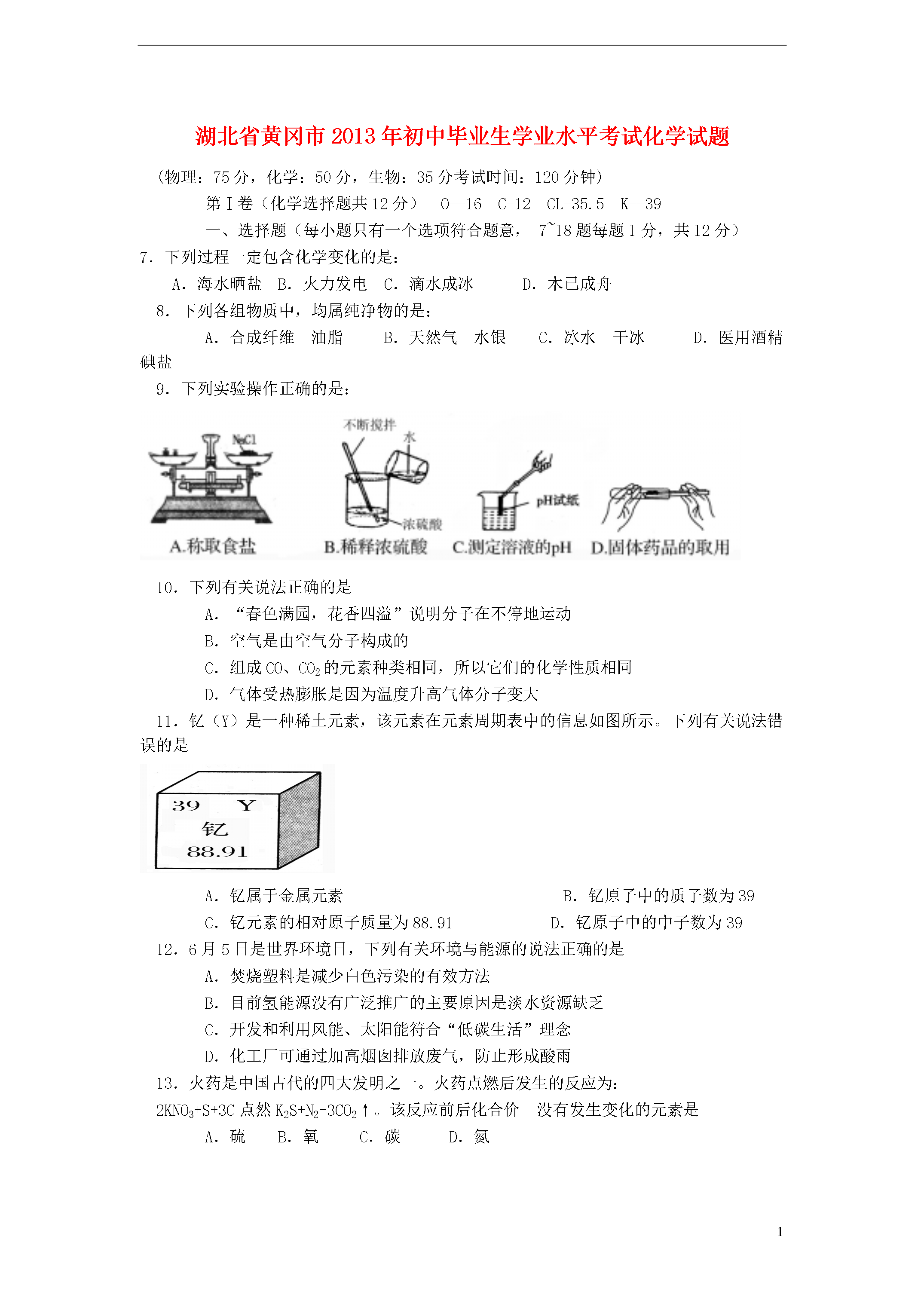 6湖北省黄冈市2013年初中毕业生学业水平考试化学试题(物理:75分,化学:50分,生物:35分考试时间:120分钟)第Ⅰ卷(化学选择题共12分)O—16C-12CL-35.5K--39一、选择题(每小题只有一个选项符合题意,7~18题每题1分,共12分)7.下列过程一定包含化学变化的是:A.海水晒盐B.火力发电C.滴水成冰D.木已成舟8.下列各组物质中,均属纯净物的是:A.合成纤维油脂B.天然气水银C.冰水干冰D.医用酒精碘盐9.下列实验操作正确的是:10.下列有关说法正确的是A.“春色满园,花香四溢”说明分子在不停地运动B.空气是由空气分子构成的C.组成CO、CO2的元素种类相同,所以它们的化学性质相同D.气体受热膨胀是因为温度升高气体分子变大11.钇(Y)是一种稀土元素,该元素在元素周期表中的信息如图所示。下列有关说法错误的是A.钇属于金属元素B.钇原子中的质子数为39C.钇元素的相对原子质量为88.91D.钇原子中的中子数为3912.6月5日是世界环境日,下列有关环境与能源的说法正确的是A.焚烧塑料是减少白色污染的有效方法B.目前氢能源没有广泛推广的主要原因是淡水资源缺乏C.开发和利用风能、太阳能符合“低碳生活”理念D.化工厂可通过加高烟囱排放废气,防止形成酸雨13.火药是中国古代的四大发明之一。火药点燃后发生的反应为:2KNO3+S+3C点然K2S+N2+3CO2↑。该反应前后化合价没有发生变化的元素是A.硫B.氧C.碳D.氮14.X、R表示两种金属,在溶液中发生反应:X+3RNO3===3R+X(NO3)3。下列说法不正确的是A.该反应是置换反应B.若X是Al,R是Ag,则反应后溶液质量减少C.X可能是Fe,R可能是CuD.X的金属活动性比R强15.右图是甲、乙、丙三种物质(均不含结晶水)的溶解度曲线。现有t2℃时甲、乙、丙三种物质的饱和溶液(无固体存在)。下列说法正确的是:A.三种物质溶解度大小依次为:乙>丙>甲B.将温度由t2℃降到t1℃,所得溶液中溶质的质量分数由大到小的顺序为:乙>丙>甲C.将温度由t2℃降到t1℃时,析出甲的质量比乙多D.若甲中含有少量杂质乙,可采用降温结晶的方法进行提纯16.下列有关对质量守恒定律的理解,正确的是:A.将5g铁和5g铜混合加热后,物质的总质量为10g,遵循质量守恒定律B.化学反应前后分子的总数一定不会发生变化C.5g硫和5g氧气完全反应后,生成物质量为10gD.镁条燃烧后质量增加,不遵循质量守恒定律17.右图所示装置(不可倒置)有多种用途,下列叙述正确的是A.若用排空气法往装置内收集H2时,气体应从A端通入B.若要除去H2中的CO2可在此装置中装入NaOH溶液,气体从B端通入C.若用排空气法往装置内收集CO2时,气体应从A端通入D.若用水将此装置中的O2排出,水应从B端进入18.下列有关物质鉴别方案正确的一组是:A.可用Ba(OH)2溶液鉴别(NH4)2CO3、(NH4)2SO4、NH4NO3三种氮肥B.MgCl2溶液、NaOH溶液、H2SO4溶液、CuSO4溶液,不加任何试剂即可鉴别C.Na2CO3溶液、Ca(OH)2溶液、盐酸、BaCl2溶液,不加任何试剂即可鉴别D.CuO粉末、炭粉、铁粉,三种黑色粉末用一种试剂无法鉴别五、填空简答题(本题包括4小题,共22分)40、(5分)写出符合下列要求的物质(或主要成分)的化学式。(1)植物光合作用得到的单质__________;(2)碘酒中的溶剂_________;(3)厨房中的酸性调味剂_________;(4)菱铁矿的主要成分________;(5)不含金属元素的碱__________。41、(6分)请用所学化学知识解释下列原理。(1)用活性炭除去冰箱里的异味,是利用其________性。(2)试用文字解释为什么铝制品具有良好的抗腐蚀性能:____________________。(3)工业上可用Cl2与NaOH溶液作用制漂白液:Cl2+2NaOHNaCl+NaClO+H2O。与此类似,可用Cl2与石灰乳(主要成分Ca(OH)2)制漂白粉,试写出此反应的化学方程式:____________________。(4)假黄金(Cu、Zn合金)外观与黄金(Au)极其相似,试根据金属的性质写出鉴别时与三类不同物质反应的化学方程式(每类各写一个化学方程式):①__________;②__________;③___________。42(7分)碳元素是构成物质种类最多的一种元素,许多物质都与我们的生活息息相关。(1)碳元素形成的单质除金刚石、石墨外,还有一种物质的分子类似足球状,这种物质的化学式为________,它们都不属于______(选填“有机物”、“无机物”或“单质”)。(2)肥皂的主要成分是一种含有碳元素的物质,常温下,肥皂水