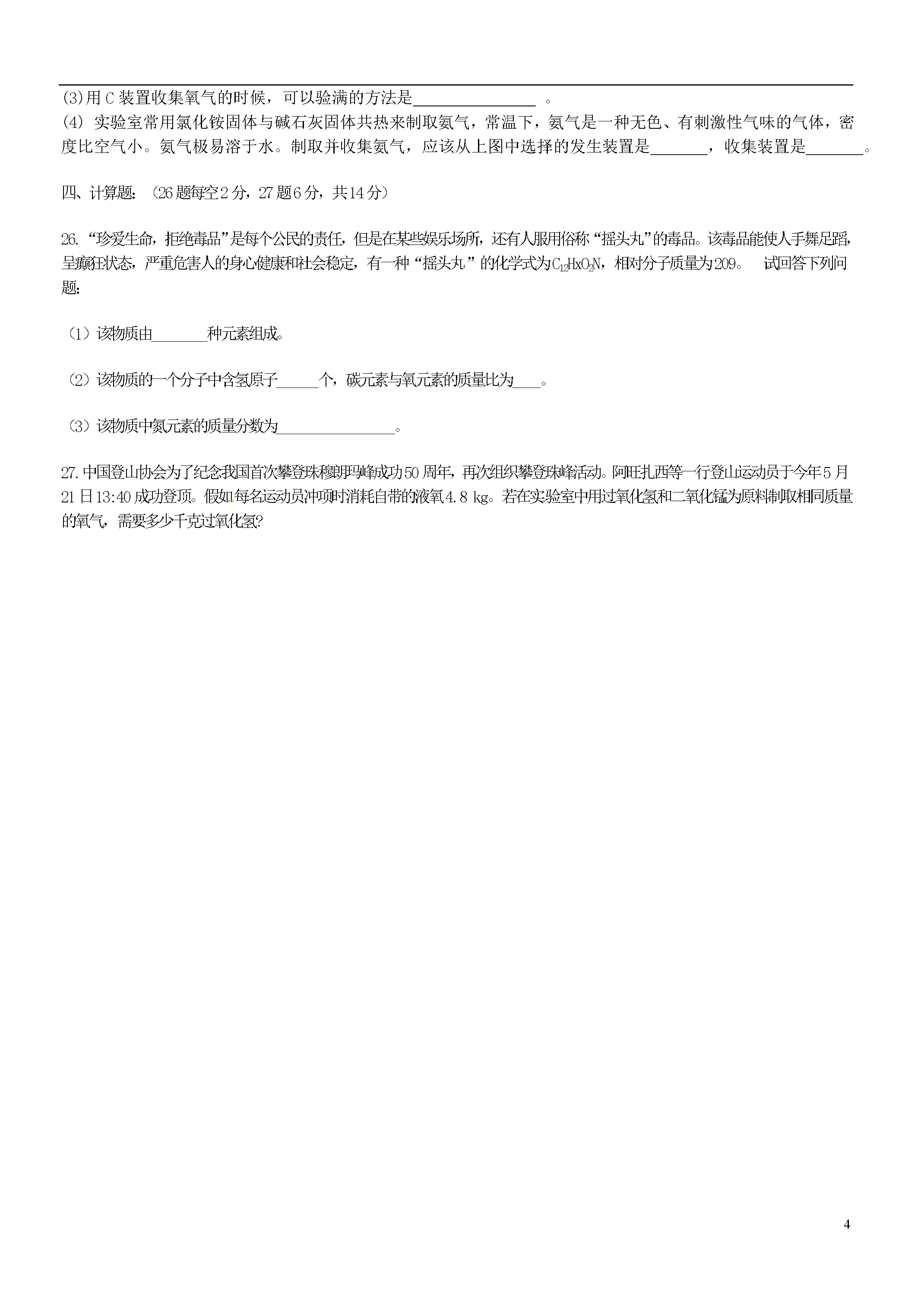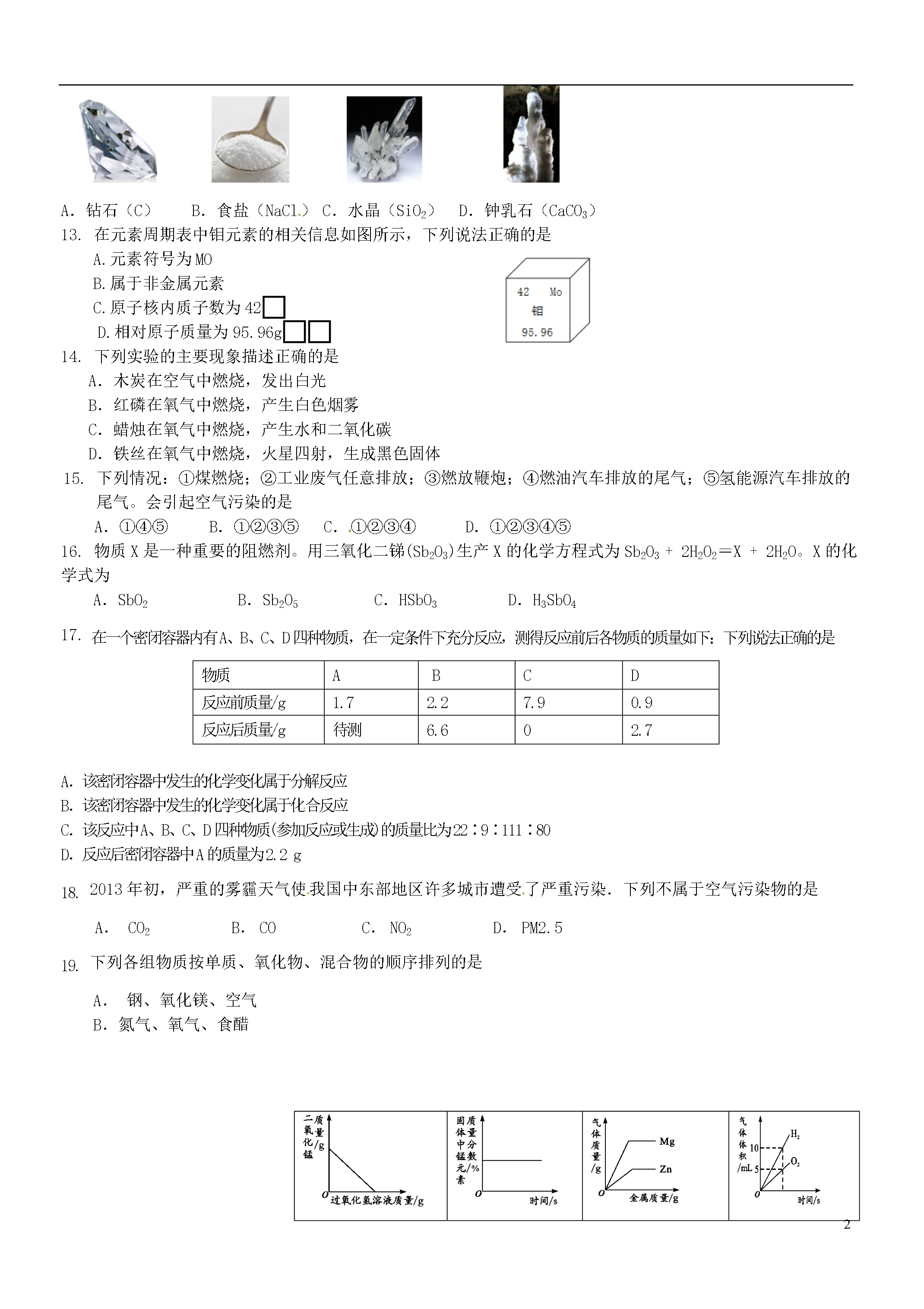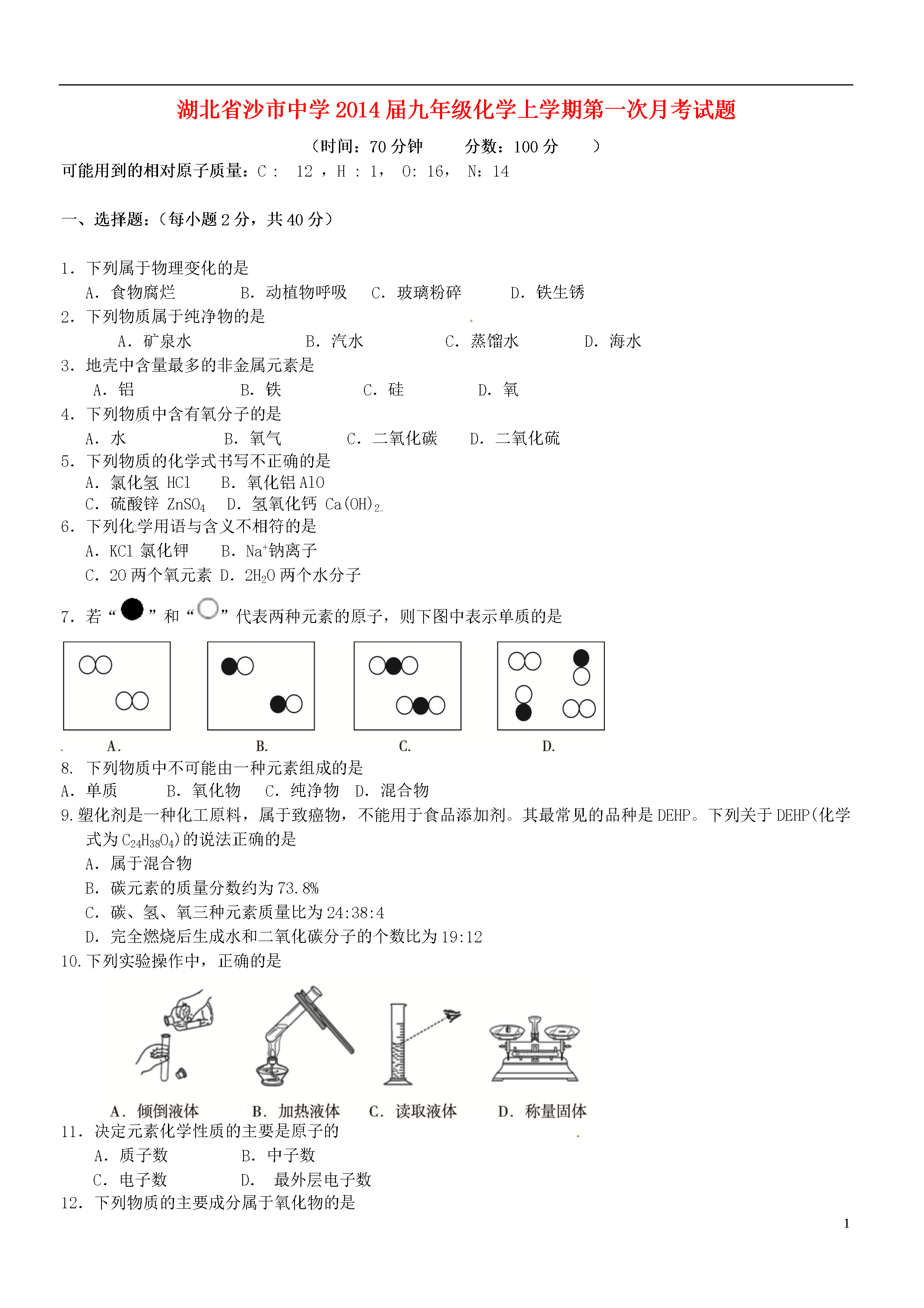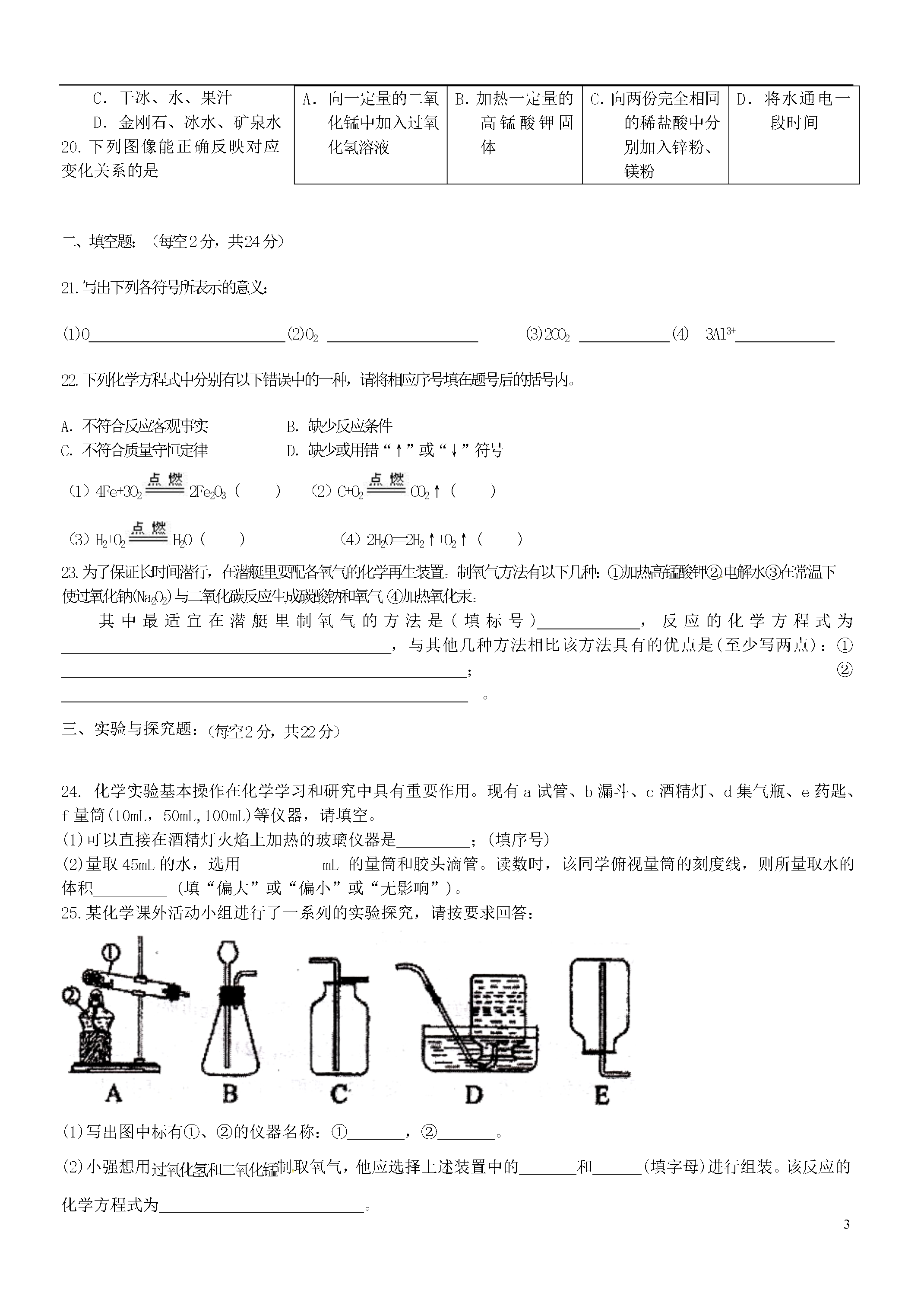 4湖北省沙市中学2014届九年级化学上学期第一次月考试题(时间:70分钟分数:100分)可能用到的相对原子质量:C:12,H:1,O:16,N:14一、选择题:(每小题2分,共40分)1.下列属于物理变化的是A.食物腐烂B.动植物呼吸C.玻璃粉碎D.铁生锈2.下列物质属于纯净物的是A.矿泉水B.汽水C.蒸馏水D.海水3.地壳中含量最多的非金属元素是A.铝B.铁C.硅D.氧4.下列物质中含有氧分子的是A.水B.氧气C.二氧化碳D.二氧化硫5.下列物质的化学式书写不正确的是A.氯化氢HClB.氧化铝AlOC.硫酸锌ZnSO4D.氢氧化钙Ca(OH)26.下列化学用语与含义不相符的是A.KCl氯化钾B.Na+钠离子C.2O两个氧元素D.2H2O两个水分子7.若“”和“”代表两种元素的原子,则下图中表示单质的是8.下列物质中不可能由一种元素组成的是A.单质B.氧化物C.纯净物D.混合物9.塑化剂是一种化工原料,属于致癌物,不能用于食品添加剂。其最常见的品种是DEHP。下列关于DEHP(化学式为C24H38O4)的说法正确的是A.属于混合物B.碳元素的质量分数约为73.8%C.碳、氢、氧三种元素质量比为24:38:4D.完全燃烧后生成水和二氧化碳分子的个数比为19:1210.下列实验操作中,正确的是11.决定元素化学性质的主要是原子的A.质子数B.中子数C.电子数D.最外层电子数12.下列物质的主要成分属于氧化物的是A.钻石(C)B.食盐(NaCl)C.水晶(SiO2)D.钟乳石(CaCO3)13.在元素周期表中钼元素的相关信息如图所示,下列说法正确的是A.元素符号为MOB.属于非金属元素C.原子核内质子数为42D.相对原子质量为95.96g14.下列实验的主要现象描述正确的是A.木炭在空气中燃烧,发出白光B.红磷在氧气中燃烧,产生白色烟雾C.蜡烛在氧气中燃烧,产生水和二氧化碳D.铁丝在氧气中燃烧,火星四射,生成黑色固体15.下列情况:①煤燃烧;②工业废气任意排放;③燃放鞭炮;④燃油汽车排放的尾气;⑤氢能源汽车排放的尾气。会引起空气污染的是A.①④⑤B.①②③⑤C.①②③④D.①②③④⑤16.物质X是一种重要的阻燃剂。用三氧化二锑(Sb2O3)生产X的化学方程式为Sb2O3+2H2O2=X+2H2O。X的化学式为A.SbO2B.Sb2O5C.HSbO3D.H3SbO417.在一个密闭容器内有A、B、C、D四种物质,在一定条件下充分反应,测得反应前后各物质的质量如下:下列说法正确的是物质ABCD反应前质量/g1.72.27.90.9反应后质量/g待测6.602.7A.该密闭容器中发生的化学变化属于分解反应B.该密闭容器中发生的化学变化属于化合反应C.该反应中A、B、C、D四种物质(参加反应或生成)的质量比为22∶9∶111∶80D.反应后密闭容器中A的质量为2.2g18.2013年初,严重的雾霾天气使我国中东部地区许多城市遭受了严重污染.下列不属于空气污染物的是A.CO2B.COC.NO2D.PM2.519.下列各组物质按单质、氧化物、混合物的顺序排列的是A.钢、氧化镁、空气B.氮气、氧气、食醋A.向一定量的二氧化锰中加入过氧化氢溶液B.加热一定量的高锰酸钾固体C.向两份完全相同的稀盐酸中分别加入锌粉、镁粉D.将水通电一段时间C.干冰、水、果汁D.金刚石、冰水、矿泉水20.下列图像能正确反映对应变化关系的是二、填空题:(每空2分,共24分)21.写出下列各符号所表示的意义:(1)O(2)O2(3)2CO2(4)3Al3+22.下列化学方程式中分别有以下错误中的一种,请将相应序号填在题号后的括号内。A.不符合反应客观事实B.缺少反应条件C.不符合质量守恒定律D.缺少或用错“↑”或“↓”符号(1)4Fe+3O22Fe2O3()(2)C+O2CO2↑()(3)H2+O2H2O()(4)2H2O==2H2↑+O2↑()23.为了保证长时间潜行,在潜艇里要配备氧气的化学再生装置。制氧气方法有以下几种:①加热高锰酸钾②电解水③在常温下使过氧化钠(Na2O2)与二氧化碳反应生成碳酸钠和氧气④加热氧化汞。其中最适宜在潜艇里制氧气的方法是(填标号),反应的化学方程式为,与其他几种方法相比该方法具有的优点是(至少写两点):①;②。三、实验与探究题:(每空2分,共22分)24.化学实验基本操作在化学学习和研究中具有重要作用。现有a试管、b漏斗、c酒精灯、d集气瓶、e药匙、f量筒(10mL,50mL,100mL)等仪器,请填空。(1)可以直接在酒精灯火焰上加热的玻璃仪器是_________;(填序号)(2)量取45mL的水,选用_________mL的量筒和胶头滴管。读数时,该同学俯视量筒的刻度线,则所量取水的体积_________(填“偏大”或“偏小”