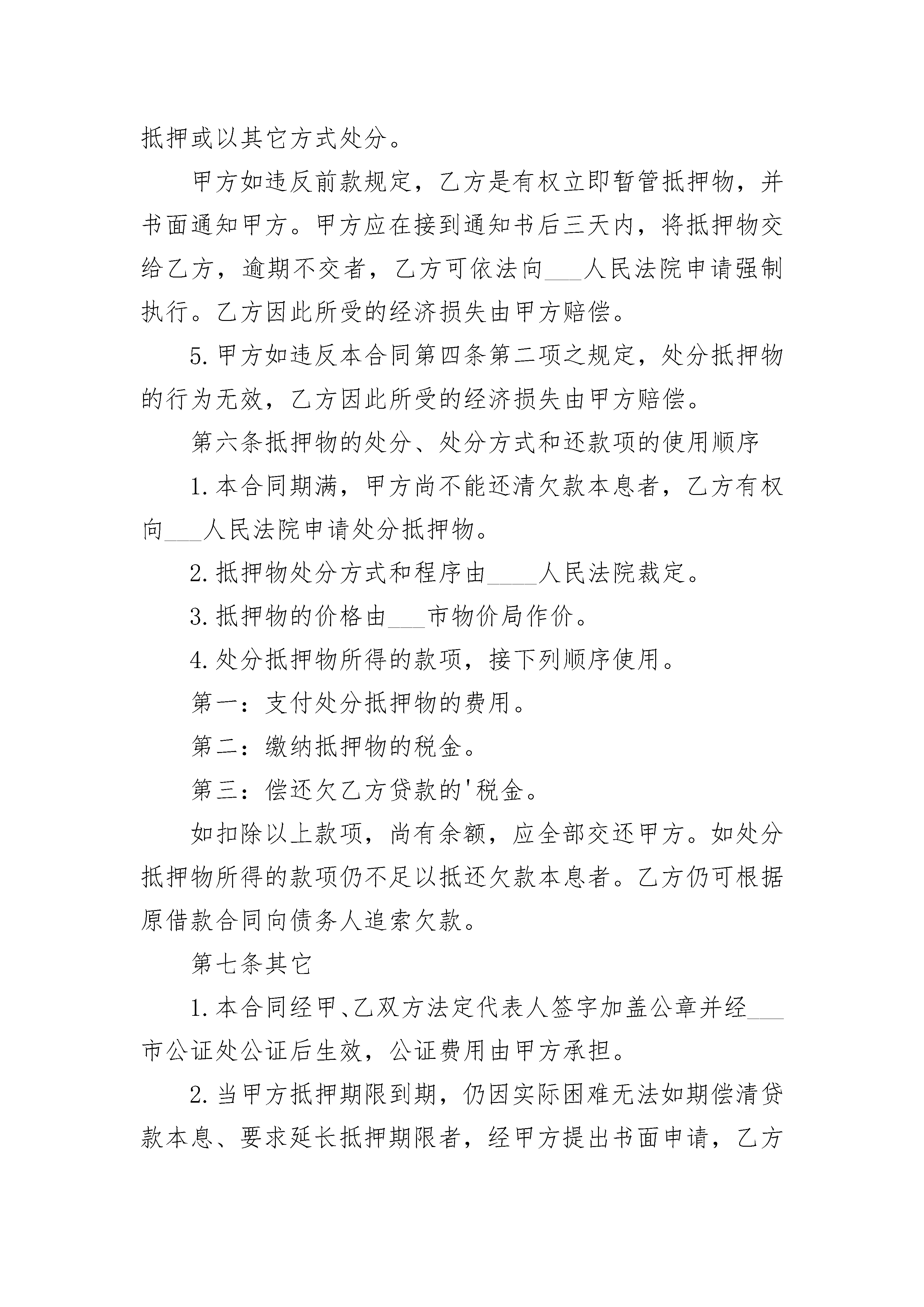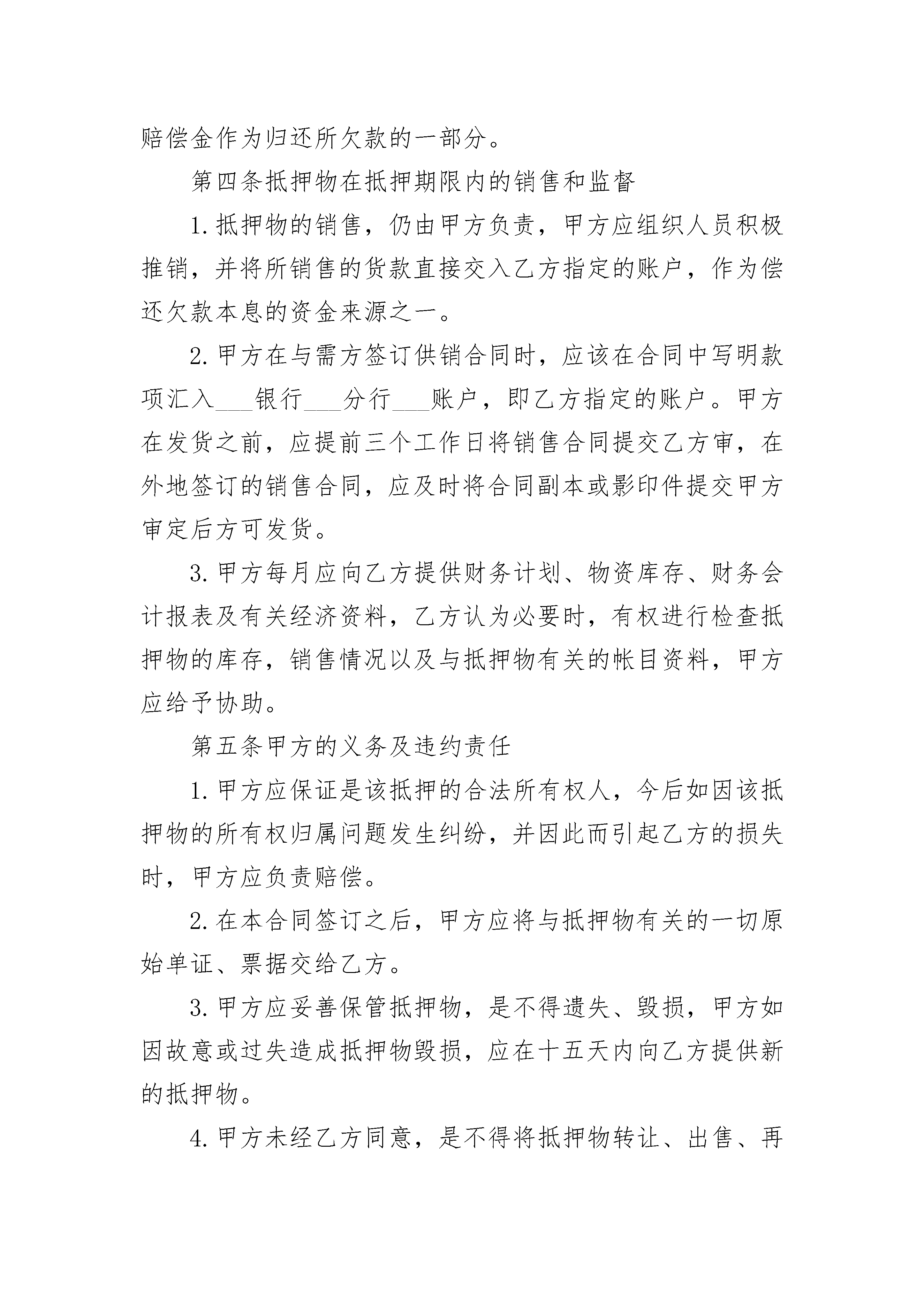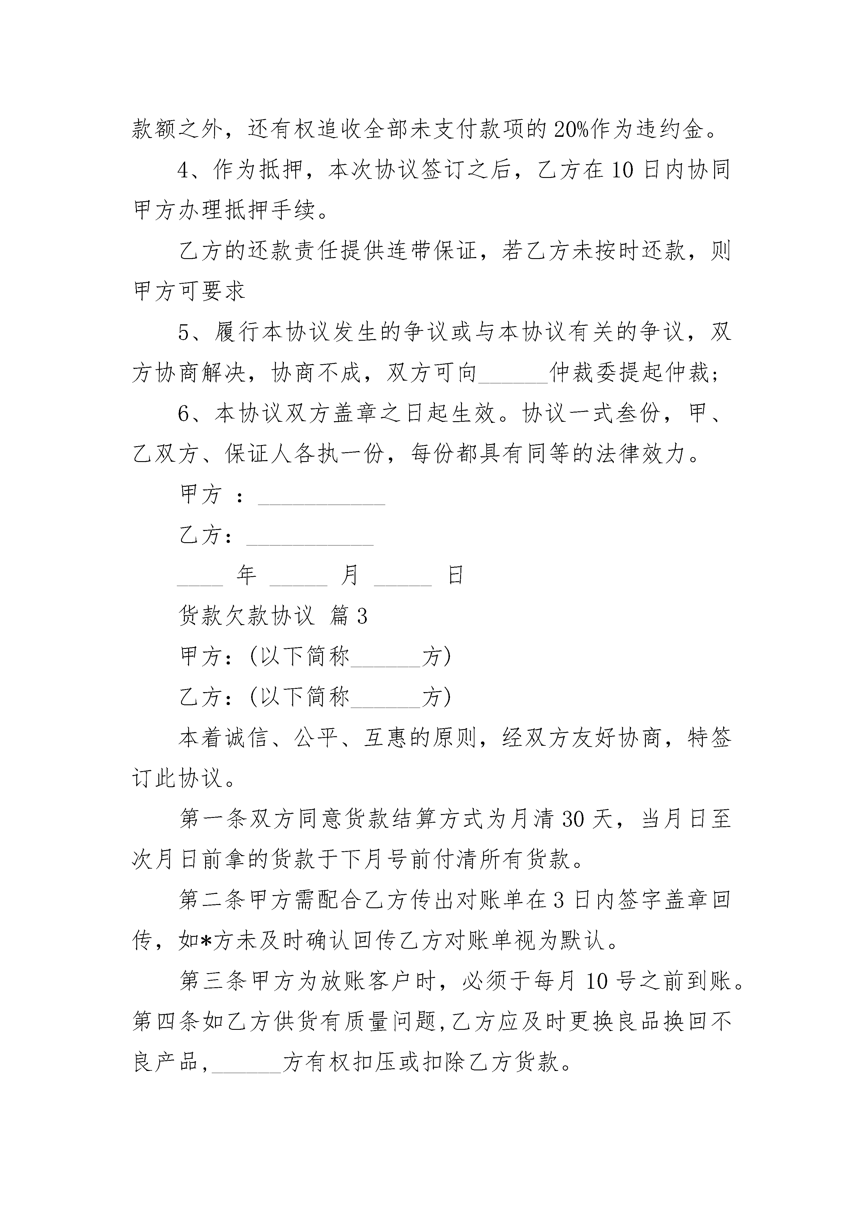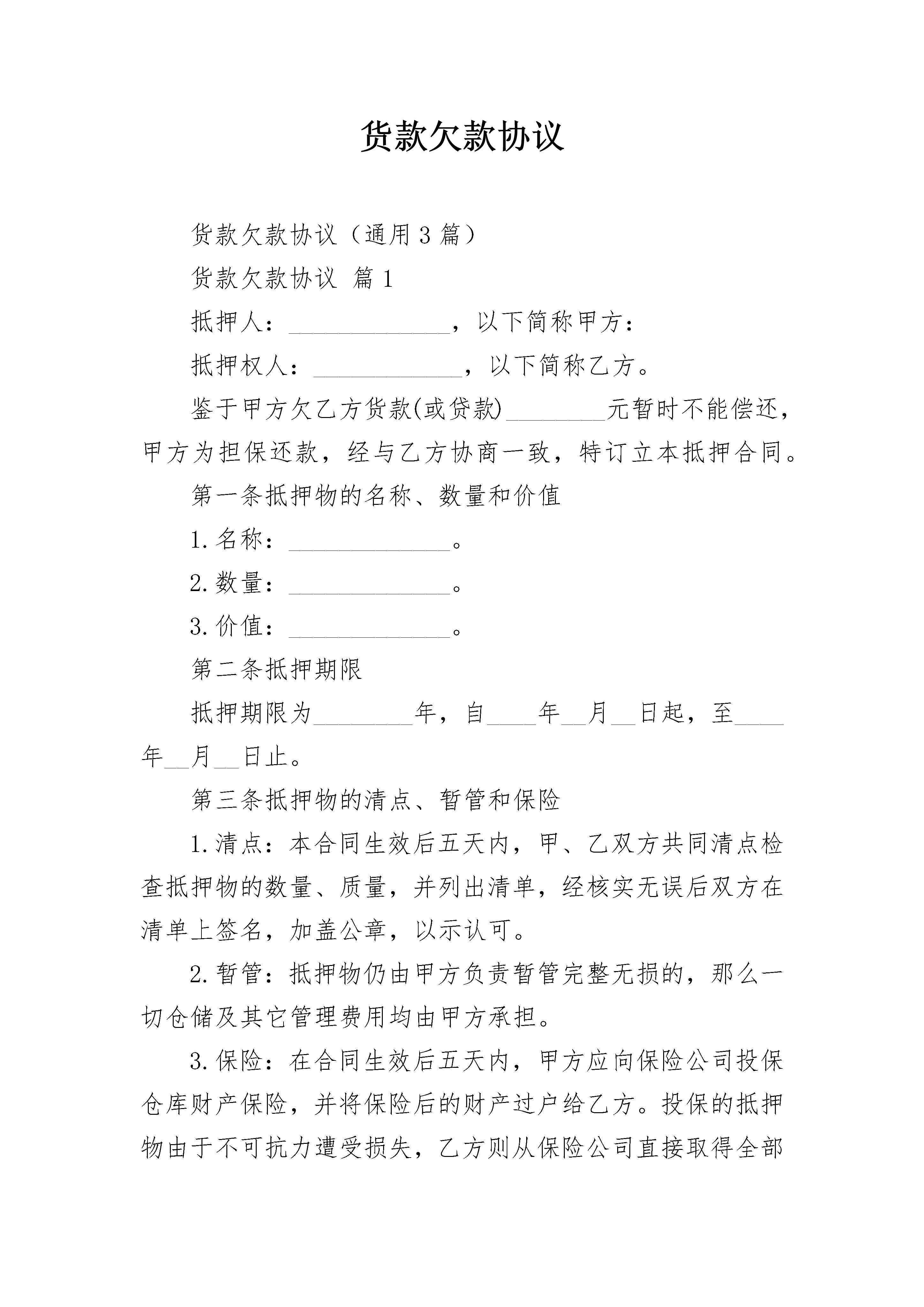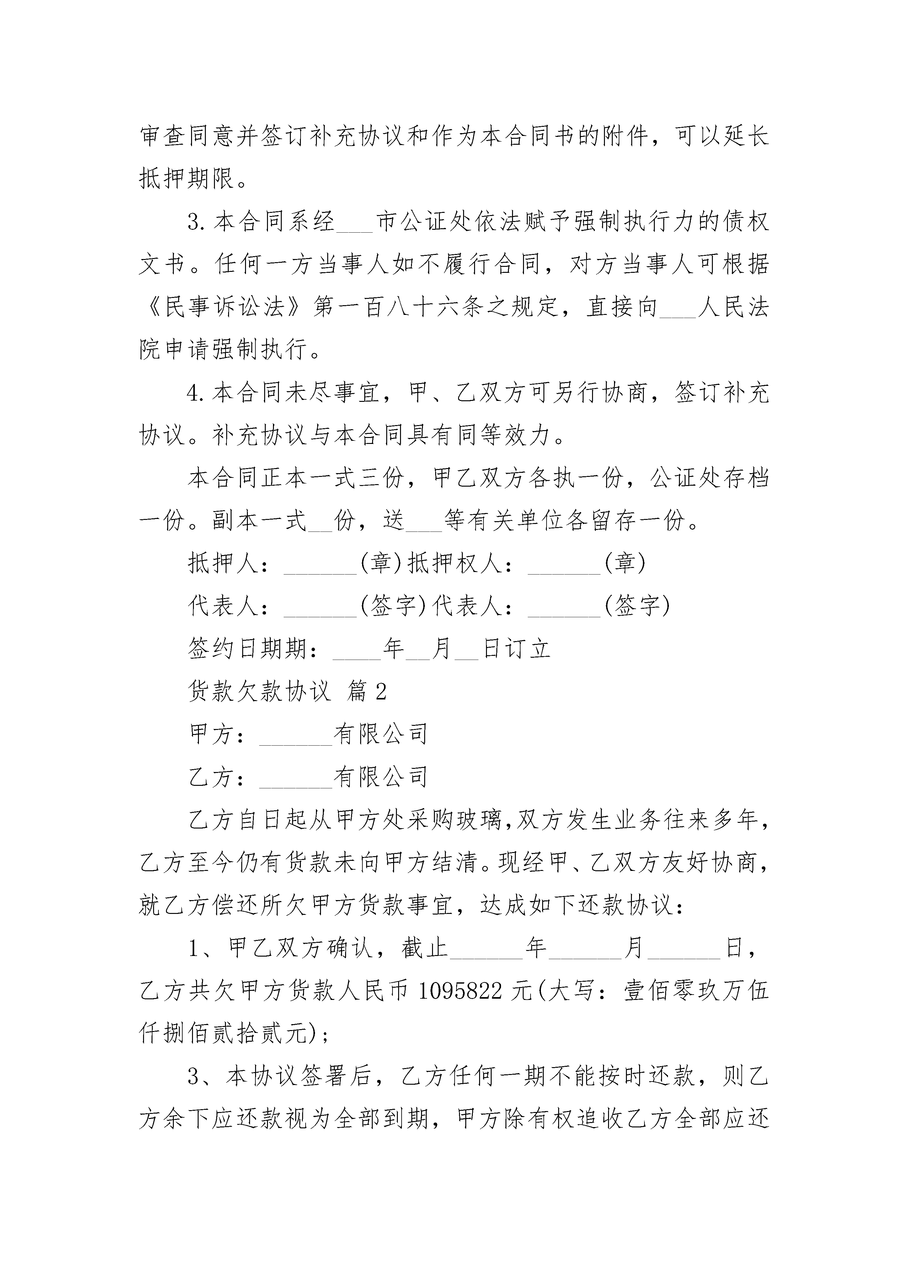 货款欠款协议货款欠款协议(通用3篇)货款欠款协议篇1抵押人:_____________,以下简称甲方:抵押权人:____________,以下简称乙方。鉴于甲方欠乙方货款(或贷款)________元暂时不能偿还,甲方为担保还款,经与乙方协商一致,特订立本抵押合同。第一条抵押物的名称、数量和价值1.名称:_____________。2.数量:_____________。3.价值:_____________。第二条抵押期限抵押期限为________年,自____年__月__日起,至____年__月__日止。第三条抵押物的清点、暂管和保险1.清点:本合同生效后五天内,甲、乙双方共同清点检查抵押物的数量、质量,并列出清单,经核实无误后双方在清单上签名,加盖公章,以示认可。2.暂管:抵押物仍由甲方负责暂管完整无损的,那么一切仓储及其它管理费用均由甲方承担。3.保险:在合同生效后五天内,甲方应向保险公司投保仓库财产保险,并将保险后的财产过户给乙方。投保的抵押物由于不可抗力遭受损失,乙方则从保险公司直接取得全部赔偿金作为归还所欠款的一部分。第四条抵押物在抵押期限内的销售和监督1.抵押物的销售,仍由甲方负责,甲方应组织人员积极推销,并将所销售的货款直接交入乙方指定的账户,作为偿还欠款本息的资金来源之一。2.甲方在与需方签订供销合同时,应该在合同中写明款项汇入___银行___分行___账户,即乙方指定的账户。甲方在发货之前,应提前三个工作日将销售合同提交乙方审,在外地签订的销售合同,应及时将合同副本或影印件提交甲方审定后方可发货。3.甲方每月应向乙方提供财务计划、物资库存、财务会计报表及有关经济资料,乙方认为必要时,有权进行检查抵押物的库存,销售情况以及与抵押物有关的帐目资料,甲方应给予协助。第五条甲方的义务及违约责任1.甲方应保证是该抵押的合法所有权人,今后如因该抵押物的所有权归属问题发生纠纷,并因此而引起乙方的损失时,甲方应负责赔偿。2.在本合同签订之后,甲方应将与抵押物有关的一切原始单证、票据交给乙方。3.甲方应妥善保管抵押物,是不得遗失、毁损,甲方如因故意或过失造成抵押物毁损,应在十五天内向乙方提供新的抵押物。4.甲方未经乙方同意,是不得将抵押物转让、出售、再抵押或以其它方式处分。甲方如违反前款规定,乙方是有权立即暂管抵押物,并书面通知甲方。甲方应在接到通知书后三天内,将抵押物交给乙方,逾期不交者,乙方可依法向___人民法院申请强制执行。乙方因此所受的经济损失由甲方赔偿。5.甲方如违反本合同第四条第二项之规定,处分抵押物的行为无效,乙方因此所受的经济损失由甲方赔偿。第六条抵押物的处分、处分方式和还款项的使用顺序1.本合同期满,甲方尚不能还清欠款本息者,乙方有权向___人民法院申请处分抵押物。2.抵押物处分方式和程序由____人民法院裁定。3.抵押物的价格由___市物价局作价。4.处分抵押物所得的款项,接下列顺序使用。第一:支付处分抵押物的费用。第二:缴纳抵押物的税金。第三:偿还欠乙方贷款的'税金。如扣除以上款项,尚有余额,应全部交还甲方。如处分抵押物所得的款项仍不足以抵还欠款本息者。乙方仍可根据原借款合同向债务人追索欠款。第七条其它1.本合同经甲、乙双方法定代表人签字加盖公章并经___市公证处公证后生效,公证费用由甲方承担。2.当甲方抵押期限到期,仍因实际困难无法如期偿清贷款本息、要求延长抵押期限者,经甲方提出书面申请,乙方审查同意并签订补充协议和作为本合同书的附件,可以延长抵押期限。3.本合同系经___市公证处依法赋予强制执行力的债权文书。任何一方当事人如不履行合同,对方当事人可根据《民事诉讼法》第一百八十六条之规定,直接向___人民法院申请强制执行。4.本合同未尽事宜,甲、乙双方可另行协商,签订补充协议。补充协议与本合同具有同等效力。本合同正本一式三份,甲乙双方各执一份,公证处存档一份。副本一式__份,送___等有关单位各留存一份。抵押人:______(章)抵押权人:______(章)代表人:______(签字)代表人:______(签字)签约日期期:____年__月__日订立货款欠款协议篇2甲方:______有限公司乙方:______有限公司乙方自日起从甲方处采购玻璃,双方发生业务往来多年,乙方至今仍有货款未向甲方结清。现经甲、乙双方友好协商,就乙方偿还所欠甲方货款事宜,达成如下还款协议:1、甲乙双方确认,截止______年______月______日,乙方共欠甲方货款人民币1095822元(大写:壹佰零玖万伍仟捌佰贰拾贰元);3、本协议签署后,乙方任何一期不能按时还款,则乙方余下应还款视为全部到期,甲方除有权追收乙方全部应还款额之外,还有权追收全部未支付款项的20%作为违约金。4、作为抵押,本次协议签订之后,乙方在10日内协