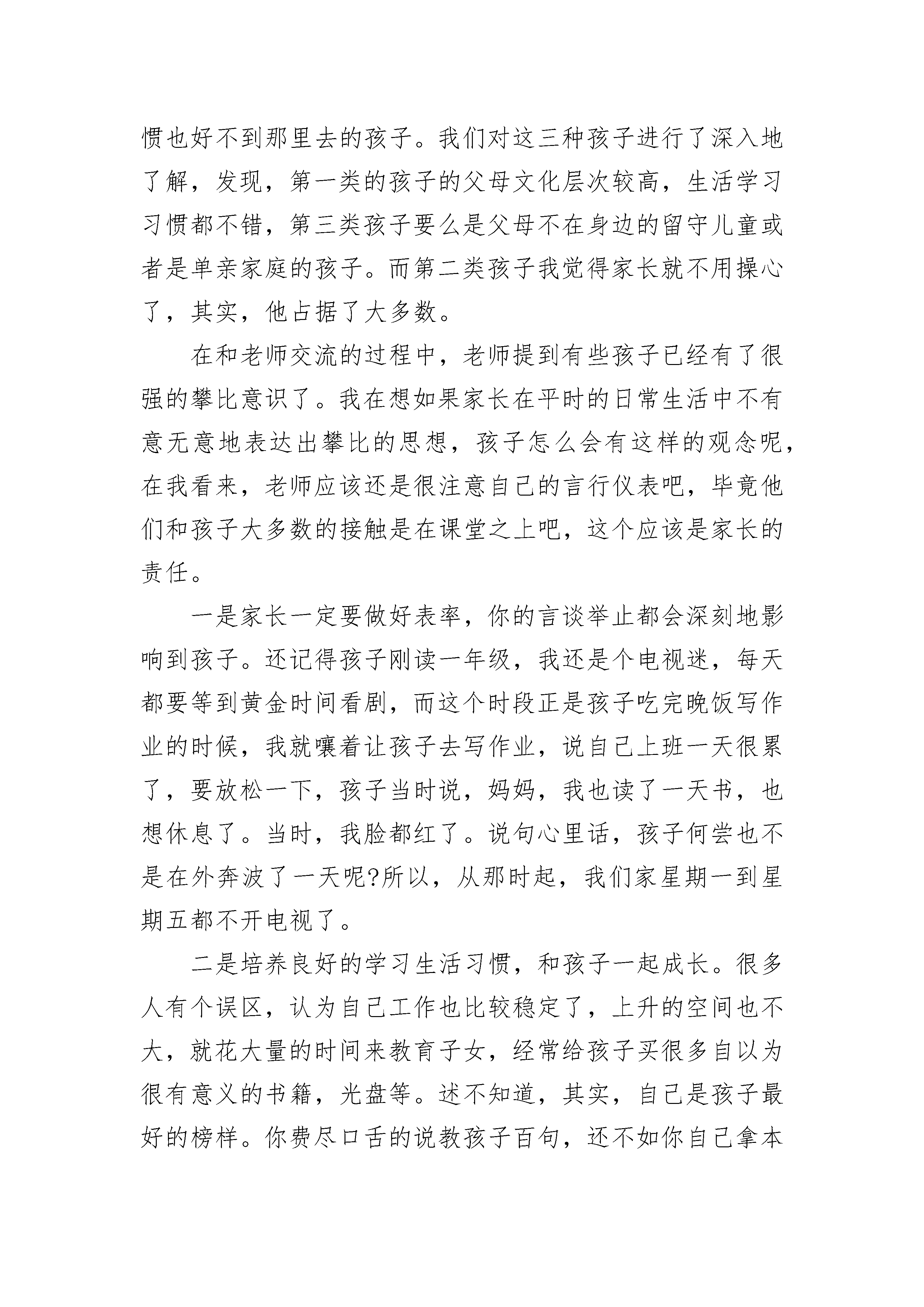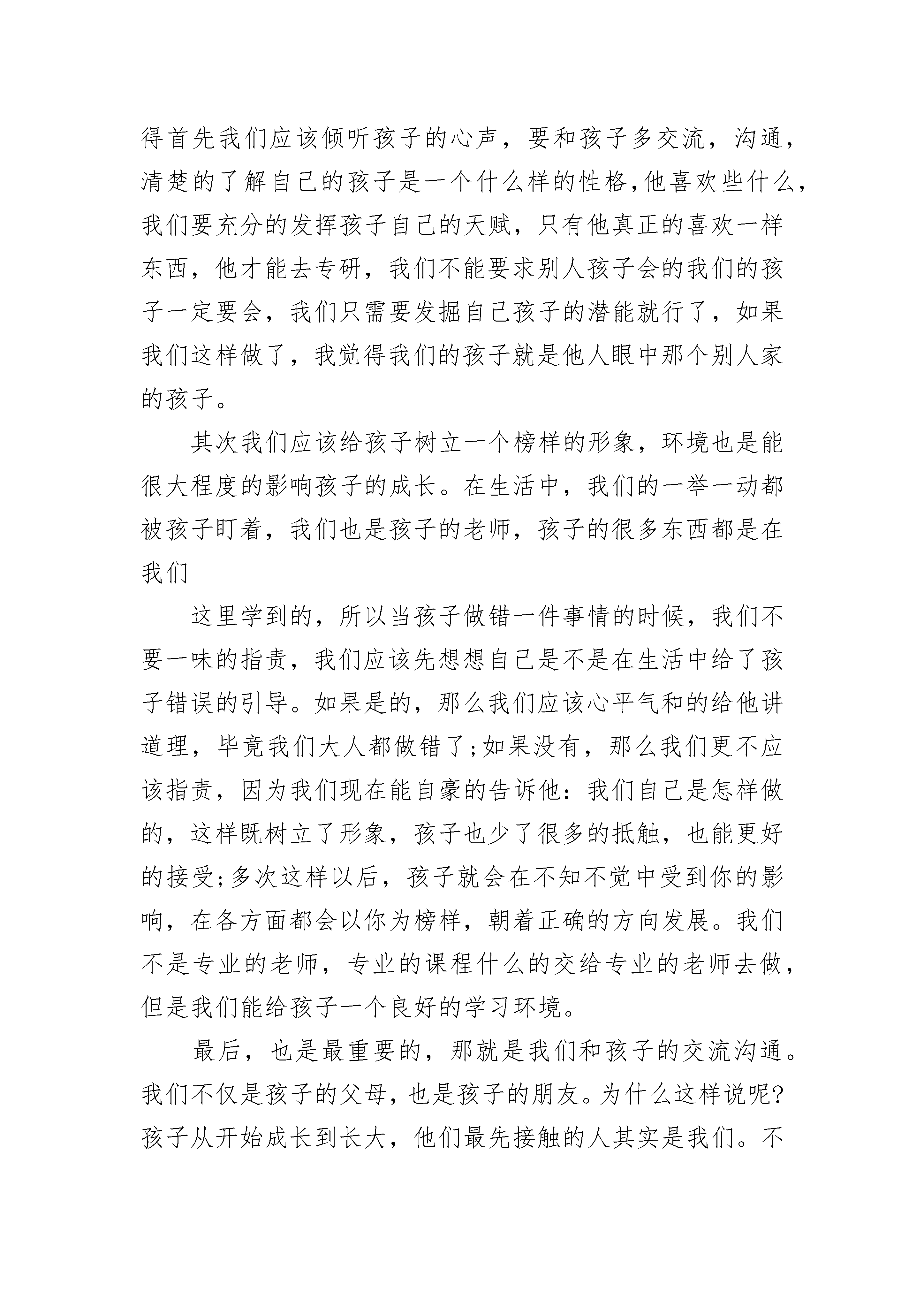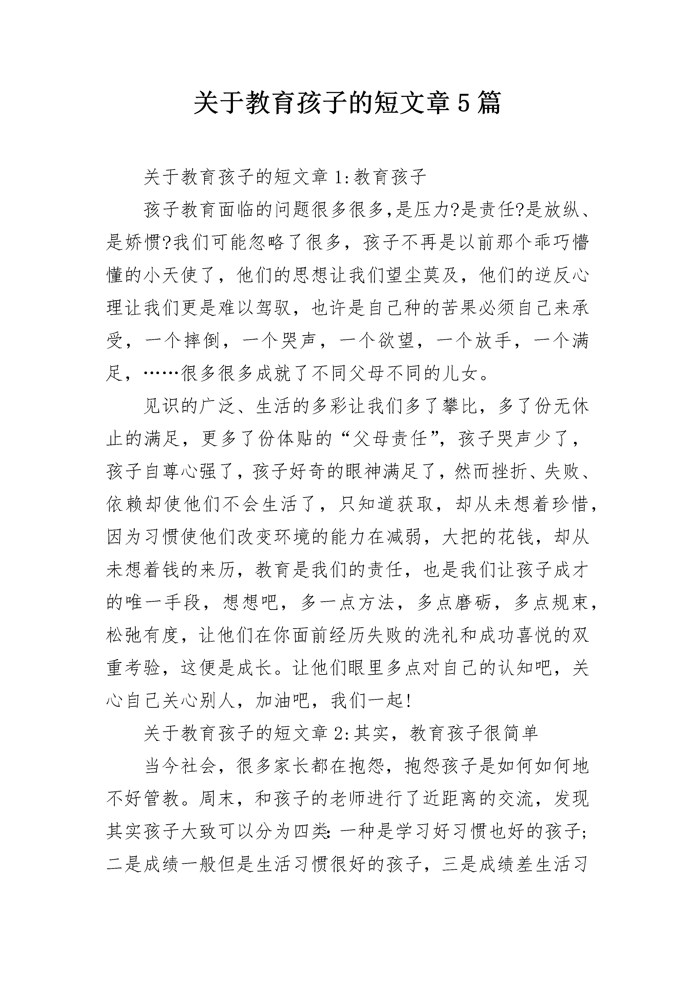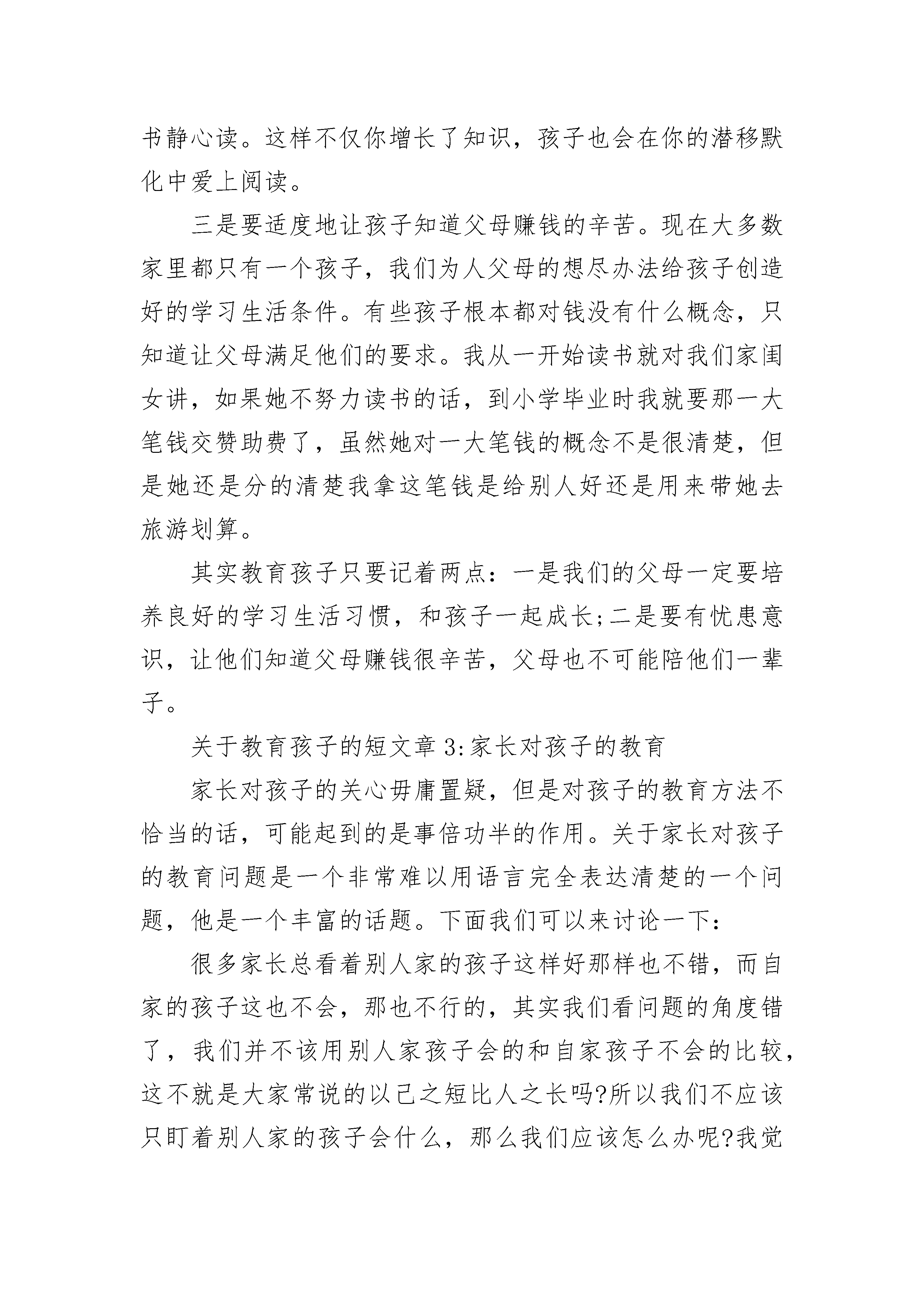 关于教育孩子的短文章5篇关于教育孩子的短文章1:教育孩子孩子教育面临的问题很多很多,是压力?是责任?是放纵、是娇惯?我们可能忽略了很多,孩子不再是以前那个乖巧懵懂的小天使了,他们的思想让我们望尘莫及,他们的逆反心理让我们更是难以驾驭,也许是自己种的苦果必须自己来承受,一个摔倒,一个哭声,一个欲望,一个放手,一个满足,……很多很多成就了不同父母不同的儿女。见识的广泛、生活的多彩让我们多了攀比,多了份无休止的满足,更多了份体贴的“父母责任”,孩子哭声少了,孩子自尊心强了,孩子好奇的眼神满足了,然而挫折、失败、依赖却使他们不会生活了,只知道获取,却从未想着珍惜,因为习惯使他们改变环境的能力在减弱,大把的花钱,却从未想着钱的来历,教育是我们的责任,也是我们让孩子成才的唯一手段,想想吧,多一点方法,多点磨砺,多点规束,松弛有度,让他们在你面前经历失败的洗礼和成功喜悦的双重考验,这便是成长。让他们眼里多点对自己的认知吧,关心自己关心别人,加油吧,我们一起!关于教育孩子的短文章2:其实,教育孩子很简单当今社会,很多家长都在抱怨,抱怨孩子是如何如何地不好管教。周末,和孩子的老师进行了近距离的交流,发现其实孩子大致可以分为四类:一种是学习好习惯也好的孩子;二是成绩一般但是生活习惯很好的孩子,三是成绩差生活习惯也好不到那里去的孩子。我们对这三种孩子进行了深入地了解,发现,第一类的孩子的父母文化层次较高,生活学习习惯都不错,第三类孩子要么是父母不在身边的留守儿童或者是单亲家庭的孩子。而第二类孩子我觉得家长就不用操心了,其实,他占据了大多数。在和老师交流的过程中,老师提到有些孩子已经有了很强的攀比意识了。我在想如果家长在平时的日常生活中不有意无意地表达出攀比的思想,孩子怎么会有这样的观念呢,在我看来,老师应该还是很注意自己的言行仪表吧,毕竟他们和孩子大多数的接触是在课堂之上吧,这个应该是家长的责任。一是家长一定要做好表率,你的言谈举止都会深刻地影响到孩子。还记得孩子刚读一年级,我还是个电视迷,每天都要等到黄金时间看剧,而这个时段正是孩子吃完晚饭写作业的时候,我就嚷着让孩子去写作业,说自己上班一天很累了,要放松一下,孩子当时说,妈妈,我也读了一天书,也想休息了。当时,我脸都红了。说句心里话,孩子何尝也不是在外奔波了一天呢?所以,从那时起,我们家星期一到星期五都不开电视了。二是培养良好的学习生活习惯,和孩子一起成长。很多人有个误区,认为自己工作也比较稳定了,上升的空间也不大,就花大量的时间来教育子女,经常给孩子买很多自以为很有意义的书籍,光盘等。述不知道,其实,自己是孩子最好的榜样。你费尽口舌的说教孩子百句,还不如你自己拿本书静心读。这样不仅你增长了知识,孩子也会在你的潜移默化中爱上阅读。三是要适度地让孩子知道父母赚钱的辛苦。现在大多数家里都只有一个孩子,我们为人父母的想尽办法给孩子创造好的学习生活条件。有些孩子根本都对钱没有什么概念,只知道让父母满足他们的要求。我从一开始读书就对我们家闺女讲,如果她不努力读书的话,到小学毕业时我就要那一大笔钱交赞助费了,虽然她对一大笔钱的概念不是很清楚,但是她还是分的清楚我拿这笔钱是给别人好还是用来带她去旅游划算。其实教育孩子只要记着两点:一是我们的父母一定要培养良好的学习生活习惯,和孩子一起成长;二是要有忧患意识,让他们知道父母赚钱很辛苦,父母也不可能陪他们一辈子。关于教育孩子的短文章3:家长对孩子的教育家长对孩子的关心毋庸置疑,但是对孩子的教育方法不恰当的话,可能起到的是事倍功半的作用。关于家长对孩子的教育问题是一个非常难以用语言完全表达清楚的一个问题,他是一个丰富的话题。下面我们可以来讨论一下:很多家长总看着别人家的孩子这样好那样也不错,而自家的孩子这也不会,那也不行的,其实我们看问题的角度错了,我们并不该用别人家孩子会的和自家孩子不会的比较,这不就是大家常说的以己之短比人之长吗?所以我们不应该只盯着别人家的孩子会什么,那么我们应该怎么办呢?我觉得首先我们应该倾听孩子的心声,要和孩子多交流,沟通,清楚的了解自己的孩子是一个什么样的性格,他喜欢些什么,我们要充分的发挥孩子自己的天赋,只有他真正的喜欢一样东西,他才能去专研,我们不能要求别人孩子会的我们的孩子一定要会,我们只需要发掘自己孩子的潜能就行了,如果我们这样做了,我觉得我们的孩子就是他人眼中那个别人家的孩子。其次我们应该给孩子树立一个榜样的形象,环境也是能很大程度的影响孩子的成长。在生活中,我们的一举一动都被孩子盯着,我们也是孩子的老师,孩子的很多东西都是在我们这里学到的,所以当孩子做错一件事情的时候,我们不要一味的指责,我们应该先想想自己是不是在生活中给了孩子错误的引导。如果是的,那么我们应该心平气和的给他讲道理,毕竟我们大人都做错了;如果没有,那么我们