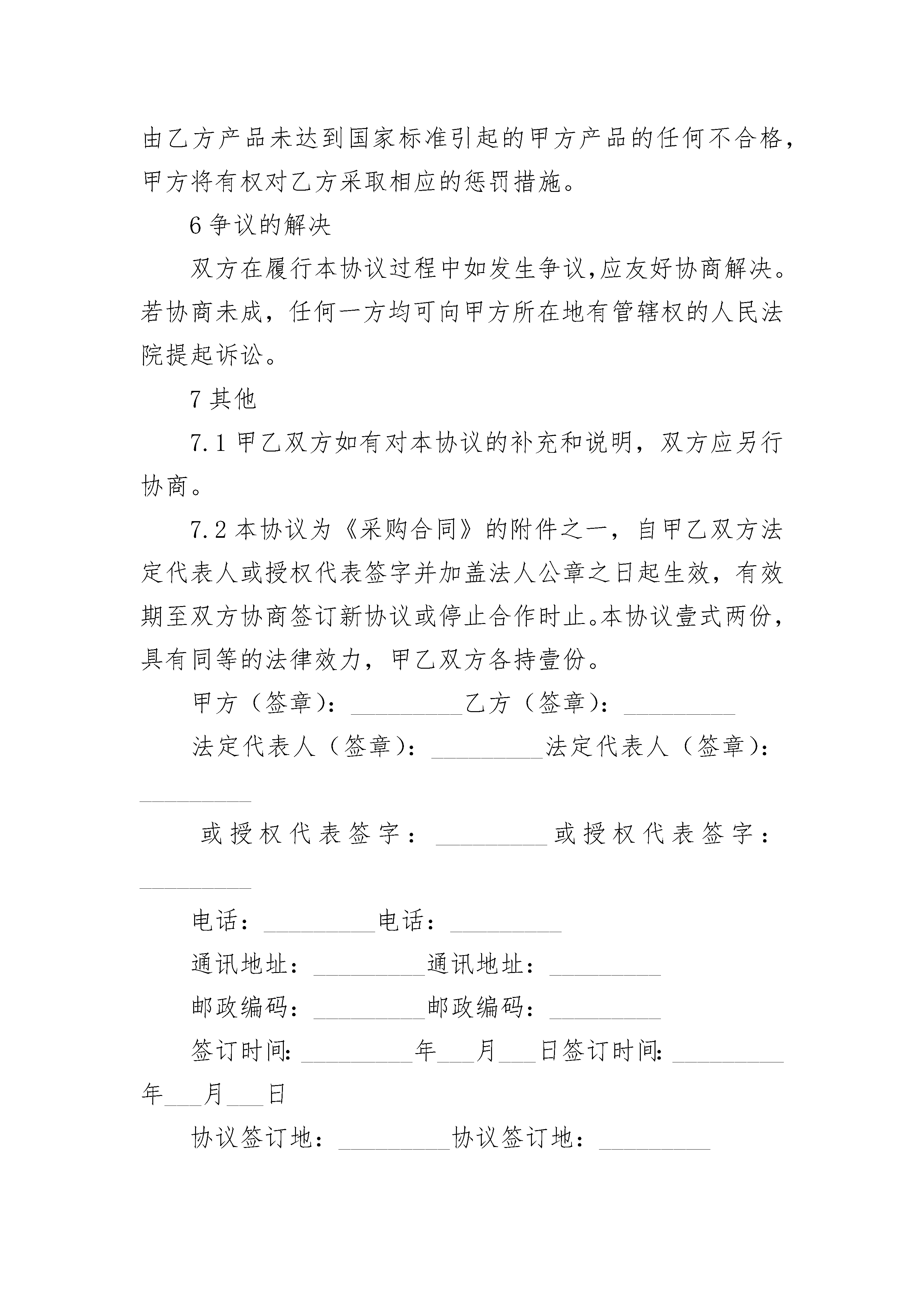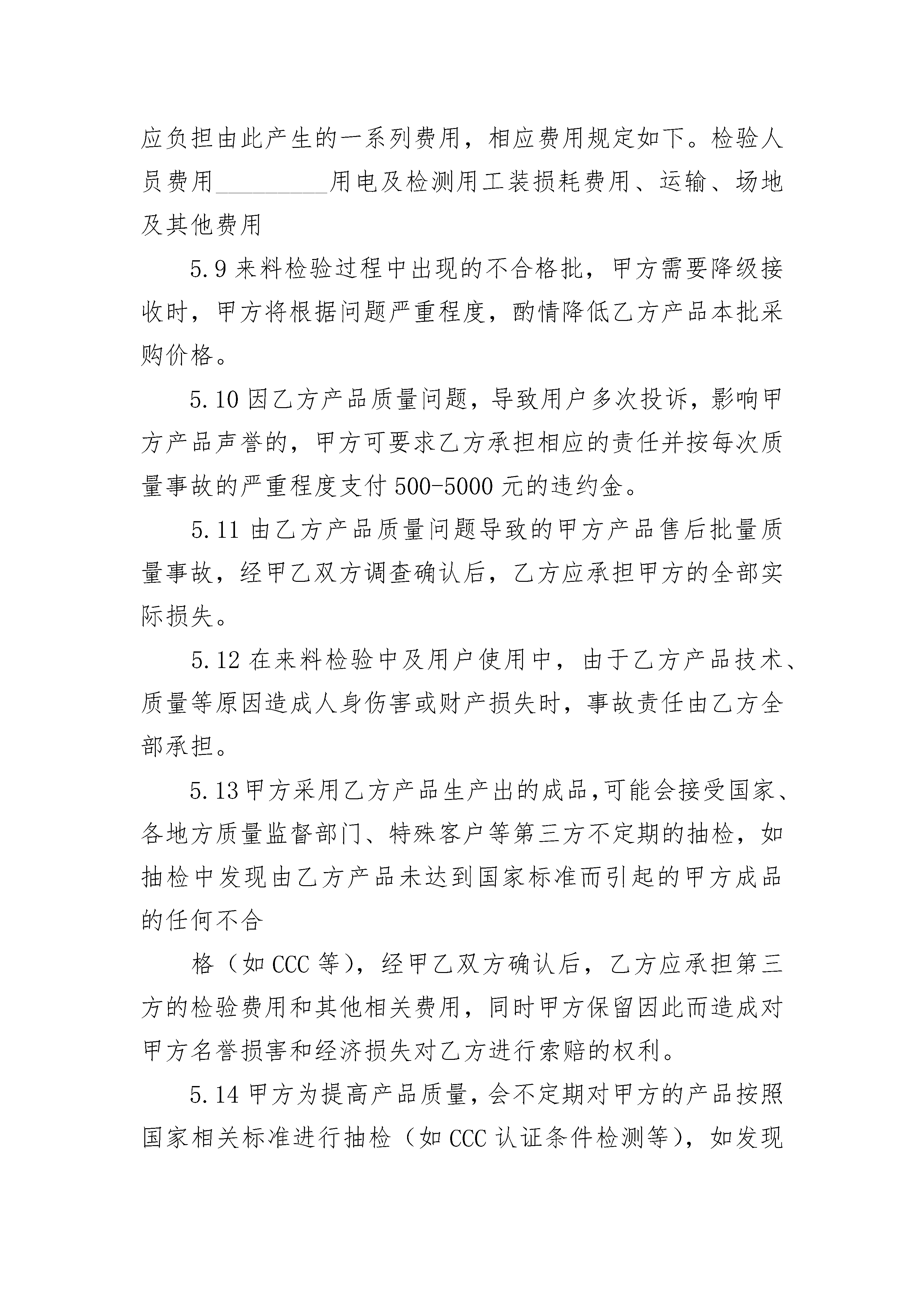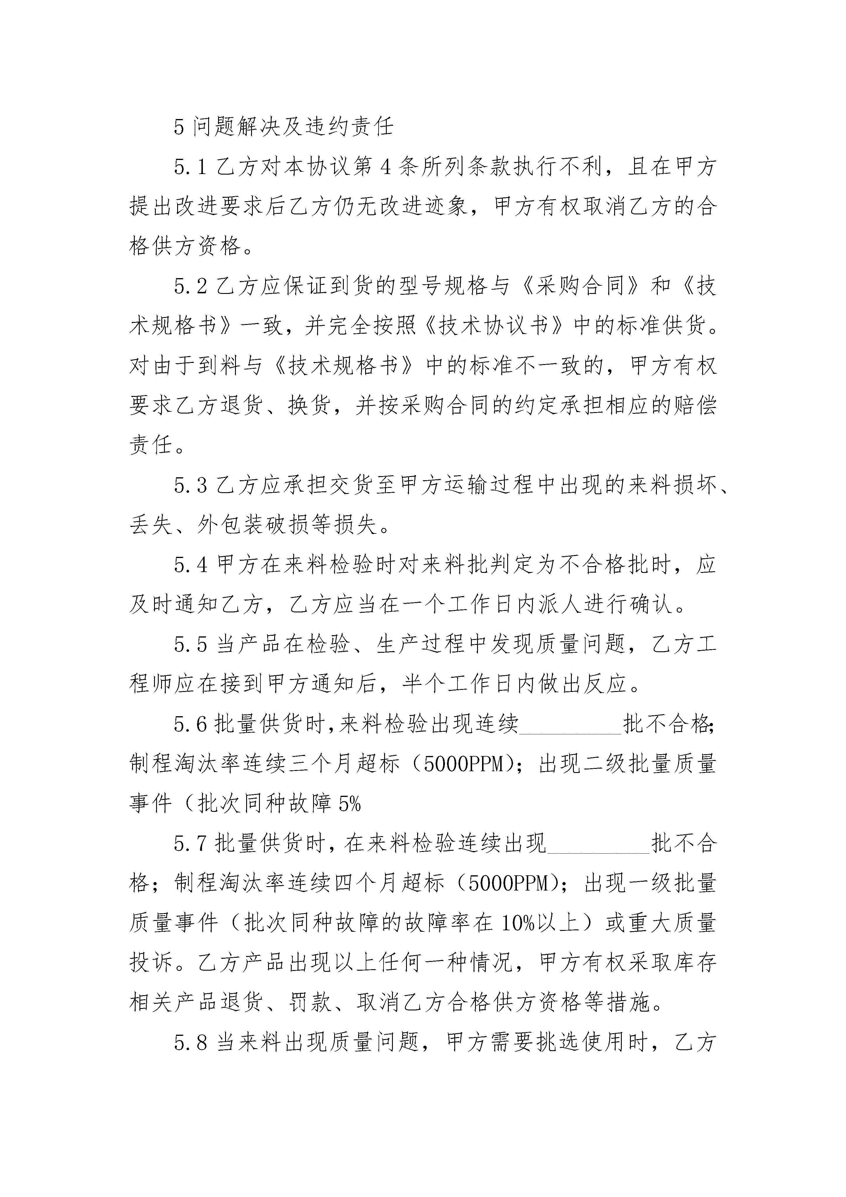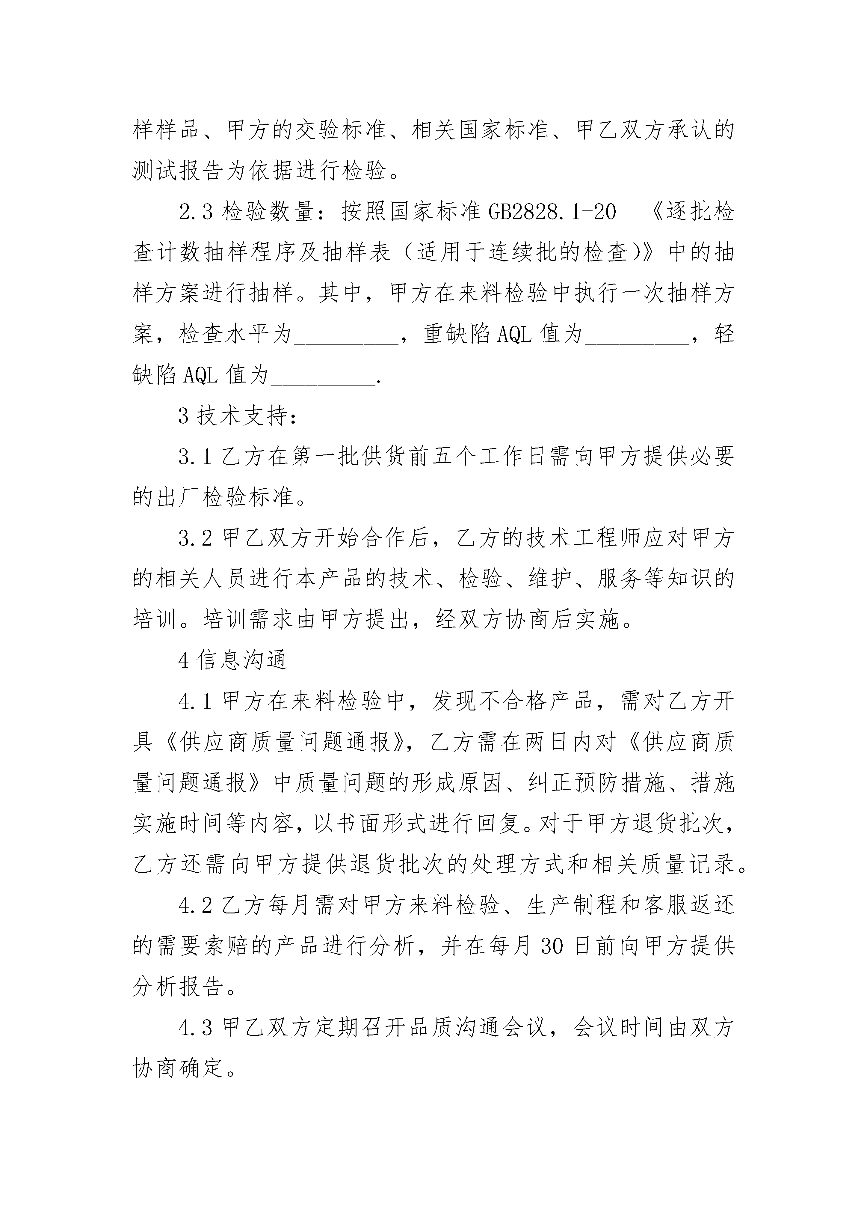 质量保证协议质量保证协议(通用22篇)质量保证协议篇1合同编号:_________需方全称:_________(以下简称甲方)供方全称:_________(以下简称乙方)产品名称:_________产品型号:_________本协议为《采购合同》的附件之一,适用于正常采购到货产品及索赔到货产品的质量要求,与该合同有同样的法律效力,甲乙双方应严格遵守。甲乙双方以相互信任、相互合作的态度,对该协议的以下条款达成一致:1产品标准:乙方应严格按照前期甲方测试确认可以接受的样品性能、以及《技术协议》,进行本产品的生产和向甲方批量供货。2检验方法:2.1样品封样:在第一批供货之前,乙方提供两个产品,由甲方研发部、质量检验部和乙方共同签字确认后,作为此产品的封样样品,以后的来料检验将以封样样品为检验的标准之一。2.2检验依据:《技术协议》规定的所有内容和要求、封样样品、甲方的交验标准、相关国家标准、甲乙双方承认的测试报告为依据进行检验。2.3检验数量:按照国家标准GB2828.1-20__《逐批检查计数抽样程序及抽样表(适用于连续批的检查)》中的抽样方案进行抽样。其中,甲方在来料检验中执行一次抽样方案,检查水平为_________,重缺陷AQL值为_________,轻缺陷AQL值为_________.3技术支持:3.1乙方在第一批供货前五个工作日需向甲方提供必要的出厂检验标准。3.2甲乙双方开始合作后,乙方的技术工程师应对甲方的相关人员进行本产品的技术、检验、维护、服务等知识的培训。培训需求由甲方提出,经双方协商后实施。4信息沟通4.1甲方在来料检验中,发现不合格产品,需对乙方开具《供应商质量问题通报》,乙方需在两日内对《供应商质量问题通报》中质量问题的形成原因、纠正预防措施、措施实施时间等内容,以书面形式进行回复。对于甲方退货批次,乙方还需向甲方提供退货批次的处理方式和相关质量记录。4.2乙方每月需对甲方来料检验、生产制程和客服返还的需要索赔的产品进行分析,并在每月30日前向甲方提供分析报告。4.3甲乙双方定期召开品质沟通会议,会议时间由双方协商确定。5问题解决及违约责任5.1乙方对本协议第4条所列条款执行不利,且在甲方提出改进要求后乙方仍无改进迹象,甲方有权取消乙方的合格供方资格。5.2乙方应保证到货的型号规格与《采购合同》和《技术规格书》一致,并完全按照《技术协议书》中的标准供货。对由于到料与《技术规格书》中的标准不一致的,甲方有权要求乙方退货、换货,并按采购合同的约定承担相应的赔偿责任。5.3乙方应承担交货至甲方运输过程中出现的来料损坏、丢失、外包装破损等损失。5.4甲方在来料检验时对来料批判定为不合格批时,应及时通知乙方,乙方应当在一个工作日内派人进行确认。5.5当产品在检验、生产过程中发现质量问题,乙方工程师应在接到甲方通知后,半个工作日内做出反应。5.6批量供货时,来料检验出现连续_________批不合格;制程淘汰率连续三个月超标(5000PPM);出现二级批量质量事件(批次同种故障5%5.7批量供货时,在来料检验连续出现_________批不合格;制程淘汰率连续四个月超标(5000PPM);出现一级批量质量事件(批次同种故障的故障率在10%以上)或重大质量投诉。乙方产品出现以上任何一种情况,甲方有权采取库存相关产品退货、罚款、取消乙方合格供方资格等措施。5.8当来料出现质量问题,甲方需要挑选使用时,乙方应负担由此产生的一系列费用,相应费用规定如下。检验人员费用_________用电及检测用工装损耗费用、运输、场地及其他费用5.9来料检验过程中出现的不合格批,甲方需要降级接收时,甲方将根据问题严重程度,酌情降低乙方产品本批采购价格。5.10因乙方产品质量问题,导致用户多次投诉,影响甲方产品声誉的,甲方可要求乙方承担相应的责任并按每次质量事故的严重程度支付500-5000元的违约金。5.11由乙方产品质量问题导致的甲方产品售后批量质量事故,经甲乙双方调查确认后,乙方应承担甲方的全部实际损失。5.12在来料检验中及用户使用中,由于乙方产品技术、质量等原因造成人身伤害或财产损失时,事故责任由乙方全部承担。5.13甲方采用乙方产品生产出的成品,可能会接受国家、各地方质量监督部门、特殊客户等第三方不定期的抽检,如抽检中发现由乙方产品未达到国家标准而引起的甲方成品的任何不合格(如CCC等),经甲乙双方确认后,乙方应承担第三方的检验费用和其他相关费用,同时甲方保留因此而造成对甲方名誉损害和经济损失对乙方进行索赔的权利。5.14甲方为提高产品质量,会不定期对甲方的产品按照国家相关标准进行抽检(如CCC认证条件检测等),如发现由乙方产品未达到国家标准引起的甲方产品的任何不合格,甲方将有权对乙方采取相应的惩罚措施。6争议的解决双方在履行本
