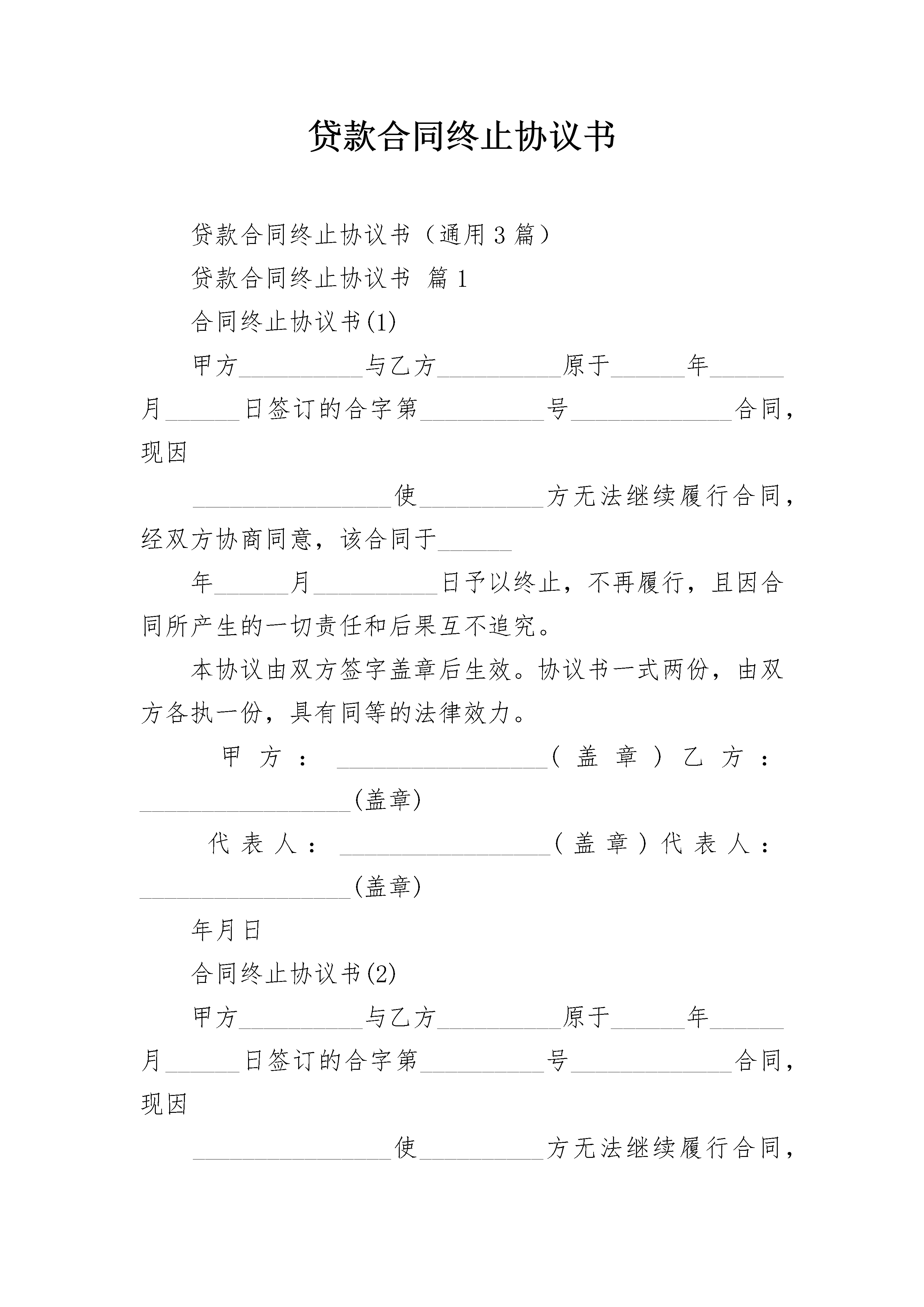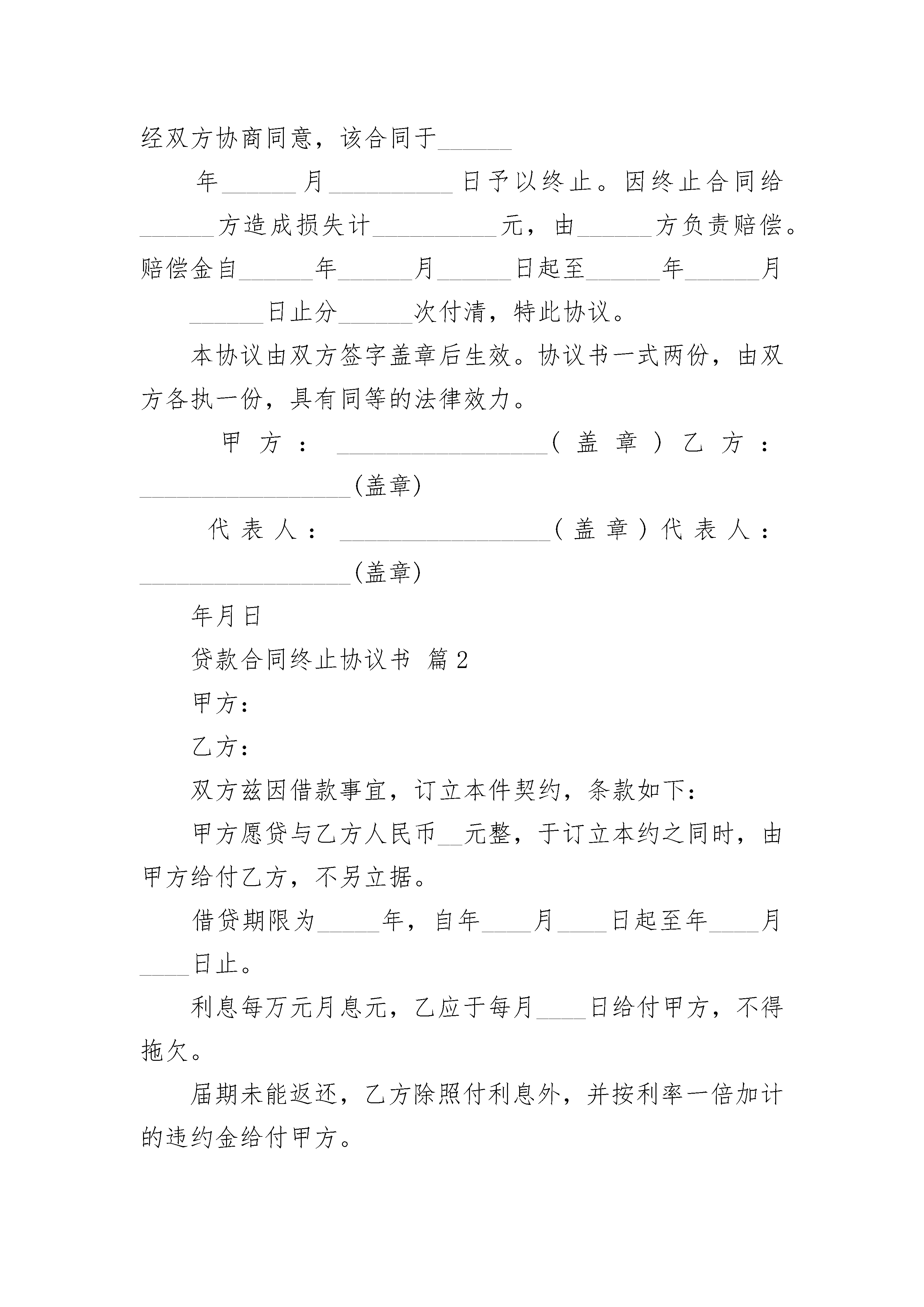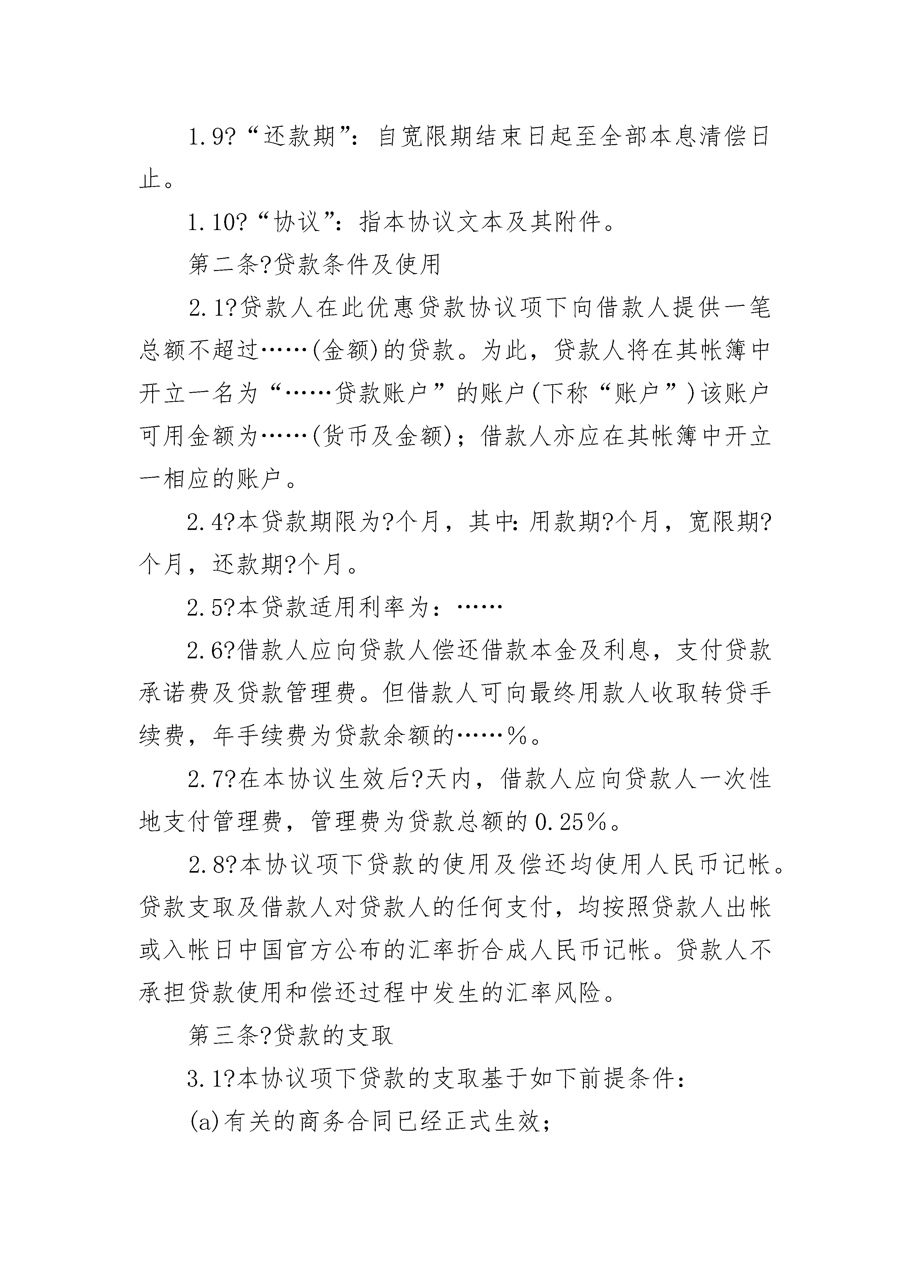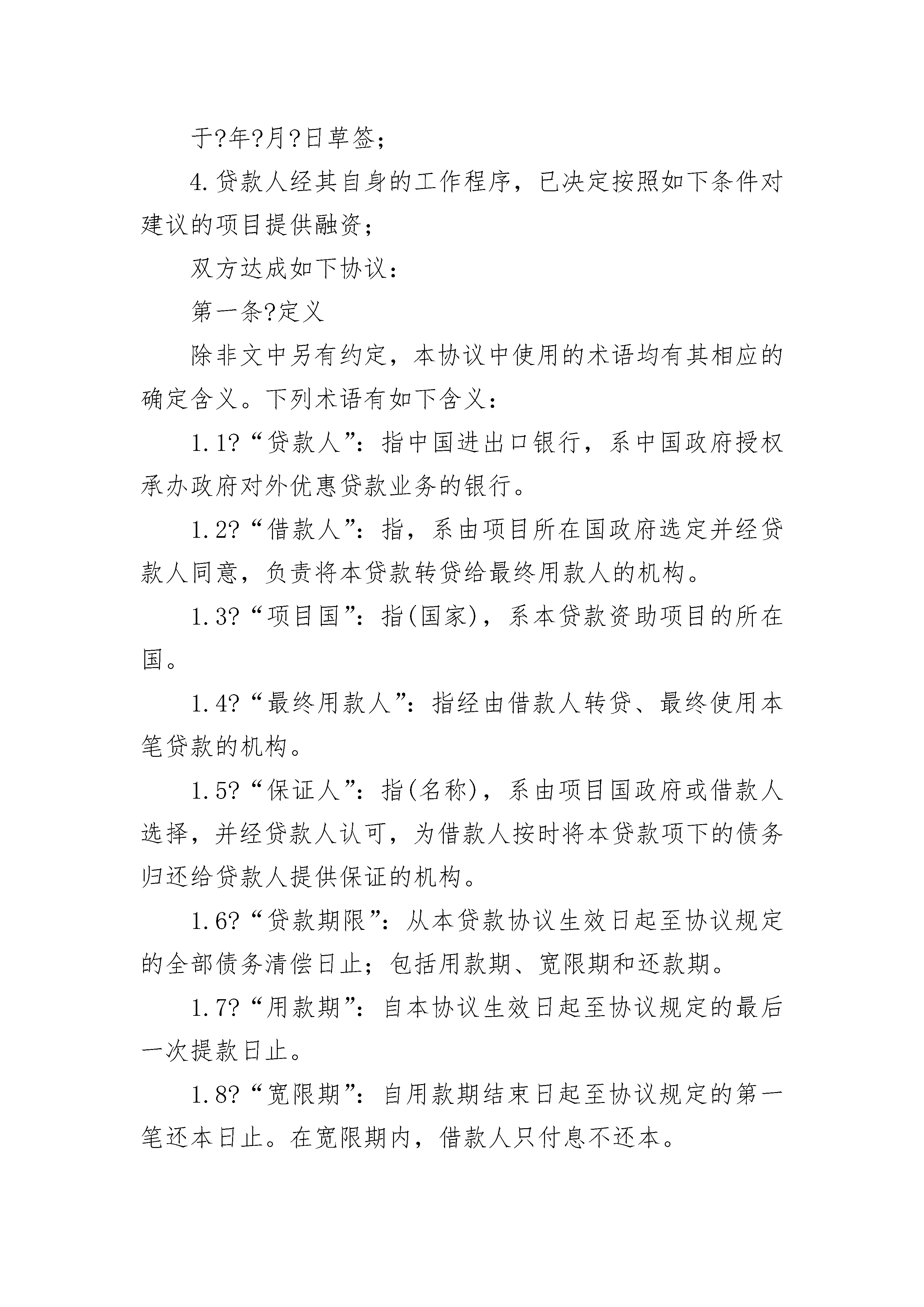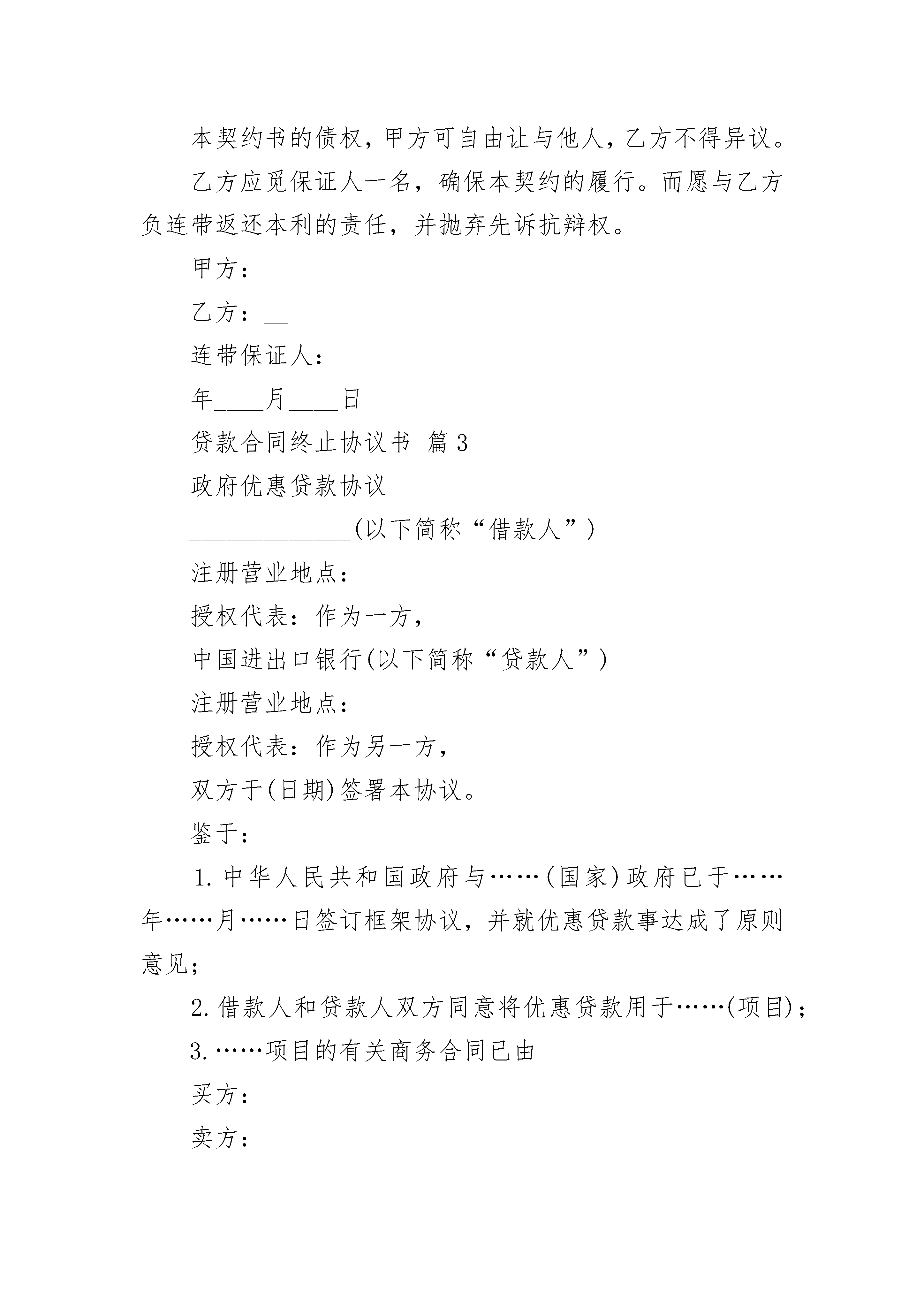 贷款合同终止协议书贷款合同终止协议书(通用3篇)贷款合同终止协议书篇1合同终止协议书(1)甲方__________与乙方__________原于______年______月______日签订的合字第__________号_____________合同,现因________________使__________方无法继续履行合同,经双方协商同意,该合同于______年______月__________日予以终止,不再履行,且因合同所产生的一切责任和后果互不追究。本协议由双方签字盖章后生效。协议书一式两份,由双方各执一份,具有同等的法律效力。甲方:_________________(盖章)乙方:_________________(盖章)代表人:_________________(盖章)代表人:_________________(盖章)年月日合同终止协议书(2)甲方__________与乙方__________原于______年______月______日签订的合字第__________号_____________合同,现因________________使__________方无法继续履行合同,经双方协商同意,该合同于______年______月__________日予以终止。因终止合同给______方造成损失计__________元,由______方负责赔偿。赔偿金自______年______月______日起至______年______月______日止分______次付清,特此协议。本协议由双方签字盖章后生效。协议书一式两份,由双方各执一份,具有同等的法律效力。甲方:_________________(盖章)乙方:_________________(盖章)代表人:_________________(盖章)代表人:_________________(盖章)年月日贷款合同终止协议书篇2甲方:乙方:双方兹因借款事宜,订立本件契约,条款如下:甲方愿贷与乙方人民币__元整,于订立本约之同时,由甲方给付乙方,不另立据。借贷期限为_____年,自年____月____日起至年____月____日止。利息每万元月息元,乙应于每月____日给付甲方,不得拖欠。届期未能返还,乙方除照付利息外,并按利率一倍加计的违约金给付甲方。本契约书的债权,甲方可自由让与他人,乙方不得异议。乙方应觅保证人一名,确保本契约的履行。而愿与乙方负连带返还本利的责任,并抛弃先诉抗辩权。甲方:__乙方:__连带保证人:__年____月____日贷款合同终止协议书篇3政府优惠贷款协议_____________(以下简称“借款人”)注册营业地点:授权代表:作为一方,中国进出口银行(以下简称“贷款人”)注册营业地点:授权代表:作为另一方,双方于(日期)签署本协议。鉴于:1.中华人民共和国政府与……(国家)政府已于……年……月……日签订框架协议,并就优惠贷款事达成了原则意见;2.借款人和贷款人双方同意将优惠贷款用于……(项目);3.……项目的有关商务合同已由买方:卖方:于?年?月?日草签;4.贷款人经其自身的工作程序,已决定按照如下条件对建议的项目提供融资;双方达成如下协议:第一条?定义除非文中另有约定,本协议中使用的术语均有其相应的确定含义。下列术语有如下含义:1.1?“贷款人”:指中国进出口银行,系中国政府授权承办政府对外优惠贷款业务的银行。1.2?“借款人”:指,系由项目所在国政府选定并经贷款人同意,负责将本贷款转贷给最终用款人的机构。1.3?“项目国”:指(国家),系本贷款资助项目的所在国。1.4?“最终用款人”:指经由借款人转贷、最终使用本笔贷款的机构。1.5?“保证人”:指(名称),系由项目国政府或借款人选择,并经贷款人认可,为借款人按时将本贷款项下的债务归还给贷款人提供保证的机构。1.6?“贷款期限”:从本贷款协议生效日起至协议规定的全部债务清偿日止;包括用款期、宽限期和还款期。1.7?“用款期”:自本协议生效日起至协议规定的最后一次提款日止。1.8?“宽限期”:自用款期结束日起至协议规定的第一笔还本日止。在宽限期内,借款人只付息不还本。1.9?“还款期”:自宽限期结束日起至全部本息清偿日止。1.10?“协议”:指本协议文本及其附件。第二条?贷款条件及使用2.1?贷款人在此优惠贷款协议项下向借款人提供一笔总额不超过……(金额)的贷款。为此,贷款人将在其帐簿中开立一名为“……贷款账户”的账户(下称“账户”)该账户可用金额为……(货币及金额);借款人亦应在其帐簿中开立一相应的账户。2.4?本贷款期限为?个月,其中:用款期?个月,宽限期?个月,还款期?个月。2.5?本贷款适用利率为:……2.6?借款人应向贷款人偿还借款本金及利息,支付贷款承诺费及贷款管理费。但借款人可
