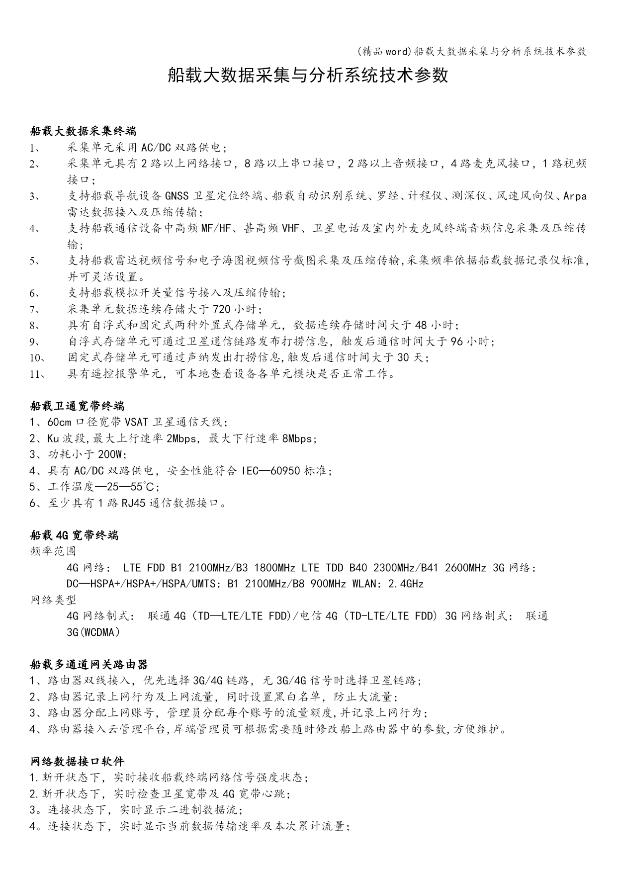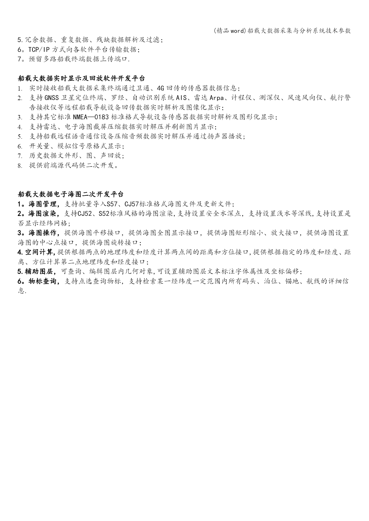 (精品word)船载大数据采集与分析系统技术参数 (精品word)船载大数据采集与分析系统技术参数 (精品word)船载大数据采集与分析系统技术参数 船载大数据采集与分析系统技术参数 船载大数据采集终端 采集单元采用AC/DC双路供电; 采集单元具有2路以上网络接口,8路以上串口接口,2路以上音频接口,4路麦克风接口,1路视频接口; 支持船载导航设备GNSS卫星定位终端、船载自动识别系统、罗经、计程仪、测深仪、风速风向仪、Arpa雷达数据接入及压缩传输; 支持船载通信设备中高频MF/HF、甚高频VHF、卫星电话及室内外麦克风终端音频信息采集及压缩传输; 支持船载雷达视频信号和电子海图视频信号截图采集及压缩传输,采集频率依据船载数据记录仪标准,并可灵活设置。 支持船载模拟开关量信号接入及压缩传输; 采集单元数据连续存储大于720小时; 具有自浮式和固定式两种外置式存储单元,数据连续存储时间大于48小时; 自浮式存储单元可通过卫星通信链路发布打捞信息,触发后通信时间大于96小时; 固定式存储单元可通过声纳发出打捞信息,触发后通信时间大于30天; 具有遥控报警单元,可本地查看设备各单元模块是否正常工作。 船载卫通宽带终端 1、60cm口径宽带VSAT卫星通信天线; 2、Ku波段,最大上行速率2Mbps,最大下行速率8Mbps; 3、功耗小于200W; 4、具有AC/DC双路供电,安全性能符合IEC—60950标准; 5、工作温度—25—55℃; 6、至少具有1路RJ45通信数据接口。 船载4G宽带终端 频率范围 4G网络:LTEFDDB12100MHz/B31800MHzLTETDDB402300MHz/B412600MHz3G网络:DC—HSPA+/HSPA+/HSPA/UMTS:B12100MHz/B8900MHzWLAN:2.4GHz 网络类型 4G网络制式:联通4G(TD—LTE/LTEFDD)/电信4G(TD-LTE/LTEFDD)3G网络制式:联通3G(WCDMA) 船载多通道网关路由器 1、路由器双线接入,优先选择3G/4G链路,无3G/4G信号时选择卫星链路; 2、路由器记录上网行为及上网流量,同时设置黑白名单,防止大流量; 3、路由器分配上网账号,管理员分配每个账号的流量额度,并记录上网行为; 4、路由器接入云管理平台,岸端管理员可根据需要随时修改船上路由器中的参数,方便维护。 网络数据接口软件 1.断开状态下,实时接收船载终端网络信号强度状态; 2.断开状态下,实时检查卫星宽带及4G宽带心跳; 3。连接状态下,实时显示二进制数据流; 4。连接状态下,实时显示当前数据传输速率及本次累计流量; 5.冗余数据、重复数据、残缺数据解析及过滤; 6。TCP/IP方式向各软件平台传输数据; 7。预留多路船载终端数据上传端口. 船载大数据实时显示及回放软件开发平台 实时接收船载大数据采集终端通过卫通、4G回传的传感器数据信息; 支持GNSS卫星定位终端、罗经、自动识别系统AIS、雷达Arpa、计程仪、测深仪、风速风向仪、航行警告接收仪等远程船载导航设备回传数据实时解析及图像化显示; 支持其它标准NMEA—0183标准格式导航设备传感器数据实时解析及图形化显示; 支持雷达、电子海图截屏压缩数据实时解压并刷新图片显示; 支持船载远程语音通信设备压缩音频数据实时解压并通过扬声器播放; 开关量、模拟信号原格式显示; 历史数据文件形、图、声回放; 提供前端源代码供二次开发。 船载大数据电子海图二次开发平台 1。海图管理,支持批量导入S57、CJ57标准格式海图文件及更新文件; 2。海图渲染,支持CJ52、S52标准风格的海图渲染,支持设置安全水深点,支持设置浅水等深线,支持设置是否显示经纬网格; 3。海图操作,提供海图平移接口,提供海图全图显示接口,提供海图矩形缩小、放大接口,提供海图设置海图的中心点接口,提供海图旋转接口; 4.空间计算,提供根据两点的地理纬度和经度计算两点间的距离和方位接口,提供根据指定的纬度和经度、距离、方位计算第二点地理纬度和经度接口; 5.辅助图层,可查询、编辑图层内几何对象,可设置辅助图层文本标注字体属性及坐标偏移; 6。物标查询,支持点选查询物标,支持检索某一经纬度一定范围内所有码头、泊位、锚地、航线的详细信息.