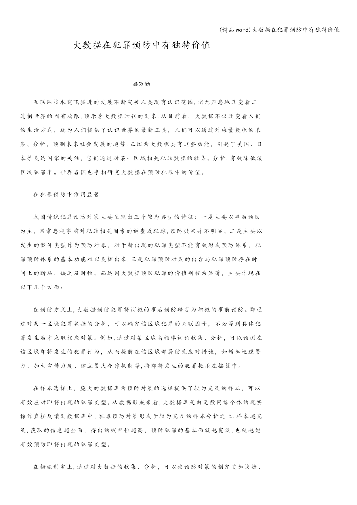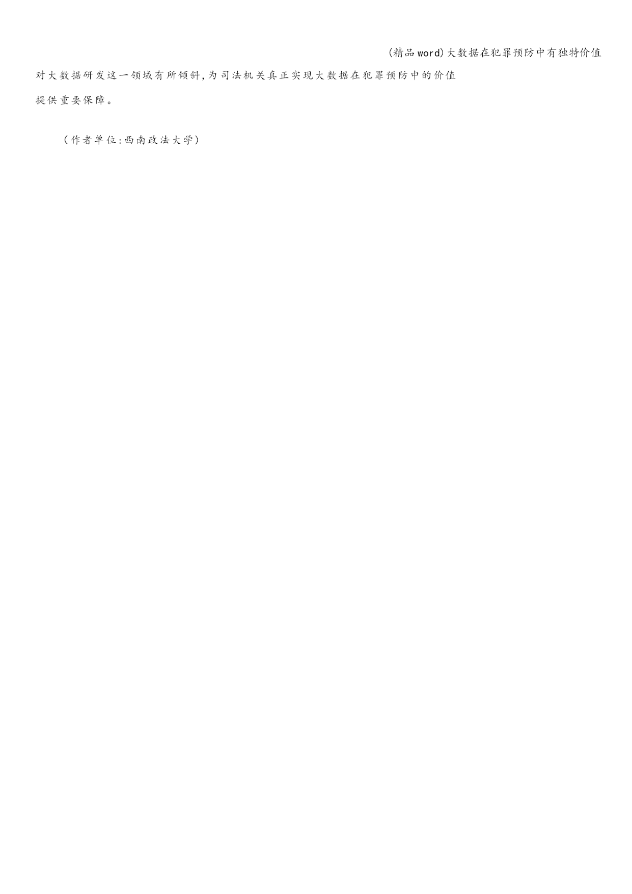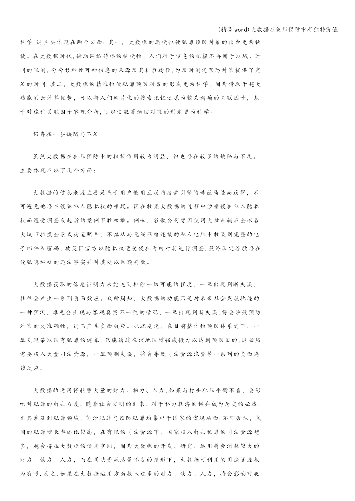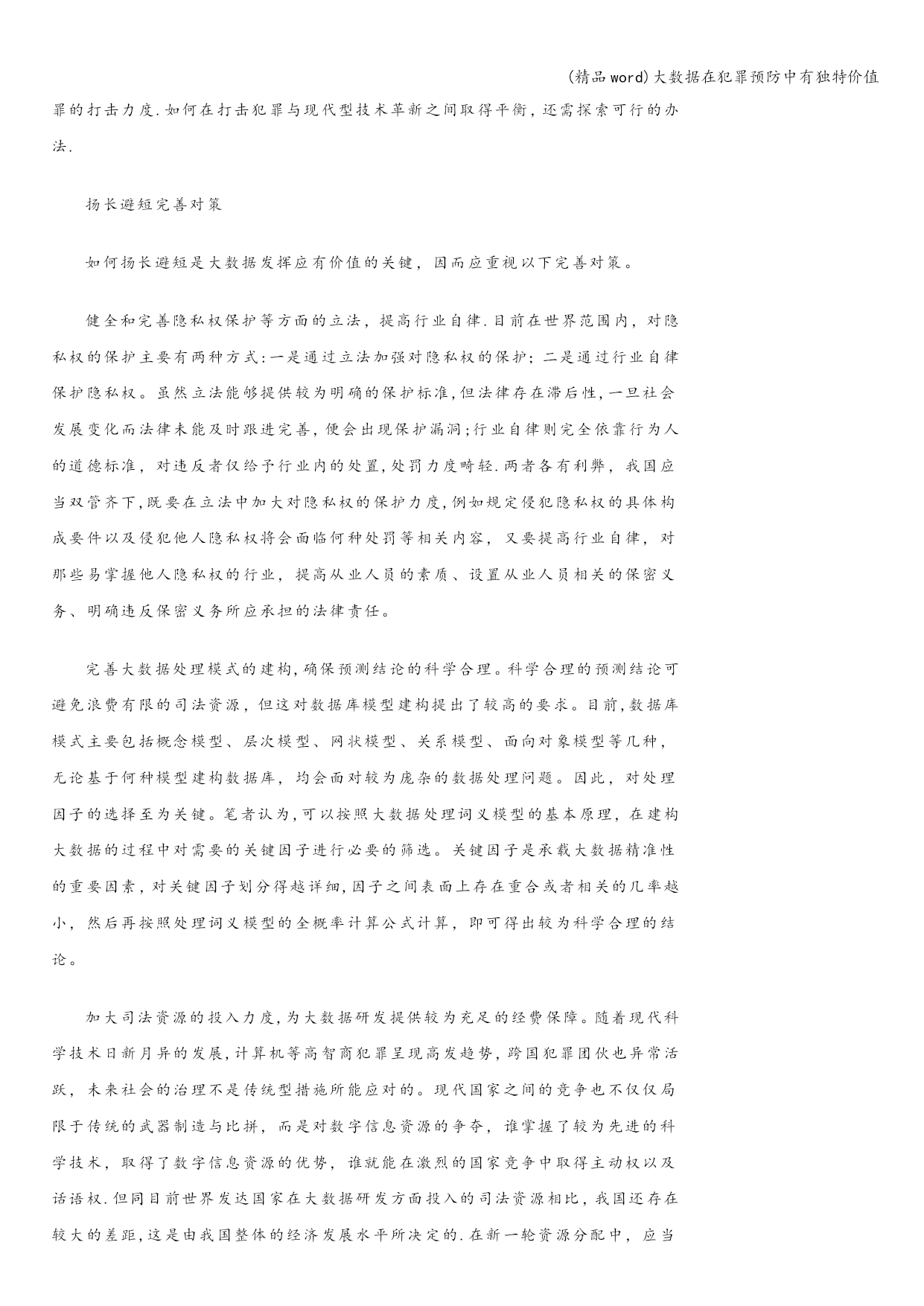(精品word)大数据在犯罪预防中有独特价值 (精品word)大数据在犯罪预防中有独特价值 (精品word)大数据在犯罪预防中有独特价值 大数据在犯罪预防中有独特价值姚万勤互联网技术突飞猛进的发展不断突破人类现有认识范围,悄无声息地改变着二进制世界的固有局限,预示着大数据时代的到来.从目前看,大数据不仅改变着人们的生活方式,还为人们提供了认识世界的最新工具,人们可以通过对海量数据的采集、分析,预测未来社会发展的趋势.正因为大数据具有这些功能,引起了美国、日本等发达国家的关注,它们通过对某一区域相关犯罪数据的收集、分析,有效降低该区域犯罪率。世界各国也争相研究大数据在预防犯罪中的价值。 在犯罪预防中作用显著 我国传统犯罪预防对策主要呈现出三个较为典型的特征:一是主要以事后预防为主,常常忽视事前对犯罪相关因素的调查或跟踪,预防效果并不明显。二是主要以发生的案件类型作为预防对象,对于新出现的犯罪类型不能有效形成预防体系,犯罪预防体系的基本功能难以发挥出来.三是犯罪预防对策的出台与犯罪预防存在时间上的断层,缺乏及时性。而运用大数据预防犯罪的价值则较为显著,主要体现在以下几个方面: 在预防方式上,大数据预防犯罪将消极的事后预防转变为积极的事前预防。即通过对某一区域犯罪数据的分析,可以确定该区域犯罪的关联因子,不必等到具体犯罪发生后才采取相应对策。例如,通过对某区域高频率词语收集、分析,可以预测在该区域即将发生的犯罪行为,从而提前在该区域部署防范应对措施,如增加巡逻警力、加大宣传力度、建立警民合作机制等,将即将发生的犯罪扼杀在摇篮中。 在样本选择上,庞大的数据库为预防对策的选择提供了较为充足的样本,可以有效应对即将出现的犯罪类型。从数据形成来看,大数据库是由无数网络个体的现实操作直接反馈到数据库中,犯罪预防对策形成于较为充足的样本分析之上.样本越充足,获取的信息越全面,得出的概率性越高,预防犯罪的基本面就越宽泛,也就越能有效预防即将出现的犯罪类型。 在措施制定上,通过对大数据的收集、分析,可以使预防对策的制定更加快捷、科学.这主要体现在两个方面:其一,大数据的迅捷性使犯罪预防对策的出台更为快捷。在大数据时代,借助网络传播的快捷性,人们对于信息的把握不再囿于地域、时间的限制,分分秒秒便可知信息的来源及其扩散途径,为及时制定预防对策提供了充足的时间.其二,大数据的精准性使犯罪预防对策的形成更为科学。因为借助于超大功能的云计算优势,可以将人们碎片化的搜索记忆还原为较为精确的关联因子,基于对这种关联因子客观分析,可以使犯罪预防对策的制定更为科学。 仍存在一些缺陷与不足 虽然大数据在犯罪预防中的积极作用较为明显,但也存在较多的缺陷与不足。主要体现在以下几个方面: 大数据的信息来源主要是基于用户使用互联网搜索引擎的蛛丝马迹而获得,不可避免地存在侵犯他人隐私权的嫌疑。因在收集大数据的过程中涉嫌侵犯他人隐私权而遭受调查或起诉的案例不胜枚举。例如,谷歌公司曾因使用大批车辆在全球各大城市拍摄全景式街道照片,不慎从与无线网络连接的私人电脑中收集到完整的电子邮件和密码,被英国官方以隐私权遭受侵犯为由对其进行调查,最终认定谷歌存在侵犯隐私权的违法事实并对其处以巨额罚款。 大数据获取的信息证明力未能达到排除一切可能的程度,一旦出现判断失误,往往会产生一系列负面效应。众所周知,大数据的功能只是对未来社会发展轨迹的一种预测,难免会出现与客观真实不一致的情况,一旦出现判断失误,将会导致预防对策的欠准确性,进而产生负面效应。也就是说,在目前整体性预防体系之下,一旦发现某地区有犯罪的迹象,只能通过在该地区增强威慑力以达到预防目的,这必然需要投入大量司法资源,一旦预测失误,将会导致司法资源浪费等一系列的负面连锁反应。 大数据的运用将耗费大量的财力、物力、人力,如果与打击犯罪平衡不当,会影响对犯罪的打击力度。随着社会文明的到来,对于私力救济的摒弃成为历史的必然,尤其涉及到犯罪领域,惩治犯罪与预防犯罪均集中于国家的宏观层面.不可否认,我国的犯罪增长率还比较高,在有限的司法资源下,国家投入打击犯罪的司法资源越多,越会挤压大数据的使用空间,因为大数据的开发、研究、运用将会消耗较大的财力、物力、人力,而在司法资源总量不变的情形下,大数据可利用的司法资源极为有限.反之,如果在大数据运用方面投入过多的财力、物力、人力,将会影响对犯罪的打击力度.如何在打击犯罪与现代型技术革新之间取得平衡,还需探索可行的办法. 扬长避短完善对策 如何扬长避短是大数据发挥应有价值的关键,因而应重视以下完善对策。 健全和完善隐私权保护等方面的立法,提高行业自律.目前在世界范围内,对隐私权的保护主要有两种方式:一是通过立法加强对隐私权的保护;二是通过行业自律保护隐私权。虽然立法能够提供较为明确的保护标准,但法律存在滞
