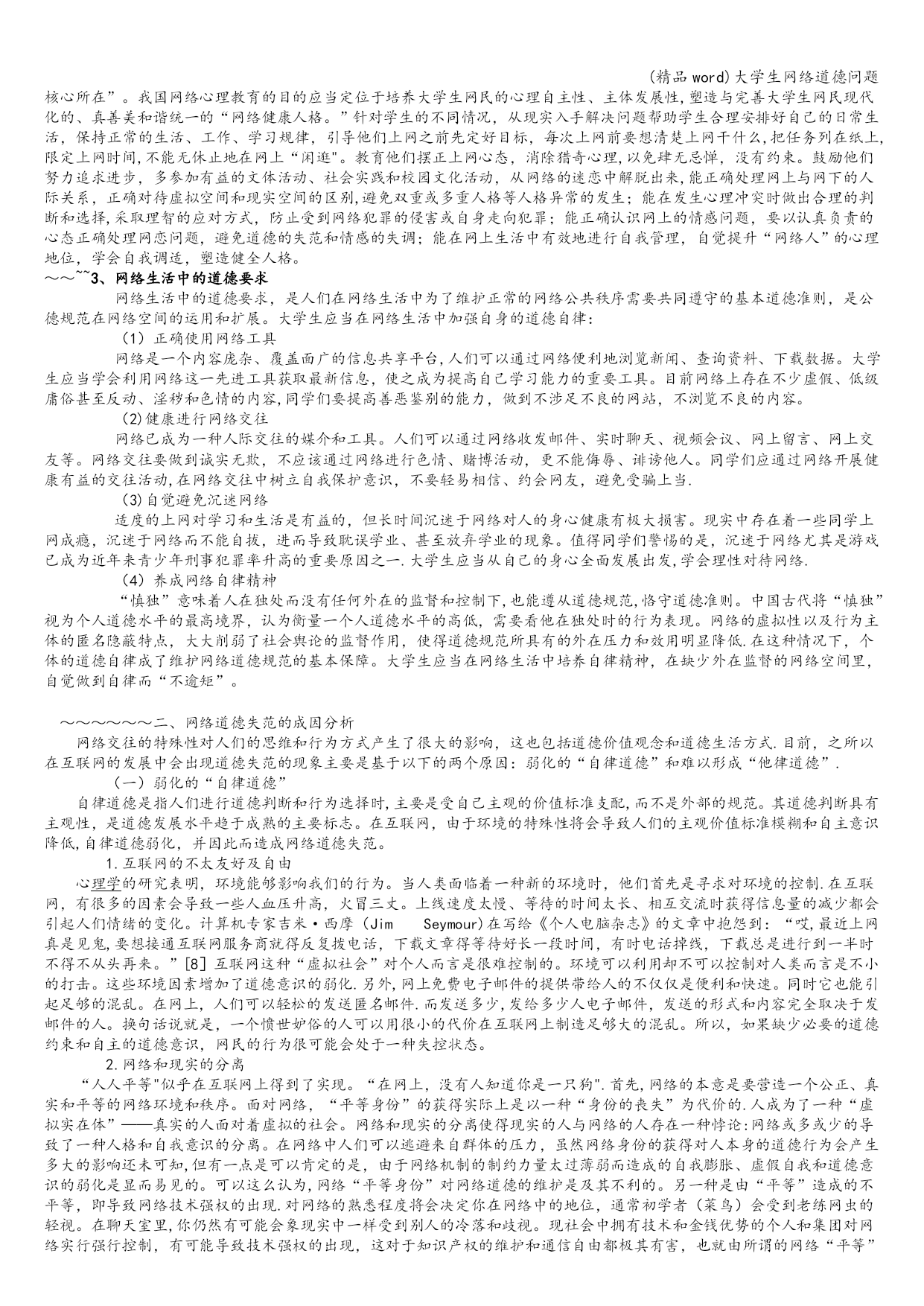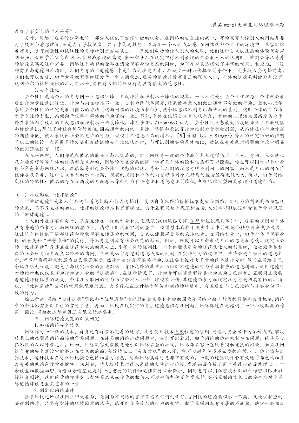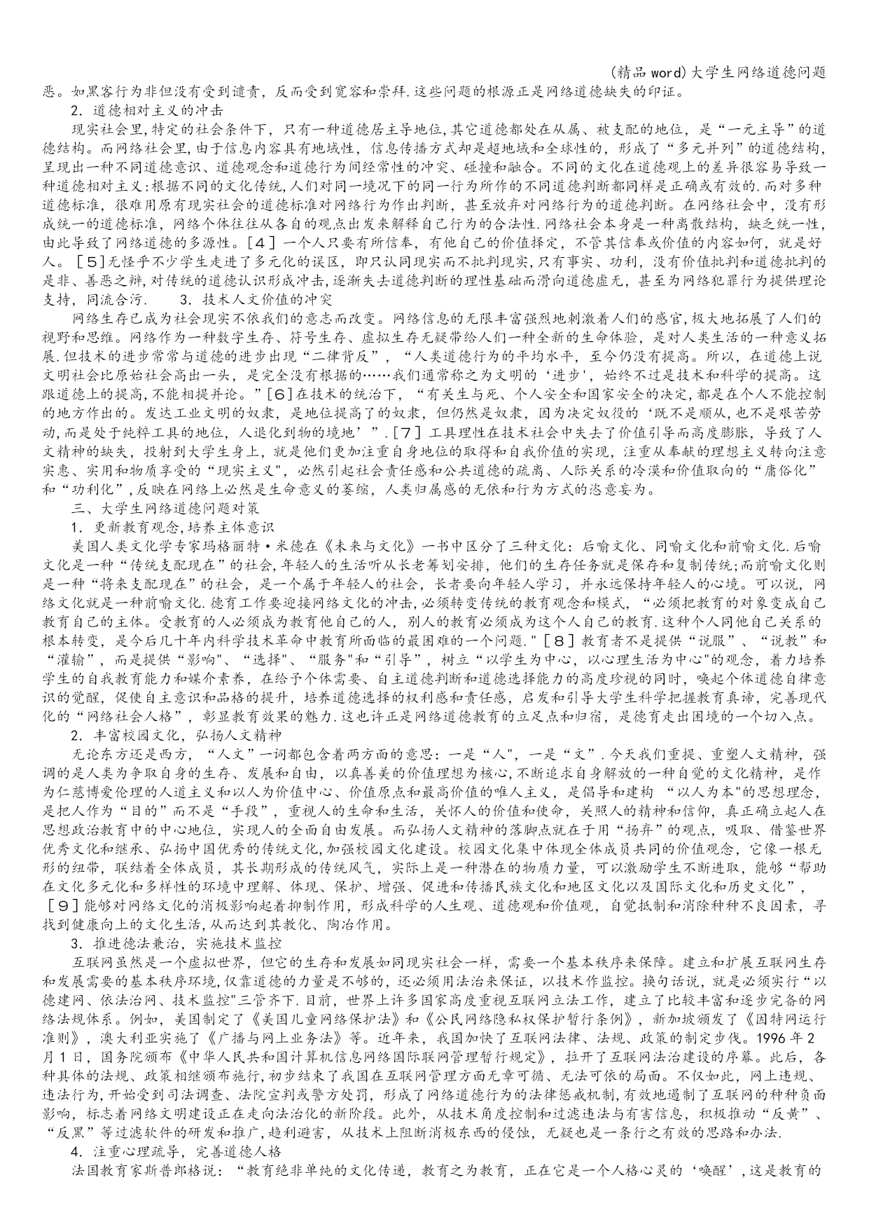 (精品word)大学生网络道德问题 (精品word)大学生网络道德问题 (精品word)大学生网络道德问题 大学生网络道德问题、成因及对策 英国著名历史学家汤因比曾说,科学对于伦理来说,属于中立的一种智力工作。新技术善的使用,给人类生活带来巨大的福利;它的恶的使用,有可能给人类生活的方方面面带来巨大的灾难.同样,网络也是一把“双刃剑”。网络所形成的虚拟化社区呈现着一种“数字化”生存方式,网络社会日益凸现的“黄色风暴”、“网络犯罪”、“人际疏离”、“情感冲突”、“信息霸权"等道德失范问题不容忽视。目前学界多从网络道德问题的现象描述着眼,从网络技术本身的特点和道德主体的规范及道德教育的应然展开分析,笔者以大学生的网络道德心理和行为表现为切入点,分析网络道德问题的深层原因,以期探寻有效路径,实现网络道德的重新建构.一、大学生网络道德问题表现1.道德认知的冲突和价值紊乱与传统社会的道德相比,网络道德呈现出一种多元化、多层次化的特点与趋势。[1]在虚拟社会,信息的传播打破了国家、地域界限,但信息的内容仍带有地域特征,它反映着一定国家或民族的文化传统、社会价值观和社会制度等。此间,不同国家、民族间文化与道德冲突必然出现。同时,随着生活方式、思想文化的大量渗透,道德标准和价值观念的冲突和歧变必然导致社会道德生活中双重或多元价值标准并存的局面。多元价值标准并存的社会现实又会使政府、学校甚至社会传统一直灌输的道德观念仅仅成为人们众多道德选择中的一种,而社会道德的主要规范一直所起的支配性作用则可能消失,导致的道德评价失范最终必然导致行为主体道德选择迷惘和价值取向紊乱。由于大学生的社会生活经验较少,对于经过伪装的思想和言论的识别能力较差,加之特有的好奇心、猎奇心,他们会比较容易被诱导,进而产生错误的价值倾向。久而久之,还会把错误的伦理道德倾向带到现实生活中,容易对现实世界的伦理道德标准产生排斥与抵触心理.2.道德情感的冷漠和人际疏离人与人之间的情感交流和心灵沟通在一个人的成长和社会化过程中有着十分重要的作用,良好的道德情感是架起道德认知和道德行为的桥梁和纽带。然而交往方式的改变常常导致人的诸多方面的相应改变。社会学原理认为:每个人都要扮演不同的社会角色,按照角色规范去演绎自己的人生历程。但在网络世界交流中,人与人之间的交往不是面对面的,实实在在的交往,而是通过E-mail、QQ、博客等各种网络工具进行的间接的“人—机—人交往”。在这种情境下,人的社会地位、身份、职业、年龄、性别等社会属性在网上可能统统消失了.尽管大学生也在扮演着不同的角色,他们却不必遵守现实社会中角色扮演的规则,没有必须履行的角色义务,可以随心所欲地扮演自己理想的“自我",把虚拟的角色当成了现实的角色,容易导致人际距离疏远,直接交流减少,行为主体麻木,人情趋于冷漠,进而演化为对现实情感的麻木以及正义感和道德感的缺失,甚至最基本的事实和道德判断能力的丧失。3.道德意志的弱化和行为失范网络社会的形成在客观上提供了大学生网络道德赖以生存的条件,但网络文化主体的匿名性、隐蔽性对大学生社会化的负面影响也日益凸现,诸如网络盗窃、网络传毒、网络色情、网络黑客等大量令人关注的道德问题成了人们亟待解决的社会课题。在网络社会中,一组代码,一个角色符号,便成了身份的维持物,每个人都成了自我生存的中心。德国学者巴巴拉·贝克尔在《虚拟身份:想像的自我》一文中通过对网络行为主体的大量分析可以得出这样一个结论:数据网是由所有的虚拟身份组成的。在计算机空间,网络主体身份注定能够通过许多“世界”而创造一个新的“自我”。[2]在网上,由于人与人之间没有传统社会的人际、法律、道德、舆论的约束,亦不需要面对面地打交道,上网的人往往缺少“他人在场”的压力,“快乐原则”支配着个人欲望,日常生活中被压抑的人性中假、恶、丑的一面,会在这种无约束或低约束的状况下得到释放宣泄.既然没有规则的约束,这就使得网络文化的审美价值中道德评价相对化的倾向变得浓厚,现实世界中的道德规范也并不能一如既往地产生作用。因此,进入互联网的大学生往往会产生道德失范的意识和行为,产生大学生网络道德感的弱化。一方面,认为网络上很难讲道德;另一方面,有意或无意地做些违反道德规范的行为,乃至犯罪行为.4.道德人格的偏常和人性异化网络在为人类打开一个自由驰骋的新空间的同时,也营造着一个数字化生存的空间。“在那里只有公民,没有统治者;只有交流,没有灌输者或检查者.那是一块谁也无法控制的自由意识的伊甸园。"[3]在这样一个“数字化王国”中,网络带来的奇妙多变的虚拟空间,使人们在一个没有时空限制,没有权威约束的范围内弱化了传统社会的管理和控制,有一种“特别自由”的感觉和“为所欲为”的冲动。在这种虚拟的环境中,部分大学生陷入其中,难以自拔,沦为数字化、机器化、工具化的存在