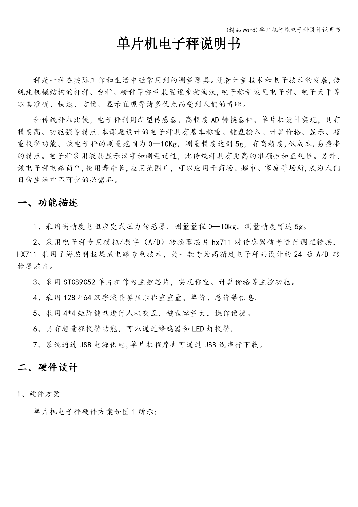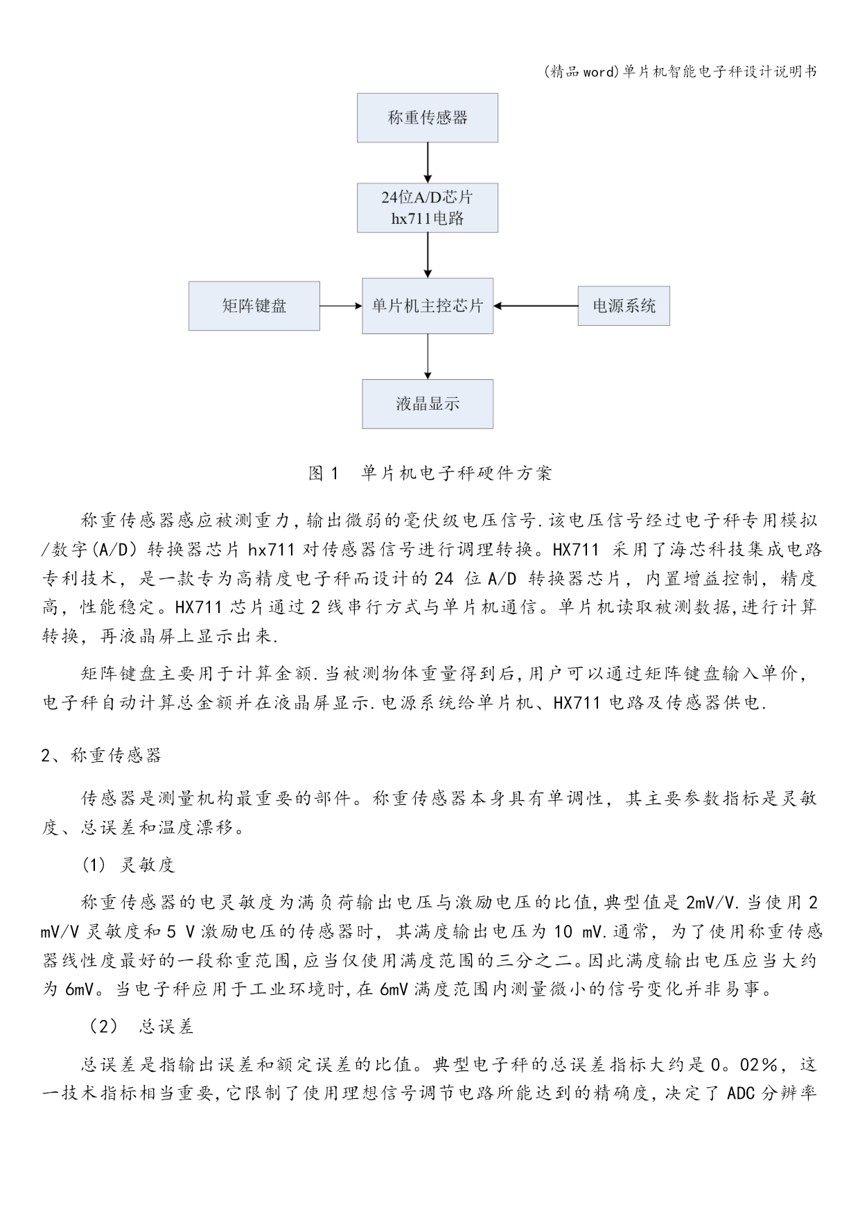 (精品word)单片机智能电子秤设计说明书 (精品word)单片机智能电子秤设计说明书 (精品word)单片机智能电子秤设计说明书 单片机电子秤说明书 秤是一种在实际工作和生活中经常用到的测量器具。随着计量技术和电子技术的发展,传统纯机械结构的杆秤、台秤、磅秤等称量装置逐步被淘汰,电子称量装置电子秤、电子天平等以其准确、快速、方便、显示直观等诸多优点而受到人们的青睐。 和传统秤相比较,电子秤利用新型传感器、高精度AD转换器件、单片机设计实现,具有精度高、功能强等特点.本课题设计的电子秤具有基本称重、键盘输入、计算价格、显示、超重报警功能。该电子秤的测量范围为0—10Kg,测量精度达到5g,有高精度,低成本,易携带的特点。电子秤采用液晶显示汉字和测量记过,比传统秤具有更高的准确性和直观性。另外,该电子秤电路简单,使用寿命长,应用范围广,可以应用于商场、超市、家庭等场所,成为人们日常生活中不可少的必需品。 一、功能描述 1、采用高精度电阻应变式压力传感器,测量量程0—10kg,测量精度可达5g。 2、采用电子秤专用模拟/数字(A/D)转换器芯片hx711对传感器信号进行调理转换,HX711采用了海芯科技集成电路专利技术,是一款专为高精度电子秤而设计的24位A/D转换器芯片。 3、采用STC89C52单片机作为主控芯片,实现称重、计算价格等主控功能。 4、采用128*64汉字液晶屏显示称重重量、单价、总价等信息. 5、采用4*4矩阵键盘进行人机交互,键盘容量大,操作便捷。 6、具有超量程报警功能,可以通过蜂鸣器和LED灯报警. 7、系统通过USB电源供电,单片机程序也可通过USB线串行下载。 二、硬件设计 1、硬件方案 单片机电子秤硬件方案如图1所示: 图1单片机电子秤硬件方案 称重传感器感应被测重力,输出微弱的毫伏级电压信号.该电压信号经过电子秤专用模拟/数字(A/D)转换器芯片hx711对传感器信号进行调理转换。HX711采用了海芯科技集成电路专利技术,是一款专为高精度电子秤而设计的24位A/D转换器芯片,内置增益控制,精度高,性能稳定。HX711芯片通过2线串行方式与单片机通信。单片机读取被测数据,进行计算转换,再液晶屏上显示出来. 矩阵键盘主要用于计算金额.当被测物体重量得到后,用户可以通过矩阵键盘输入单价,电子秤自动计算总金额并在液晶屏显示.电源系统给单片机、HX711电路及传感器供电. 2、称重传感器 传感器是测量机构最重要的部件。称重传感器本身具有单调性,其主要参数指标是灵敏度、总误差和温度漂移。 (1)灵敏度 称重传感器的电灵敏度为满负荷输出电压与激励电压的比值,典型值是2mV/V.当使用2mV/V灵敏度和5V激励电压的传感器时,其满度输出电压为10mV.通常,为了使用称重传感器线性度最好的一段称重范围,应当仅使用满度范围的三分之二。因此满度输出电压应当大约为6mV。当电子秤应用于工业环境时,在6mV满度范围内测量微小的信号变化并非易事。 (2)总误差 总误差是指输出误差和额定误差的比值。典型电子秤的总误差指标大约是0。02%,这一技术指标相当重要,它限制了使用理想信号调节电路所能达到的精确度,决定了ADC分辨率的选择以及放大电路和滤波器的设计. (3)漂移 称重传感器也产生与时间相关的漂移。 目前常用的称重传感器有电阻应变式压力传感器、电容压力传感器、压电式压力传感器。选用时应按稳定行、精度登记、寿命和安装环境要求考虑,其主要特点如下: (1)电容式压力传感器稳定性较差,精度和灵敏度较高,寿命较短,对环境要求苛刻,不易长距离传输。 (2)压电式压力传感器稳定性好,精度和灵敏度高,寿命长,但大量程的压力传感器尚待进一步研究。 (3)电阻应变式压力传感器稳定性较好,精度和灵敏度较高,寿命较长,对测量环境要求不太严格。 综上所述,选用电阻应变式压力传感器作为电子秤称重传感器是最为合适的。电阻应变式压力传感器主要由弹性体、电阻应变片电缆线等组成,内部线路采用惠更斯电桥,当弹性体承受载荷产生变形时,电阻应变片(转换元件)受到拉伸或压缩应变片变形后,它的阻值将发生变化(增大或减小),从而使电桥失去平衡,产生相应的差动信号,供后续电路测量和处理。电阻应变式传感器测量原理如图2所示. 图2电阻应变式传感器测量原理 当垂直正压力P作用于梁上时,梁产生形变,电阻应变片R1、R3受压弯拉伸,阻值增加;R2、R4受压缩,阻值减小。电桥失去平衡,产生不平衡电压,不平衡电压与作用在传感器上的载菏P成正比,从而将非电量转化成电量输出。 R1、R2、R3和R4组成惠更斯电桥,将2对电阻应变片的阻值变化转变成输出电压,其工作原理如图3所示。 图3测量电桥原理 3、电子秤专用24位AD转换芯片HX711及其电路 HX711采用了海芯科技