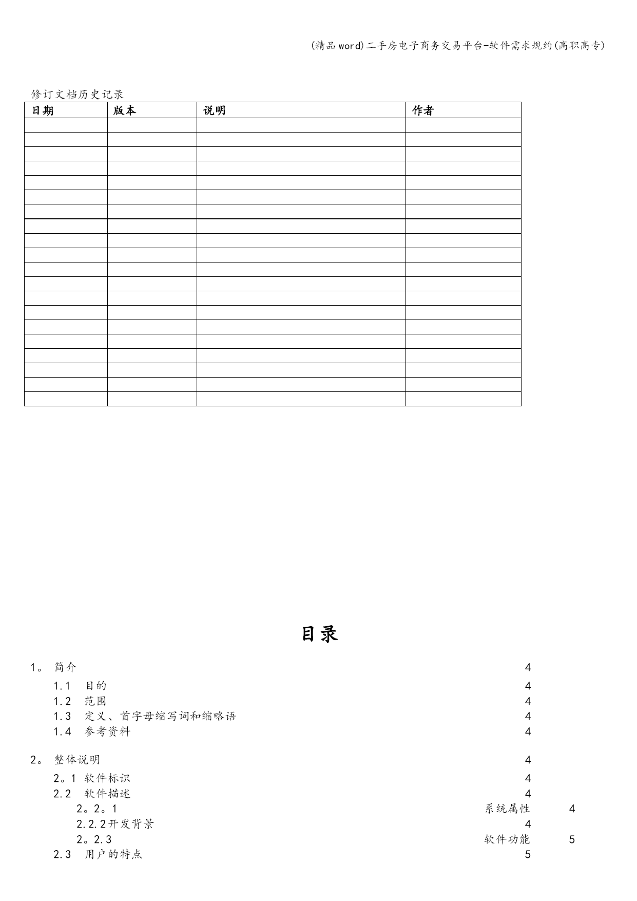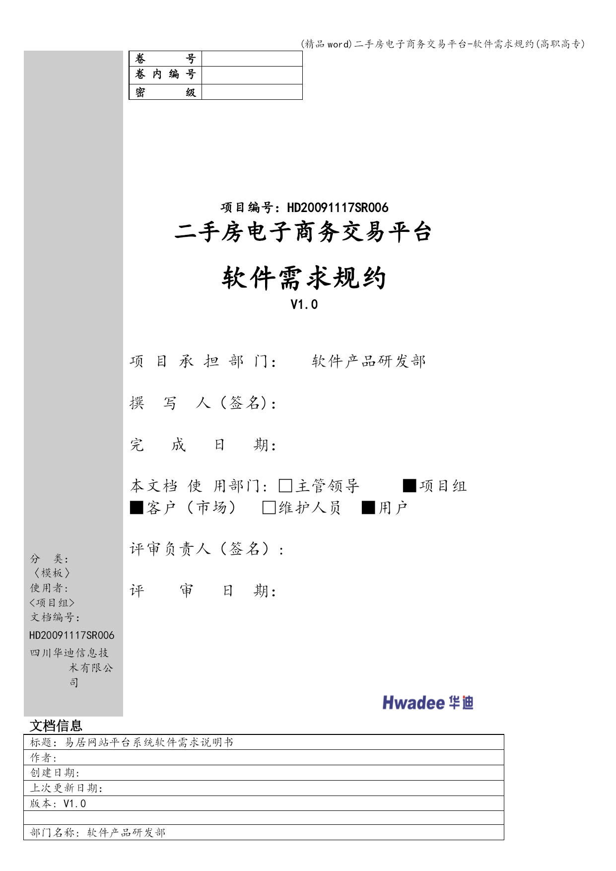 (精品word)二手房电子商务交易平台-软件需求规约(高职高专) (精品word)二手房电子商务交易平台-软件需求规约(高职高专) (精品word)二手房电子商务交易平台-软件需求规约(高职高专) 卷号卷内编号密级 项目编号:HD20091117SR006 二手房电子商务交易平台 DOCPROPERTY"Category”\*MERGEFORMAT分类: 〈模板〉 使用者: <项目组> DOCPROPERTY”文档编号"\*MERGEFORMAT文档编号: HD20091117SR006 四川华迪信息技术有限公司 软件需求规约 V1.0 项目承担部门:软件产品研发部 撰写人(签名): 完成日期: 本文档使用部门:□主管领导■项目组 ■客户(市场)□维护人员■用户 评审负责人(签名): 评审日期:文档信息 标题:易居网站平台系统软件需求说明书作者:创建日期:上次更新日期:版本:V1.0部门名称:软件产品研发部 修订文档历史记录 日期版本说明作者 目录 TOC\o”1-3"1。 简介 PAGEREF_Toc316549222\h4 1.1 目的 PAGEREF_Toc316549223\h4 1.2 范围 PAGEREF_Toc316549224\h4 1.3 定义、首字母缩写词和缩略语 PAGEREF_Toc316549225\h4 1.4 参考资料 PAGEREF_Toc316549226\h4 2。 整体说明 PAGEREF_Toc316549227\h4 2。1 软件标识 PAGEREF_Toc316549228\h4 2.2 软件描述 PAGEREF_Toc316549229\h4 2。2。1 系统属性 PAGEREF_Toc316549230\h4 2.2.2 开发背景 PAGEREF_Toc316549231\h4 2。2.3 软件功能 PAGEREF_Toc316549232\h5 2.3 用户的特点 PAGEREF_Toc316549233\h5 2。4 限制与约束 PAGEREF_Toc316549234\h6 3. 具体需求 PAGEREF_Toc316549235\h6 3.1 功能 PAGEREF_Toc316549236\h6 3。1。1 公司形象展示前台 PAGEREF_Toc316549237\h6 3.1。2 公司形象展示后台 PAGEREF_Toc316549238\h16 3.2 可靠性 PAGEREF_Toc316549239\h26 3。2。1 可用性 PAGEREF_Toc316549240\h26 3。3 性能 PAGEREF_Toc316549241\h26 3.3。1 查询性能 PAGEREF_Toc316549242\h26 3.3。2 统计性能 PAGEREF_Toc316549243\h26 3。3。3 并发数 PAGEREF_Toc316549244\h27 3.4 可支持性 PAGEREF_Toc316549245\h27 3.4.1 编码标准 PAGEREF_Toc316549246\h27 3。5 设计约束 PAGEREF_Toc316549247\h27 3.5.1 B/S架构 PAGEREF_Toc316549248\h27 3.6 联机用户文档和帮助系统需求 PAGEREF_Toc316549249\h27 3。7 购买的构件 PAGEREF_Toc316549250\h27 3.8 接口 PAGEREF_Toc316549251\h27 3。8.1 用户界面 PAGEREF_Toc316549252\h27 3.8。2 硬件接口 PAGEREF_Toc316549253\h27 3.8。3 软件接口 PAGEREF_Toc316549254\h27 3。8.4 通信接口 PAGEREF_Toc316549255\h27 Add:四川成都市高新西区尚锦路89号(611731)Tel:028-82960160第页共NUMPAGES26页 TITLE\*MERGEFORMAT软件需求规约 简介 目的 1、定义软件总体要求,作为用户和软件开发人员之间相互了解的基础; 2、提供性能要求、初步设计和对用户影响的信息,作为软件人员进行软件结构设计和编码的基础; 3、作为软件总体测试的依据。 范围 本文档适用于“易居网站平台系统”项目开发的整个生命周期,包括项目的每个阶段,覆盖项目每一项工作