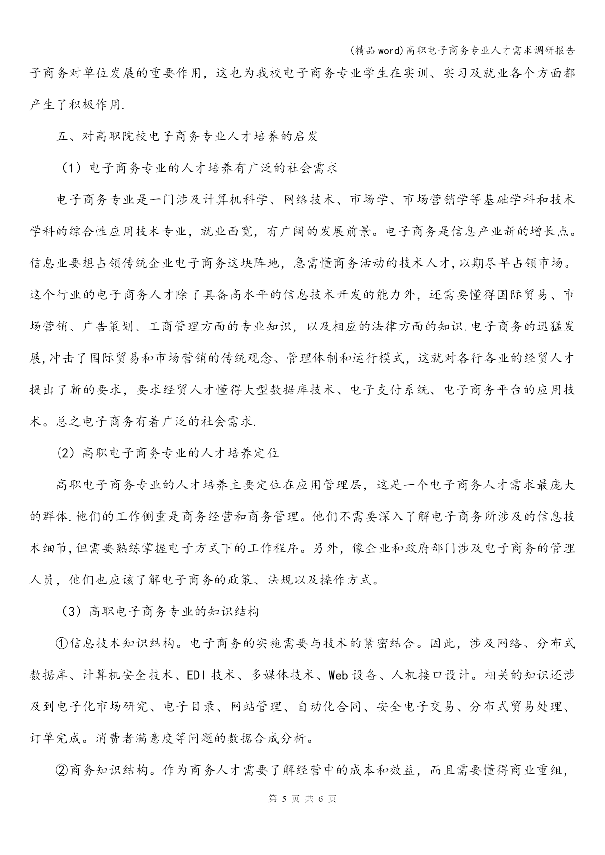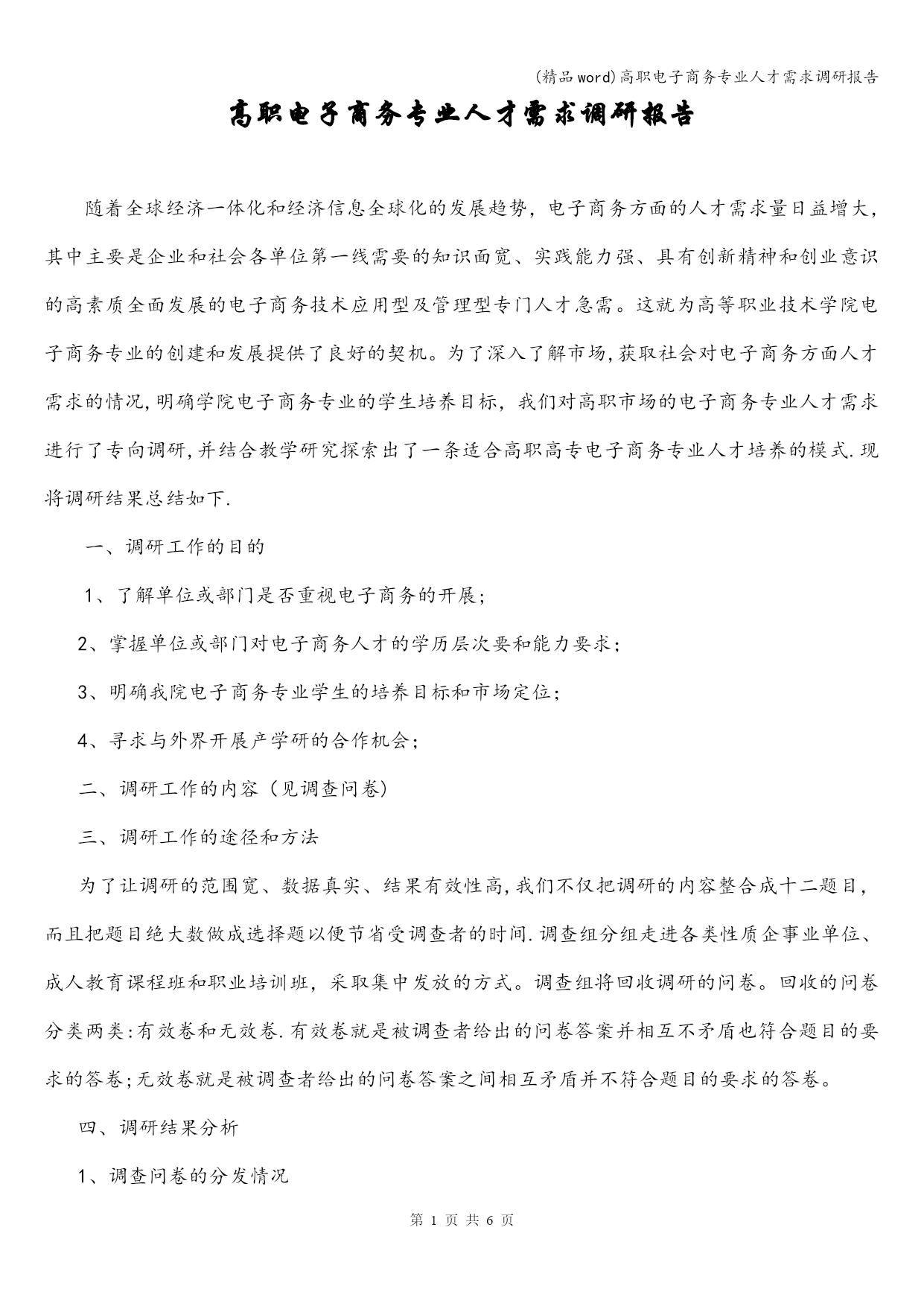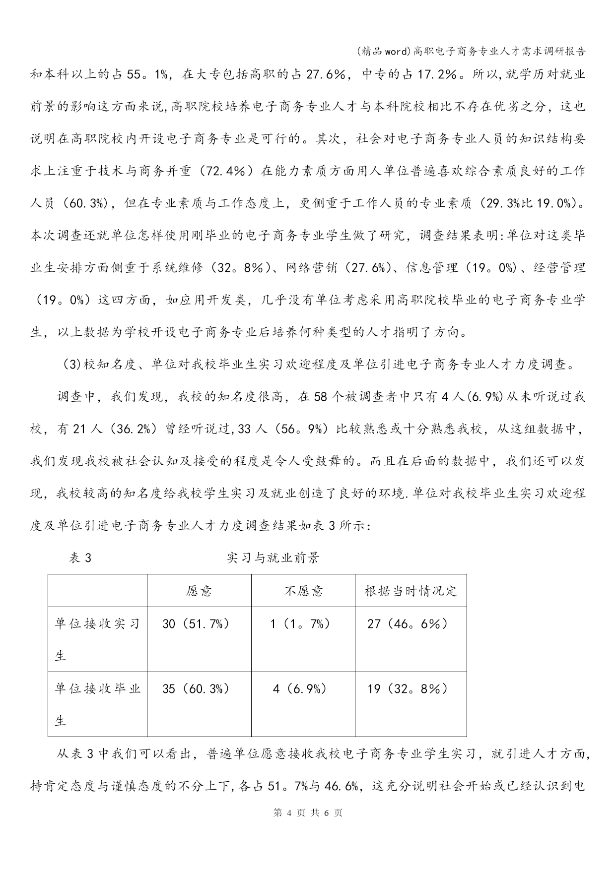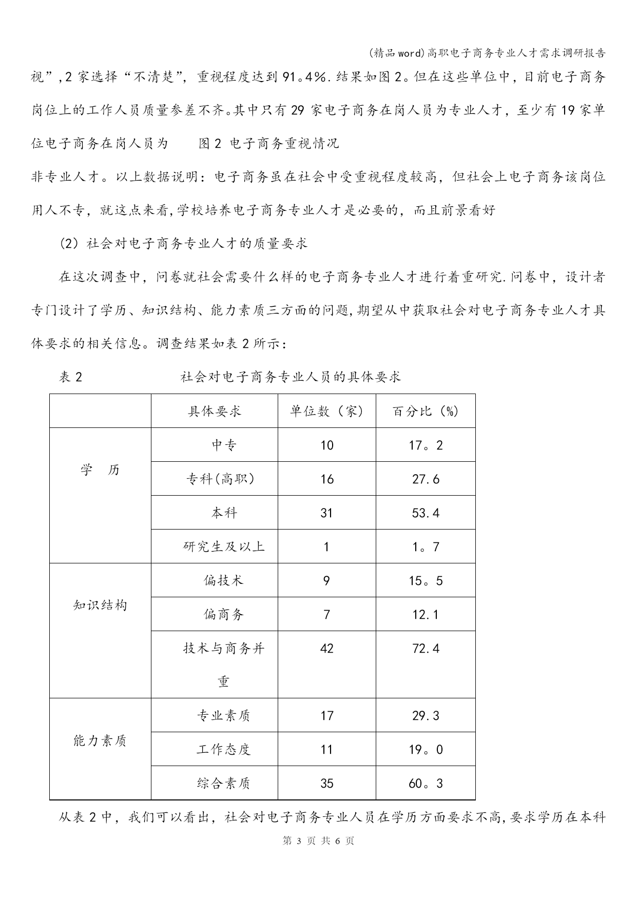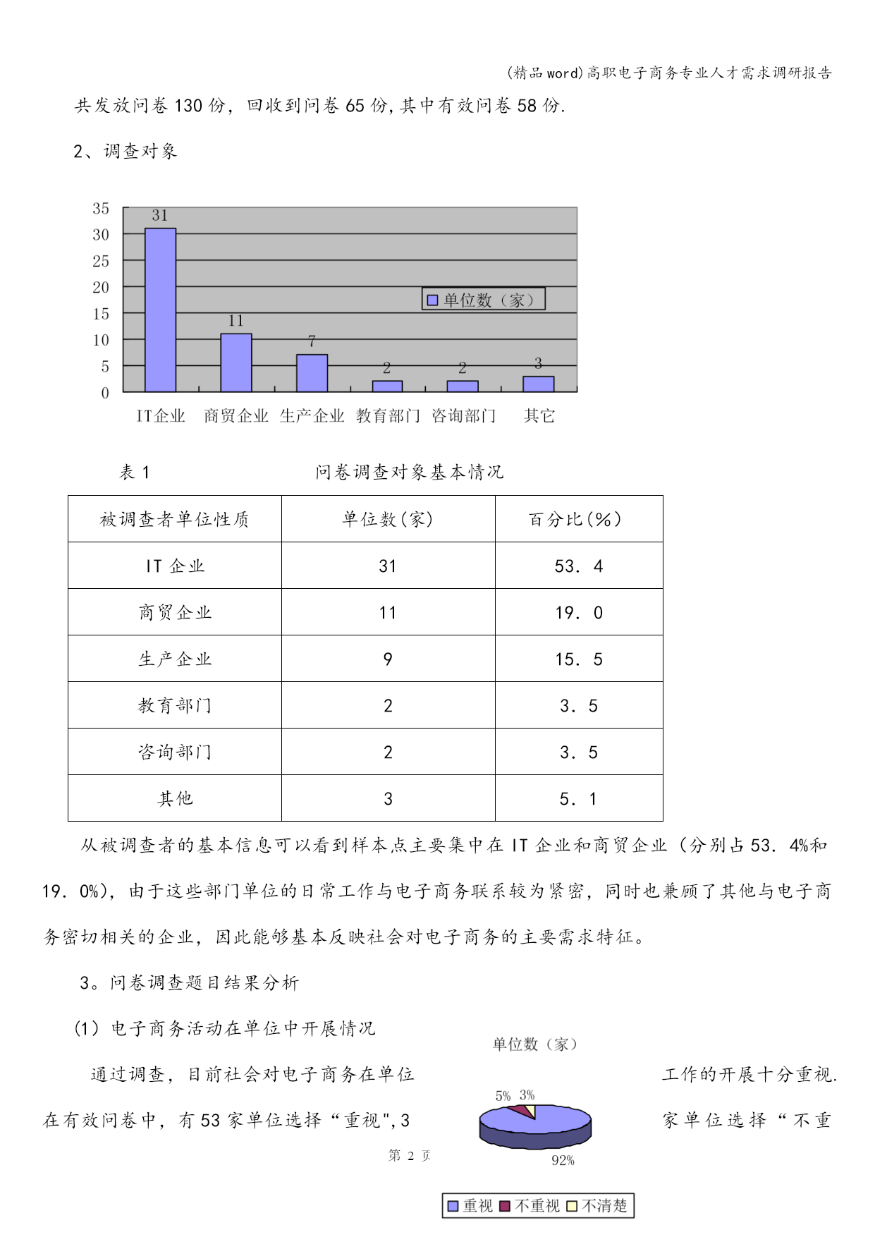 (精品word)高职电子商务专业人才需求调研报告 (精品word)高职电子商务专业人才需求调研报告 母亲通情达理,也鼓励他儿子奋勇杀敌,岳飞参军时,岳飞母亲在他背上刺上了“精忠报国”四个醒目大字,后来,英勇奋战的岳飞建立起了属于自己的部落岳家军,他们不屈不挠,喊着愤慨激昂慷慨的口号奋勇杀 母亲通情达理,也鼓励他儿子奋勇杀敌,岳飞参军时,岳飞母亲在他背上刺上了“精忠报国”四个醒目大字,后来,英勇奋战的岳飞建立起了属于自己的部落岳家军,他们不屈不挠,喊着愤慨激昂慷慨的口号奋勇杀第页共NUMPAGES6页 (精品word)高职电子商务专业人才需求调研报告 母亲通情达理,也鼓励他儿子奋勇杀敌,岳飞参军时,岳飞母亲在他背上刺上了“精忠报国”四个醒目大字,后来,英勇奋战的岳飞建立起了属于自己的部落岳家军,他们不屈不挠,喊着愤慨激昂慷慨的口号奋勇杀 高职电子商务专业人才需求调研报告 随着全球经济一体化和经济信息全球化的发展趋势,电子商务方面的人才需求量日益增大,其中主要是企业和社会各单位第一线需要的知识面宽、实践能力强、具有创新精神和创业意识的高素质全面发展的电子商务技术应用型及管理型专门人才急需。这就为高等职业技术学院电子商务专业的创建和发展提供了良好的契机。为了深入了解市场,获取社会对电子商务方面人才需求的情况,明确学院电子商务专业的学生培养目标,我们对高职市场的电子商务专业人才需求进行了专向调研,并结合教学研究探索出了一条适合高职高专电子商务专业人才培养的模式.现将调研结果总结如下. 一、调研工作的目的 1、了解单位或部门是否重视电子商务的开展; 2、掌握单位或部门对电子商务人才的学历层次要和能力要求; 3、明确我院电子商务专业学生的培养目标和市场定位; 4、寻求与外界开展产学研的合作机会; 二、调研工作的内容(见调查问卷) 三、调研工作的途径和方法 为了让调研的范围宽、数据真实、结果有效性高,我们不仅把调研的内容整合成十二题目,而且把题目绝大数做成选择题以便节省受调查者的时间.调查组分组走进各类性质企事业单位、成人教育课程班和职业培训班,采取集中发放的方式。调查组将回收调研的问卷。回收的问卷分类两类:有效卷和无效卷.有效卷就是被调查者给出的问卷答案并相互不矛盾也符合题目的要求的答卷;无效卷就是被调查者给出的问卷答案之间相互矛盾并不符合题目的要求的答卷。 四、调研结果分析 1、调查问卷的分发情况 共发放问卷130份,回收到问卷65份,其中有效问卷58份. 2、调查对象 表1问卷调查对象基本情况 被调查者单位性质单位数(家)百分比(%)IT企业3153.4商贸企业1119.0生产企业915.5教育部门23.5咨询部门23.5其他35.1从被调查者的基本信息可以看到样本点主要集中在IT企业和商贸企业(分别占53.4%和19.0%),由于这些部门单位的日常工作与电子商务联系较为紧密,同时也兼顾了其他与电子商务密切相关的企业,因此能够基本反映社会对电子商务的主要需求特征。 3。问卷调查题目结果分析 (1)电子商务活动在单位中开展情况 通过调查,目前社会对电子商务在单位工作的开展十分重视.在有效问卷中,有53家单位选择“重视",3家单位选择“不重视”,2家选择“不清楚”,重视程度达到91。4%.结果如图2。但在这些单位中,目前电子商务岗位上的工作人员质量参差不齐。其中只有29家电子商务在岗人员为专业人才,至少有19家单位电子商务在岗人员为图2电子商务重视情况 非专业人才。以上数据说明:电子商务虽在社会中受重视程度较高,但社会上电子商务该岗位用人不专,就这点来看,学校培养电子商务专业人才是必要的,而且前景看好 (2)社会对电子商务专业人才的质量要求 在这次调查中,问卷就社会需要什么样的电子商务专业人才进行着重研究.问卷中,设计者专门设计了学历、知识结构、能力素质三方面的问题,期望从中获取社会对电子商务专业人才具体要求的相关信息。调查结果如表2所示: 表2社会对电子商务专业人员的具体要求 具体要求单位数(家)百分比(%) 学历 中专1017。2专科(高职)1627.6本科3153.4研究生及以上11。7 知识结构 偏技术915。5偏商务712.1技术与商务并重4272.4 能力素质 专业素质1729.3工作态度1119。0综合素质3560。3从表2中,我们可以看出,社会对电子商务专业人员在学历方面要求不高,要求学历在本科和本科以上的占55。1%,在大专包括高职的占27.6%,中专的占17.2%。所以,就学历对就业前景的影响这方面来说,高职院校培养电子商务专业人才与本科院校相比不存在优劣之分,这也说明在高职院校内开设电子商务专业是可行的。其次,社会对电子商务专业人员的知识结构要求上注重于技术与商务并重(72.4%)在能力素质方面用人单位普遍