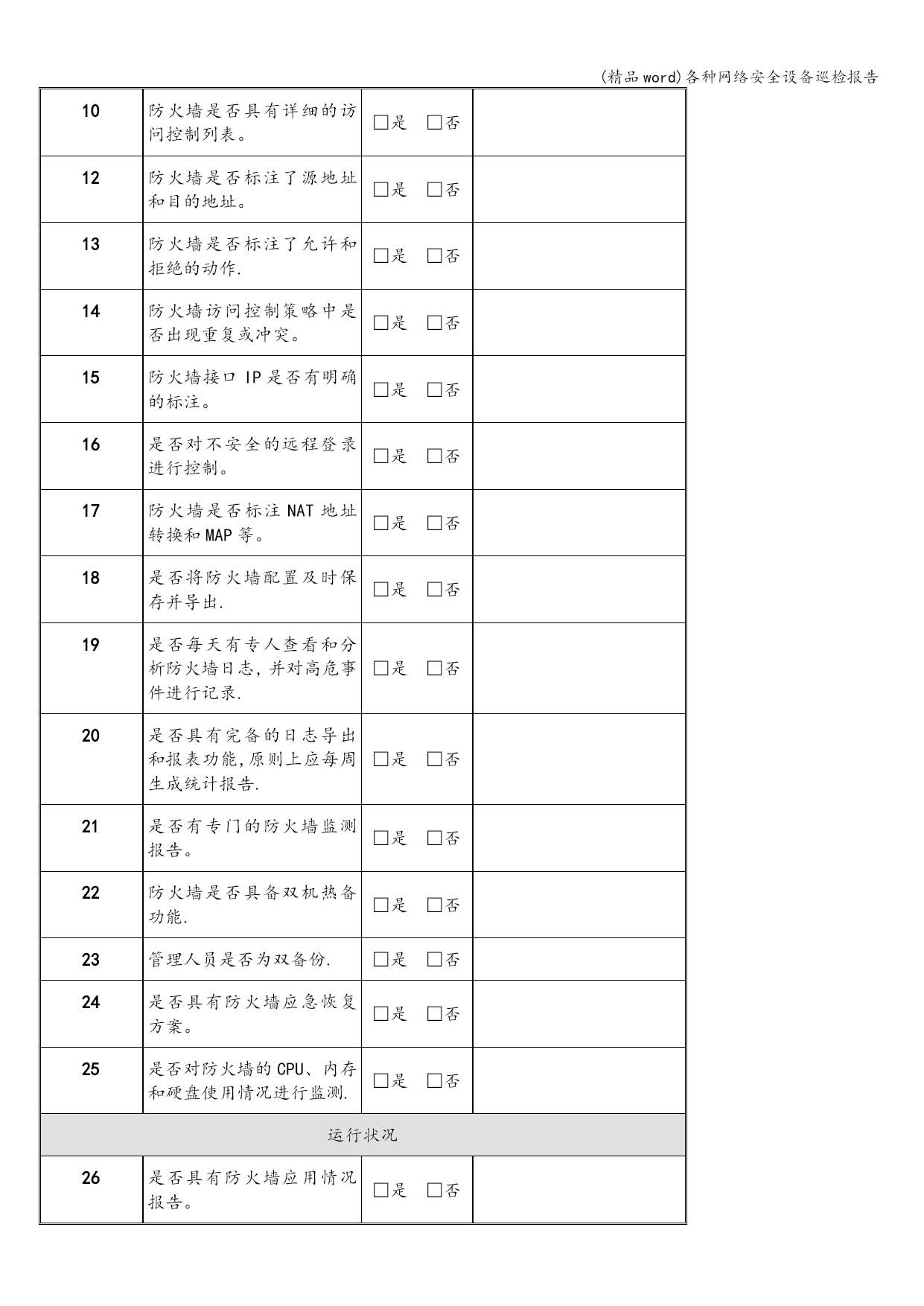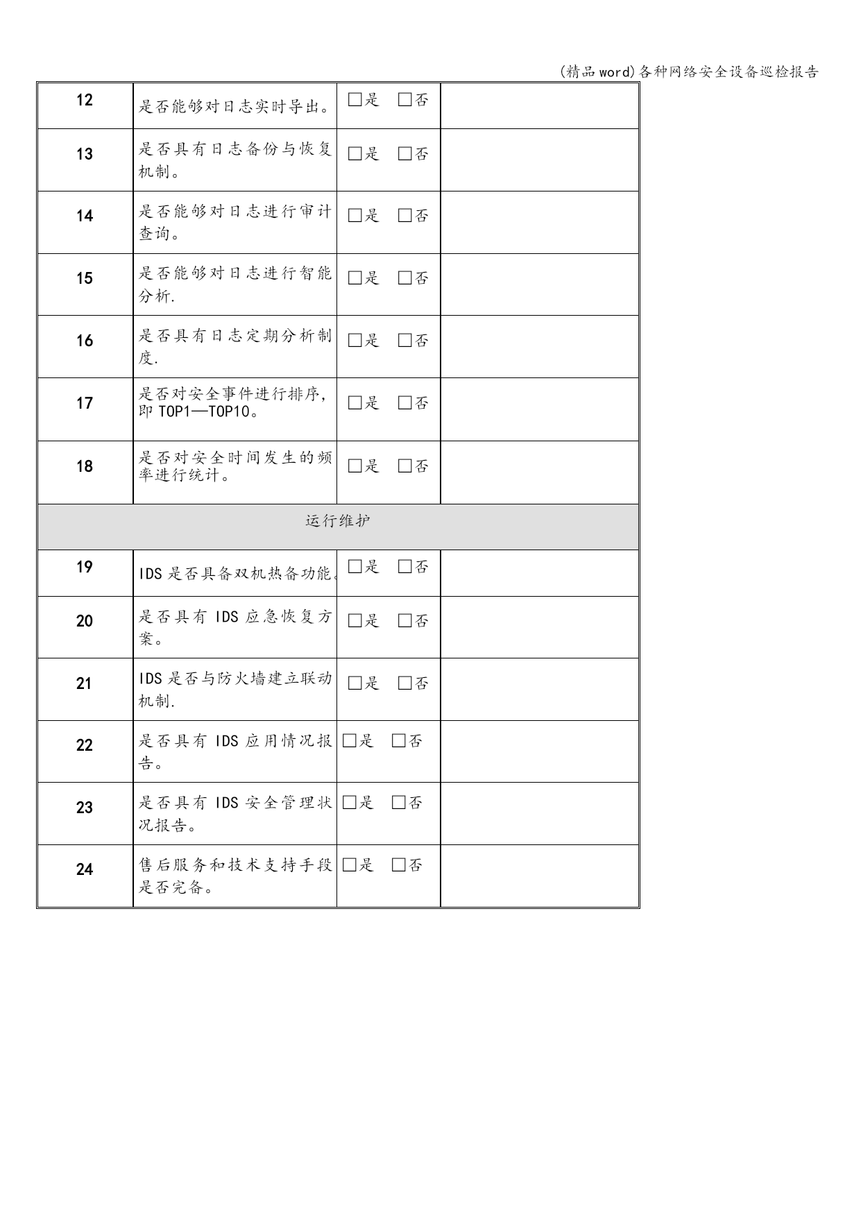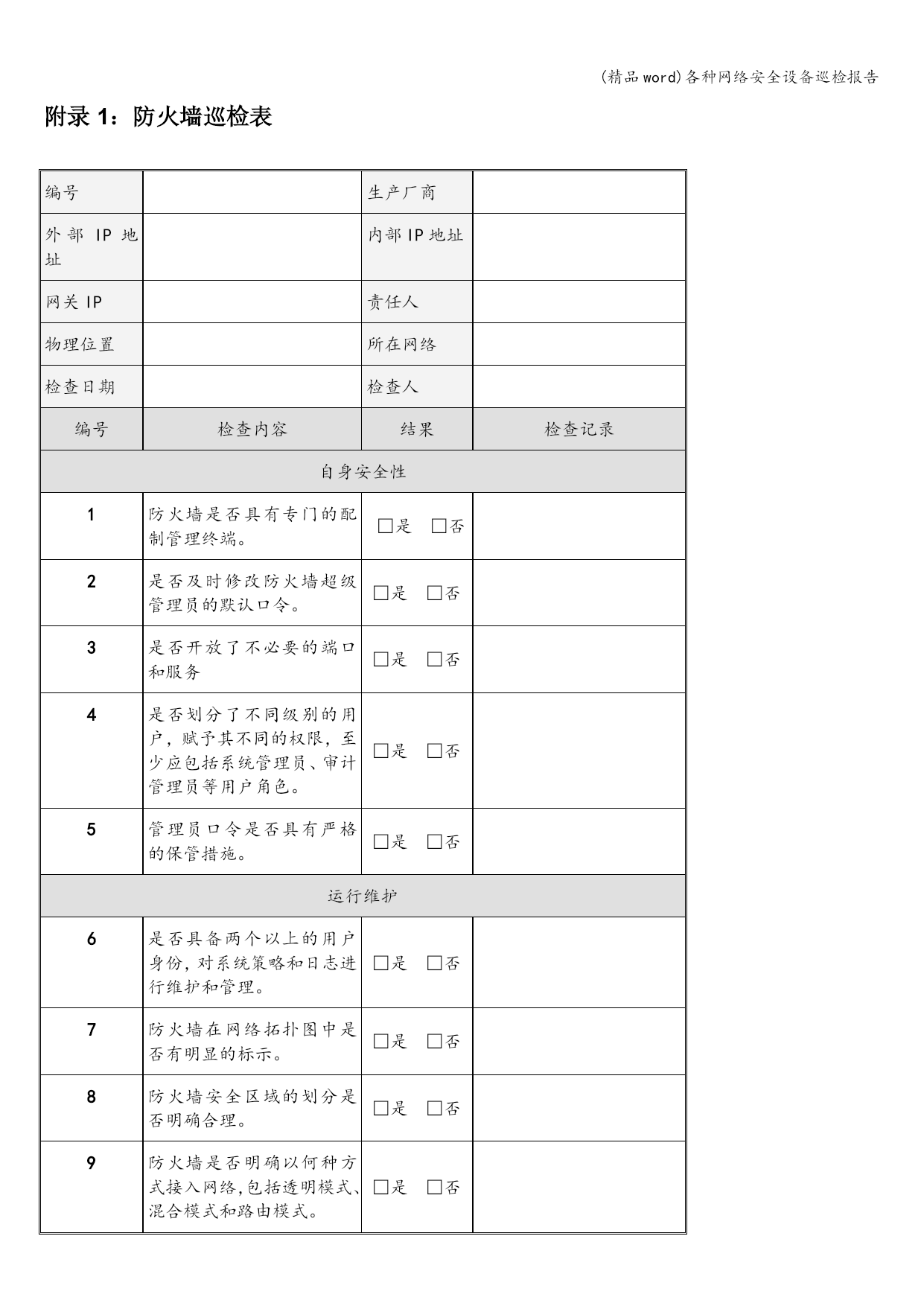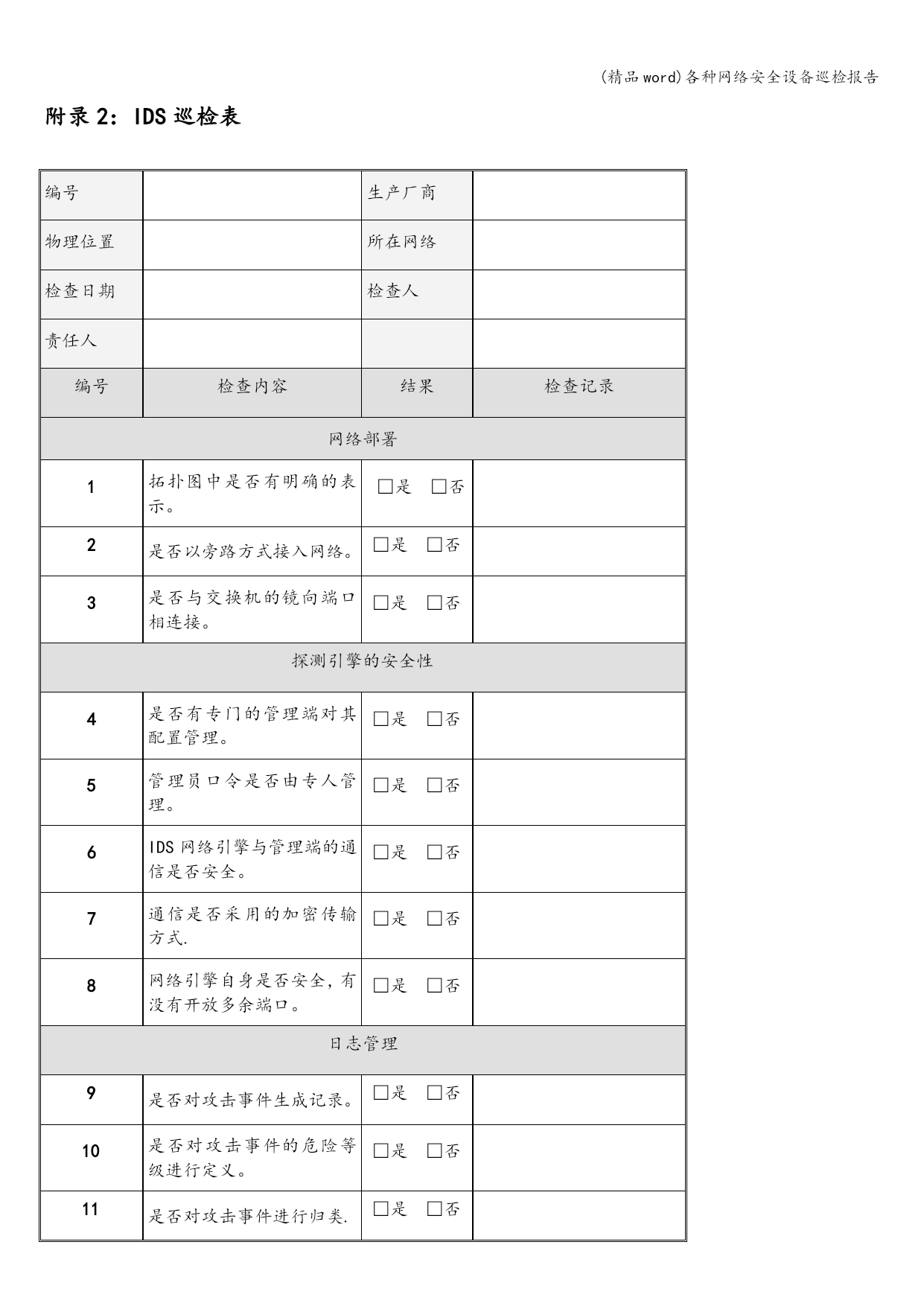 (精品word)各种网络安全设备巡检报告 (精品word)各种网络安全设备巡检报告 (精品word)各种网络安全设备巡检报告 附录1:防火墙巡检表 编号生产厂商外部IP地址内部IP地址网关IP责任人物理位置所在网络检查日期检查人编号检查内容结果检查记录自身安全性1防火墙是否具有专门的配制管理终端。□是□否2是否及时修改防火墙超级管理员的默认口令。□是□否3是否开放了不必要的端口和服务□是□否4是否划分了不同级别的用户,赋予其不同的权限,至少应包括系统管理员、审计管理员等用户角色。□是□否5管理员口令是否具有严格的保管措施。□是□否运行维护6是否具备两个以上的用户身份,对系统策略和日志进行维护和管理。□是□否7防火墙在网络拓扑图中是否有明显的标示。□是□否8防火墙安全区域的划分是否明确合理。□是□否9防火墙是否明确以何种方式接入网络,包括透明模式、混合模式和路由模式。□是□否10防火墙是否具有详细的访问控制列表。□是□否12防火墙是否标注了源地址和目的地址。□是□否13防火墙是否标注了允许和拒绝的动作.□是□否14防火墙访问控制策略中是否出现重复或冲突。□是□否15防火墙接口IP是否有明确的标注。□是□否16是否对不安全的远程登录进行控制。□是□否17防火墙是否标注NAT地址转换和MAP等。□是□否18是否将防火墙配置及时保存并导出.□是□否19是否每天有专人查看和分析防火墙日志,并对高危事件进行记录.□是□否20是否具有完备的日志导出和报表功能,原则上应每周生成统计报告.□是□否21是否有专门的防火墙监测报告。□是□否22防火墙是否具备双机热备功能.□是□否23管理人员是否为双备份.□是□否24是否具有防火墙应急恢复方案。□是□否25是否对防火墙的CPU、内存和硬盘使用情况进行监测.□是□否运行状况26是否具有防火墙应用情况报告。□是□否27是否具有防火墙安全管理状况报告。□是□否28是否具有防火墙系统运行监测报告。□是□否29售后服务和技术支持手段是否完备.□是□否 附录2:IDS巡检表 编号生产厂商物理位置所在网络检查日期检查人责任人编号检查内容结果检查记录网络部署1拓扑图中是否有明确的表示。□是□否2是否以旁路方式接入网络。□是□否3是否与交换机的镜向端口相连接。□是□否探测引擎的安全性4是否有专门的管理端对其配置管理。□是□否5管理员口令是否由专人管理。□是□否6IDS网络引擎与管理端的通信是否安全。□是□否7通信是否采用的加密传输方式.□是□否8网络引擎自身是否安全,有没有开放多余端口。□是□否日志管理9是否对攻击事件生成记录。□是□否10是否对攻击事件的危险等级进行定义。□是□否11是否对攻击事件进行归类.□是□否12是否能够对日志实时导出。□是□否13是否具有日志备份与恢复机制。□是□否14是否能够对日志进行审计查询。□是□否15是否能够对日志进行智能分析.□是□否16是否具有日志定期分析制度.□是□否17是否对安全事件进行排序,即TOP1—TOP10。□是□否18是否对安全时间发生的频率进行统计。□是□否运行维护19IDS是否具备双机热备功能。□是□否20是否具有IDS应急恢复方案。□是□否21IDS是否与防火墙建立联动机制.□是□否22是否具有IDS应用情况报告。□是□否23是否具有IDS安全管理状况报告。□是□否24售后服务和技术支持手段是否完备。□是□否 附录3:防病毒系统巡检表 编号生产厂商物理位置所在网络检查日期检查人单机病毒库服务器责任人检查细目编号检查项目检查内容结果检查记录1符合性要求是否通过了国家相关的认证2部署合理性 网络中是否部署了防病毒系统3是否部署了网络版的防病毒软件4是否部署了病毒库服务器5病毒库服务器的命名是否一致6防病毒软件的品牌和版本是否统一7病毒库升级是否制定了多级病毒库升级策略8是否禁止客户端主动连接病毒库服务器9是否定制了病毒库代码更新策略10病毒查杀是否定制了病毒查杀策略11是否定期对网络中的主机进行病毒扫描12是否定期检测防病毒系统的查杀能力13日志记录防病毒系统对病毒的入侵是否有完整的记录14告警机制是否对病毒入侵完备的告警机制15是否能够及时隔离被感染主机或区域16应急恢复是否具有应急恢复手段 附录4:审计系统巡检表 编号物理位置所在网络外部IP地址内部IP地址网关IP域名服务器IP操作系统版本号CPU内存检查日期检查人责任人检查细目编号检查项目检查内容结果检查记录1审计数据产生审计数据是否包括事件发生的时间、类型、主客体身份和事件结果等2是否可以扩充和修改可审计的事件3可审计的事件是否可以追溯到用户的身份和级别4审计记录的查阅 是否只有授权用户才能查阅审计记录5是否能够对审计的数据进行筛选6审计事件存储是否有审计数据备份与恢复机制7是否有防止审计数据