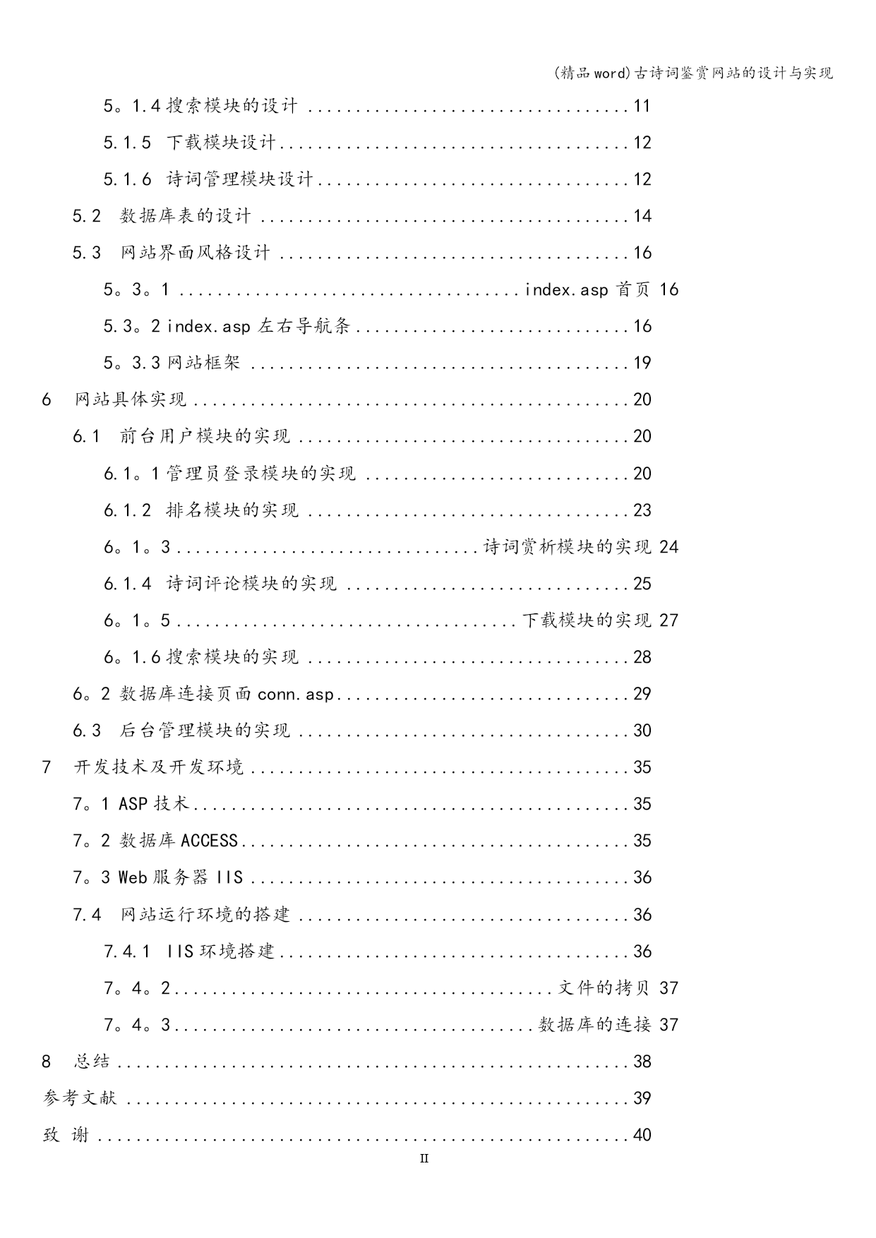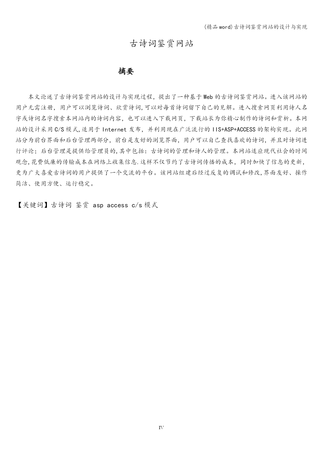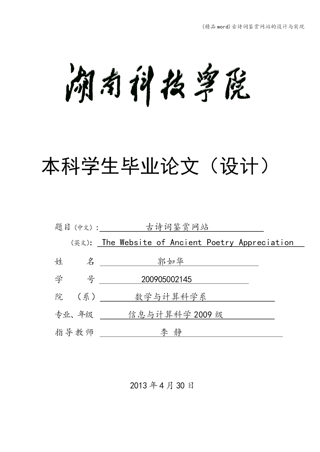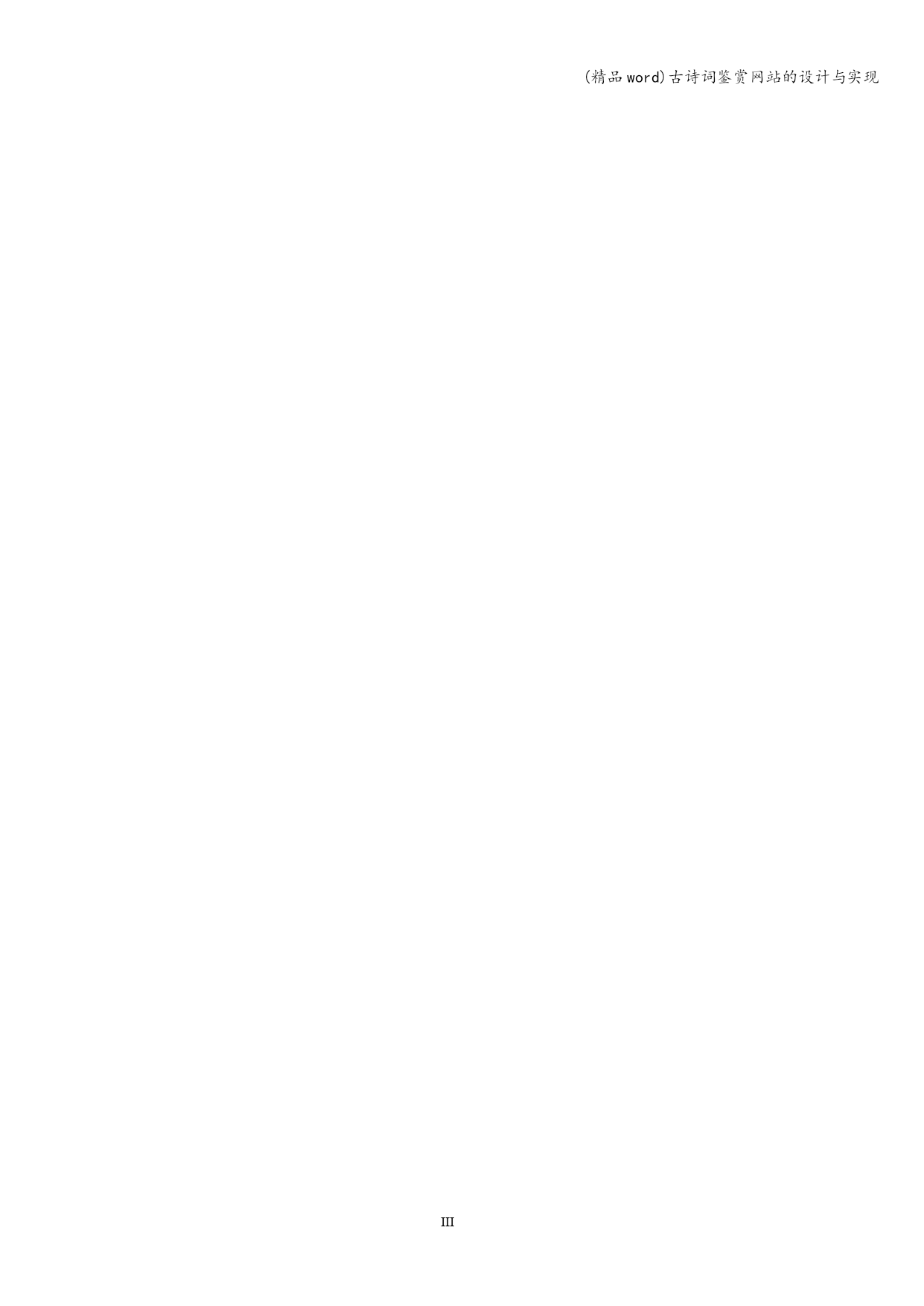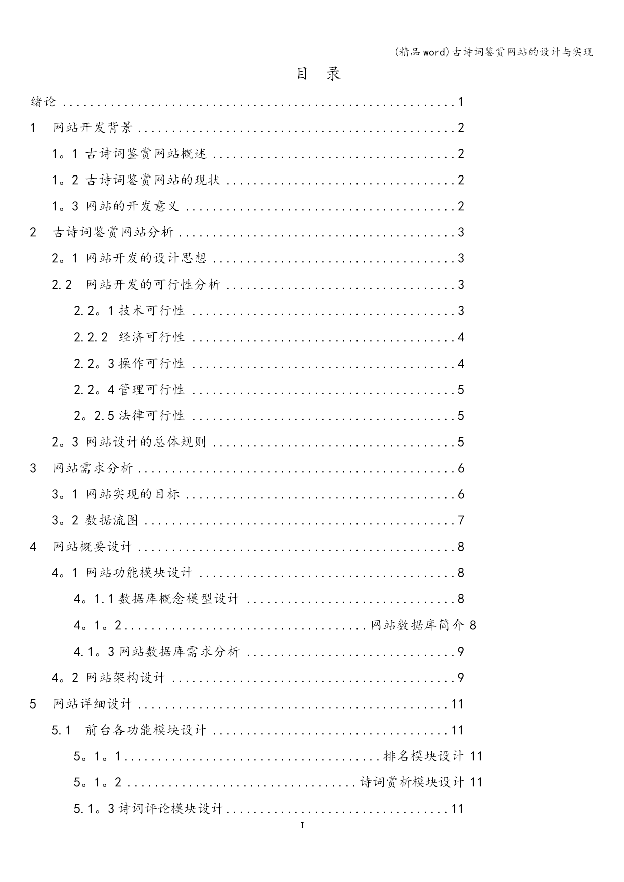 (精品word)古诗词鉴赏网站的设计与实现 (精品word)古诗词鉴赏网站的设计与实现 (精品word)古诗词鉴赏网站的设计与实现 本科学生毕业论文(设计) 题目(中文):古诗词鉴赏网站 (英文):TheWebsiteofAncientPoetryAppreciation 姓名郭如华 学号200905002145 院(系)数学与计算科学系 专业、年级信息与计算科学2009级 指导教师李静 2013年4月30日 PAGEIII 目录TOC\o”1-3"\h\z\u HYPERLINK\l"_Toc356486284”绪论 PAGEREF_Toc356486284\h1 HYPERLINK\l"_Toc356486285”1 网站开发背景 PAGEREF_Toc356486285\h2 HYPERLINK\l"_Toc356486286”1。1 古诗词鉴赏网站概述 PAGEREF_Toc356486286\h2 HYPERLINK\l"_Toc356486287"1。2 古诗词鉴赏网站的现状 PAGEREF_Toc356486287\h2 HYPERLINK\l"_Toc356486288”1。3 网站的开发意义 PAGEREF_Toc356486288\h2 HYPERLINK\l”_Toc356486289”2 古诗词鉴赏网站分析 PAGEREF_Toc356486289\h3 HYPERLINK\l"_Toc356486290"2。1 网站开发的设计思想 PAGEREF_Toc356486290\h3 HYPERLINK\l"_Toc356486291"2.2 网站开发的可行性分析 PAGEREF_Toc356486291\h3 HYPERLINK\l"_Toc356486292"2.2。1 技术可行性 PAGEREF_Toc356486292\h3 HYPERLINK\l"_Toc356486293”2.2.2 经济可行性 PAGEREF_Toc356486293\h4 HYPERLINK\l"_Toc356486294”2.2。3 操作可行性 PAGEREF_Toc356486294\h4 HYPERLINK\l”_Toc356486295"2.2。4 管理可行性 PAGEREF_Toc356486295\h5 HYPERLINK\l"_Toc356486296"2。2.5 法律可行性 PAGEREF_Toc356486296\h5 HYPERLINK\l”_Toc356486297”2。3 网站设计的总体规则 PAGEREF_Toc356486297\h5 HYPERLINK\l”_Toc356486298"3 网站需求分析 PAGEREF_Toc356486298\h6 HYPERLINK\l"_Toc356486299”3。1 网站实现的目标 PAGEREF_Toc356486299\h6 HYPERLINK\l”_Toc356486300"3。2 数据流图 PAGEREF_Toc356486300\h7 HYPERLINK\l"_Toc356486301”4 网站概要设计 PAGEREF_Toc356486301\h8 HYPERLINK\l"_Toc356486302”4。1 网站功能模块设计 PAGEREF_Toc356486302\h8 HYPERLINK\l"_Toc356486303"4。1.1 数据库概念模型设计 PAGEREF_Toc356486303\h8 HYPERLINK\l"_Toc356486304"4。1。2 网站数据库简介 PAGEREF_Toc356486304\h8 HYPERLINK\l”_Toc356486305"4.1。3 网站数据库需求分析 PAGEREF_Toc356486305\h9 HYPERLINK\l"_Toc356486306"4。2 网站架构设计 PAGEREF_Toc356486306\h9 HYPERLINK\l"_Toc356486307"5 网站详细设计 PAGEREF_Toc356486307\h11 HYPERLINK\l”_Toc356486308"5.1 前台各功能模块设计 PAGEREF_Toc356486308\h11 HYPERLINK\l”_Toc356486309”5。1。1 排名模块设计 PAGEREF