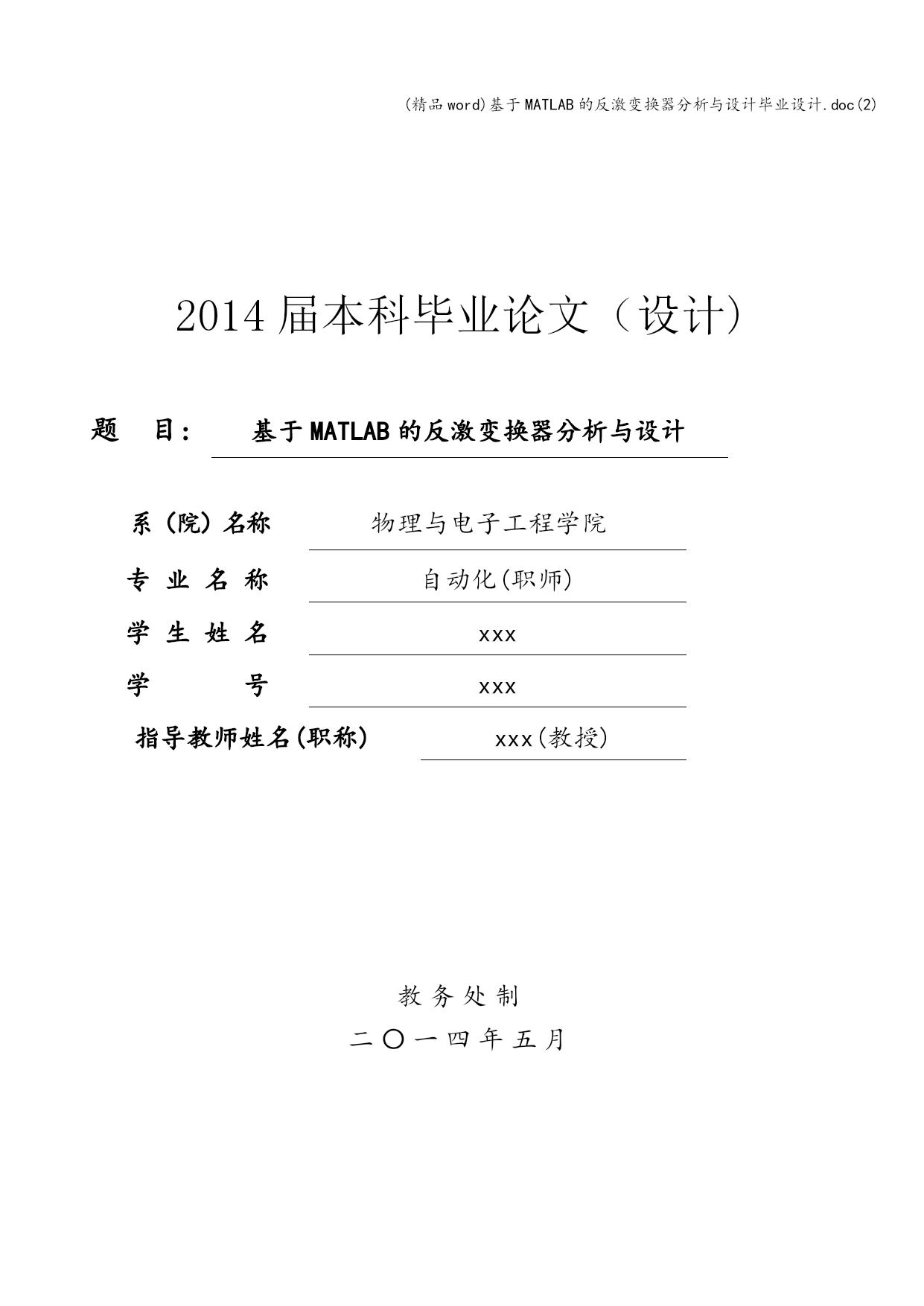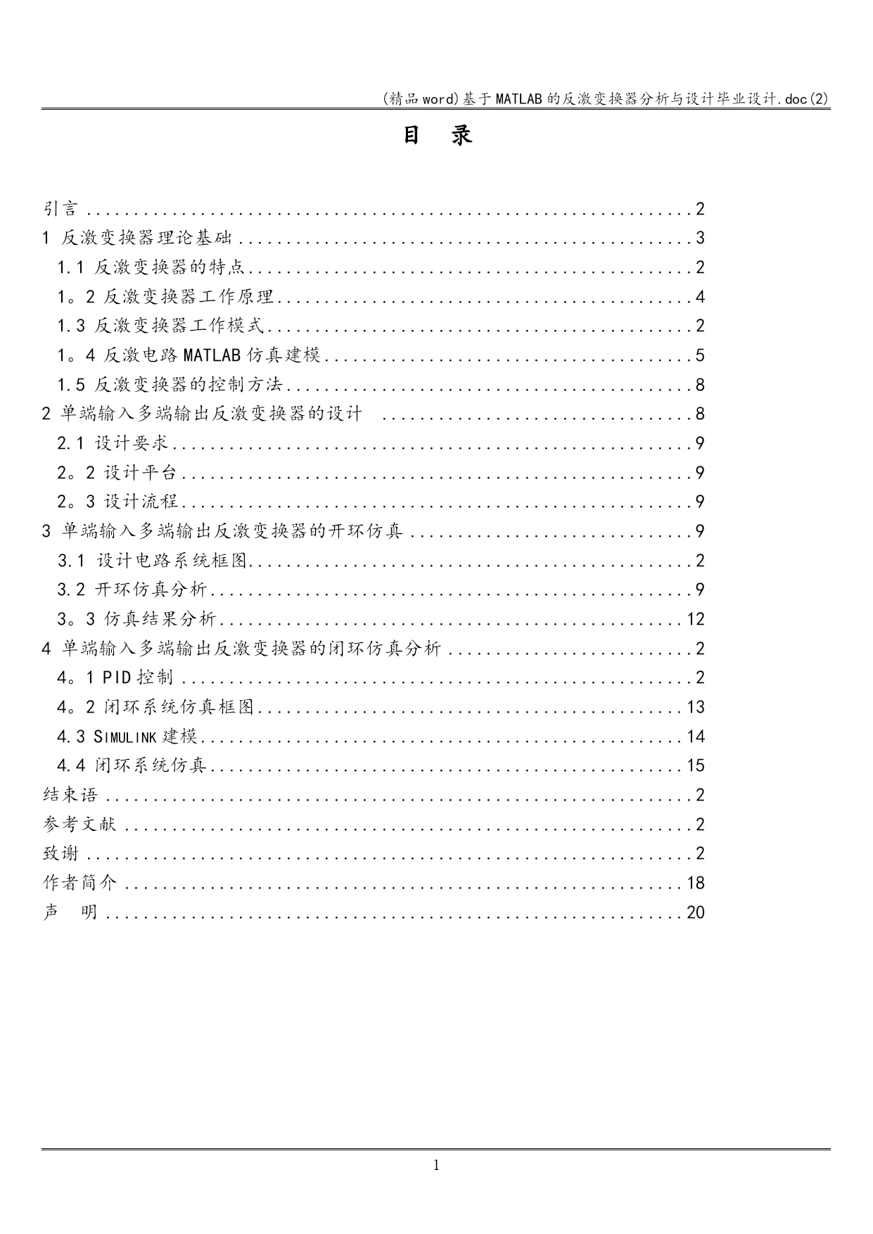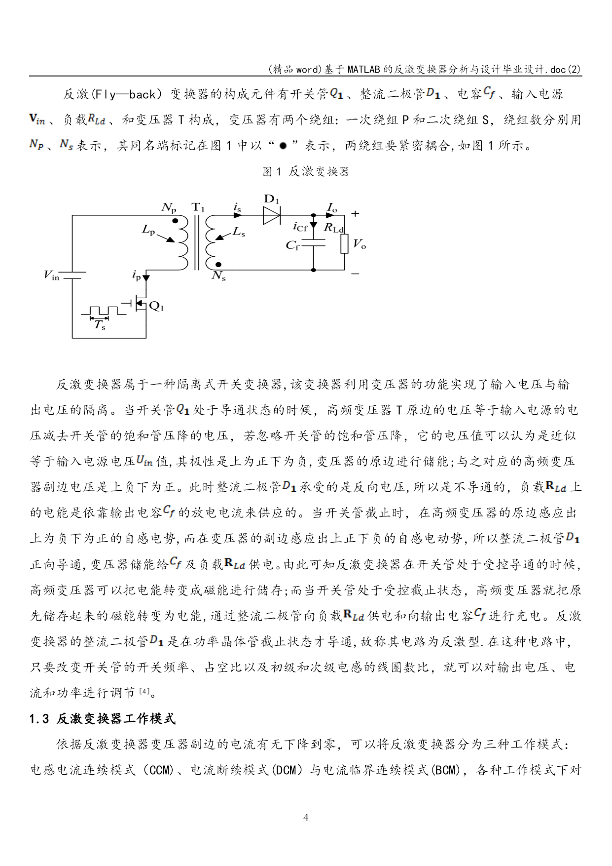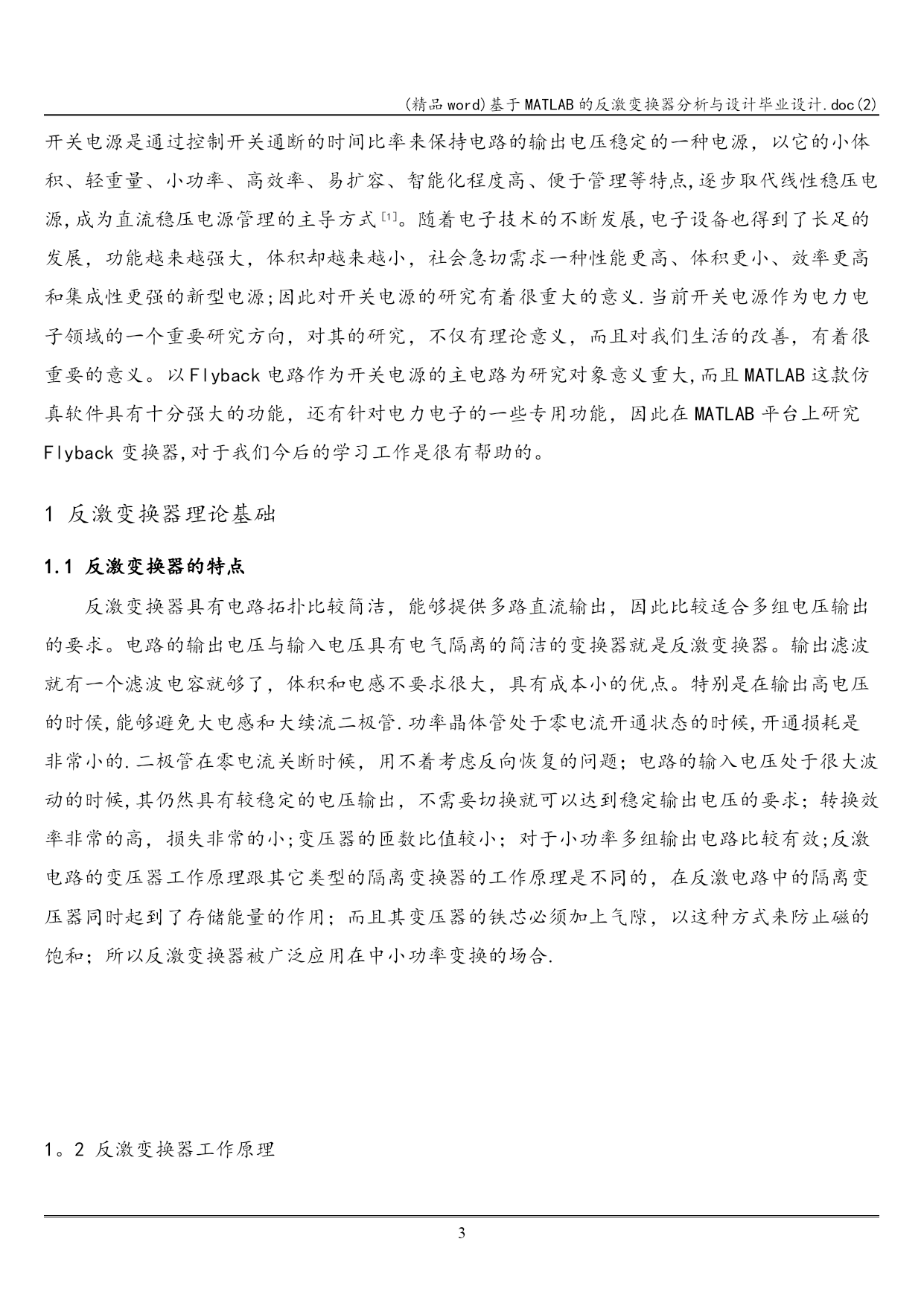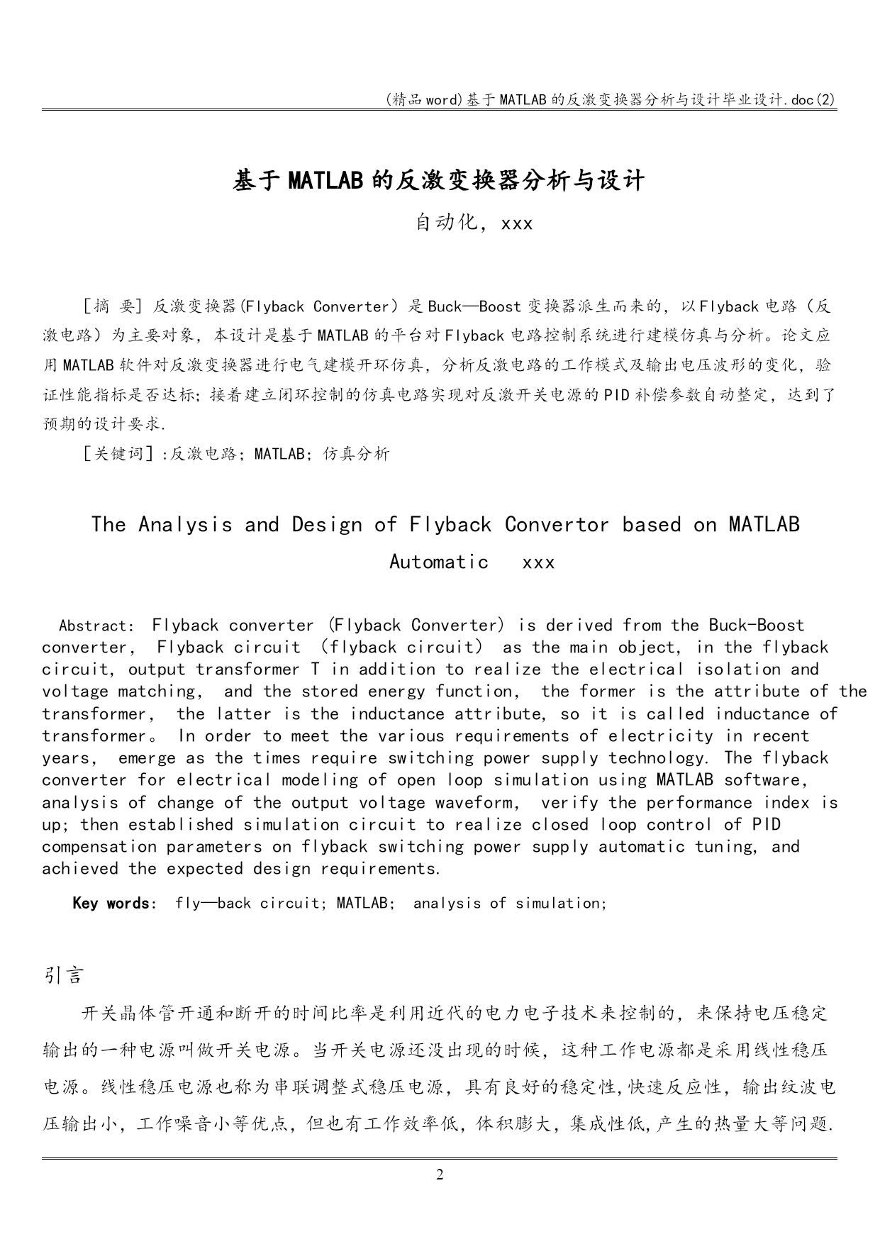 (精品word)基于MATLAB的反激变换器分析与设计毕业设计.doc(2) (精品word)基于MATLAB的反激变换器分析与设计毕业设计.doc(2) (精品word)基于MATLAB的反激变换器分析与设计毕业设计.doc(2) 2014届本科毕业论文(设计) 题目:基于MATLAB的反激变换器分析与设计 系(院)名称物理与电子工程学院 专业名称自动化(职师) 学生姓名xxx 学号xxx 指导教师姓名(职称)xxx(教授) 教务处制 二〇一四年五月 PAGE\*MERGEFORMAT18 PAGE\*MERGEFORMAT19 目录 TOC\o"1—3”\h\z\uHYPERLINK\l"_Toc387956110”引言 PAGEREF_Toc387956110\h2 HYPERLINK\l"_Toc387956111”1反激变换器理论基础 3 HYPERLINK\l"_Toc387956113”1.1反激变换器的特点 PAGEREF_Toc387956113\h2 HYPERLINK\l”_Toc387956114"1。2反激变换器工作原理 4 HYPERLINK\l”_Toc387956115”1.3反激变换器工作模式 PAGEREF_Toc387956115\h2 HYPERLINK\l”_Toc387956116”1。4反激电路MATLAB仿真建模 5 HYPERLINK\l"_Toc387956117”1.5反激变换器的控制方法 8 2单端输入多端输出反激变换器的设计 8 HYPERLINK\l"_Toc387956118"2.1设计要求 9 HYPERLINK\l”_Toc387956119"2。2设计平台 9 HYPERLINK\l"_Toc387956120"2。3设计流程 9 HYPERLINK\l”_Toc387956121”3单端输入多端输出反激变换器的开环仿真 9 HYPERLINK\l"_Toc387956122”3.1设计电路系统框图 PAGEREF_Toc387956122\h2 HYPERLINK\l"_Toc387956120”3.2开环仿真分析 9 HYPERLINK\l"_Toc387956120”3。3仿真结果分析 12 HYPERLINK\l”_Toc387956123”4单端输入多端输出反激变换器的闭环仿真分析 PAGEREF_Toc387956123\h2 HYPERLINK\l”_Toc387956124”4。1PID控制 PAGEREF_Toc387956124\h2 HYPERLINK\l"_Toc387956120"4。2闭环系统仿真框图 13 HYPERLINK\l”_Toc387956120"4.3Simulink建模 14 HYPERLINK\l"_Toc387956120"4.4闭环系统仿真 15 HYPERLINK\l"_Toc387956126”结束语 PAGEREF_Toc387956126\h2 HYPERLINK\l"_Toc387956127”参考文献 PAGEREF_Toc387956127\h2 HYPERLINK\l”_Toc387956128”致谢 PAGEREF_Toc387956128\h2 HYPERLINK\l”_Toc387956129"作者简介 18 HYPERLINK\l"_Toc387956130”声明 20 基于MATLAB的反激变换器分析与设计 自动化,xxx [摘要]反激变换器(FlybackConverter)是Buck—Boost变换器派生而来的,以Flyback电路(反激电路)为主要对象,本设计是基于MATLAB的平台对Flyback电路控制系统进行建模仿真与分析。论文应用MATLAB软件对反激变换器进行电气建模开环仿真,分析反激电路的工作模式及输出电压波形的变化,验证性能指标是否达标;接着建立闭环控制的仿真电路实现对反激开关电源的PID补偿参数自动整定,达到了预期的设计要求. [关键词]:反激电路;MATLAB;仿真分析 TheAnalysisandDesignofFlybackConvertorbasedonMATLAB Automaticxxx Abstract:Flybackconverter(FlybackConverter)isderivedfromtheBuck-Boostconverter,Flybackcircuit(flybackcircui