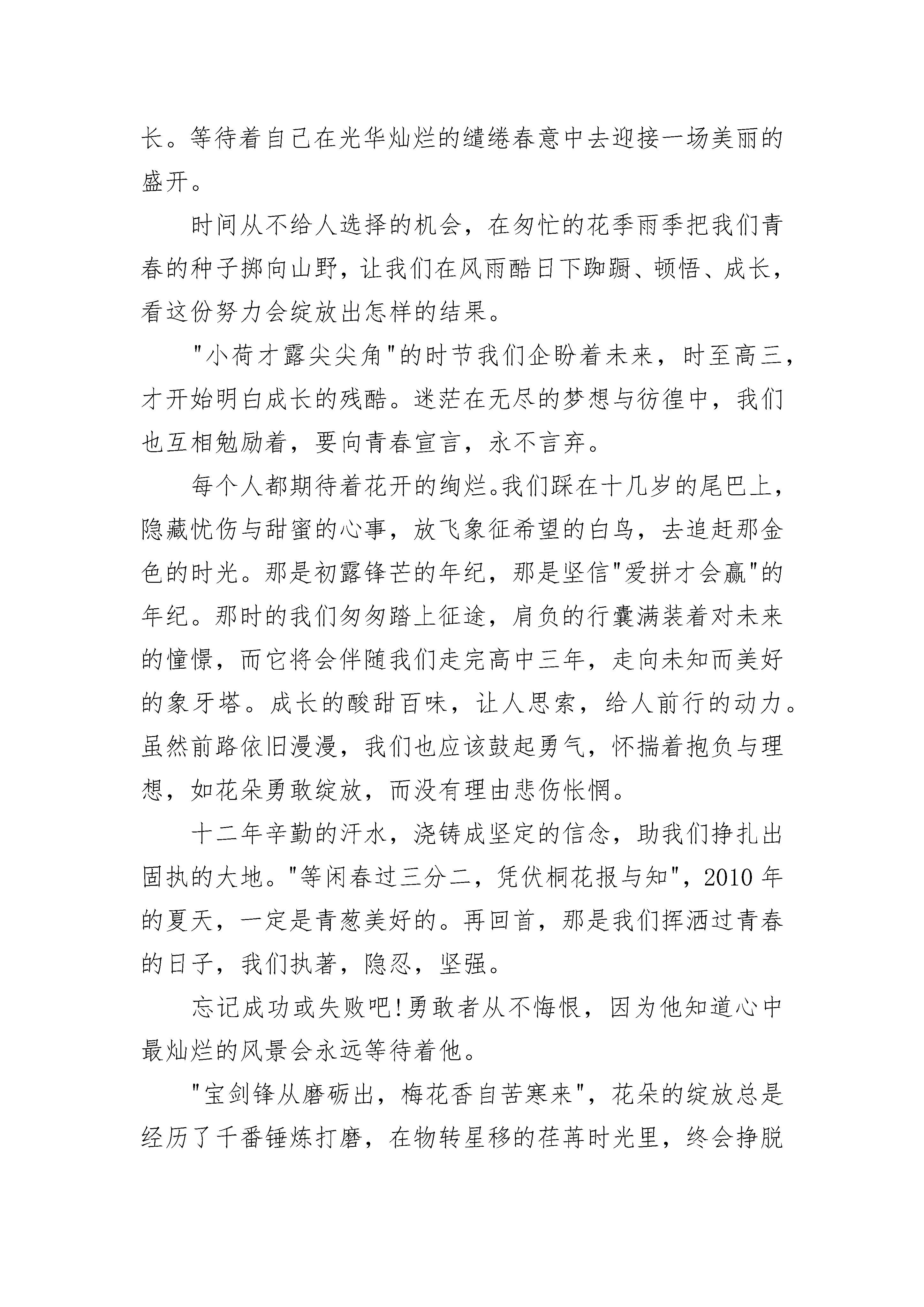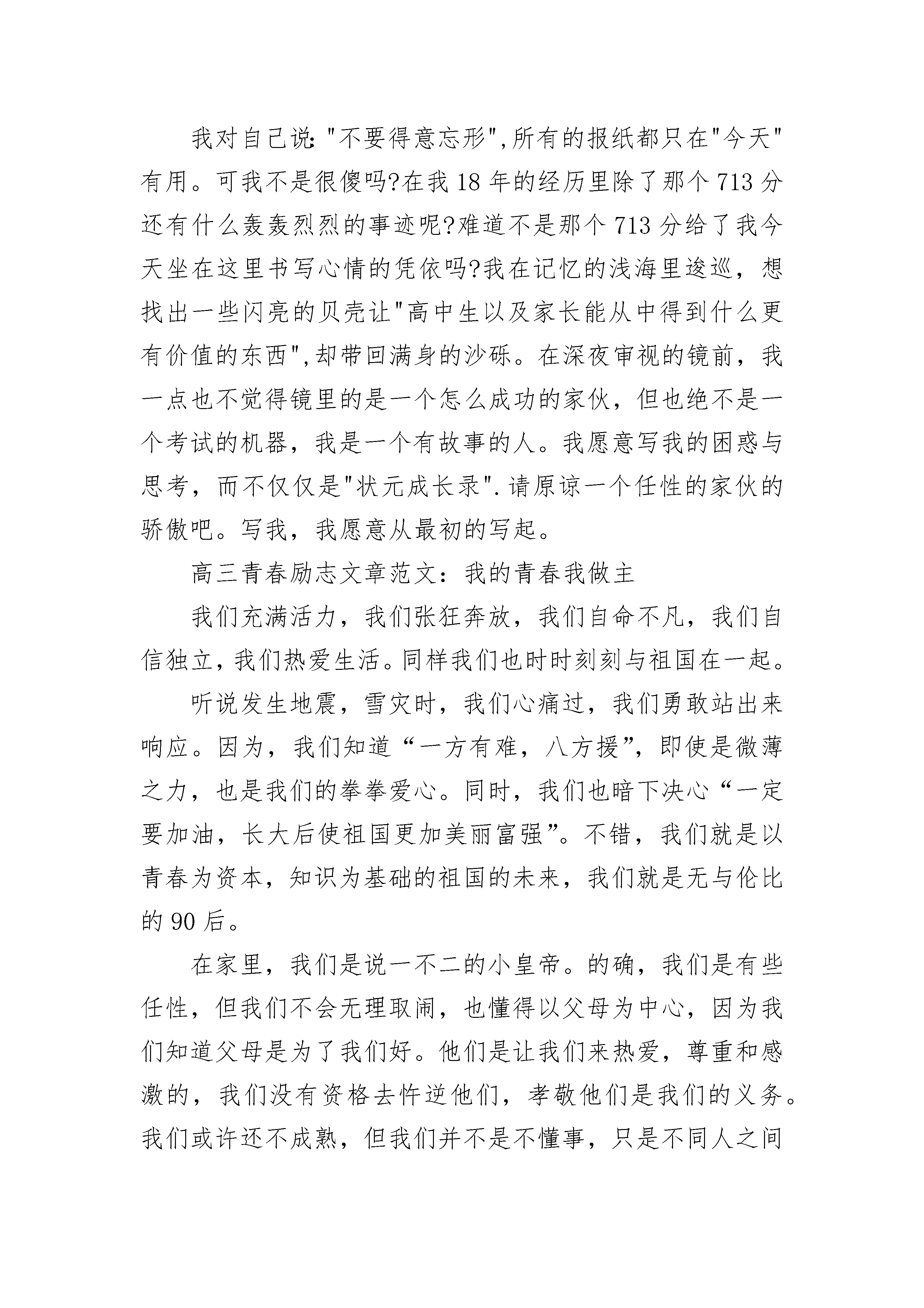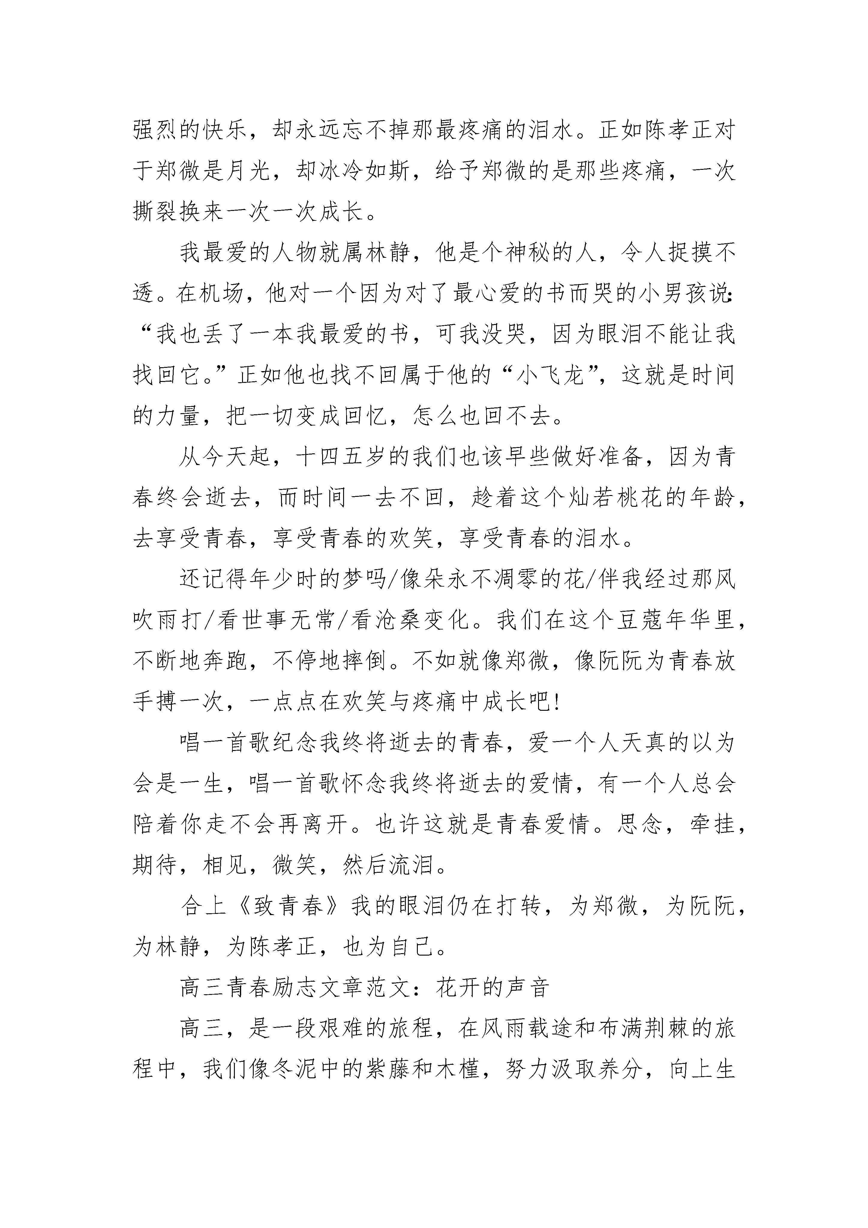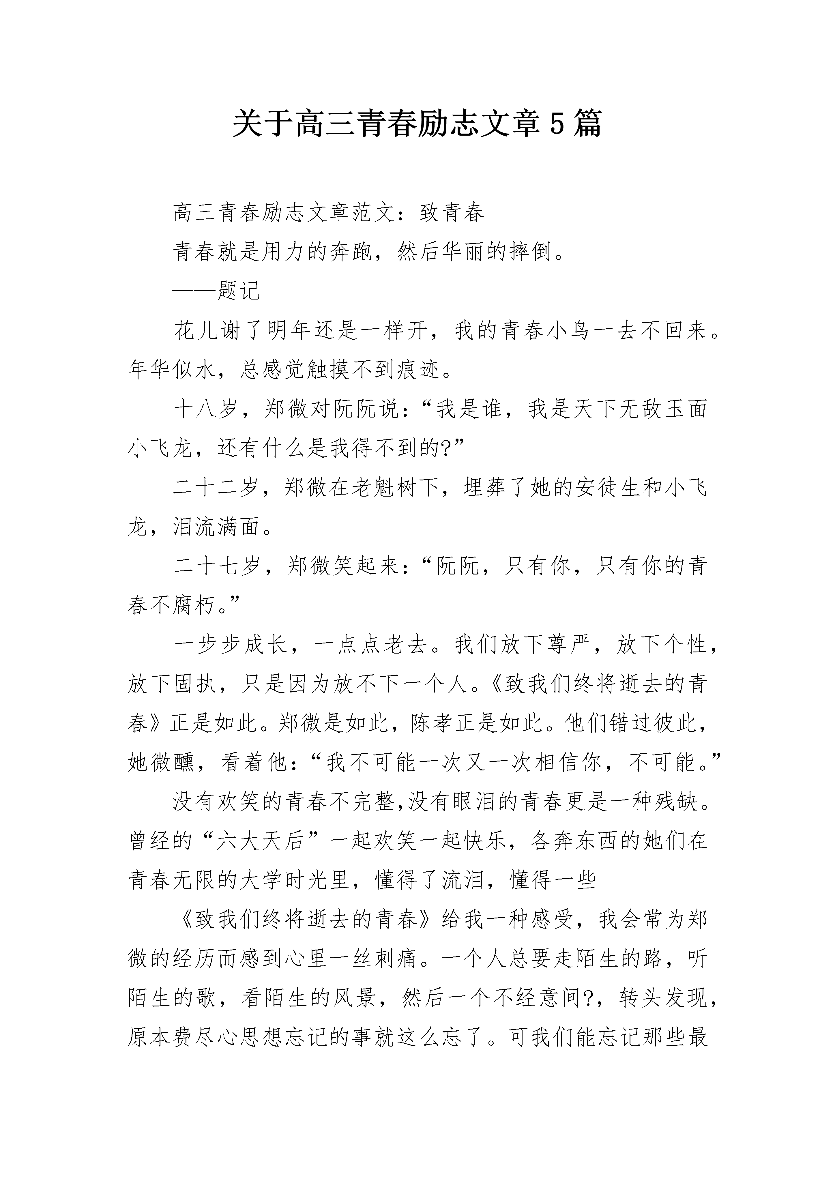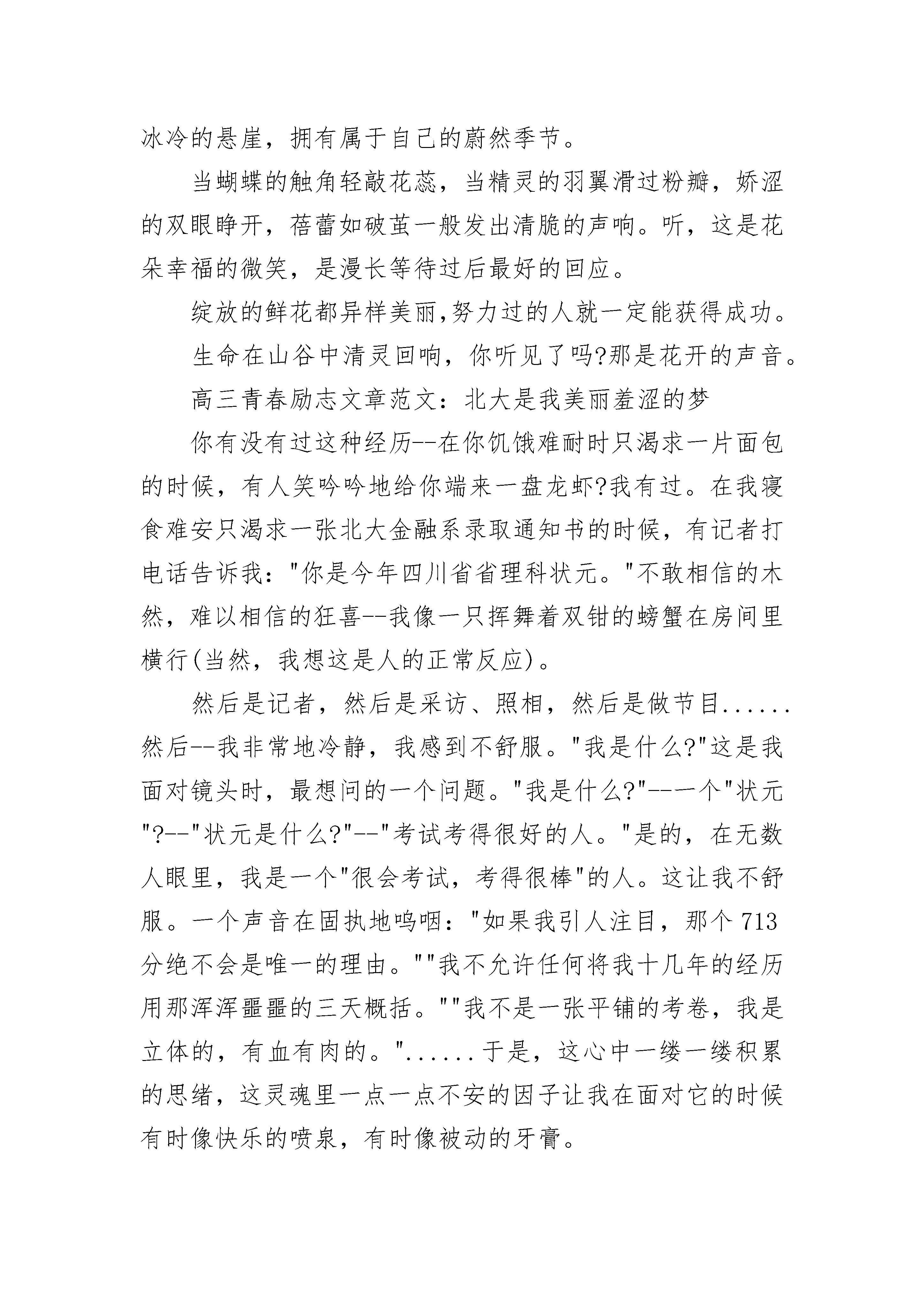 关于高三青春励志文章5篇高三青春励志文章范文:致青春青春就是用力的奔跑,然后华丽的摔倒。——题记花儿谢了明年还是一样开,我的青春小鸟一去不回来。年华似水,总感觉触摸不到痕迹。十八岁,郑微对阮阮说:“我是谁,我是天下无敌玉面小飞龙,还有什么是我得不到的?”二十二岁,郑微在老魁树下,埋葬了她的安徒生和小飞龙,泪流满面。二十七岁,郑微笑起来:“阮阮,只有你,只有你的青春不腐朽。”一步步成长,一点点老去。我们放下尊严,放下个性,放下固执,只是因为放不下一个人。《致我们终将逝去的青春》正是如此。郑微是如此,陈孝正是如此。他们错过彼此,她微醺,看着他:“我不可能一次又一次相信你,不可能。”没有欢笑的青春不完整,没有眼泪的青春更是一种残缺。曾经的“六大天后”一起欢笑一起快乐,各奔东西的她们在青春无限的大学时光里,懂得了流泪,懂得一些《致我们终将逝去的青春》给我一种感受,我会常为郑微的经历而感到心里一丝刺痛。一个人总要走陌生的路,听陌生的歌,看陌生的风景,然后一个不经意间?,转头发现,原本费尽心思想忘记的事就这么忘了。可我们能忘记那些最强烈的快乐,却永远忘不掉那最疼痛的泪水。正如陈孝正对于郑微是月光,却冰冷如斯,给予郑微的是那些疼痛,一次撕裂换来一次一次成长。我最爱的人物就属林静,他是个神秘的人,令人捉摸不透。在机场,他对一个因为对了最心爱的书而哭的小男孩说:“我也丢了一本我最爱的书,可我没哭,因为眼泪不能让我找回它。”正如他也找不回属于他的“小飞龙”,这就是时间的力量,把一切变成回忆,怎么也回不去。从今天起,十四五岁的我们也该早些做好准备,因为青春终会逝去,而时间一去不回,趁着这个灿若桃花的年龄,去享受青春,享受青春的欢笑,享受青春的泪水。还记得年少时的梦吗/像朵永不凋零的花/伴我经过那风吹雨打/看世事无常/看沧桑变化。我们在这个豆蔻年华里,不断地奔跑,不停地摔倒。不如就像郑微,像阮阮为青春放手搏一次,一点点在欢笑与疼痛中成长吧!唱一首歌纪念我终将逝去的青春,爱一个人天真的以为会是一生,唱一首歌怀念我终将逝去的爱情,有一个人总会陪着你走不会再离开。也许这就是青春爱情。思念,牵挂,期待,相见,微笑,然后流泪。合上《致青春》我的眼泪仍在打转,为郑微,为阮阮,为林静,为陈孝正,也为自己。高三青春励志文章范文:花开的声音高三,是一段艰难的旅程,在风雨载途和布满荆棘的旅程中,我们像冬泥中的紫藤和木槿,努力汲取养分,向上生长。等待着自己在光华灿烂的缱绻春意中去迎接一场美丽的盛开。时间从不给人选择的机会,在匆忙的花季雨季把我们青春的种子掷向山野,让我们在风雨酷日下踟蹰、顿悟、成长,看这份努力会绽放出怎样的结果。"小荷才露尖尖角"的时节我们企盼着未来,时至高三,才开始明白成长的残酷。迷茫在无尽的梦想与彷徨中,我们也互相勉励着,要向青春宣言,永不言弃。每个人都期待着花开的绚烂。我们踩在十几岁的尾巴上,隐藏忧伤与甜蜜的心事,放飞象征希望的白鸟,去追赶那金色的时光。那是初露锋芒的年纪,那是坚信"爱拼才会赢"的年纪。那时的我们匆匆踏上征途,肩负的行囊满装着对未来的憧憬,而它将会伴随我们走完高中三年,走向未知而美好的象牙塔。成长的酸甜百味,让人思索,给人前行的动力。虽然前路依旧漫漫,我们也应该鼓起勇气,怀揣着抱负与理想,如花朵勇敢绽放,而没有理由悲伤怅惘。十二年辛勤的汗水,浇铸成坚定的信念,助我们挣扎出固执的大地。"等闲春过三分二,凭伏桐花报与知",2010年的夏天,一定是青葱美好的。再回首,那是我们挥洒过青春的日子,我们执著,隐忍,坚强。忘记成功或失败吧!勇敢者从不悔恨,因为他知道心中最灿烂的风景会永远等待着他。"宝剑锋从磨砺出,梅花香自苦寒来",花朵的绽放总是经历了千番锤炼打磨,在物转星移的荏苒时光里,终会挣脱冰冷的悬崖,拥有属于自己的蔚然季节。当蝴蝶的触角轻敲花蕊,当精灵的羽翼滑过粉瓣,娇涩的双眼睁开,蓓蕾如破茧一般发出清脆的声响。听,这是花朵幸福的微笑,是漫长等待过后最好的回应。绽放的鲜花都异样美丽,努力过的人就一定能获得成功。生命在山谷中清灵回响,你听见了吗?那是花开的声音。高三青春励志文章范文:北大是我美丽羞涩的梦你有没有过这种经历--在你饥饿难耐时只渴求一片面包的时候,有人笑吟吟地给你端来一盘龙虾?我有过。在我寝食难安只渴求一张北大金融系录取通知书的时候,有记者打电话告诉我:"你是今年四川省省理科状元。"不敢相信的木然,难以相信的狂喜--我像一只挥舞着双钳的螃蟹在房间里横行(当然,我想这是人的正常反应)。然后是记者,然后是采访、照相,然后是做节目......然后--我非常地冷静,我感到不舒服。"我是什么?"这是我面对镜头时,最想问的一个问题。"我是什么?"--一个"状元"?--"状元是什么?"--"考试考得很好的人。"是的,在无数人眼里,我是一个"