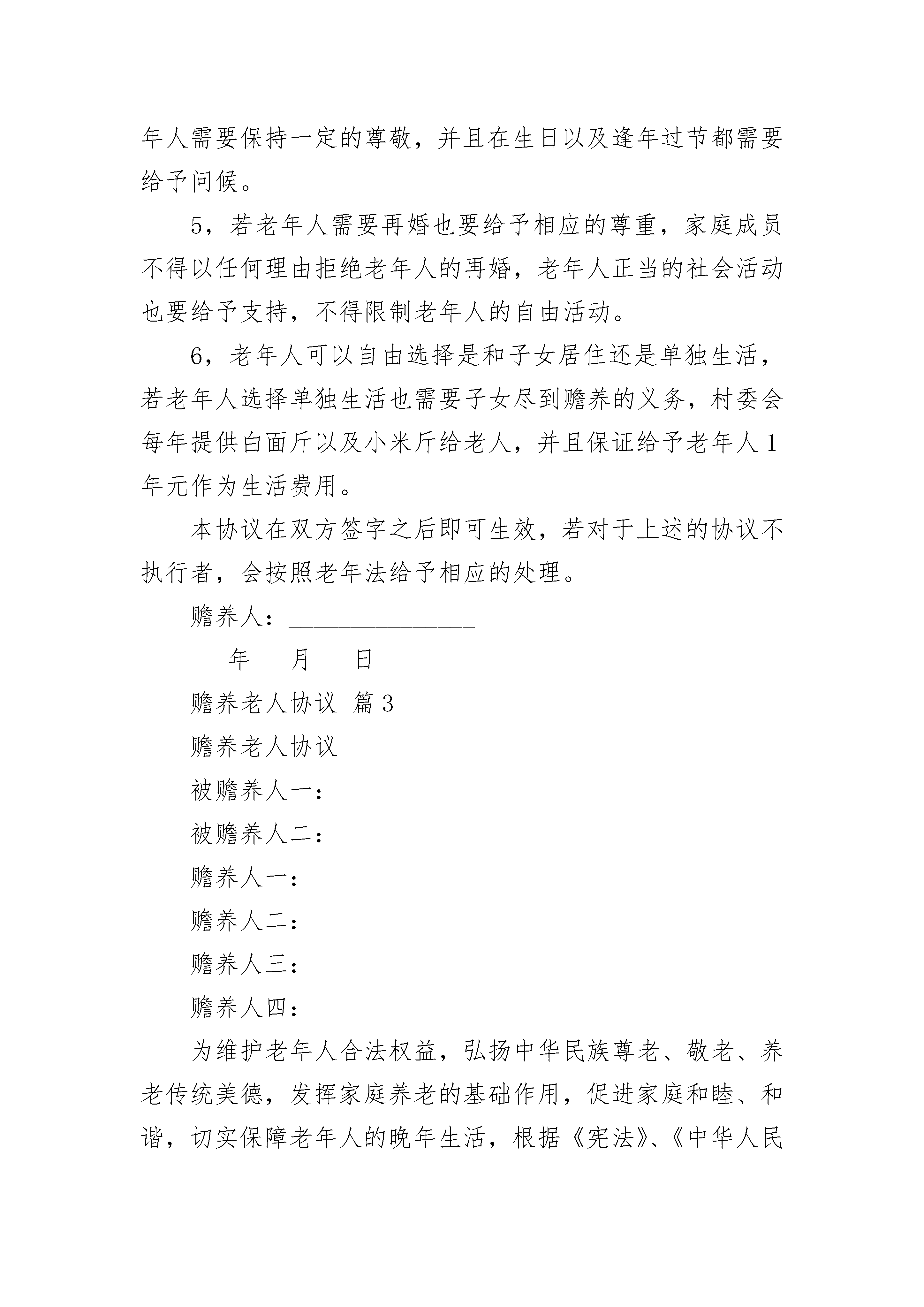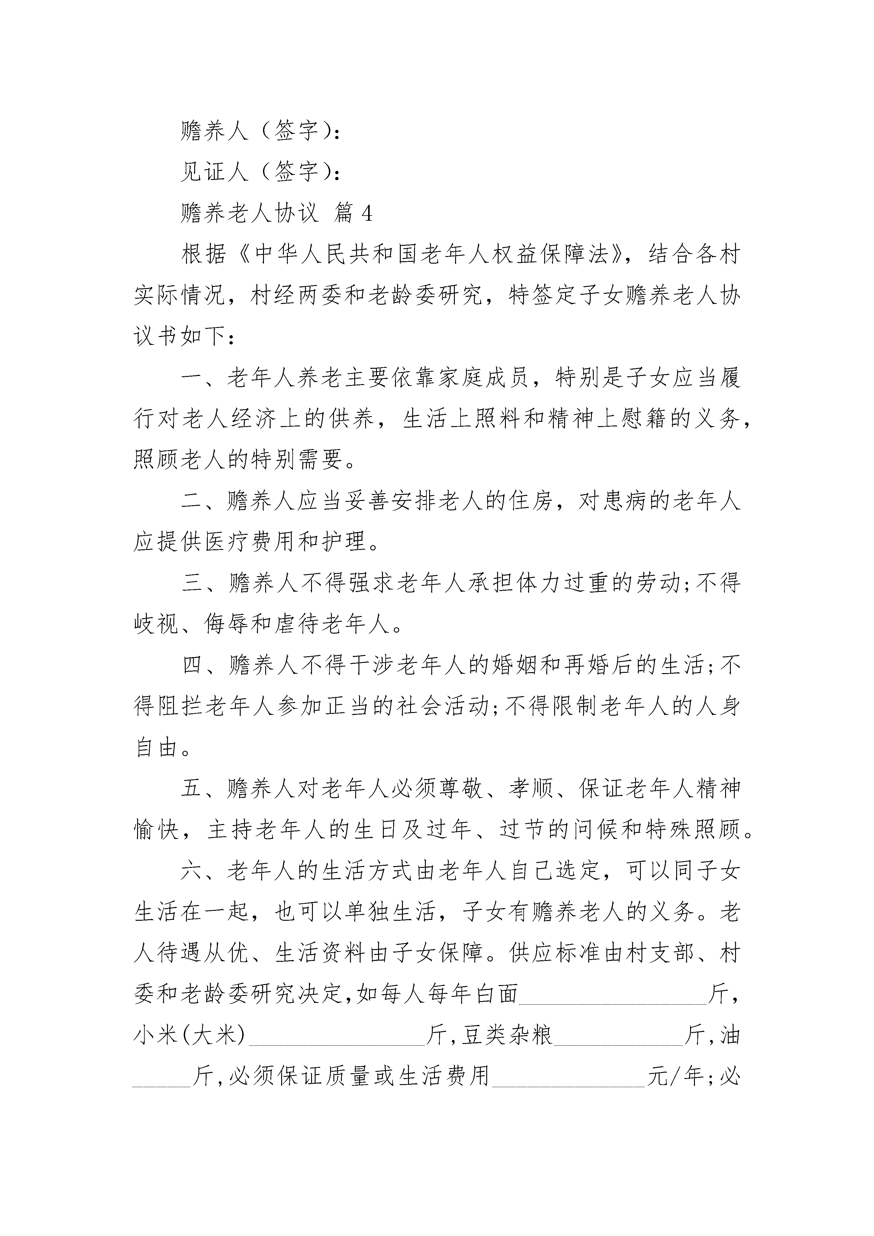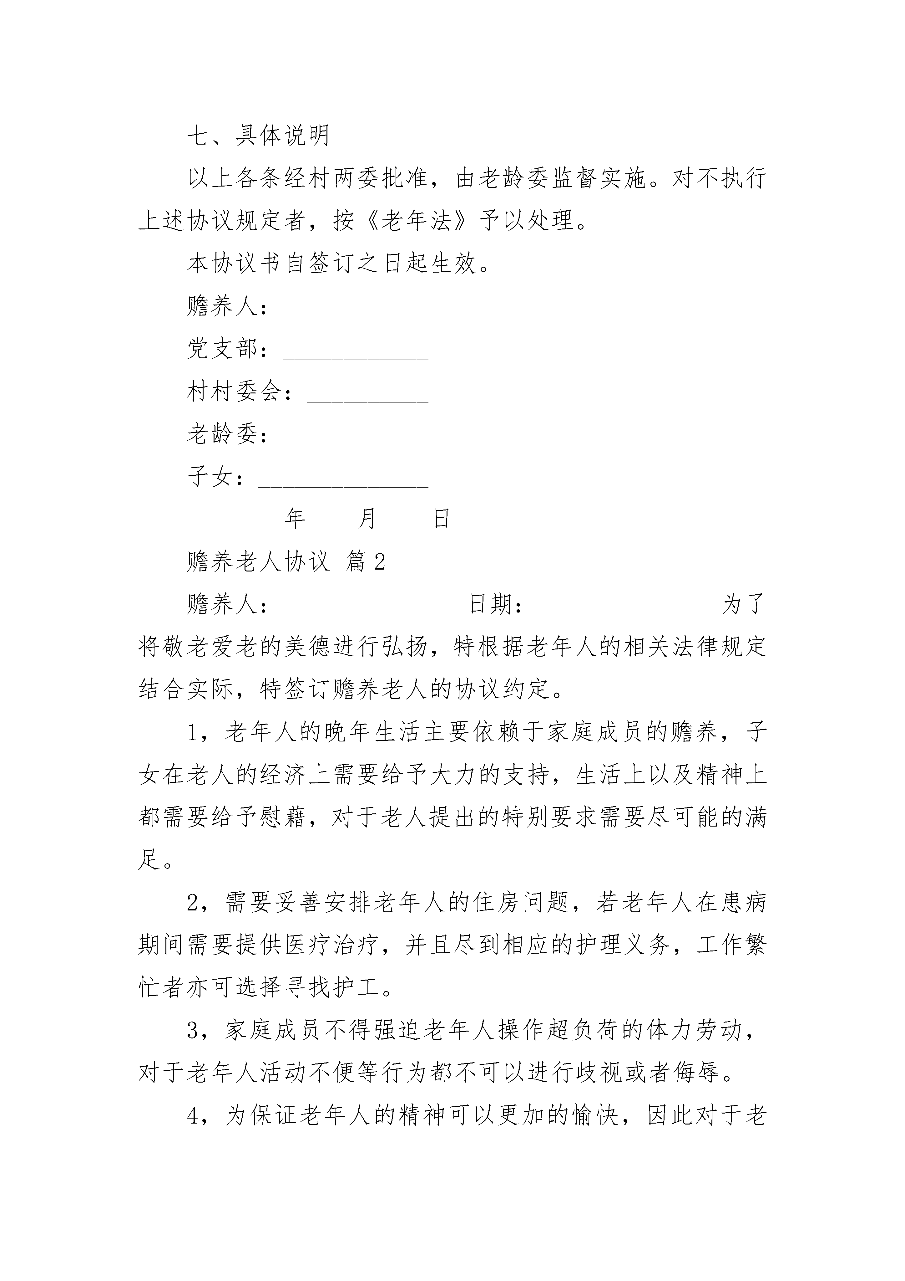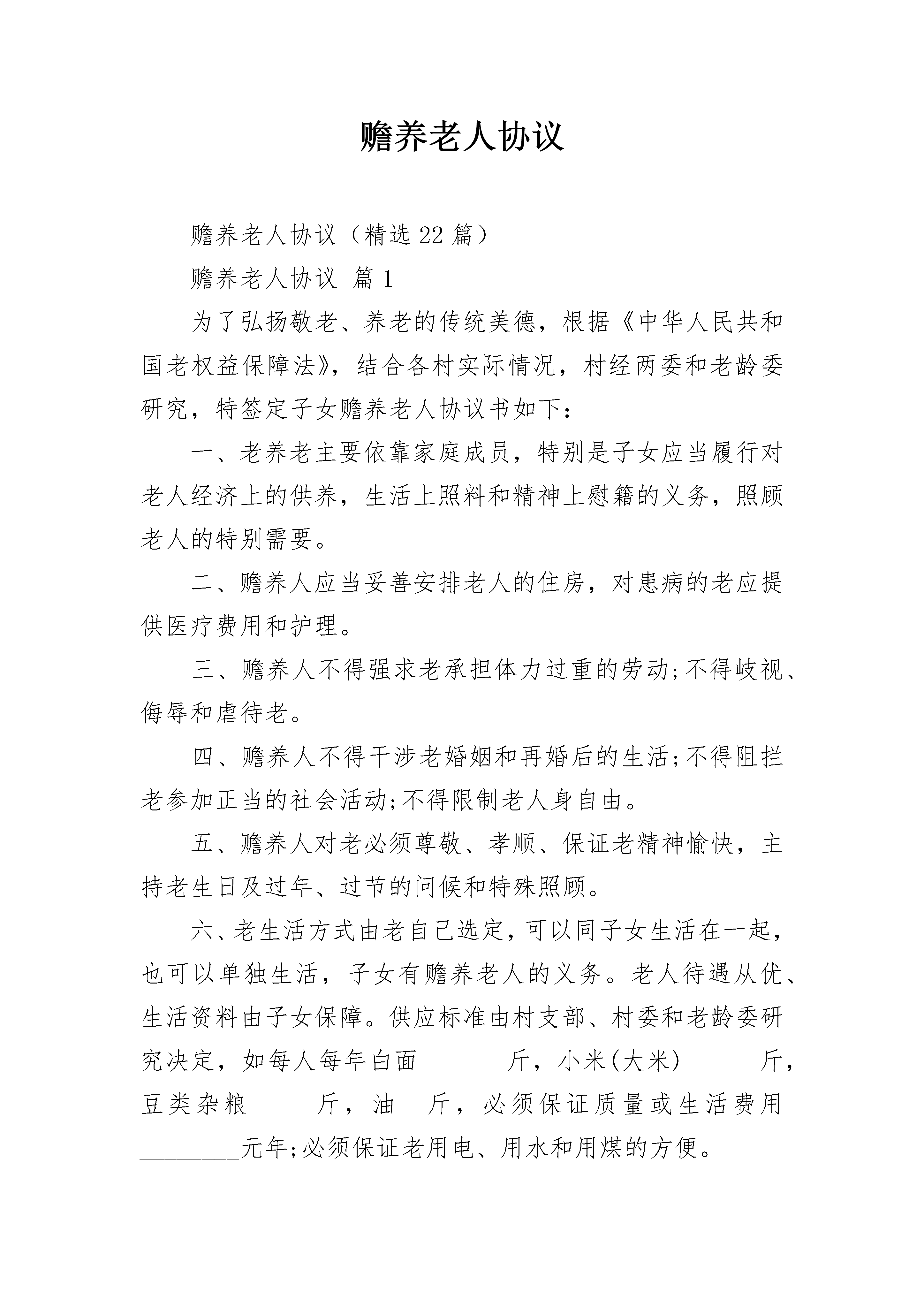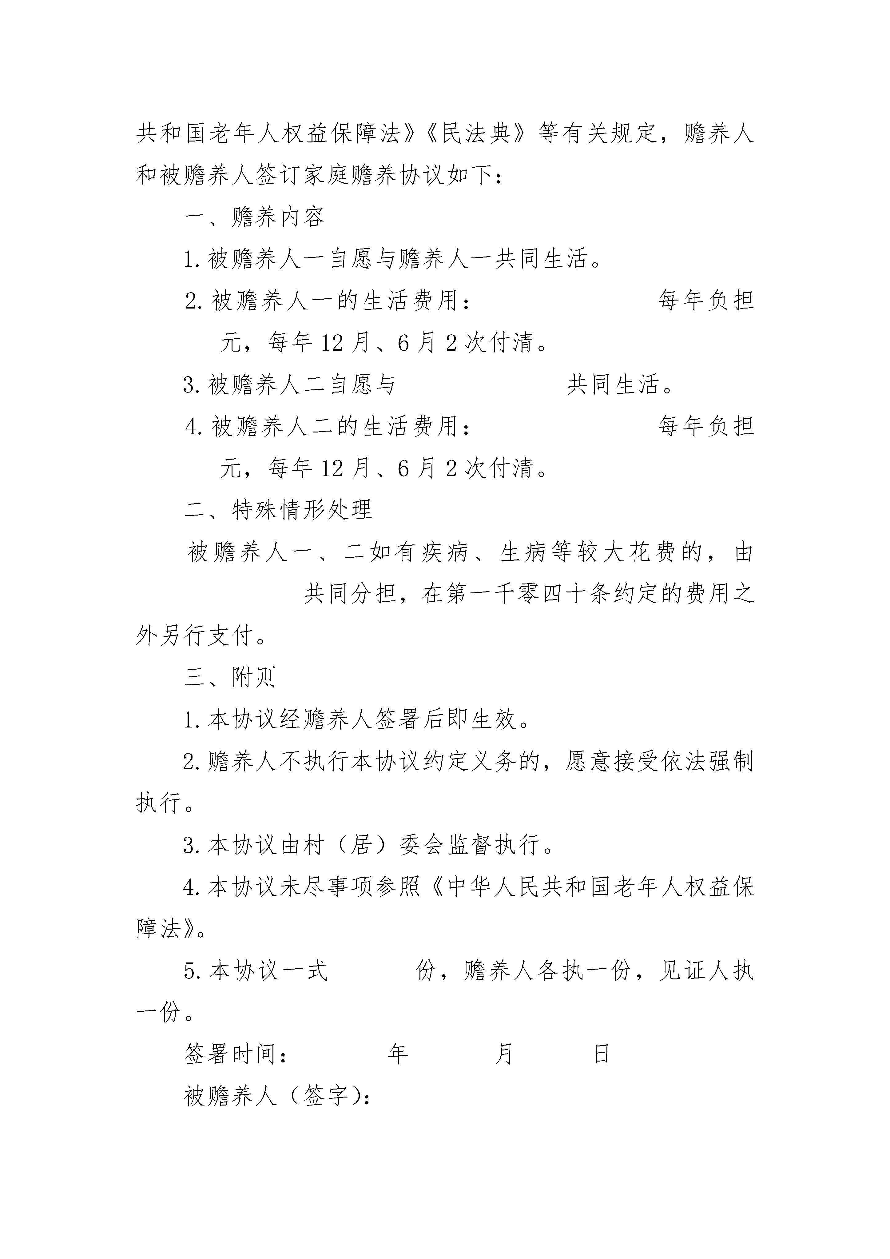 赡养老人协议赡养老人协议(精选22篇)赡养老人协议篇1为了弘扬敬老、养老的传统美德,根据《中华人民共和国老权益保障法》,结合各村实际情况,村经两委和老龄委研究,特签定子女赡养老人协议书如下:一、老养老主要依靠家庭成员,特别是子女应当履行对老人经济上的供养,生活上照料和精神上慰籍的义务,照顾老人的特别需要。二、赡养人应当妥善安排老人的住房,对患病的老应提供医疗费用和护理。三、赡养人不得强求老承担体力过重的劳动;不得岐视、侮辱和虐待老。四、赡养人不得干涉老婚姻和再婚后的生活;不得阻拦老参加正当的社会活动;不得限制老人身自由。五、赡养人对老必须尊敬、孝顺、保证老精神愉快,主持老生日及过年、过节的问候和特殊照顾。六、老生活方式由老自己选定,可以同子女生活在一起,也可以单独生活,子女有赡养老人的义务。老人待遇从优、生活资料由子女保障。供应标准由村支部、村委和老龄委研究决定,如每人每年白面_______斤,小米(大米)______斤,豆类杂粮_____斤,油__斤,必须保证质量或生活费用________元年;必须保证老用电、用水和用煤的方便。七、具体说明以上各条经村两委批准,由老龄委监督实施。对不执行上述协议规定者,按《老年法》予以处理。本协议书自签订之日起生效。赡养人:____________党支部:____________村村委会:__________老龄委:____________子女:______________________年____月____日赡养老人协议篇2赡养人:_______________日期:_______________为了将敬老爱老的美德进行弘扬,特根据老年人的相关法律规定结合实际,特签订赡养老人的协议约定。1,老年人的晚年生活主要依赖于家庭成员的赡养,子女在老人的经济上需要给予大力的支持,生活上以及精神上都需要给予慰藉,对于老人提出的特别要求需要尽可能的满足。2,需要妥善安排老年人的住房问题,若老年人在患病期间需要提供医疗治疗,并且尽到相应的护理义务,工作繁忙者亦可选择寻找护工。3,家庭成员不得强迫老年人操作超负荷的体力劳动,对于老年人活动不便等行为都不可以进行歧视或者侮辱。4,为保证老年人的精神可以更加的愉快,因此对于老年人需要保持一定的尊敬,并且在生日以及逢年过节都需要给予问候。5,若老年人需要再婚也要给予相应的尊重,家庭成员不得以任何理由拒绝老年人的再婚,老年人正当的社会活动也要给予支持,不得限制老年人的自由活动。6,老年人可以自由选择是和子女居住还是单独生活,若老年人选择单独生活也需要子女尽到赡养的义务,村委会每年提供白面斤以及小米斤给老人,并且保证给予老年人1年元作为生活费用。本协议在双方签字之后即可生效,若对于上述的协议不执行者,会按照老年法给予相应的处理。赡养人:__________________年___月___日赡养老人协议篇3赡养老人协议被赡养人一:被赡养人二:赡养人一:赡养人二:赡养人三:赡养人四:为维护老年人合法权益,弘扬中华民族尊老、敬老、养老传统美德,发挥家庭养老的基础作用,促进家庭和睦、和谐,切实保障老年人的晚年生活,根据《宪法》、《中华人民共和国老年人权益保障法》《民法典》等有关规定,赡养人和被赡养人签订家庭赡养协议如下:一、赡养内容1.被赡养人一自愿与赡养人一共同生活。2.被赡养人一的生活费用:每年负担元,每年12月、6月2次付清。3.被赡养人二自愿与共同生活。4.被赡养人二的生活费用:每年负担元,每年12月、6月2次付清。二、特殊情形处理被赡养人一、二如有疾病、生病等较大花费的,由共同分担,在第一千零四十条约定的费用之外另行支付。三、附则1.本协议经赡养人签署后即生效。2.赡养人不执行本协议约定义务的,愿意接受依法强制执行。3.本协议由村(居)委会监督执行。4.本协议未尽事项参照《中华人民共和国老年人权益保障法》。5.本协议一式份,赡养人各执一份,见证人执一份。签署时间:年月日被赡养人(签字):赡养人(签字):见证人(签字):赡养老人协议篇4根据《中华人民共和国老年人权益保障法》,结合各村实际情况,村经两委和老龄委研究,特签定子女赡养老人协议书如下:一、老年人养老主要依靠家庭成员,特别是子女应当履行对老人经济上的供养,生活上照料和精神上慰籍的义务,照顾老人的特别需要。二、赡养人应当妥善安排老人的住房,对患病的老年人应提供医疗费用和护理。三、赡养人不得强求老年人承担体力过重的劳动;不得岐视、侮辱和虐待老年人。四、赡养人不得干涉老年人的婚姻和再婚后的生活;不得阻拦老年人参加正当的社会活动;不得限制老年人的人身自由。五、赡养人对老年人必须尊敬、孝顺、保证老年人精神愉快,主持老年人的生日及