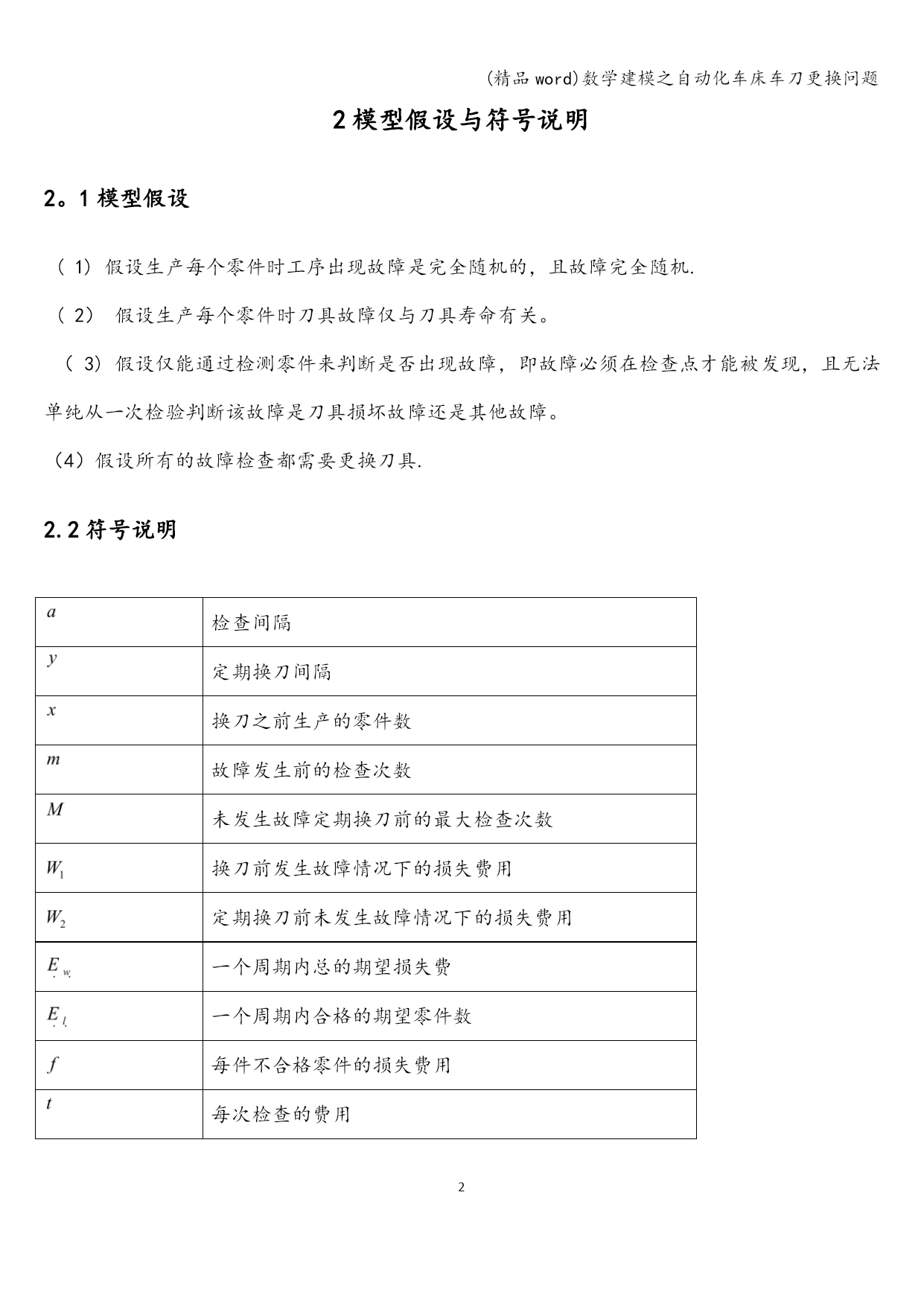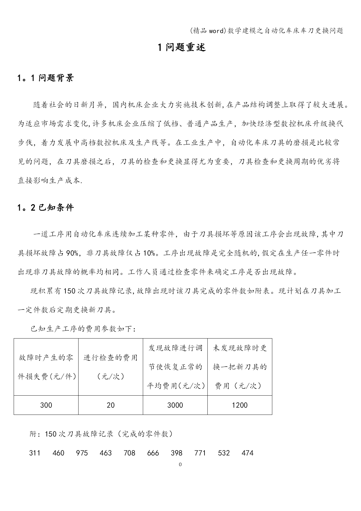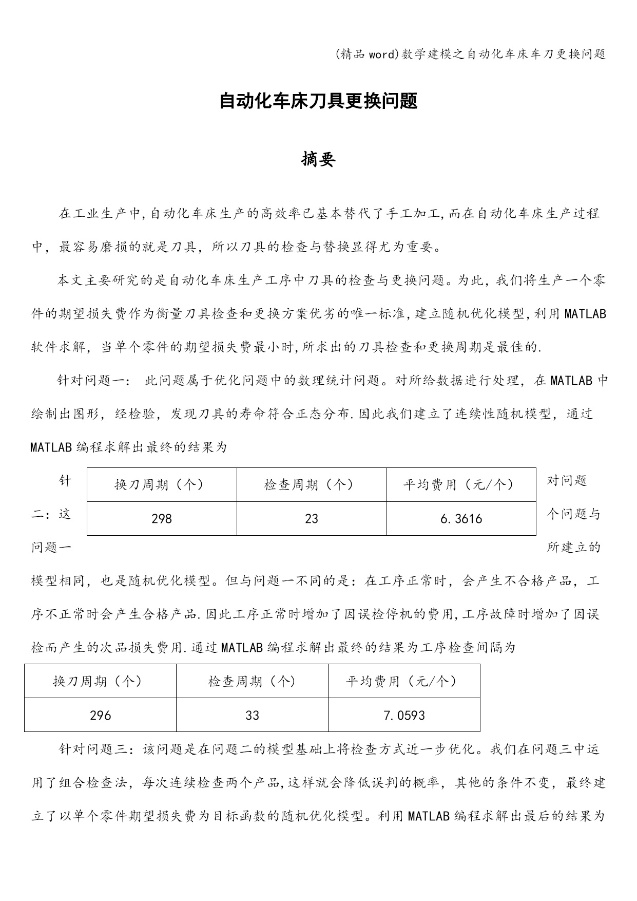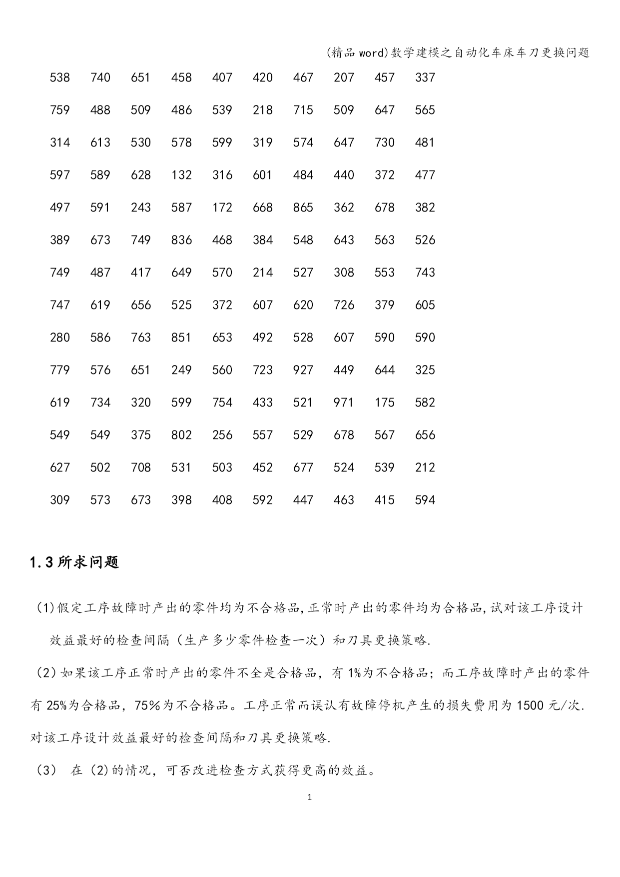 (精品word)数学建模之自动化车床车刀更换问题 (精品word)数学建模之自动化车床车刀更换问题 (精品word)数学建模之自动化车床车刀更换问题 自动化车床刀具更换问题 摘要 在工业生产中,自动化车床生产的高效率已基本替代了手工加工,而在自动化车床生产过程中,最容易磨损的就是刀具,所以刀具的检查与替换显得尤为重要。 本文主要研究的是自动化车床生产工序中刀具的检查与更换问题。为此,我们将生产一个零件的期望损失费作为衡量刀具检查和更换方案优劣的唯一标准,建立随机优化模型,利用MATLAB软件求解,当单个零件的期望损失费最小时,所求出的刀具检查和更换周期是最佳的. 针对问题一:此问题属于优化问题中的数理统计问题。对所给数据进行处理,在MATLAB中绘制出图形,经检验,发现刀具的寿命符合正态分布.因此我们建立了连续性随机模型,通过MATLAB编程求解出最终的结果为 换刀周期(个)检查周期(个)平均费用(元/个)298236.3616针对问题二:这个问题与问题一所建立的模型相同,也是随机优化模型。但与问题一不同的是:在工序正常时,会产生不合格产品,工序不正常时会产生合格产品.因此工序正常时增加了因误检停机的费用,工序故障时增加了因误检而产生的次品损失费用.通过MATLAB编程求解出最终的结果为工序检查间隔为 换刀周期(个)检查周期(个)平均费用(元/个)296337.0593针对问题三:该问题是在问题二的模型基础上将检查方式近一步优化。我们在问题三中运用了组合检查法,每次连续检查两个产品,这样就会降低误判的概率,其他的条件不变,最终建立了以单个零件期望损失费为目标函数的随机优化模型。利用MATLAB编程求解出最后的结果为 换刀周期(个)检查周期(个)平均费用(元/个)278316。9932 关键词:数理统计正态分布随机优化模型 1问题重述 1。1问题背景 随着社会的日新月异,国内机床企业大力实施技术创新,在产品结构调整上取得了较大进展。为适应市场需求变化,许多机床企业压缩了低档、普通产品生产,加快经济型数控机床升级换代步伐,着力发展中高档数控机床及生产线等。在工业生产中,自动化车床刀具的磨损是比较常见的问题,在刀具磨损之后,刀具的检查和更换显得尤为重要,刀具检查和更换周期的优劣将直接影响生产成本. 1。2已知条件 一道工序用自动化车床连续加工某种零件,由于刀具损坏等原因该工序会出现故障,其中刀具损坏故障占90%,非刀具故障仅占10%。工序出现故障是完全随机的,假定在生产任一零件时出现非刀具故障的概率均相同。工作人员通过检查零件来确定工序是否出现故障。 现积累有150次刀具故障记录,故障出现时该刀具完成的零件数如附表。现计划在刀具加工一定件数后定期更换新刀具。 已知生产工序的费用参数如下: 故障时产生的零件损失费(元/件) 进行检查的费用 (元/次)发现故障进行调节使恢复正常的平均费用(元/次)未发现故障时更换一把新刀具的费用(元/次)3002030001200 附:150次刀具故障记录(完成的零件数) 311460975463708666398771532474 538740651458407420467207457337 759488509486539218715509647565 314613530578599319574647730481 597589628132316601484440372477 497591243587172668865362678382 389673749836468384548643563526 749487417649570214527308553743 747619656525372607620726379605 280586763851653492528607590590 779576651249560723927449644325 619734320599754433521971175582 549549375802256557529678567656 627502708531503452677524539212 309573673398408592447463415594 1.3所求问题 (1)假定工序故障时产出的零件均为不合格品,正常时产出的零件均为合格品,试对该工序设计效益最好的检查间隔(生产多少零件检查一次)和刀具更换策略. (2)如果该工序正常时产出的零件不全是合格品,有1%为不合格品;而工序故障时产出的零件有25%为合格品,75%为不合格品。工序正常而误认有故障停机产生的损失费用为1500元/次.对该工序设计效益最好的检查间隔和刀具更换策略. (3)在(2)的情况,可否改进检查方式获得更高的效益。 2模型假设与符号说明 2。1模型假设 (1)假设生产