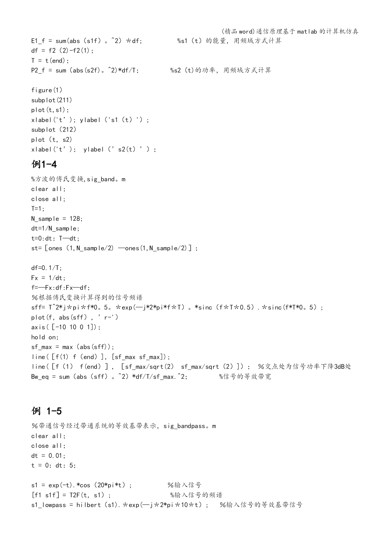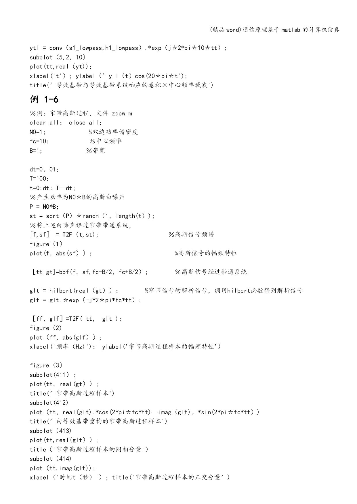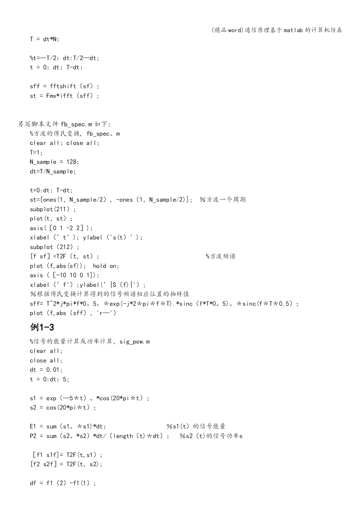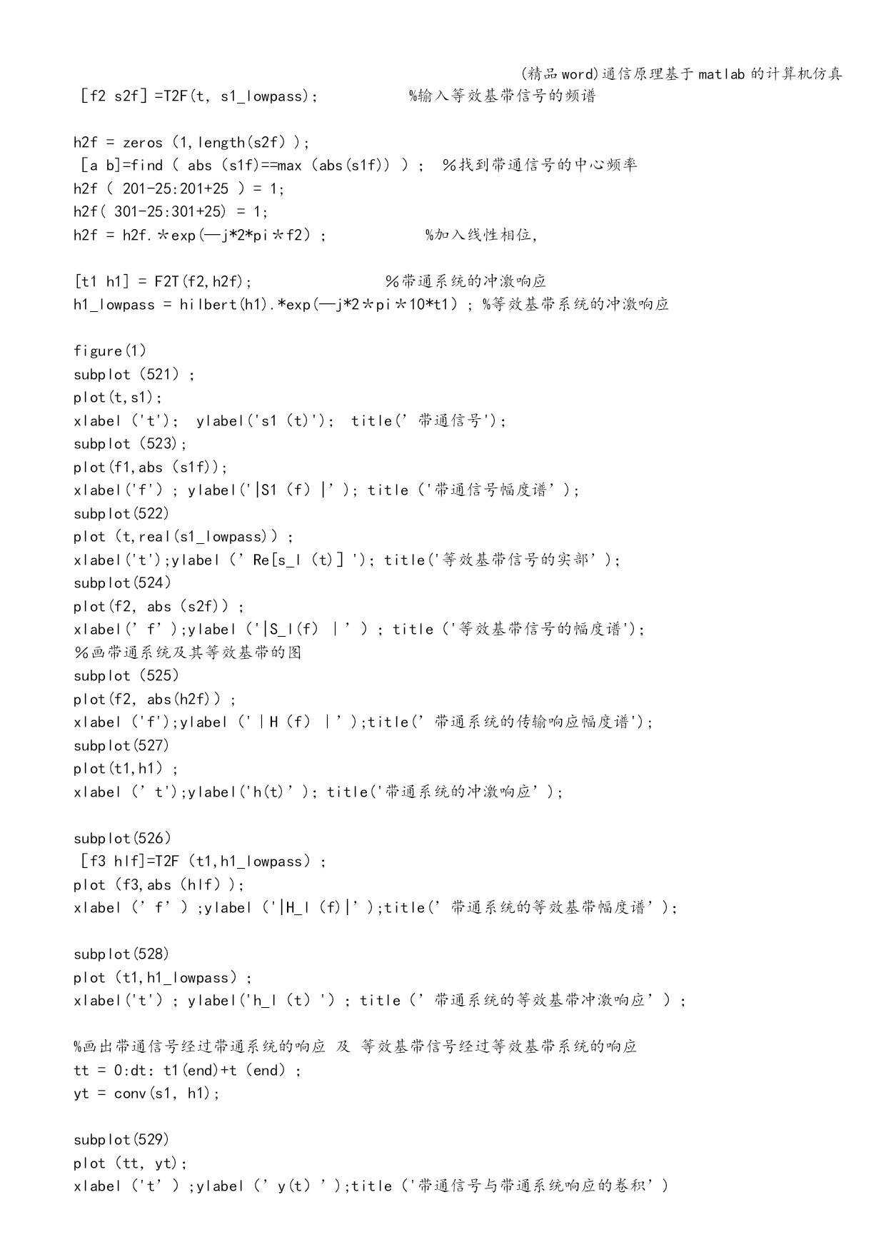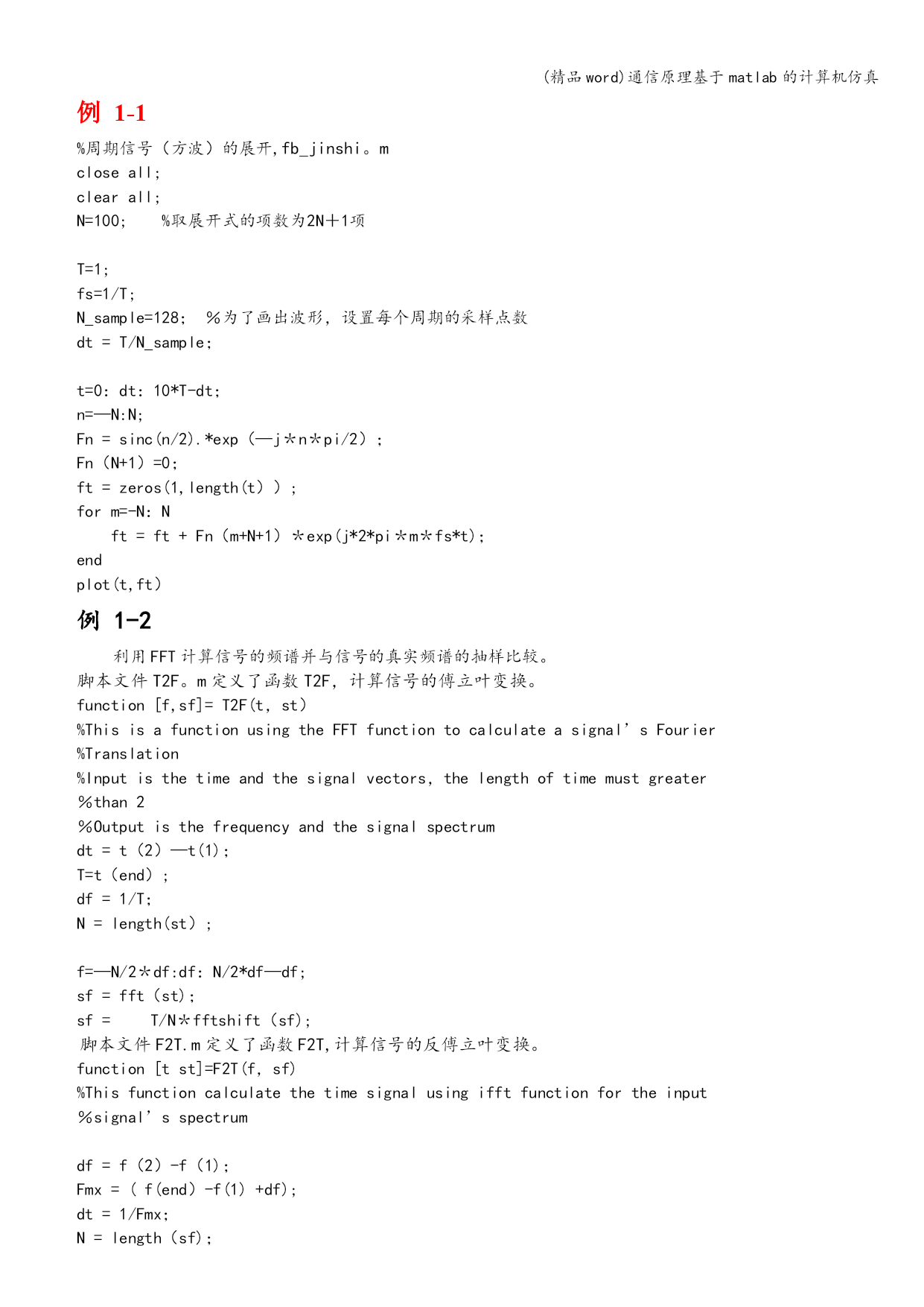 (精品word)通信原理基于matlab的计算机仿真 (精品word)通信原理基于matlab的计算机仿真 (精品word)通信原理基于matlab的计算机仿真 例1SEQ例\*ARABIC\s11 %周期信号(方波)的展开,fb_jinshi。m closeall; clearall; N=100;%取展开式的项数为2N+1项 T=1; fs=1/T; N_sample=128;%为了画出波形,设置每个周期的采样点数 dt=T/N_sample; t=0:dt:10*T-dt; n=—N:N; Fn=sinc(n/2).*exp(—j*n*pi/2); Fn(N+1)=0; ft=zeros(1,length(t)); form=-N:N ft=ft+Fn(m+N+1)*exp(j*2*pi*m*fs*t); end plot(t,ft) 例12 利用FFT计算信号的频谱并与信号的真实频谱的抽样比较。 脚本文件T2F。m定义了函数T2F,计算信号的傅立叶变换。 function[f,sf]=T2F(t,st) %ThisisafunctionusingtheFFTfunctiontocalculateasignal’sFourier %Translation %Inputisthetimeandthesignalvectors,thelengthoftimemustgreater %than2 %Outputisthefrequencyandthesignalspectrum dt=t(2)—t(1); T=t(end); df=1/T; N=length(st); f=—N/2*df:df:N/2*df—df; sf=fft(st); sf= T/N*fftshift(sf); 脚本文件F2T.m定义了函数F2T,计算信号的反傅立叶变换。 function[tst]=F2T(f,sf) %Thisfunctioncalculatethetimesignalusingifftfunctionfortheinput %signal’sspectrum df=f(2)-f(1); Fmx=(f(end)-f(1)+df); dt=1/Fmx; N=length(sf); T=dt*N; %t=—T/2:dt:T/2—dt; t=0:dt:T-dt; sff=fftshift(sf); st=Fmx*ifft(sff); 另写脚本文件fb_spec.m如下: %方波的傅氏变换,fb_spec。m clearall;closeall; T=1; N_sample=128; dt=T/N_sample; t=0:dt:T-dt; st=[ones(1,N_sample/2),-ones(1,N_sample/2)];%方波一个周期 subplot(211); plot(t,st); axis([01-22]); xlabel(’t’);ylabel('s(t)’); subplot(212); [fsf]=T2F(t,st);%方波频谱 plot(f,abs(sf));holdon; axis([-101001]); xlabel(’f');ylabel(’|S(f)|'); %根据傅氏变换计算得到的信号频谱相应位置的抽样值 sff=T^2*j*pi*f*0。5。*exp(-j*2*pi*f*T).*sinc(f*T*0。5)。*sinc(f*T*0.5); plot(f,abs(sff),'r—') 例13 %信号的能量计算或功率计算,sig_pow.m clearall; closeall; dt=0.01; t=0:dt:5; s1=exp(—5*t)。*cos(20*pi*t); s2=cos(20*pi*t); E1=sum(s1。*s1)*dt;%s1(t)的信号能量 P2=sum(s2。*s2)*dt/(length(t)*dt);%s2(t)的信号功率s [f1s1f]=T2F(t,s1); [f2s2f]=T2F(t,s2); df=f1(2)-f1(1); E1_f=sum(abs(s1f)。^2)*df;%s1(t)的能量,用频域方式计算 df=f2(2)-f2(1); T=t(end); P2_f=sum(abs(s2f)。^2)*df/T;%s2(t)的功率,用频域方式计算 figure(1) subplot(211) plot(t,s1); xlabel('t’);ylabel('s1(t)'); subplot(212) plot(t,s2) xlabel('t’);ylabel(’s2(t)’); 例14 %方波的傅氏变换,sig_band。m cl