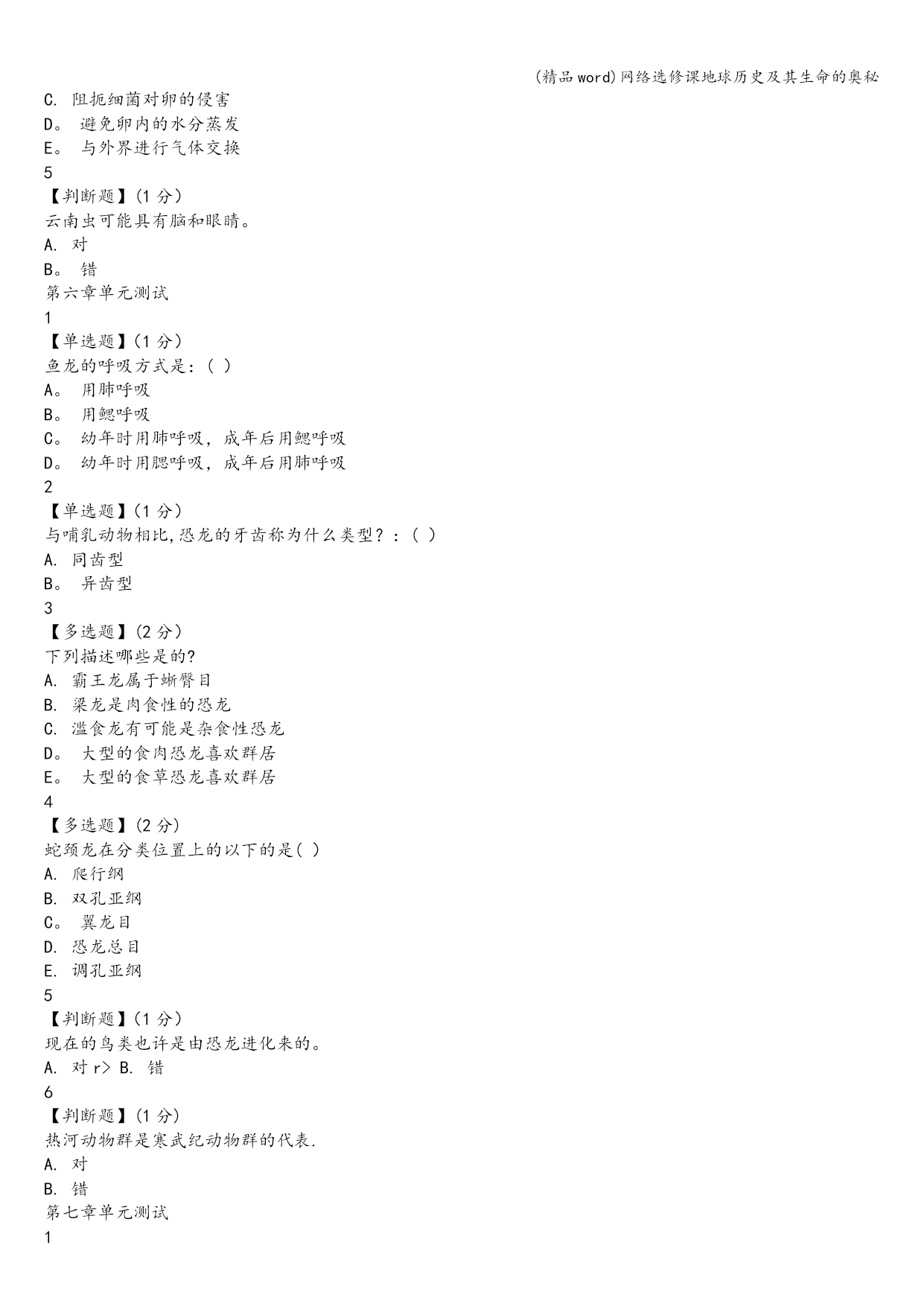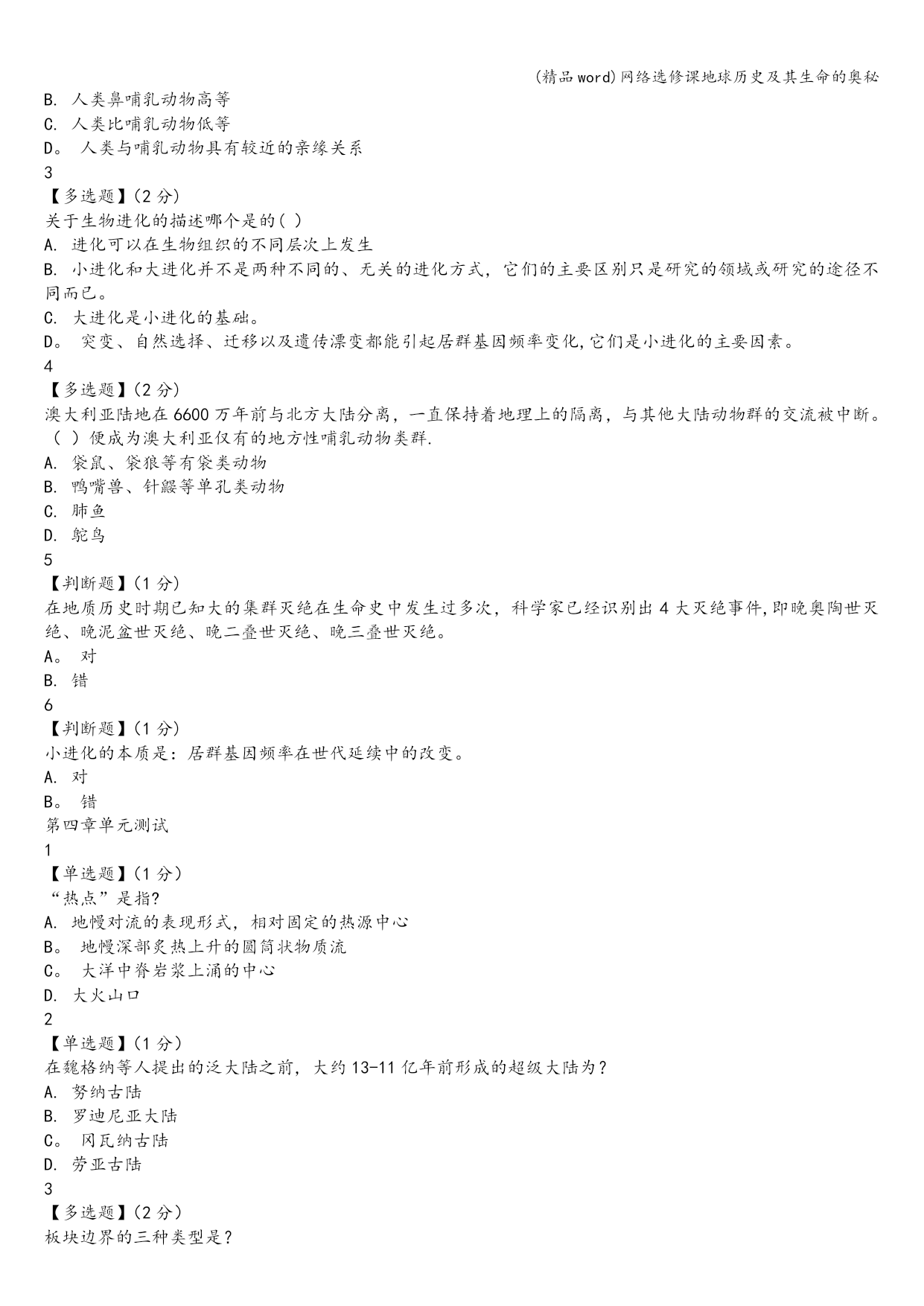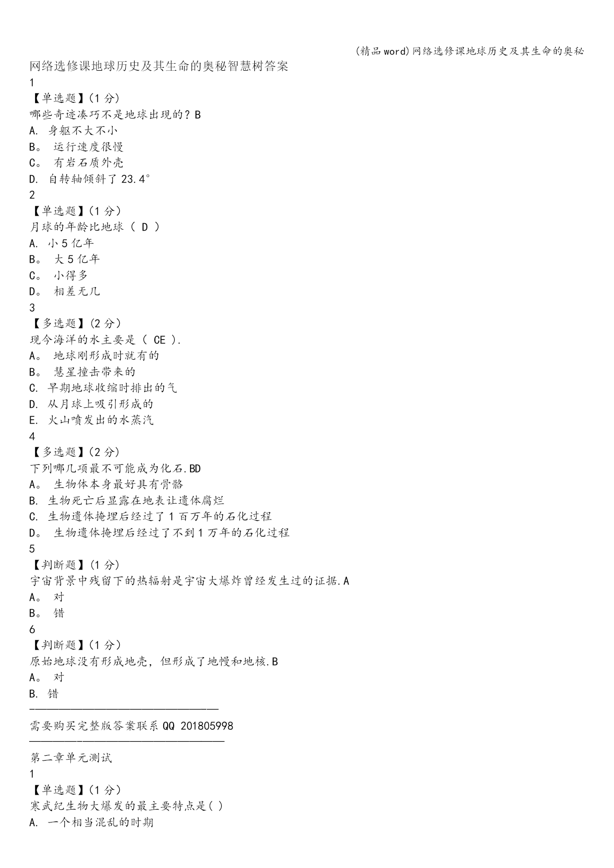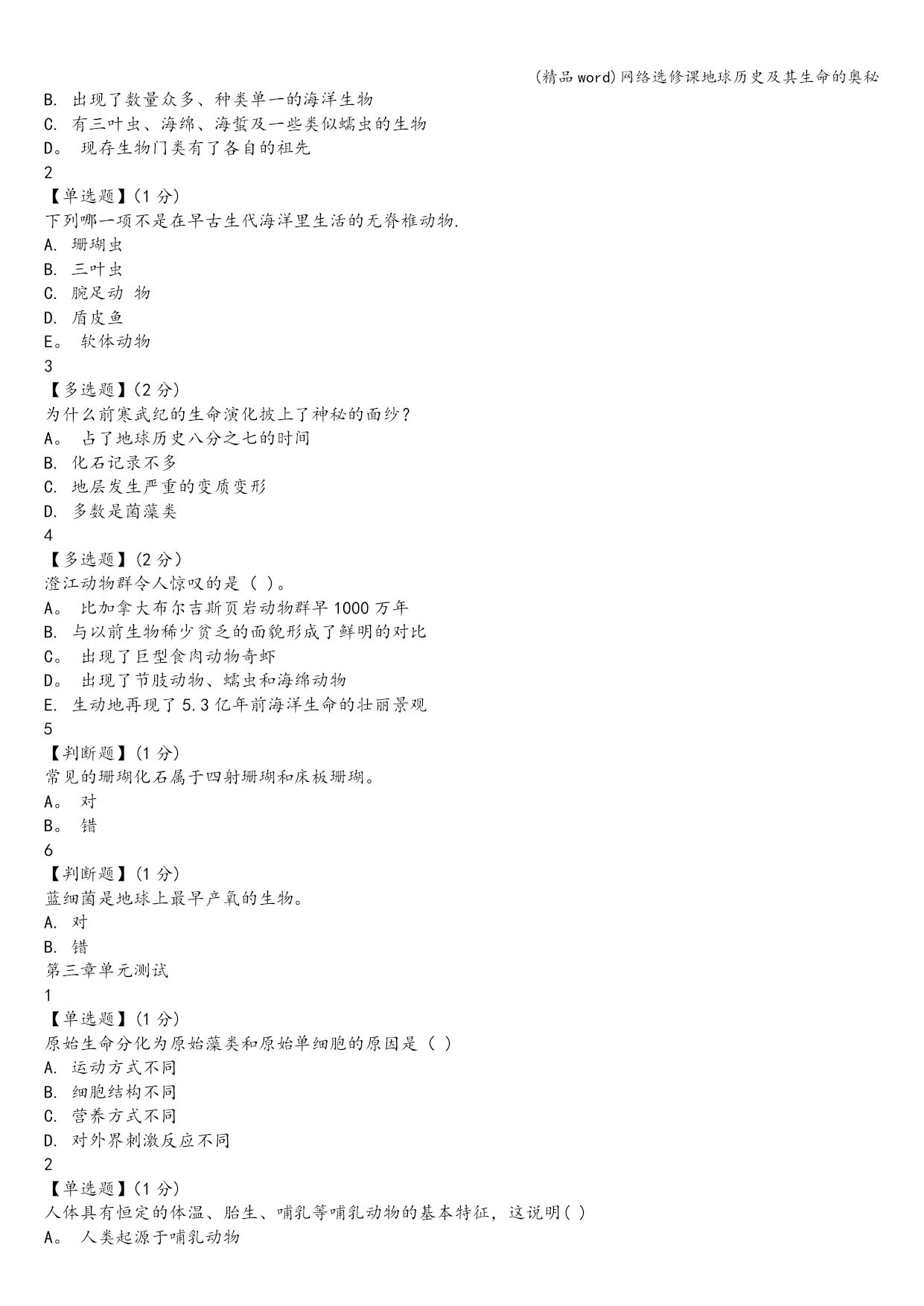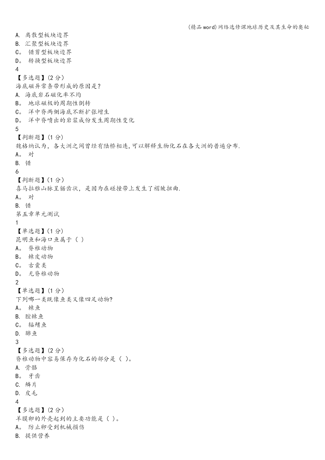 (精品word)网络选修课地球历史及其生命的奥秘 (精品word)网络选修课地球历史及其生命的奥秘 (精品word)网络选修课地球历史及其生命的奥秘 网络选修课地球历史及其生命的奥秘智慧树答案 1 【单选题】(1分) 哪些奇迹凑巧不是地球出现的?B A.身躯不大不小 B。运行速度很慢 C。有岩石质外壳 D.自转轴倾斜了23.4° 2 【单选题】(1分) 月球的年龄比地球(D) A.小5亿年 B。大5亿年 C。小得多 D。相差无几 3 【多选题】(2分) 现今海洋的水主要是(CE). A。地球刚形成时就有的 B。慧星撞击带来的 C.早期地球收缩时排出的气 D.从月球上吸引形成的 E.火山喷发出的水蒸汽 4 【多选题】(2分) 下列哪几项最不可能成为化石.BD A。生物体本身最好具有骨骼 B.生物死亡后显露在地表让遗体腐烂 C.生物遗体掩埋后经过了1百万年的石化过程 D。生物遗体掩埋后经过了不到1万年的石化过程 5 【判断题】(1分) 宇宙背景中残留下的热辐射是宇宙大爆炸曾经发生过的证据.A A。对 B。错 6 【判断题】(1分) 原始地球没有形成地壳,但形成了地幔和地核.B A。对 B.错 -——————————————-— 需要购买完整版答案联系QQ201805998 ————-———————————— 第二章单元测试 1 【单选题】(1分) 寒武纪生物大爆发的最主要特点是() A.一个相当混乱的时期 B.出现了数量众多、种类单一的海洋生物 C.有三叶虫、海绵、海蜇及一些类似蠕虫的生物 D。现存生物门类有了各自的祖先 2 【单选题】(1分) 下列哪一项不是在早古生代海洋里生活的无脊椎动物. A.珊瑚虫 B.三叶虫 C.腕足动物 D.盾皮鱼 E。软体动物 3 【多选题】(2分) 为什么前寒武纪的生命演化披上了神秘的面纱? A。占了地球历史八分之七的时间 B.化石记录不多 C.地层发生严重的变质变形 D.多数是菌藻类 4 【多选题】(2分) 澄江动物群令人惊叹的是()。 A。比加拿大布尔吉斯页岩动物群早1000万年 B.与以前生物稀少贫乏的面貌形成了鲜明的对比 C。出现了巨型食肉动物奇虾 D。出现了节肢动物、蠕虫和海绵动物 E.生动地再现了5.3亿年前海洋生命的壮丽景观 5 【判断题】(1分) 常见的珊瑚化石属于四射珊瑚和床板珊瑚。 A。对 B。错 6 【判断题】(1分) 蓝细菌是地球上最早产氧的生物。 A.对 B.错 第三章单元测试 1 【单选题】(1分) 原始生命分化为原始藻类和原始单细胞的原因是() A.运动方式不同 B.细胞结构不同 C.营养方式不同 D.对外界刺激反应不同 2 【单选题】(1分) 人体具有恒定的体温、胎生、哺乳等哺乳动物的基本特征,这说明() A。人类起源于哺乳动物 B.人类鼻哺乳动物高等 C.人类比哺乳动物低等 D。人类与哺乳动物具有较近的亲缘关系 3 【多选题】(2分) 关于生物进化的描述哪个是的() A.进化可以在生物组织的不同层次上发生 B.小进化和大进化并不是两种不同的、无关的进化方式,它们的主要区别只是研究的领域或研究的途径不同而已。 C.大进化是小进化的基础。 D。突变、自然选择、迁移以及遗传漂变都能引起居群基因频率变化,它们是小进化的主要因素。 4 【多选题】(2分) 澳大利亚陆地在6600万年前与北方大陆分离,一直保持着地理上的隔离,与其他大陆动物群的交流被中断。()便成为澳大利亚仅有的地方性哺乳动物类群. A.袋鼠、袋狼等有袋类动物 B.鸭嘴兽、针鼹等单孔类动物 C.肺鱼 D.鸵鸟 5 【判断题】(1分) 在地质历史时期已知大的集群灭绝在生命史中发生过多次,科学家已经识别出4大灭绝事件,即晚奥陶世灭绝、晚泥盆世灭绝、晚二叠世灭绝、晚三叠世灭绝。 A。对 B.错 6 【判断题】(1分) 小进化的本质是:居群基因频率在世代延续中的改变。 A.对 B。错 第四章单元测试 1 【单选题】(1分) “热点”是指? A.地幔对流的表现形式,相对固定的热源中心 B。地幔深部炙热上升的圆筒状物质流 C。大洋中脊岩浆上涌的中心 D.大火山口 2 【单选题】(1分) 在魏格纳等人提出的泛大陆之前,大约13-11亿年前形成的超级大陆为? A.努纳古陆 B.罗迪尼亚大陆 C。冈瓦纳古陆 D.劳亚古陆 3 【多选题】(2分) 板块边界的三种类型是? A.离散型板块边界 B.汇聚型板块边界 C。错剪型板块边界 D。转换型板块边界 4 【多选题】(2分) 海底磁异常条带形成的原因是? A.海底岩石磁化率不均 B。地球磁极的周期性倒转 C。洋中脊两侧海底不断扩张增生 D。洋中脊喷出的岩浆成份发生周期性变化 5 【判断题】(1分) 魏格纳认为,各大洲之间曾经有陆桥相连,可以解释生物化石在各大洲的普遍分布. A。对 B.