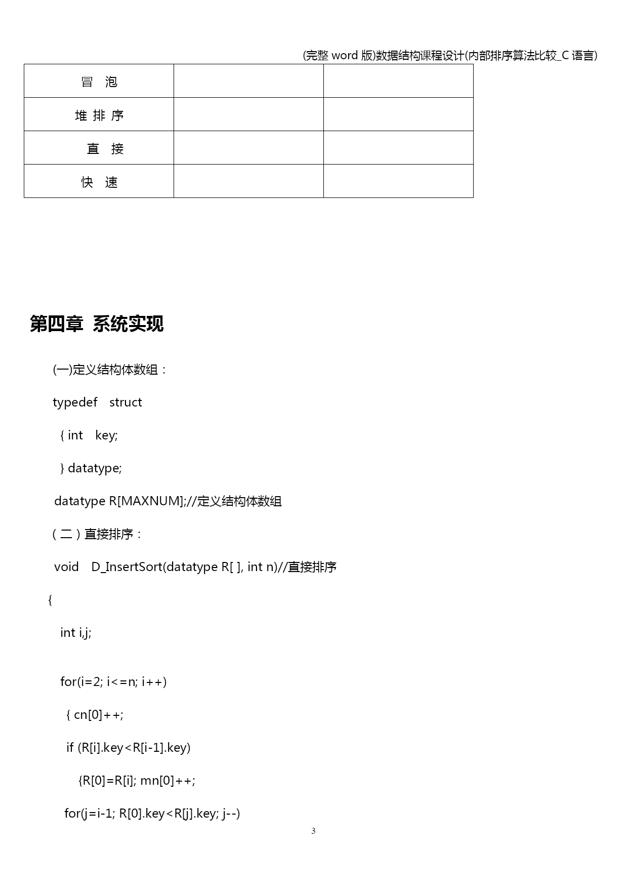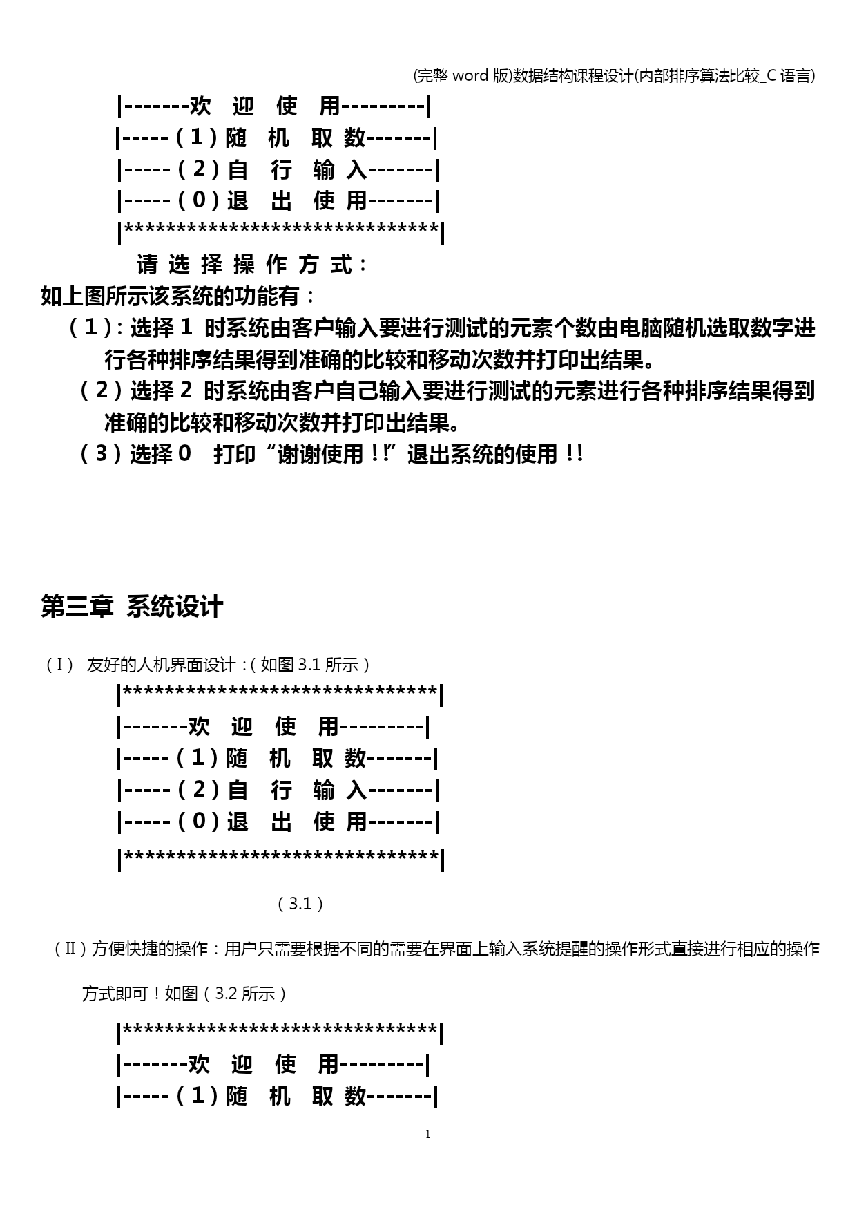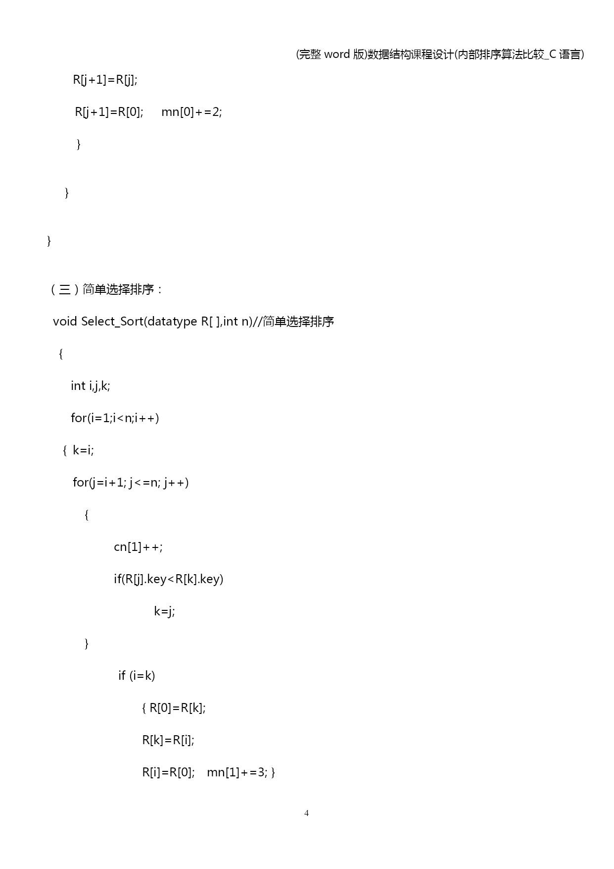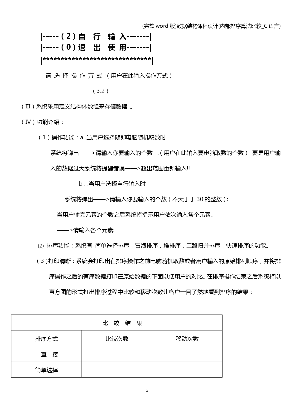 (完整word版)数据结构课程设计(内部排序算法比较_C语言) (完整word版)数据结构课程设计(内部排序算法比较_C语言) 框架三层,局部为二层钢构。本工程外脚手架采用落地式钢管脚手架,外架随主体结构上升,同步搭设,比操作面高出一步,确保主体及外装修的正常安全施工。 框架三层,局部为二层钢构。本工程外脚手架采用落地式钢管脚手架,外架随主体结构上升,同步搭设,比操作面高出一步,确保主体及外装修的正常安全施工。 (完整word版)数据结构课程设计(内部排序算法比较_C语言) 框架三层,局部为二层钢构。本工程外脚手架采用落地式钢管脚手架,外架随主体结构上升,同步搭设,比操作面高出一步,确保主体及外装修的正常安全施工。 课题:内部排序算法比较 第一章问题描述 排序是数据结构中重要的一个部分,也是在实际开发中易遇到的问题,所以研究各种排算法的时间消耗对于在实际应用当中很有必要通过分析实际结合算法的特性进行选择和使用哪种算法可以使实际问题得到更好更充分的解决!该系统通过对各种内部排序算法如直接插入排序,冒泡排序,简单选择排序,快速排序,希尔排序,堆排序、二路归并排序等,以关键码的比较次数和移动次数分析其特点,并进行比较,估算每种算法的时间消耗,从而比较各种算法的优劣和使用情况!排序表的数据是多种不同的情况,如随机产生数据、极端的数据如已是正序或逆序数据。比较的结果用一个直方图表示。 第二章系统分析 界面的设计如图所示: |******************************| |-------欢迎使用---------| |-----(1)随机取数-------| |-----(2)自行输入-------| |-----(0)退出使用-------| |******************************| 请选择操作方式: 如上图所示该系统的功能有: (1):选择1时系统由客户输入要进行测试的元素个数由电脑随机选取数字进行各种排序结果得到准确的比较和移动次数并打印出结果。 (2)选择2时系统由客户自己输入要进行测试的元素进行各种排序结果得到准确的比较和移动次数并打印出结果。 (3)选择0打印“谢谢使用!!”退出系统的使用!! 第三章系统设计 (I)友好的人机界面设计:(如图3.1所示) |******************************| |-------欢迎使用---------| |-----(1)随机取数-------| |-----(2)自行输入-------| |-----(0)退出使用-------| |******************************| (3.1) (II)方便快捷的操作:用户只需要根据不同的需要在界面上输入系统提醒的操作形式直接进行相应的操作方式即可!如图(3.2所示) |******************************| |-------欢迎使用---------| |-----(1)随机取数-------| |-----(2)自行输入-------| |-----(0)退出使用-------| |******************************| 请选择操作方式:(用户在此输入操作方式) (3.2) (III)系统采用定义结构体数组来存储数据。 (IV)功能介绍: (1)操作功能:a.当用户选择随即电脑随机取数时 系统将弹出——>请输入你要输入的个数:(用户在此输入要电脑取数的个数)要是用户输入的数据过大系统将提醒错误——>超出范围重新输入!!! b..当用户选择自行输入时 系统将弹出——>请输入你要输入的个数(不大于于30的整数): 当用户输完元素的个数之后系统将提示用户依次输入各个元素。 ——>请输入各个元素: 排序功能:系统有简单选择排序,冒泡排序,堆排序,二路归并排序,快速排序的功能。 (3)打印清晰:系统会打印出在排序操作之前电脑随机取数或者用户输入的原始排列顺序;并将排序操作之后的有序数据打印在原始数据的下面以便用户的对比。在排序操作结束之后系统将以直方图的形式打出排序过程中比较和移动次数让客户一目了然地看到排序的结果: 比较结果排序方式比较次数移动次数直接简单选择冒泡堆排序直接快速 第四章系统实现 (一)定义结构体数组: typedefstruct {intkey; }datatype; datatypeR[MAXNUM];//定义结构体数组 (二)直接排序: voidD_InsertSort(datatypeR[],intn)//直接排序 { inti,j; for(i=2;i<=n;i++) {cn[0]++; if(R[i].key<R[i-1].key) {R[0]=R