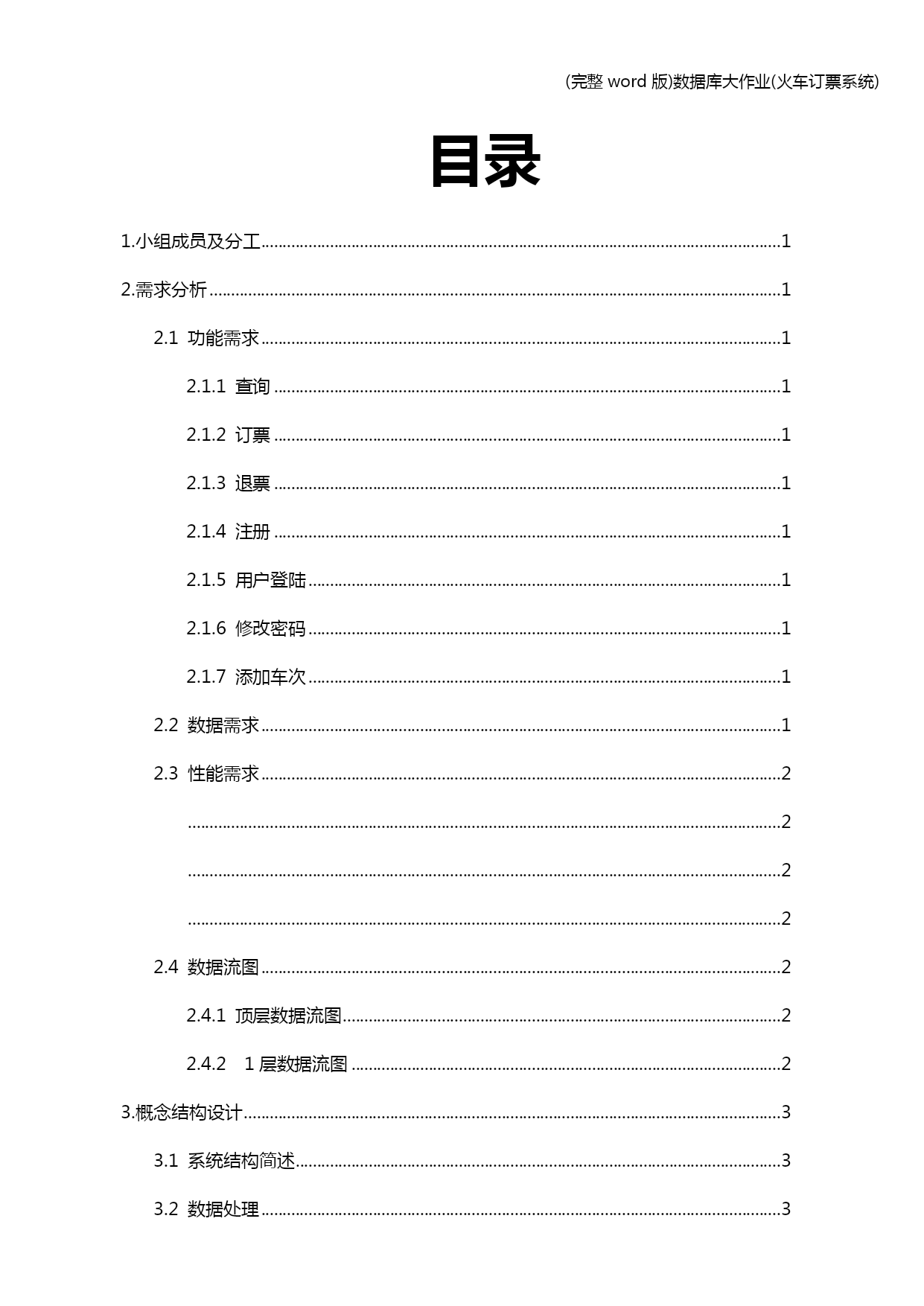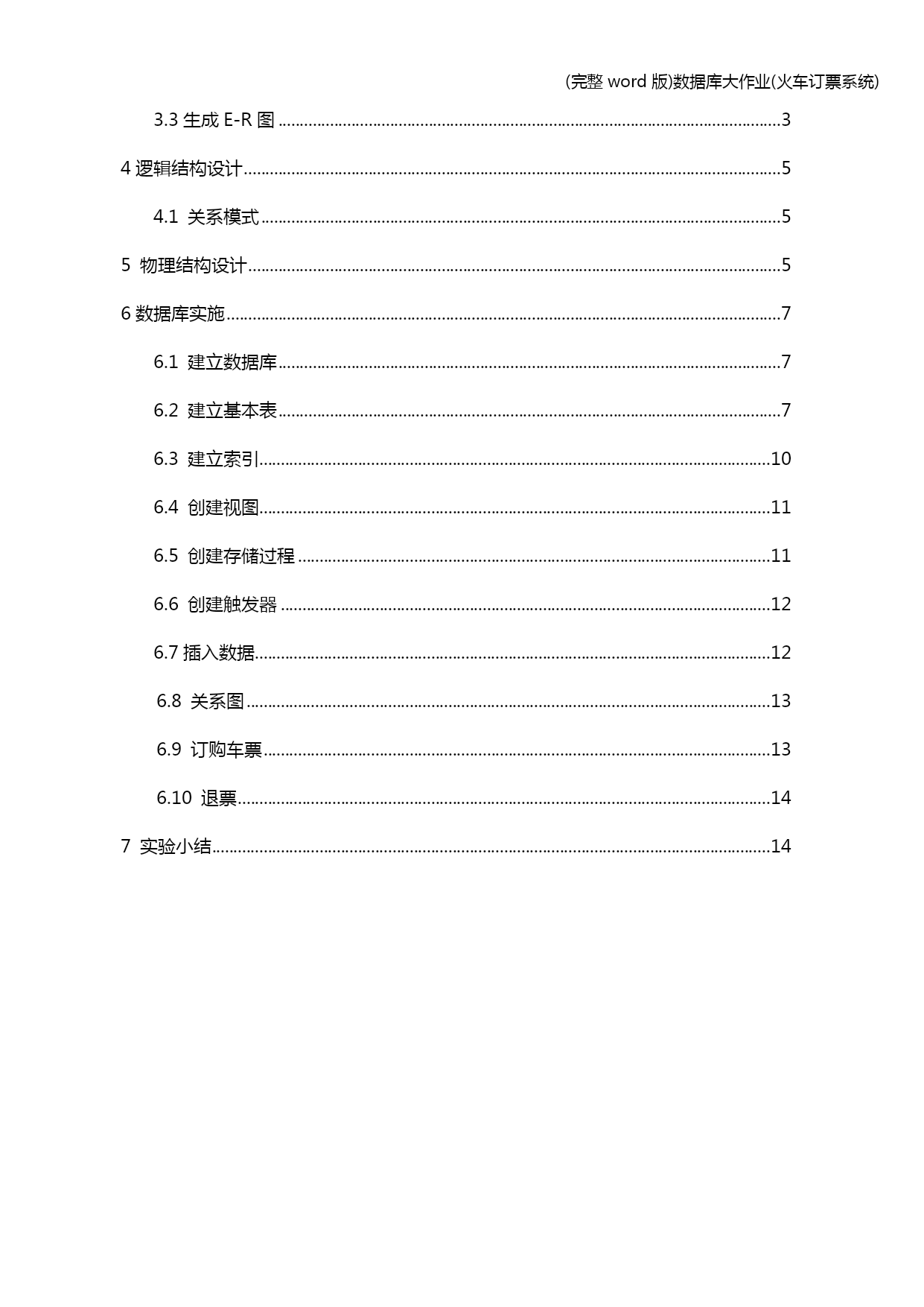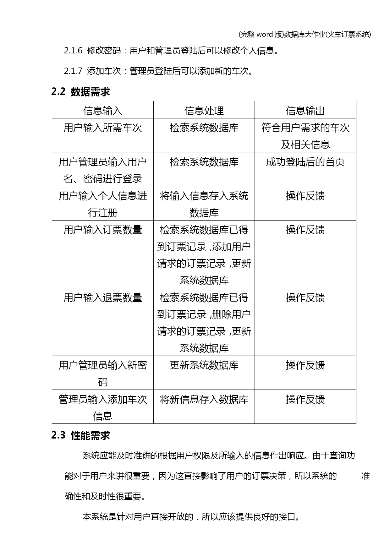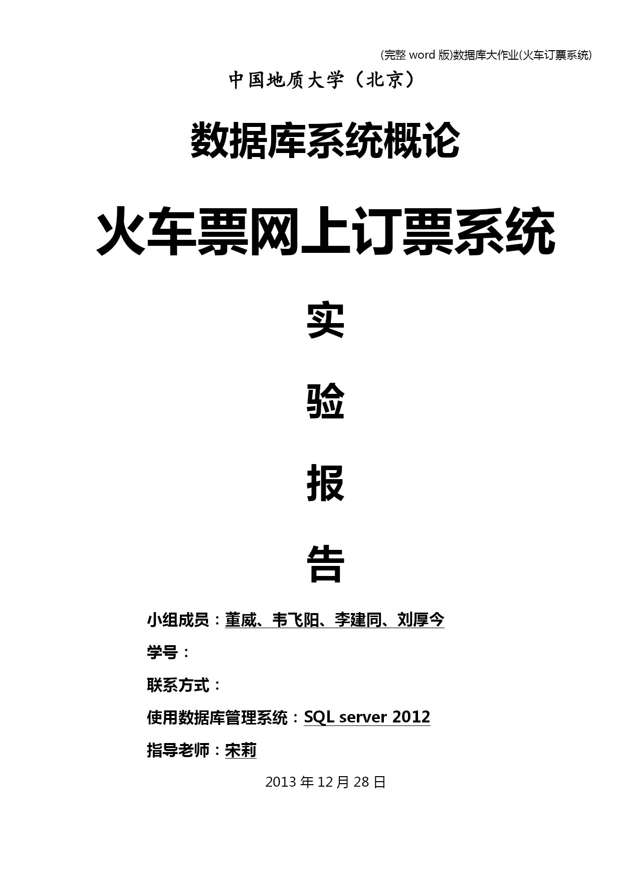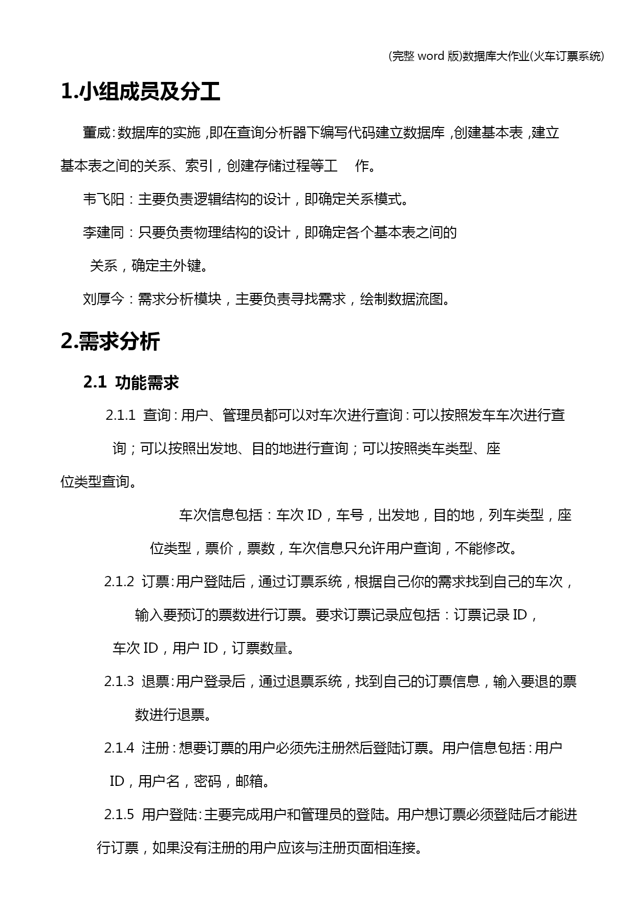 (完整word版)数据库大作业(火车订票系统) (完整word版)数据库大作业(火车订票系统) (完整word版)数据库大作业(火车订票系统) 中国地质大学(北京) 数据库系统概论 火车票网上订票系统 实 验 报 告 小组成员:董威、韦飞阳、李建同、刘厚今 学号: 联系方式: 使用数据库管理系统:SQLserver2012 指导老师:宋莉 2013年12月28日目录 HYPERLINK\l_Toc205031.小组成员及分工 PAGEREF_Toc205031 HYPERLINK\l_Toc312462.需求分析 PAGEREF_Toc312461 HYPERLINK\l_Toc167682.1功能需求 PAGEREF_Toc167681 HYPERLINK\l_Toc181342.1.1查询 PAGEREF_Toc181341 HYPERLINK\l_Toc247732.1.2订票 PAGEREF_Toc247731 HYPERLINK\l_Toc77662.1.3退票 PAGEREF_Toc77661 HYPERLINK\l_Toc266162.1.4注册 PAGEREF_Toc266161 HYPERLINK\l_Toc222102.1.5用户登陆 PAGEREF_Toc222101 HYPERLINK\l_Toc284802.1.6修改密码 PAGEREF_Toc284801 HYPERLINK\l_Toc244172.1.7添加车次 PAGEREF_Toc244171 HYPERLINK\l_Toc270372.2数据需求 PAGEREF_Toc270371 HYPERLINK\l_Toc257892.3性能需求 PAGEREF_Toc257892 HYPERLINK\l_Toc26834 PAGEREF_Toc268342 HYPERLINK\l_Toc29544 PAGEREF_Toc295442 HYPERLINK\l_Toc27034 PAGEREF_Toc270342 HYPERLINK\l_Toc301672.4数据流图 PAGEREF_Toc301672 HYPERLINK\l_Toc129502.4.1顶层数据流图 PAGEREF_Toc129502 HYPERLINK\l_Toc36172.4.21层数据流图 PAGEREF_Toc36172 HYPERLINK\l_Toc254953.概念结构设计 PAGEREF_Toc254953 HYPERLINK\l_Toc47713.1系统结构简述 PAGEREF_Toc47713 HYPERLINK\l_Toc373.2数据处理 PAGEREF_Toc373 HYPERLINK\l_Toc278653.3生成E-R图 PAGEREF_Toc278653 HYPERLINK\l_Toc224024逻辑结构设计 PAGEREF_Toc224025 HYPERLINK\l_Toc214834.1关系模式 PAGEREF_Toc214835 HYPERLINK\l_Toc268195物理结构设计 PAGEREF_Toc268195 HYPERLINK\l_Toc101466数据库实施 PAGEREF_Toc101467 HYPERLINK\l_Toc204676.1建立数据库 PAGEREF_Toc204677 HYPERLINK\l_Toc9126.2建立基本表 PAGEREF_Toc9127 HYPERLINK\l_Toc270056.3建立索引 PAGEREF_Toc2700510 HYPERLINK\l_Toc251146.4创建视图 PAGEREF_Toc2511411 HYPERLINK\l_Toc130586.5创建存储过程 PAGEREF_Toc1305811 HYPERLINK\l_Toc87676.6创建触发器 PAGEREF_Toc876712 HYPERLINK\l_Toc143646.7插入数据 PAGEREF_Toc1436412 HYPERLINK\l_Toc285366.8关系图 PAGEREF_Toc2853613 HYPERLINK\l_Toc271916.9订购车票 PAGEREF_Toc2719113 HYP