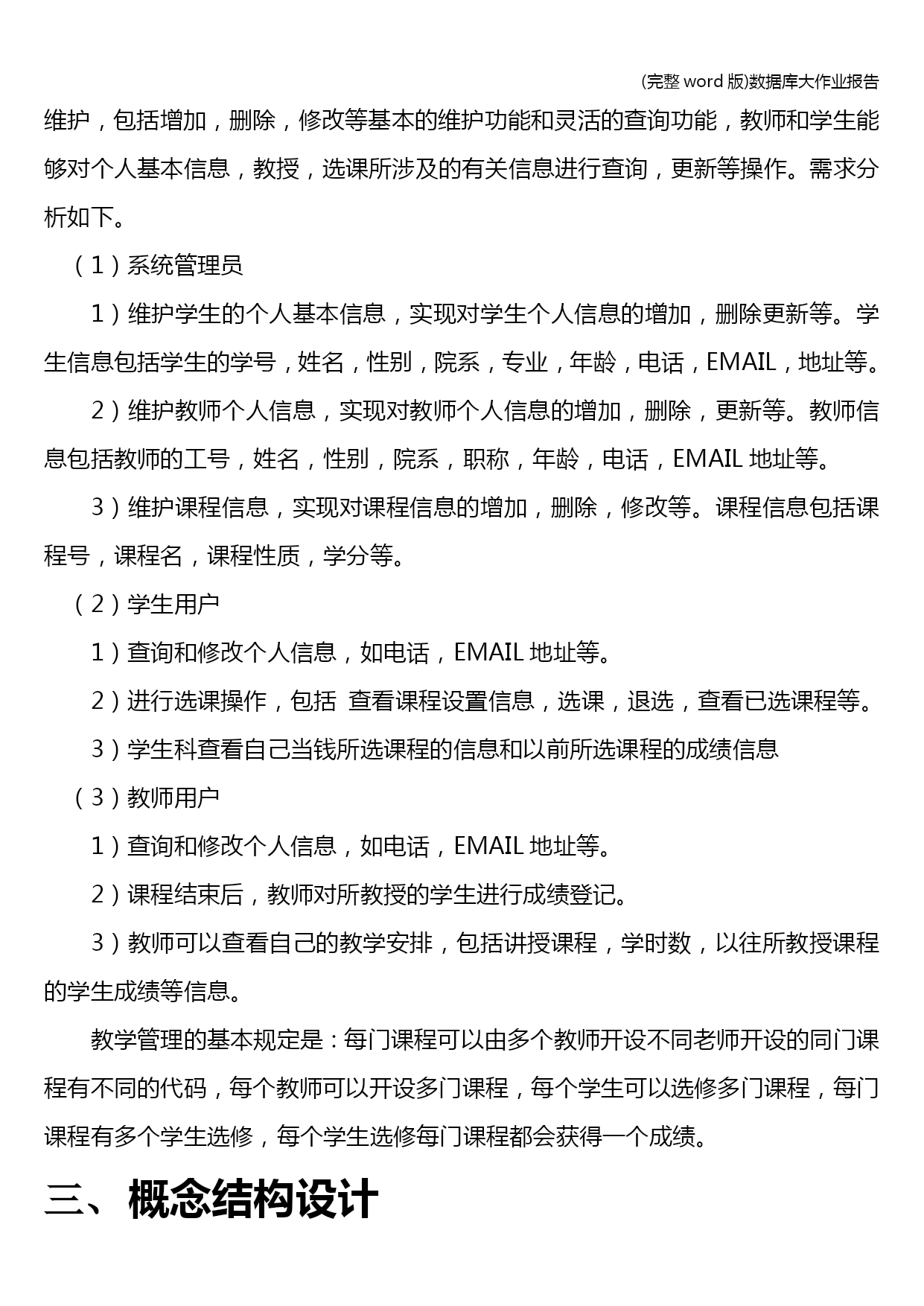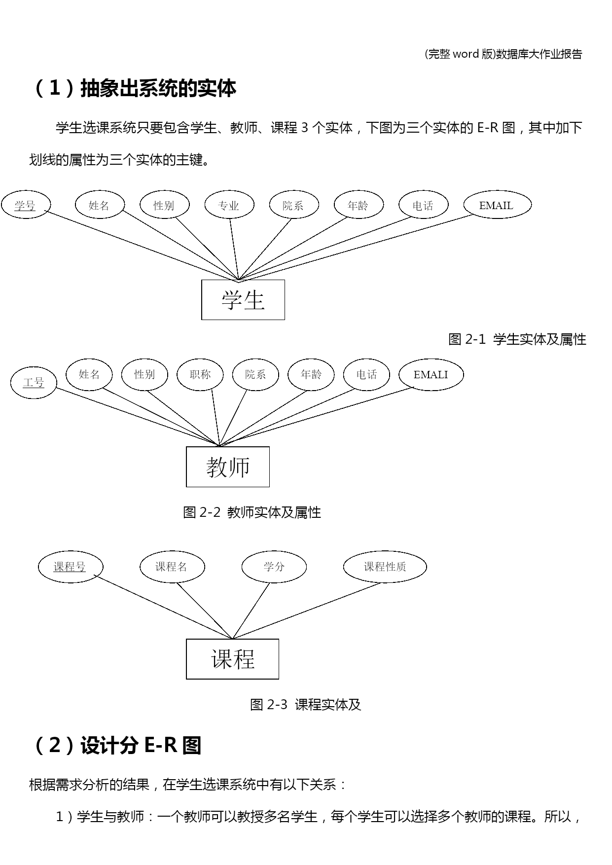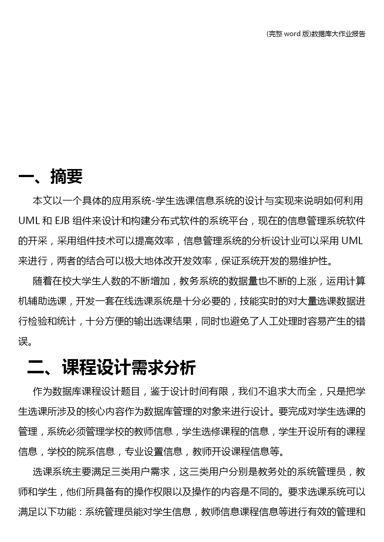 (完整word版)数据库大作业报告 (完整word版)数据库大作业报告 (完整word版)数据库大作业报告 数据库大作业报告 课程设计题目:学生选课系统 姓名:单明星 学号:3120602045 专业:计算机科学与技术 系别:计算机学院 目录 一:摘要 二:课程设计任务的需求分析 三:概念结构设计 四:逻辑结构设计 五:物理结构设计 六:数据实现 七:数据库维护 一、摘要 本文以一个具体的应用系统-学生选课信息系统的设计与实现来说明如何利用UML和EJB组件来设计和构建分布式软件的系统平台,现在的信息管理系统软件的开采,采用组件技术可以提高效率,信息管理系统的分析设计业可以采用UML来进行,两者的结合可以极大地体改开发效率,保证系统开发的易维护性。 随着在校大学生人数的不断增加,教务系统的数据量也不断的上涨,运用计算机辅助选课,开发一套在线选课系统是十分必要的,技能实时的对大量选课数据进行检验和统计,十分方便的输出选课结果,同时也避免了人工处理时容易产生的错误。 二、课程设计需求分析 作为数据库课程设计题目,鉴于设计时间有限,我们不追求大而全,只是把学生选课所涉及的核心内容作为数据库管理的对象来进行设计。要完成对学生选课的管理,系统必须管理学校的教师信息,学生选修课程的信息,学生开设所有的课程信息,学校的院系信息,专业设置信息,教师开设课程信息等。 选课系统主要满足三类用户需求,这三类用户分别是教务处的系统管理员,教师和学生,他们所具备有的操作权限以及操作的内容是不同的。要求选课系统可以满足以下功能:系统管理员能对学生信息,教师信息课程信息等进行有效的管理和维护,包括增加,删除,修改等基本的维护功能和灵活的查询功能,教师和学生能够对个人基本信息,教授,选课所涉及的有关信息进行查询,更新等操作。需求分析如下。 (1)系统管理员 1)维护学生的个人基本信息,实现对学生个人信息的增加,删除更新等。学生信息包括学生的学号,姓名,性别,院系,专业,年龄,电话,EMAIL,地址等。 2)维护教师个人信息,实现对教师个人信息的增加,删除,更新等。教师信息包括教师的工号,姓名,性别,院系,职称,年龄,电话,EMAIL地址等。 3)维护课程信息,实现对课程信息的增加,删除,修改等。课程信息包括课程号,课程名,课程性质,学分等。 (2)学生用户 1)查询和修改个人信息,如电话,EMAIL地址等。 2)进行选课操作,包括查看课程设置信息,选课,退选,查看已选课程等。 3)学生科查看自己当钱所选课程的信息和以前所选课程的成绩信息 (3)教师用户 1)查询和修改个人信息,如电话,EMAIL地址等。 2)课程结束后,教师对所教授的学生进行成绩登记。 3)教师可以查看自己的教学安排,包括讲授课程,学时数,以往所教授课程的学生成绩等信息。 教学管理的基本规定是:每门课程可以由多个教师开设不同老师开设的同门课程有不同的代码,每个教师可以开设多门课程,每个学生可以选修多门课程,每门课程有多个学生选修,每个学生选修每门课程都会获得一个成绩。 概念结构设计 (1)抽象出系统的实体 学生选课系统只要包含学生、教师、课程3个实体,下图为三个实体的E-R图,其中加下划线的属性为三个实体的主键。 EMAILL 电话 年龄 院系 专业 性别 姓名 学号 学生 图2-1学生实体及属性 工号 教师 EMALI 电话 年龄 院系 职称 性别 姓名 图2-2教师实体及属性 课程号 课程名 学分 课程性质 课程 图2-3课程实体及 (2)设计分E-R图 根据需求分析的结果,在学生选课系统中有以下关系: 1)学生与教师:一个教师可以教授多名学生,每个学生可以选择多个教师的课程。所以,学生与教师之间是通过选课进行联系的,并且两者之间的关系是多对多的联系。 2)学生与课程:一个学生可以选择多门课程,一门课程可以对多个学生开放。因此,学生与课程之间是多对多的联系。学生选修一门课程会有一个成绩。 3)教师与课程:一个教师可以教授多门课程,一门课程同时也可以被多名教师教授。因此教师与课程之间的关系是多对多的联系。 根据上述分析,得到各个局部的E-R图如下: 教师 学生 教授 选课 课程 学生 成绩 图2-4学生和教师之间的E-R图图2-5学生与课程之间的E-R图 四:逻辑结构设计 逻辑结构设计就是将概念结构设计中的全局E-R图转换为与选用的DBMS产品所支持的数据模型相符合的逻辑结构。 根据介绍的E-R图向关系数据模型转换的相关规则,将图2-5所示图转换为关系数据模型,得到学生选课系统的关系模式如下: 教师(工号,姓名,性别,院系,年龄,职称)为教师实体对关系模式,其中学号是学生教师的关系主键。 学生(学号,姓名,性别,专业,院