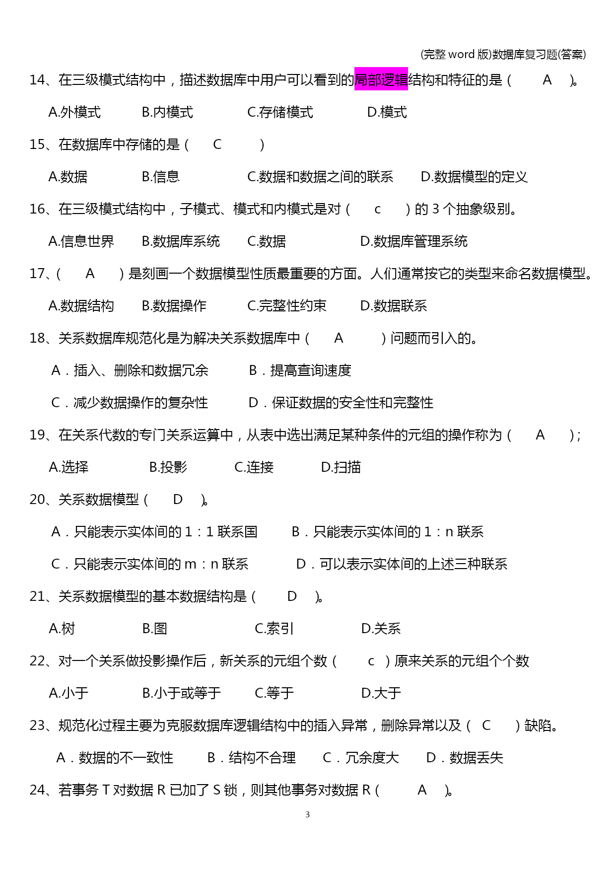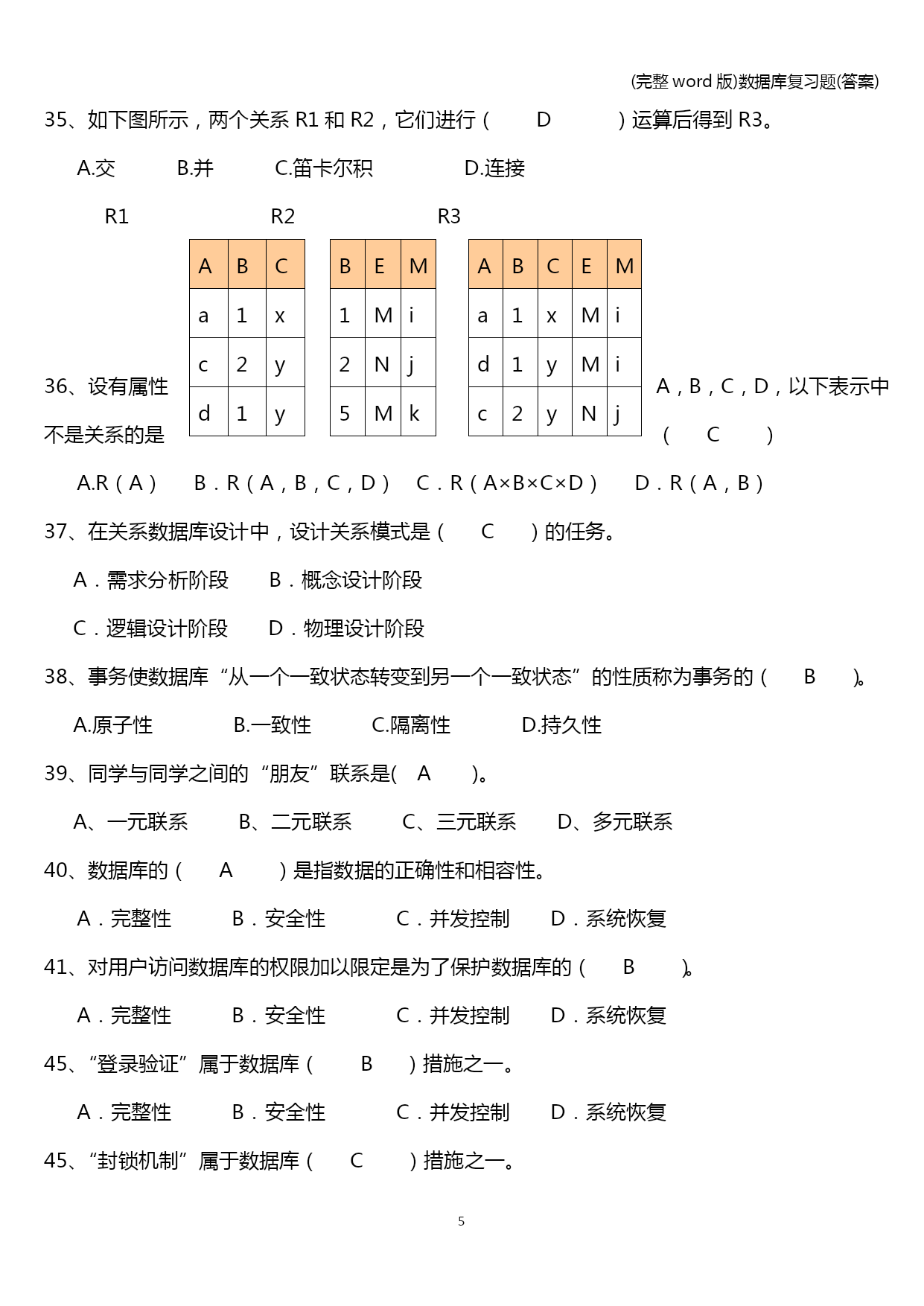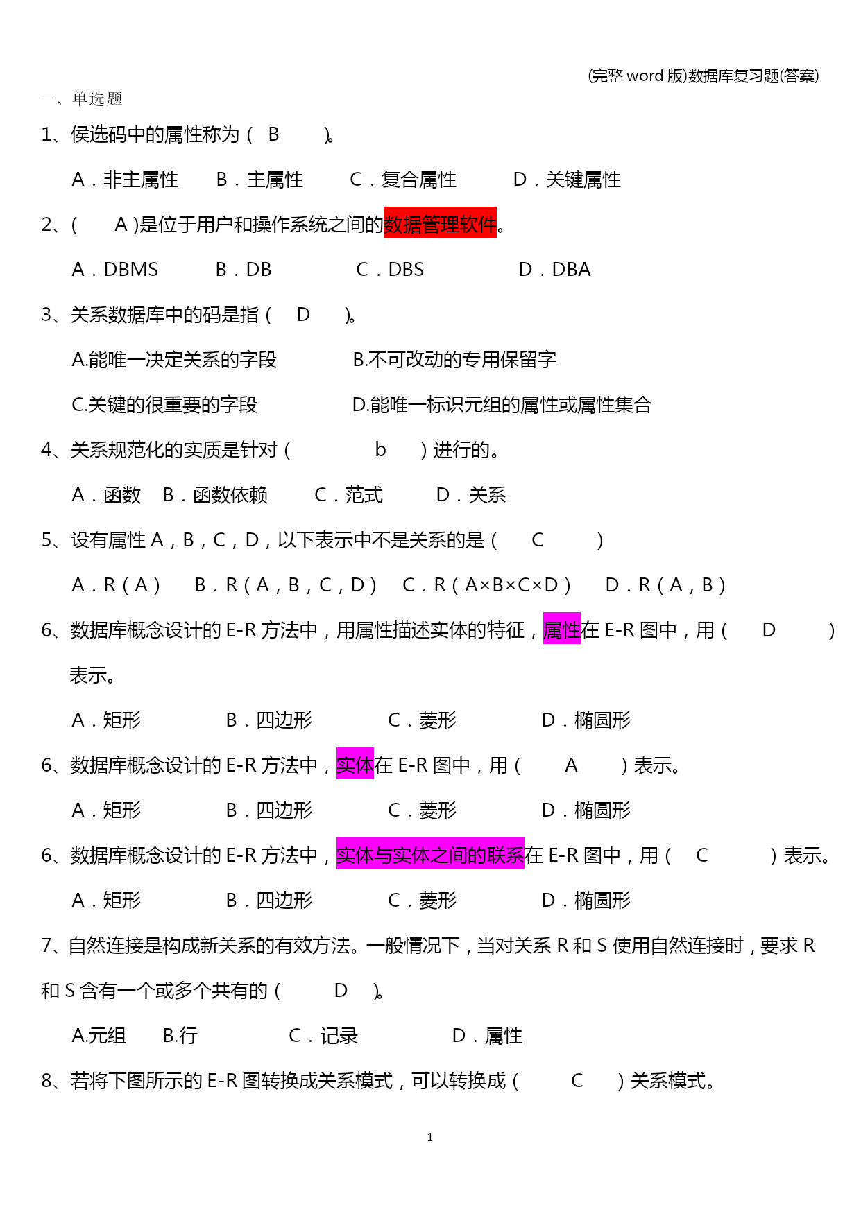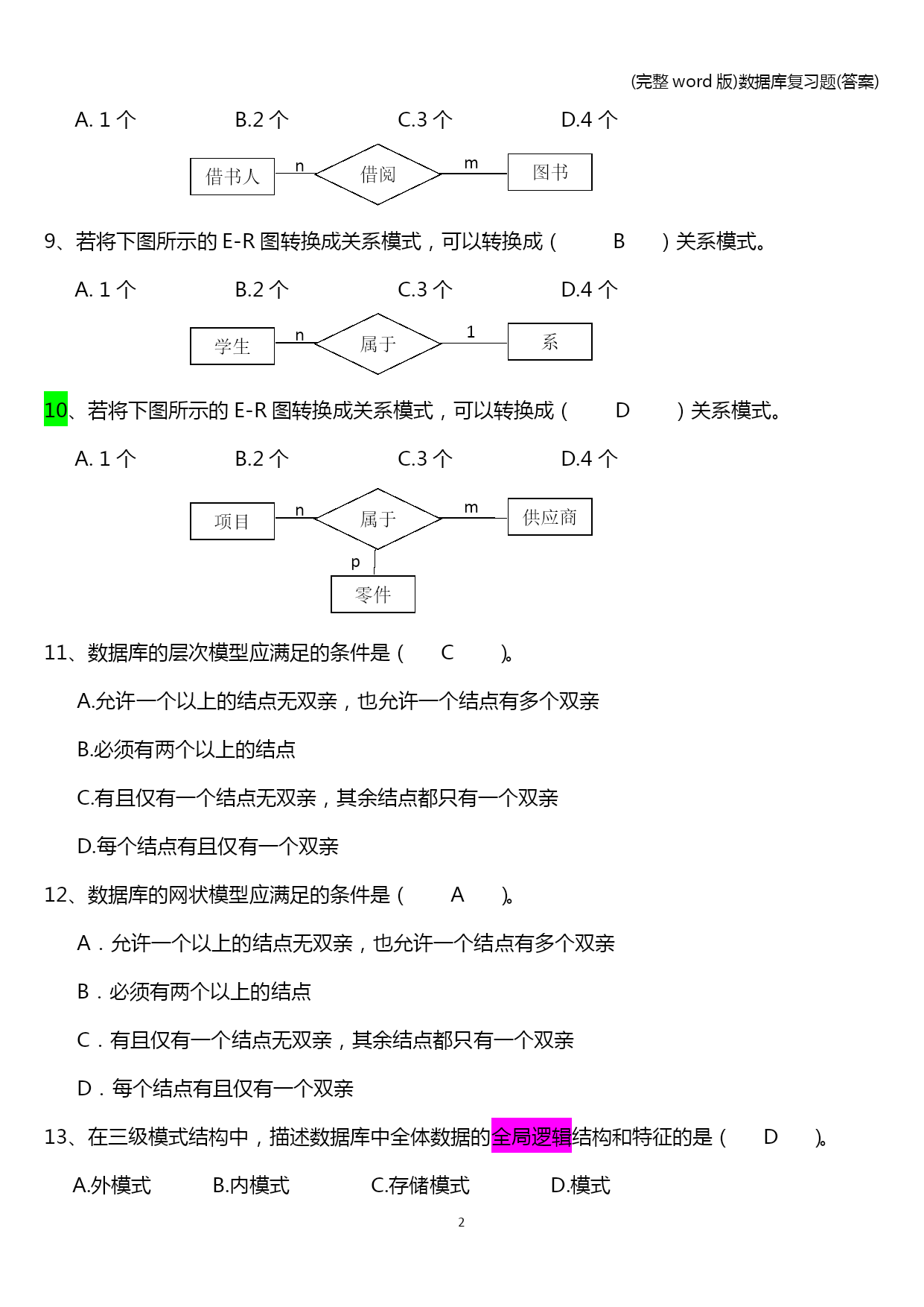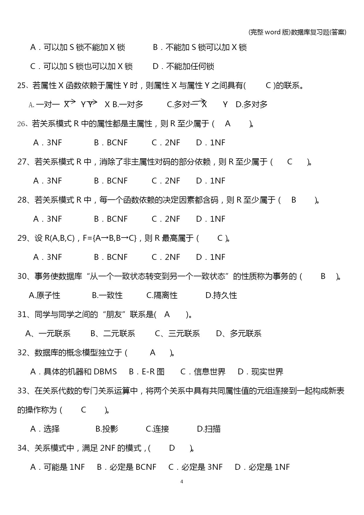 (完整word版)数据库复习题(答案) (完整word版)数据库复习题(答案) PAGE\*MERGEFORMAT13 (完整word版)数据库复习题(答案) 单选题 1、侯选码中的属性称为(B)。 A.非主属性B.主属性C.复合属性D.关键属性 2、(A)是位于用户和操作系统之间的数据管理软件。 A.DBMSB.DBC.DBSD.DBA 3、关系数据库中的码是指(D)。 A.能唯一决定关系的字段B.不可改动的专用保留字 C.关键的很重要的字段D.能唯一标识元组的属性或属性集合 4、关系规范化的实质是针对( b)进行的。 A.函数 B.函数依赖 C.范式 D.关系 5、设有属性A,B,C,D,以下表示中不是关系的是(C) A.R(A)B.R(A,B,C,D)C.R(A×B×C×D)D.R(A,B) 6、数据库概念设计的E-R方法中,用属性描述实体的特征,属性在E-R图中,用(D)表示。 A.矩形B.四边形C.菱形D.椭圆形 6、数据库概念设计的E-R方法中,实体在E-R图中,用(A)表示。 A.矩形B.四边形C.菱形D.椭圆形 6、数据库概念设计的E-R方法中,实体与实体之间的联系在E-R图中,用(C)表示。 A.矩形B.四边形C.菱形D.椭圆形 7、自然连接是构成新关系的有效方法。一般情况下,当对关系R和S使用自然连接时,要求R和S含有一个或多个共有的(D)。 A.元组 B.行 C.记录D.属性 8、若将下图所示的E-R图转换成关系模式,可以转换成(C)关系模式。 A.1个 B.2个 C.3个 D.4个 n m 借书人 图书 借阅 9、若将下图所示的E-R图转换成关系模式,可以转换成(B)关系模式。 A.1个 B.2个 C.3个 D.4个 n 1 学生 系 属于 10、若将下图所示的E-R图转换成关系模式,可以转换成(D)关系模式。 A.1个 B.2个 C.3个 D.4个 n m 项目 供应商 属于 零件 p 11、数据库的层次模型应满足的条件是(C)。 A.允许一个以上的结点无双亲,也允许一个结点有多个双亲 B.必须有两个以上的结点 C.有且仅有一个结点无双亲,其余结点都只有一个双亲 D.每个结点有且仅有一个双亲 12、数据库的网状模型应满足的条件是(A)。 A.允许一个以上的结点无双亲,也允许一个结点有多个双亲 B.必须有两个以上的结点 C.有且仅有一个结点无双亲,其余结点都只有一个双亲 D.每个结点有且仅有一个双亲 13、在三级模式结构中,描述数据库中全体数据的全局逻辑结构和特征的是(D)。 A.外模式B.内模式C.存储模式D.模式 14、在三级模式结构中,描述数据库中用户可以看到的局部逻辑结构和特征的是(A)。 A.外模式B.内模式C.存储模式D.模式 15、在数据库中存储的是(C) A.数据B.信息C.数据和数据之间的联系D.数据模型的定义 16、在三级模式结构中,子模式、模式和内模式是对(c)的3个抽象级别。 A.信息世界B.数据库系统C.数据D.数据库管理系统 17、(A)是刻画一个数据模型性质最重要的方面。人们通常按它的类型来命名数据模型。 A.数据结构B.数据操作C.完整性约束D.数据联系 18、关系数据库规范化是为解决关系数据库中(A)问题而引入的。 A.插入、删除和数据冗余B.提高查询速度 C.减少数据操作的复杂性D.保证数据的安全性和完整性 19、在关系代数的专门关系运算中,从表中选出满足某种条件的元组的操作称为(A); A.选择B.投影C.连接D.扫描 20、关系数据模型(D)。 A.只能表示实体间的1:1联系国B.只能表示实体间的1:n联系 C.只能表示实体间的m:n联系D.可以表示实体间的上述三种联系 21、关系数据模型的基本数据结构是(D)。 A.树B.图C.索引D.关系 22、对一个关系做投影操作后,新关系的元组个数(c)原来关系的元组个个数 A.小于B.小于或等于C.等于D.大于 23、规范化过程主要为克服数据库逻辑结构中的插入异常,删除异常以及(C)缺陷。 A.数据的不一致性B.结构不合理C.冗余度大D.数据丢失 24、若事务T对数据R已加了S锁,则其他事务对数据R(A)。 A.可以加S锁不能加X锁B.不能加S锁可以加X锁 C.可以加S锁也可以加X锁D.不能加任何锁 若属性X函数依赖于属性Y时,则属性X与属性Y之间具有(C)的联系。 一对一XYYXB.一对多C.多对一XYD.多对多 若关系模式R中的属性都是主属性,则R至少属于(A)。 A.3NFB.BCNFC.2NFD.1NF 27、若关系模式R中,消除了非主属性对码的部分依赖,则R至少属于(C)。 A.3NFB.BCNFC.2NFD.1NF 28、若关系模式R中,每一个函数依赖的决定因素