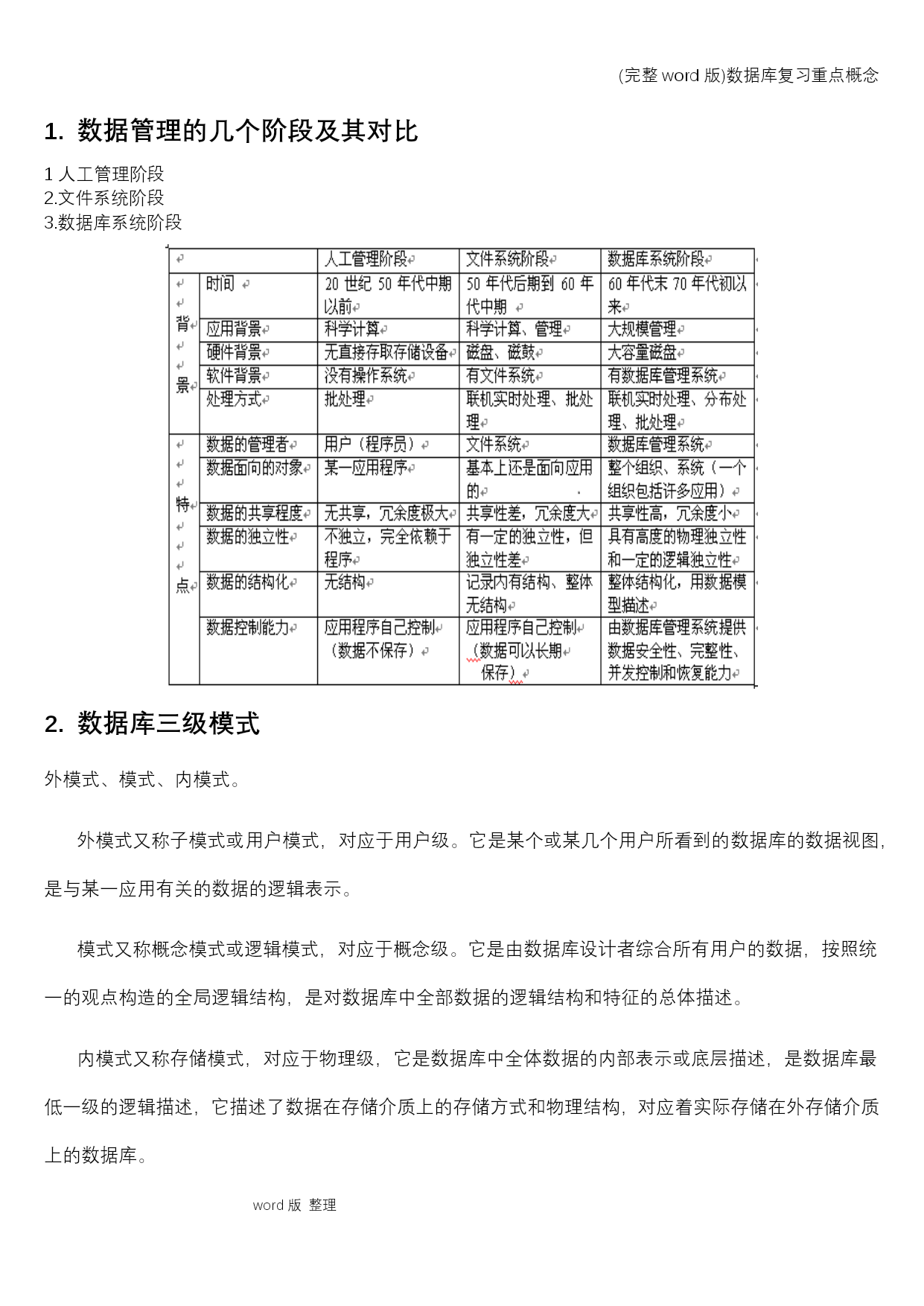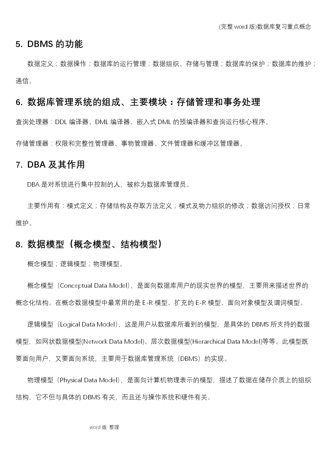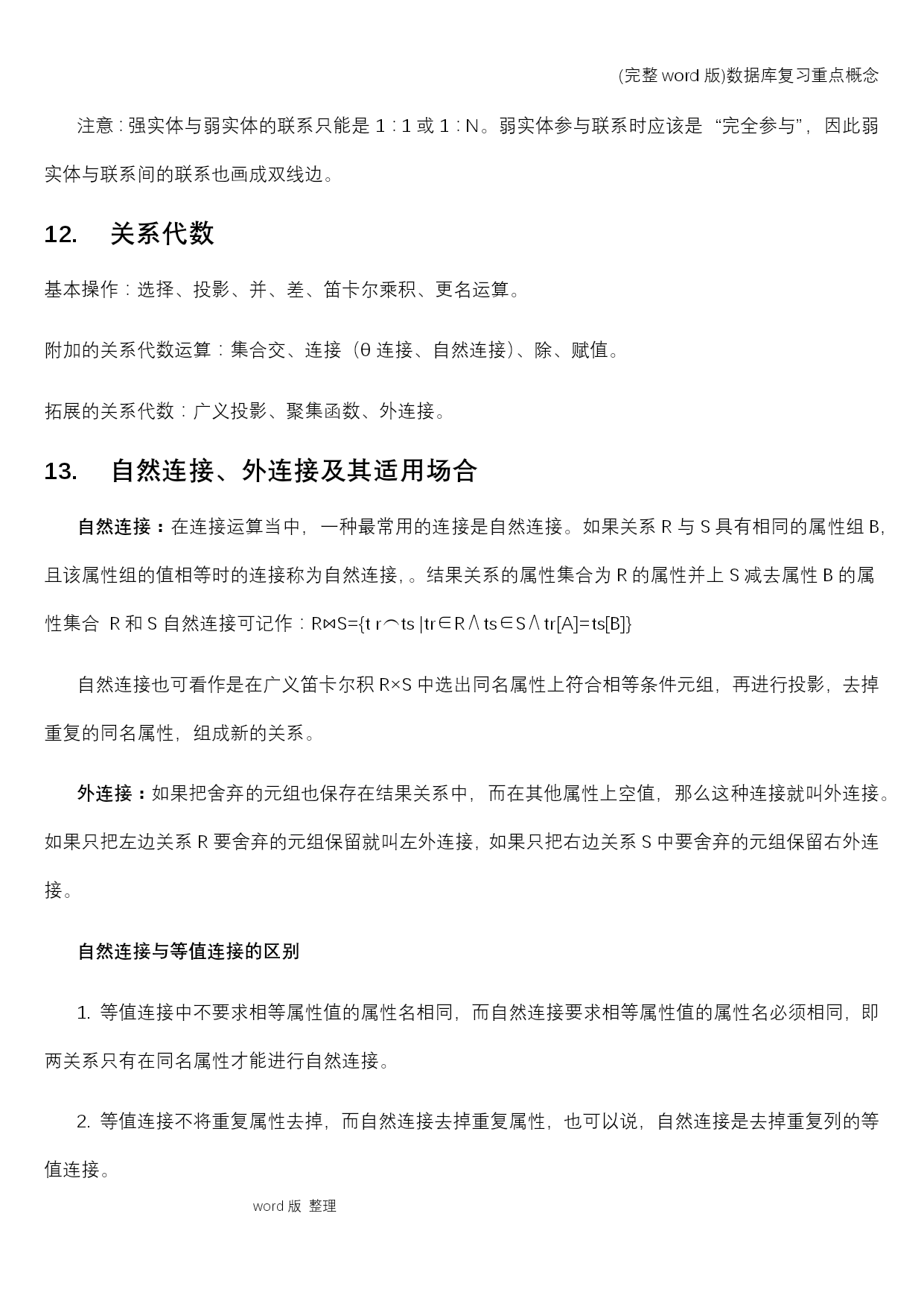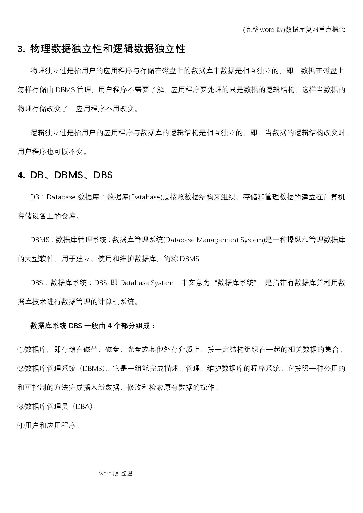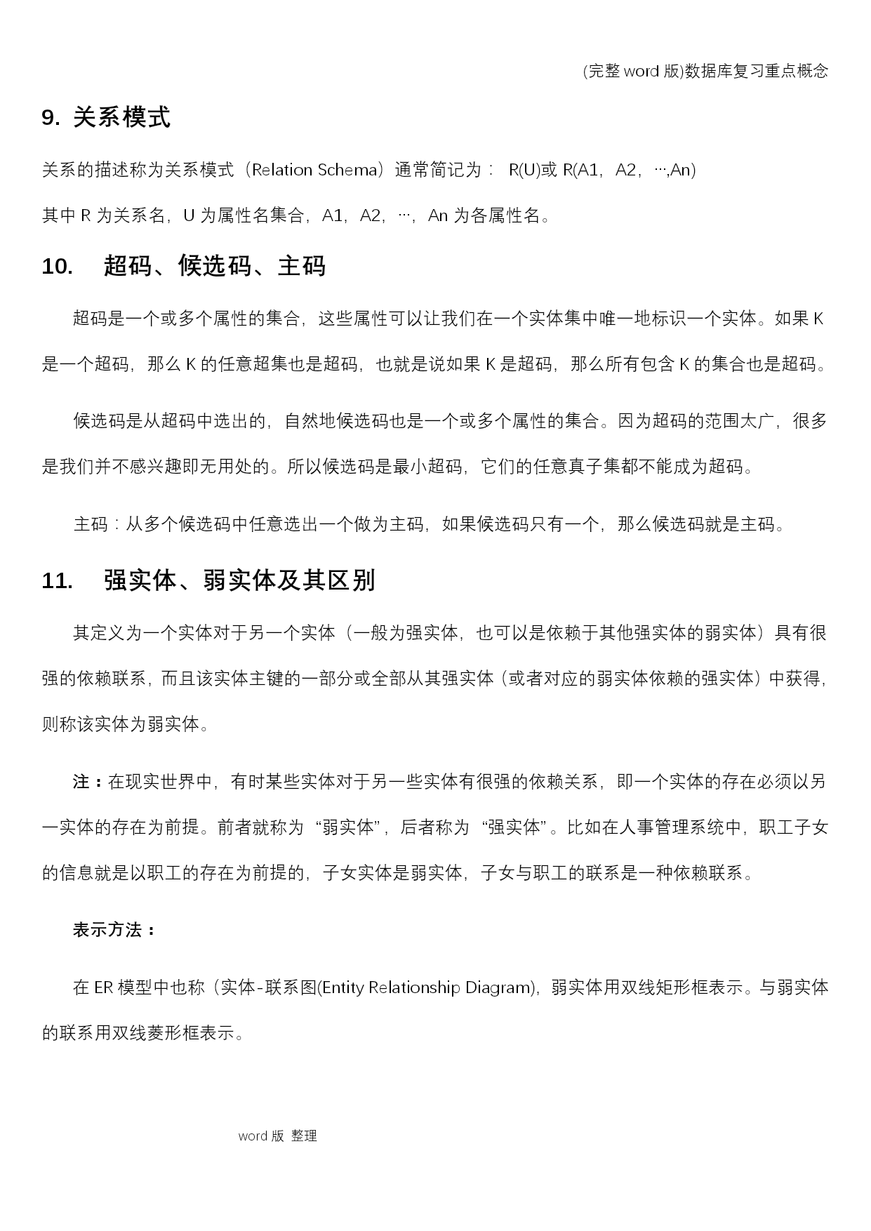 (完整word版)数据库复习重点概念 (完整word版)数据库复习重点概念 word版整理 (完整word版)数据库复习重点概念 数据管理的几个阶段及其对比 1人工管理阶段 2.文件系统阶段 3.数据库系统阶段 数据库三级模式 外模式、模式、内模式。 外模式又称子模式或用户模式,对应于用户级。它是某个或某几个用户所看到的数据库的数据视图,是与某一应用有关的数据的逻辑表示。 模式又称概念模式或逻辑模式,对应于概念级。它是由数据库设计者综合所有用户的数据,按照统一的观点构造的全局逻辑结构,是对数据库中全部数据的逻辑结构和特征的总体描述。 内模式又称存储模式,对应于物理级,它是数据库中全体数据的内部表示或底层描述,是数据库最低一级的逻辑描述,它描述了数据在存储介质上的存储方式和物理结构,对应着实际存储在外存储介质上的数据库。 物理数据独立性和逻辑数据独立性 物理独立性是指用户的应用程序与存储在磁盘上的数据库中数据是相互独立的。即,数据在磁盘上怎样存储由DBMS管理,用户程序不需要了解,应用程序要处理的只是数据的逻辑结构,这样当数据的物理存储改变了,应用程序不用改变。 逻辑独立性是指用户的应用程序与数据库的逻辑结构是相互独立的,即,当数据的逻辑结构改变时,用户程序也可以不变。 DB、DBMS、DBS DB:Database数据库:数据库(Database)是按照数据结构来组织、存储和管理数据的建立在计算机存储设备上的仓库。 DBMS:数据库管理系统:数据库管理系统(DatabaseManagementSystem)是一种操纵和管理数据库的大型软件,用于建立、使用和维护数据库,简称DBMS DBS:数据库系统:DBS即DatabaseSystem,中文意为“数据库系统”,是指带有数据库并利用数据库技术进行数据管理的计算机系统。 数据库系统DBS一般由4个部分组成: ①数据库,即存储在磁带、磁盘、光盘或其他外存介质上、按一定结构组织在一起的相关数据的集合。 ②数据库管理系统(DBMS)。它是一组能完成描述、管理、维护数据库的程序系统。它按照一种公用的和可控制的方法完成插入新数据、修改和检索原有数据的操作。 ③数据库管理员(DBA)。 ④用户和应用程序。 DBMS的功能 数据定义;数据操作;数据库的运行管理;数据组织、存储与管理;数据库的保护;数据库的维护;通信。 数据库管理系统的组成、主要模块:存储管理和事务处理 查询处理器:DDL编译器、DML编译器、嵌入式DML的预编译器和查询运行核心程序。 存储管理器:权限和完整性管理器、事物管理器、文件管理器和缓冲区管理器。 DBA及其作用 DBA是对系统进行集中控制的人,被称为数据库管理员。 主要作用有:模式定义;存储结构及存取方法定义;模式及物力组织的修改;数据访问授权;日常维护。 数据模型(概念模型、结构模型) 概念模型;逻辑模型;物理模型。 概念模型(ConceptualDataModel),是面向数据库用户的现实世界的模型,主要用来描述世界的概念化结构。在概念数据模型中最常用的是E-R模型、扩充的E-R模型、面向对象模型及谓词模型。 逻辑模型(LogicalDataModel),这是用户从数据库所看到的模型,是具体的DBMS所支持的数据模型,如网状数据模型(NetworkDataModel)、层次数据模型(HierarchicalDataModel)等等。此模型既要面向用户,又要面向系统,主要用于数据库管理系统(DBMS)的实现。 物理模型(PhysicalDataModel),是面向计算机物理表示的模型,描述了数据在储存介质上的组织结构,它不但与具体的DBMS有关,而且还与操作系统和硬件有关。 关系模式 关系的描述称为关系模式(RelationSchema)通常简记为:R(U)或R(A1,A2,…,An) 其中R为关系名,U为属性名集合,A1,A2,…,An为各属性名。 超码、候选码、主码 超码是一个或多个属性的集合,这些属性可以让我们在一个实体集中唯一地标识一个实体。如果K是一个超码,那么K的任意超集也是超码,也就是说如果K是超码,那么所有包含K的集合也是超码。 候选码是从超码中选出的,自然地候选码也是一个或多个属性的集合。因为超码的范围太广,很多是我们并不感兴趣即无用处的。所以候选码是最小超码,它们的任意真子集都不能成为超码。 主码:从多个候选码中任意选出一个做为主码,如果候选码只有一个,那么候选码就是主码。 强实体、弱实体及其区别 其定义为一个实体对于另一个实体(一般为强实体,也可以是依赖于其他强实体的弱实体)具有很强的依赖联系,而且该实体主键的一部分或全部从其强实体(或者对应的弱实体依赖的强实体)中获得,则称该实体为弱实体。 注:在现实世界中,有时某些实体对于另一些实体有