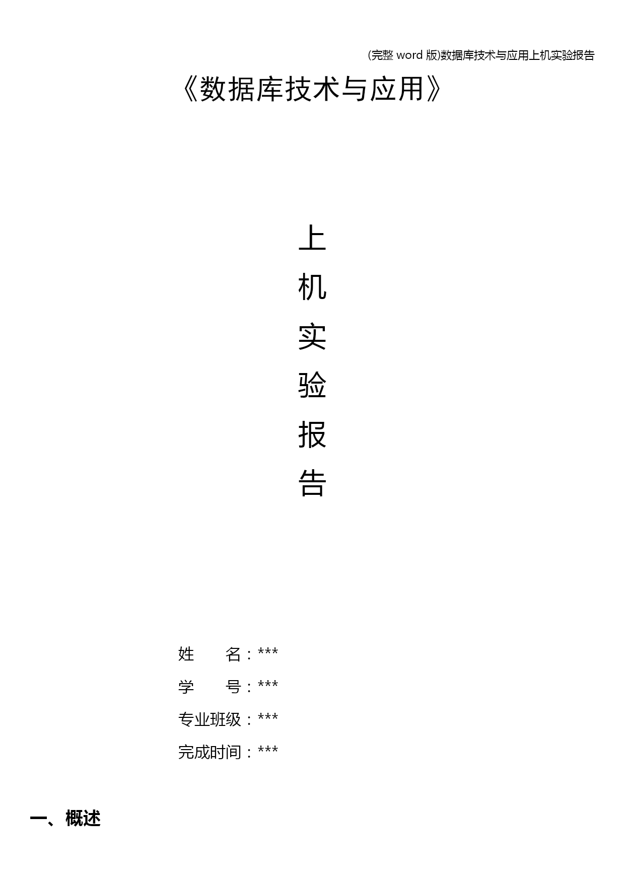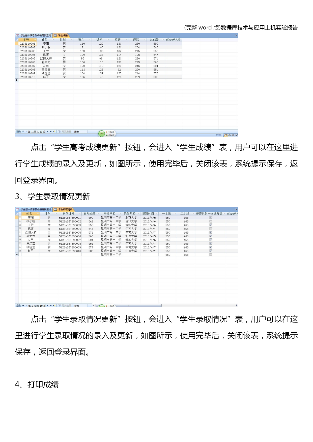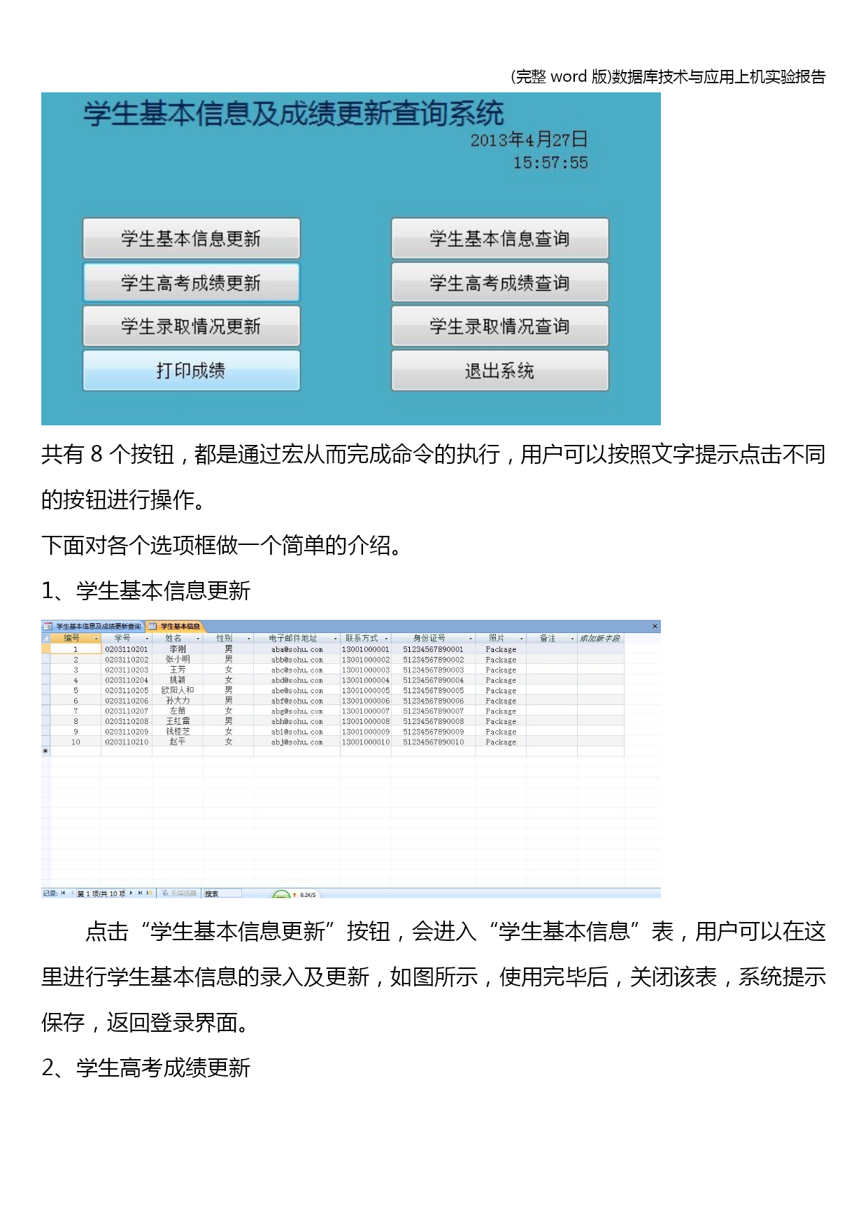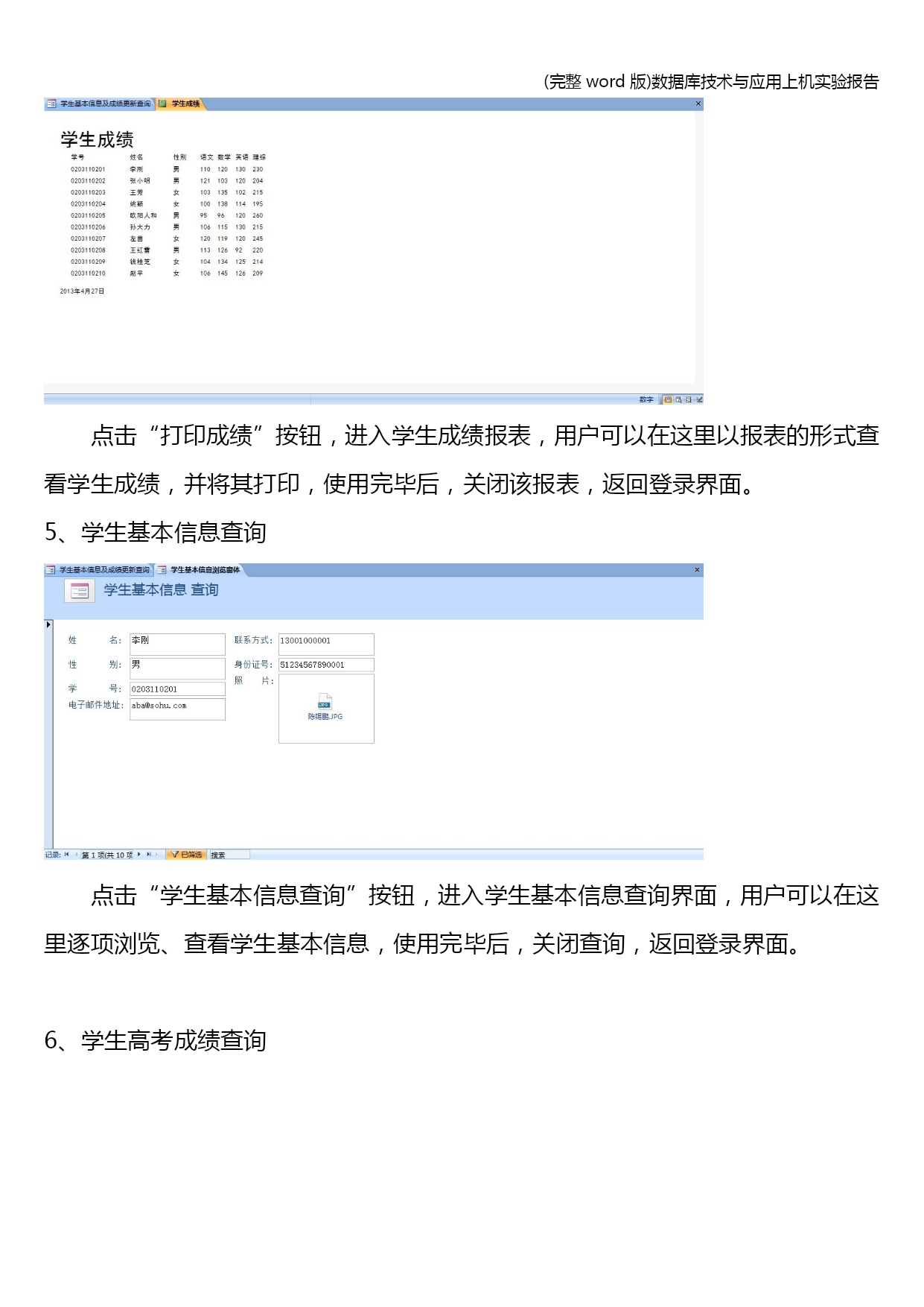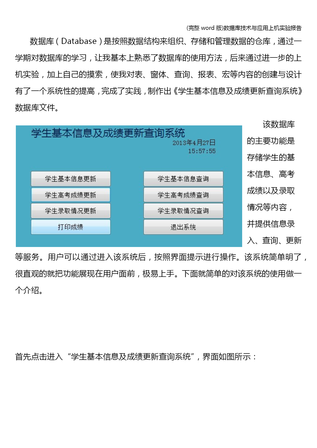(完整word版)数据库技术与应用上机实验报告 (完整word版)数据库技术与应用上机实验报告 (完整word版)数据库技术与应用上机实验报告 《数据库技术与应用》 上 机 实 验 报 告 姓名:*** 学号:*** 专业班级:*** 完成时间:*** 一、概述 数据库(Database)是按照数据结构来组织、存储和管理数据的仓库,通过一学期对数据库的学习,让我基本上熟悉了数据库的使用方法,后来通过进一步的上机实验,加上自己的摸索,使我对表、窗体、查询、报表、宏等内容的创建与设计有了一个系统性的提高,完成了实践,制作出《学生基本信息及成绩更新查询系统》数据库文件。 该数据库的主要功能是存储学生的基本信息、高考成绩以及录取情况等内容,并提供信息录入、查询、更新等服务。用户可以通过进入该系统后,按照界面提示进行操作。该系统简单明了,很直观的就把功能展现在用户面前,极易上手。下面就简单的对该系统的使用做一个介绍。 首先点击进入“学生基本信息及成绩更新查询系统”,界面如图所示: 共有8个按钮,都是通过宏从而完成命令的执行,用户可以按照文字提示点击不同的按钮进行操作。 下面对各个选项框做一个简单的介绍。 1、学生基本信息更新 点击“学生基本信息更新”按钮,会进入“学生基本信息”表,用户可以在这里进行学生基本信息的录入及更新,如图所示,使用完毕后,关闭该表,系统提示保存,返回登录界面。 2、学生高考成绩更新 点击“学生高考成绩更新”按钮,会进入“学生成绩”表,用户可以在这里进行学生成绩的录入及更新,如图所示,使用完毕后,关闭该表,系统提示保存,返回登录界面。 3、学生录取情况更新 点击“学生录取情况更新”按钮,会进入“学生录取情况”表,用户可以在这里进行学生录取情况的录入及更新,如图所示,使用完毕后,关闭该表,系统提示保存,返回登录界面。 4、打印成绩 点击“打印成绩”按钮,进入学生成绩报表,用户可以在这里以报表的形式查看学生成绩,并将其打印,使用完毕后,关闭该报表,返回登录界面。 5、学生基本信息查询 点击“学生基本信息查询”按钮,进入学生基本信息查询界面,用户可以在这里逐项浏览、查看学生基本信息,使用完毕后,关闭查询,返回登录界面。 6、学生高考成绩查询 点击“学生高考成绩查询”,出现如图所示的输入框,提示输入学生姓名,从而进行查询,例如输入“李刚”,就可得到下图所示结果: 使用完毕后,关闭查询,返回登录界面。 7、学生录取情况查询 点击“学生录取情况查询”,出现如图所示的输入框,提示输入学生姓名及身份证号,从而进行查询,例如输入姓名“李刚”,身份证号“51234567890001”,就可得到如下图所示结果: 使用完毕后,关闭查询,返回登录界面。 8、退出系统 用户在使用完该系统后,可以点击“退出系统”按钮,退出数据库系统,系统会自动保存文件。 二、主要上机实验内容 1、数据库的创建 我所使用的数据库是Access2007版,我通过点击进入数据库软件,点击“创建空白数据库”,取名为“学生基本信息及成绩更新查询系统”,完成数据库的创建。数据库主要实现的功能为学生信息、学生成绩以及学生录取情况的更新、查询,更快更方便的完成数据的录入及更新,并可以通过报表查看并打印相关内容,整个操作过程简单明了,极易上手。 2、表的创建 我所制作的数据库共包含3个表,分别是“学生基本信息”、“学生成绩”、“学生录取情况”,表内容及表设计如图所示: 所有表的建立我都是通过设计视图的方式完成建立,相关表结构的设计及个字段属性如下图范例所示: 3、查询的创建 我一共创建了4个查询,分别是“学生成绩查询”、“学生高考成绩查询”、“学生基本信息查询”、“学生录取情况查询”,可以实现对学生基本信息及成绩的检索查询。 其中“学生成绩查询”及“学生基本信息查询”两个查询,我是使用“查询向导”的方式建立的,简单快捷。 此外,“学生高考成绩查询”是我使用查询设计创建的,该种创建方式较为复杂,但功能更加完善,内容更加具体。在该设计视图中,我还在“姓名”字段“条件”一栏加了“[请输入学生姓名:]”,从而得到如图所示的选择查询效果: 以上查询的创建,为学生基本信息及成绩等内容的检索提供了方便快捷的通道,用户只需要根据自己所要查询的内容,输入查询条件即可得到结果,从而获取数据。 4、窗体的创建 在该数据库系统中,我一共创建了4个窗体,分别是“学生基本信息及成绩更新查询”、“学生基本信息浏览窗体”、“学生成绩查询窗体”及“学生录取情况查询窗口”,因为各个窗体的创建及功能都有所不同,下面就分别一一介绍: (1)“学生基本信息及成绩更新查询”窗体 该窗体的创建方式是通过新建空白窗体在窗体设计模式下创建的,这样的创建方式更加灵活自由,