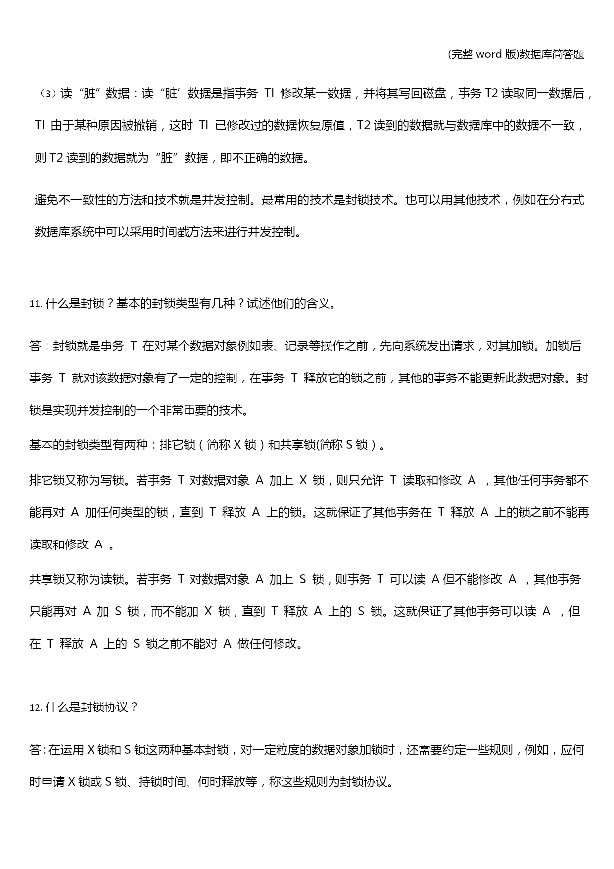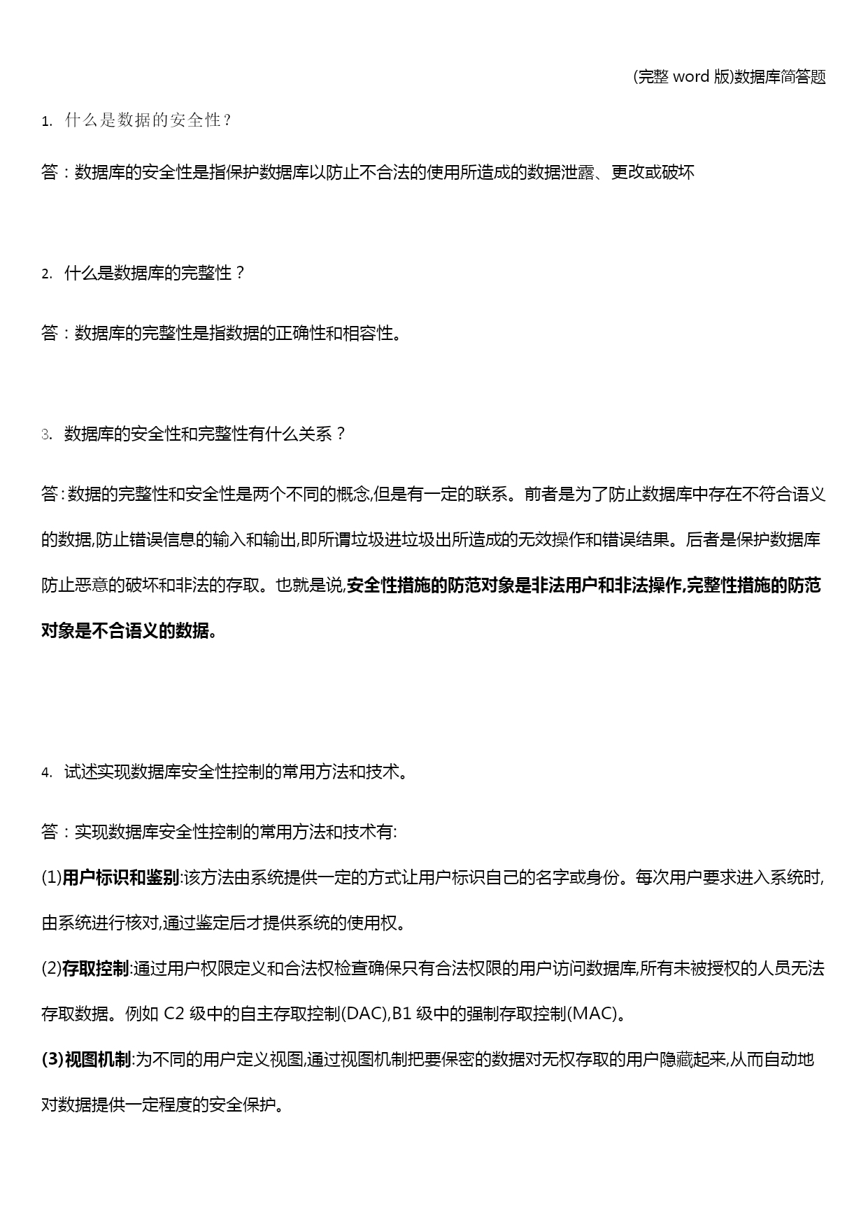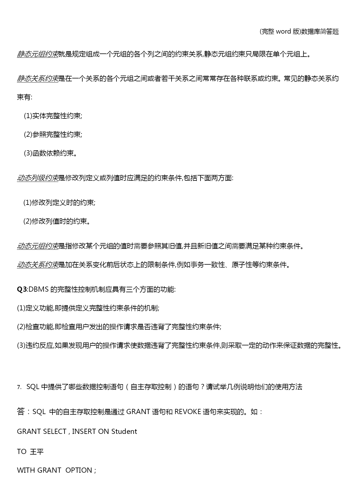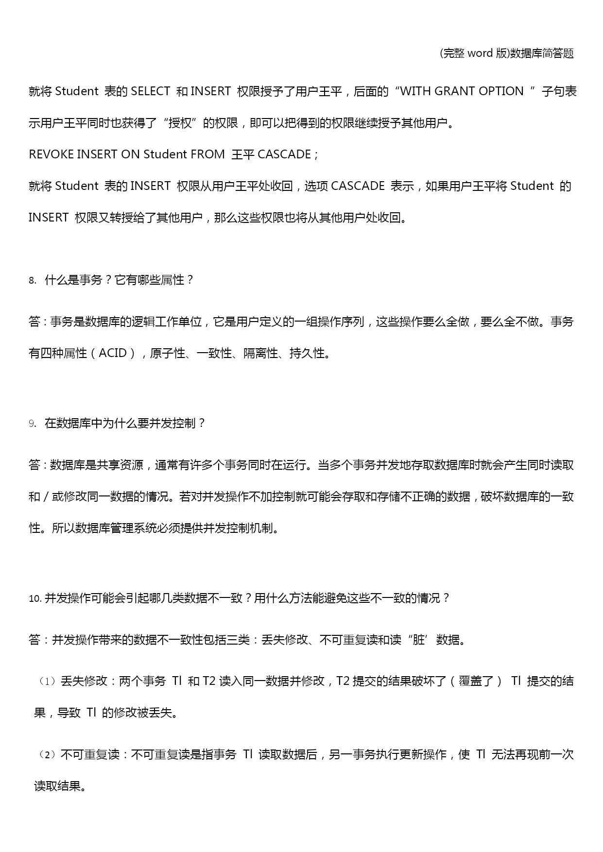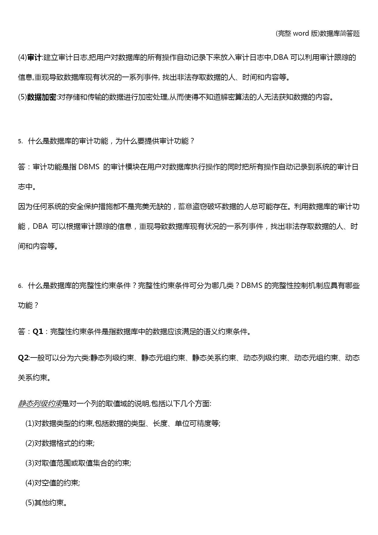 (完整word版)数据库简答题 (完整word版)数据库简答题 (完整word版)数据库简答题 什么是数据的安全性? 答:数据库的安全性是指保护数据库以防止不合法的使用所造成的数据泄露、更改或破坏 什么是数据库的完整性? 答:数据库的完整性是指数据的正确性和相容性。 数据库的安全性和完整性有什么关系? 答:数据的完整性和安全性是两个不同的概念,但是有一定的联系。前者是为了防止数据库中存在不符合语义的数据,防止错误信息的输入和输出,即所谓垃圾进垃圾出所造成的无效操作和错误结果。后者是保护数据库防止恶意的破坏和非法的存取。也就是说,安全性措施的防范对象是非法用户和非法操作,完整性措施的防范对象是不合语义的数据。 试述实现数据库安全性控制的常用方法和技术。 答:实现数据库安全性控制的常用方法和技术有:(1)用户标识和鉴别:该方法由系统提供一定的方式让用户标识自己的名字或身份。每次用户要求进入系统时,由系统进行核对,通过鉴定后才提供系统的使用权。(2)存取控制:通过用户权限定义和合法权检查确保只有合法权限的用户访问数据库,所有未被授权的人员无法存取数据。例如C2级中的自主存取控制(DAC),B1级中的强制存取控制(MAC)。(3)视图机制:为不同的用户定义视图,通过视图机制把要保密的数据对无权存取的用户隐藏起来,从而自动地对数据提供一定程度的安全保护。 (4)审计:建立审计日志,把用户对数据库的所有操作自动记录下来放入审计日志中,DBA可以利用审计跟踪的信息,重现导致数据库现有状况的一系列事件,找出非法存取数据的人、时间和内容等。(5)数据加密:对存储和传输的数据进行加密处理,从而使得不知道解密算法的人无法获知数据的内容。 什么是数据库的审计功能,为什么要提供审计功能? 答:审计功能是指DBMS的审计模块在用户对数据库执行操作的同时把所有操作自动记录到系统的审计日志中。因为任何系统的安全保护措施都不是完美无缺的,蓄意盗窃破坏数据的人总可能存在。利用数据库的审计功能,DBA可以根据审计跟踪的信息,重现导致数据库现有状况的一系列事件,找出非法存取数据的人、时间和内容等。 什么是数据库的完整性约束条件?完整性约束条件可分为哪几类?DBMS的完整性控制机制应具有哪些功能? 答:Q1:完整性约束条件是指数据库中的数据应该满足的语义约束条件。 Q2:一般可以分为六类:静态列级约束、静态元组约束、静态关系约束、动态列级约束、动态元组约束、动态关系约束。 静态列级约束是对一个列的取值域的说明,包括以下几个方面:(1)对数据类型的约束,包括数据的类型、长度、单位可精度等;(2)对数据格式的约束;(3)对取值范围或取值集合的约束;(4)对空值的约束;(5)其他约束。 静态元组约束就是规定组成一个元组的各个列之间的约束关系,静态元组约束只局限在单个元组上。 静态关系约束是在一个关系的各个元组之间或者若干关系之间常常存在各种联系或约束。常见的静态关系约束有:(1)实体完整性约束;(2)参照完整性约束;(3)函数依赖约束。 动态列级约束是修改列定义或列值时应满足的约束条件,包括下面两方面: (1)修改列定义时的约束;(2)修改列值时的约束。 动态元组约束是指修改某个元组的值时需要参照其旧值,并且新旧值之间需要满足某种约束条件。动态关系约束是加在关系变化前后状态上的限制条件,例如事务一致性、原子性等约束条件。 Q3:DBMS的完整性控制机制应具有三个方面的功能:(1)定义功能,即提供定义完整性约束条件的机制;(2)检查功能,即检查用户发出的操作请求是否违背了完整性约束条件;(3)违约反应,如果发现用户的操作请求使数据违背了完整性约束条件,则采取一定的动作来保证数据的完整性。 SQL中提供了哪些数据控制语句(自主存取控制)的语句?请试举几例说明他们的使用方法 答:SQL中的自主存取控制是通过GRANT语句和REVOKE语句来实现的。如: GRANTSELECT,INSERTONStudent TO王平WITHGRANTOPTION; 就将Student表的SELECT和INSERT权限授予了用户王平,后面的“WITHGRANTOPTION”子句表示用户王平同时也获得了“授权”的权限,即可以把得到的权限继续授予其他用户。REVOKEINSERTONStudentFROM王平CASCADE;就将Student表的INSERT权限从用户王平处收回,选项CASCADE表示,如果用户王平将Student的INSERT权限又转授给了其他用户,那么这些权限也将从其他用户处收回。 什么是事务?它有哪些属性? 答:事务是数据库的逻辑工作单位,它是用户定义的一组操作序列,这些操作要么全做,要么全不做。事务有四种属性(ACID),原子性、一致性、隔离性、持久性。 在数