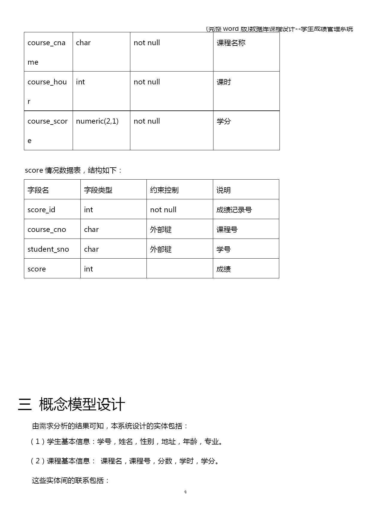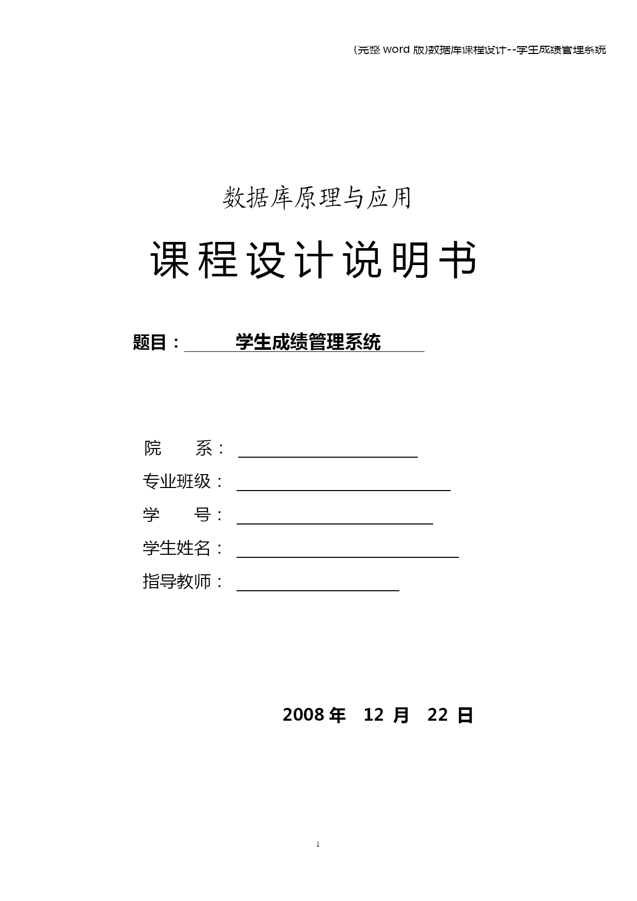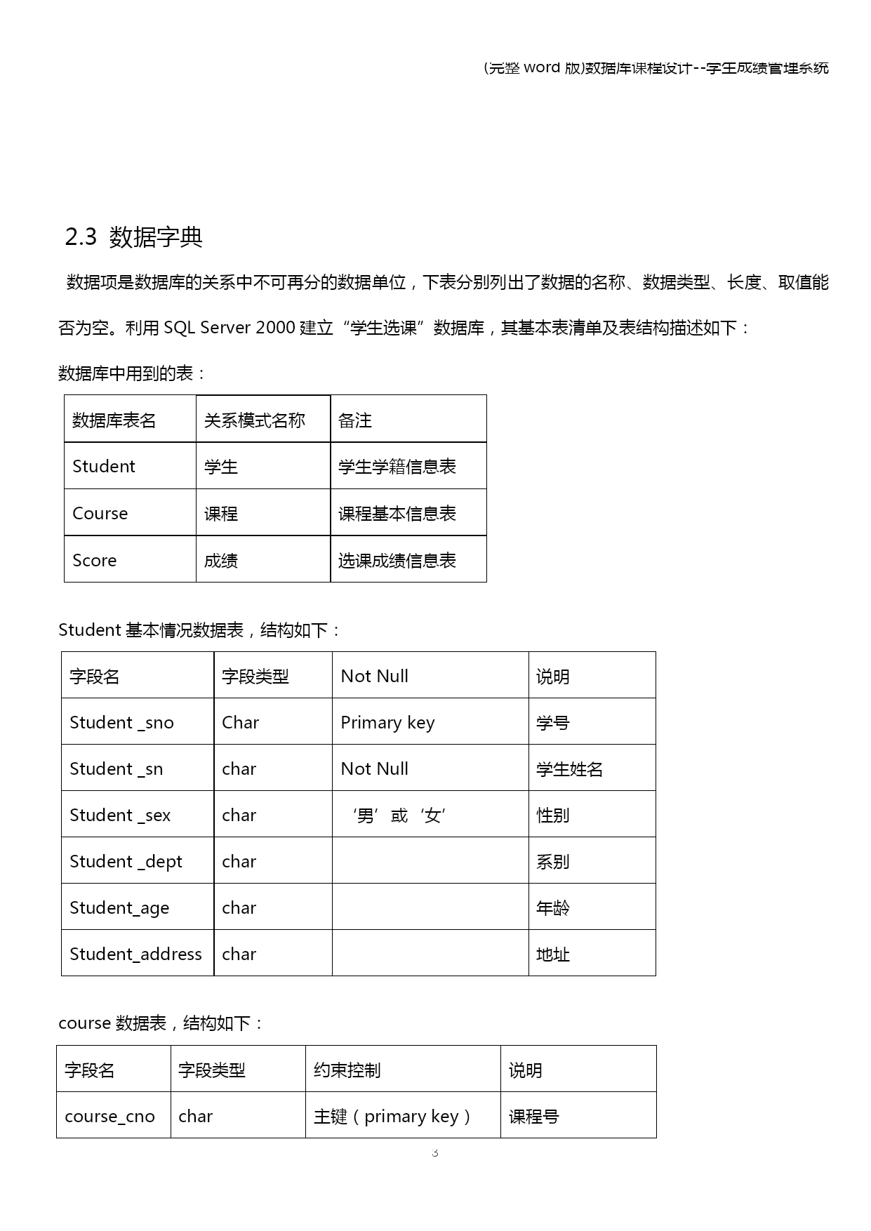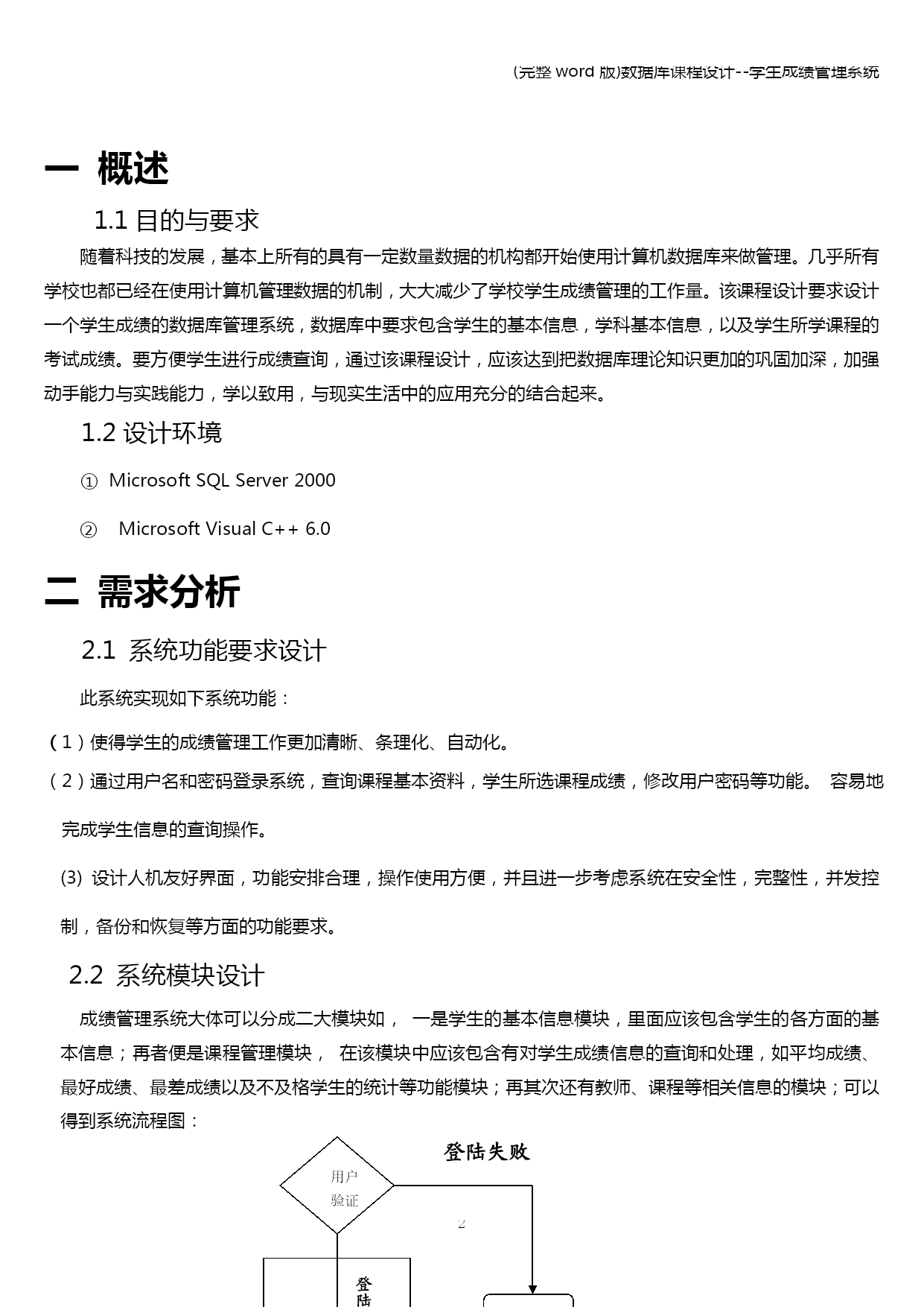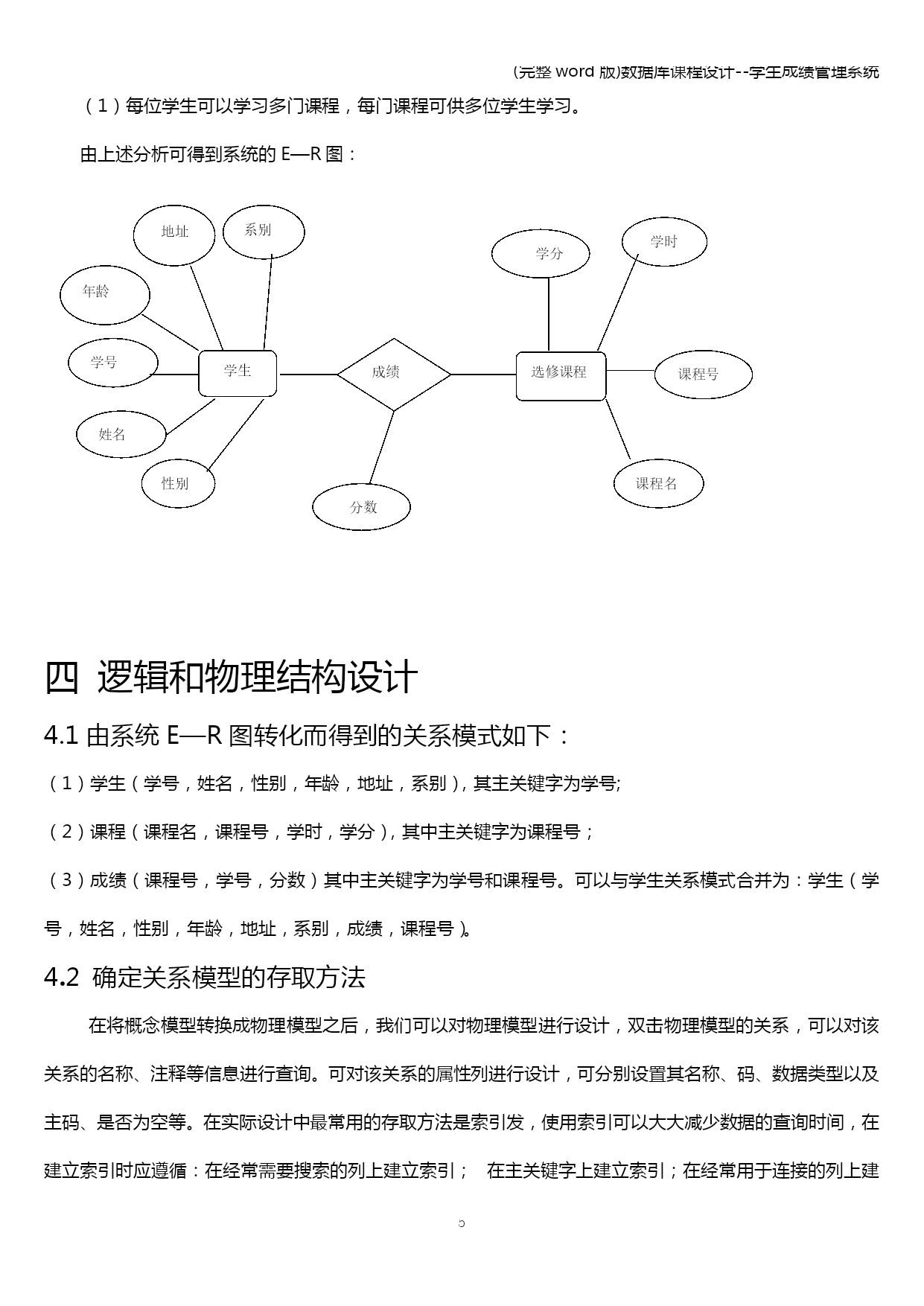 (完整word版)数据库课程设计--学生成绩管理系统 (完整word版)数据库课程设计--学生成绩管理系统 (完整word版)数据库课程设计--学生成绩管理系统 数据库原理与应用 课程设计说明书 题目:学生成绩管理系统 院系: 专业班级: 学号: 学生姓名: 指导教师: 2008年12月22日 一概述 1.1目的与要求 随着科技的发展,基本上所有的具有一定数量数据的机构都开始使用计算机数据库来做管理。几乎所有学校也都已经在使用计算机管理数据的机制,大大减少了学校学生成绩管理的工作量。该课程设计要求设计一个学生成绩的数据库管理系统,数据库中要求包含学生的基本信息,学科基本信息,以及学生所学课程的考试成绩。要方便学生进行成绩查询,通过该课程设计,应该达到把数据库理论知识更加的巩固加深,加强动手能力与实践能力,学以致用,与现实生活中的应用充分的结合起来。 1.2设计环境 ①MicrosoftSQLServer2000 ②MicrosoftVisualC++6.0 二需求分析 2.1系统功能要求设计 此系统实现如下系统功能: (1)使得学生的成绩管理工作更加清晰、条理化、自动化。 (2)通过用户名和密码登录系统,查询课程基本资料,学生所选课程成绩,修改用户密码等功能。容易地完成学生信息的查询操作。 (3)设计人机友好界面,功能安排合理,操作使用方便,并且进一步考虑系统在安全性,完整性,并发控制,备份和恢复等方面的功能要求。 2.2系统模块设计 登陆失败 学生管理 课程管理 退出系统 用户 验证 成绩查询 登陆成功 成绩管理系统大体可以分成二大模块如,一是学生的基本信息模块,里面应该包含学生的各方面的基本信息;再者便是课程管理模块,在该模块中应该包含有对学生成绩信息的查询和处理,如平均成绩、最好成绩、最差成绩以及不及格学生的统计等功能模块;再其次还有教师、课程等相关信息的模块;可以得到系统流程图: 2.3数据字典 数据项是数据库的关系中不可再分的数据单位,下表分别列出了数据的名称、数据类型、长度、取值能否为空。利用SQLServer2000建立“学生选课”数据库,其基本表清单及表结构描述如下: 数据库中用到的表: 数据库表名关系模式名称备注Student学生学生学籍信息表Course课程课程基本信息表Score成绩选课成绩信息表 Student基本情况数据表,结构如下: 字段名字段类型NotNull说明Student_snoCharPrimarykey学号Student_sncharNotNull学生姓名Student_sexchar‘男’或‘女’性别Student_deptchar系别Student_agechar年龄Student_addresschar地址 course数据表,结构如下: 字段名字段类型约束控制说明course_cnochar主键(primarykey)课程号course_cnamecharnotnull课程名称course_hourintnotnull课时course_scorenumeric(2,1)notnull学分 score情况数据表,结构如下: 字段名字段类型约束控制说明score_idintnotnull成绩记录号course_cnochar外部键课程号student_snochar外部键学号scoreint成绩 三概念模型设计 由需求分析的结果可知,本系统设计的实体包括: (1)学生基本信息:学号,姓名,性别,地址,年龄,专业。 (2)课程基本信息:课程名,课程号,分数,学时,学分。 这些实体间的联系包括: (1)每位学生可以学习多门课程,每门课程可供多位学生学习。 由上述分析可得到系统的E—R图: 选修课程 成绩 学生 课程号 课程名 学时 学分 分数 学号 姓名 性别 系别 地址 年龄 四逻辑和物理结构设计 4.1由系统E—R图转化而得到的关系模式如下: (1)学生(学号,姓名,性别,年龄,地址,系别),其主关键字为学号; (2)课程(课程名,课程号,学时,学分),其中主关键字为课程号; (3)成绩(课程号,学号,分数)其中主关键字为学号和课程号。可以与学生关系模式合并为:学生(学号,姓名,性别,年龄,地址,系别,成绩,课程号)。 4.2确定关系模型的存取方法 在将概念模型转换成物理模型之后,我们可以对物理模型进行设计,双击物理模型的关系,可以对该关系的名称、注释等信息进行查询。可对该关系的属性列进行设计,可分别设置其名称、码、数据类型以及主码、是否为空等。在实际设计中最常用的存取方法是索引发,使用索引可以大大减少数据的查询时间,在建立索引时应遵循:在