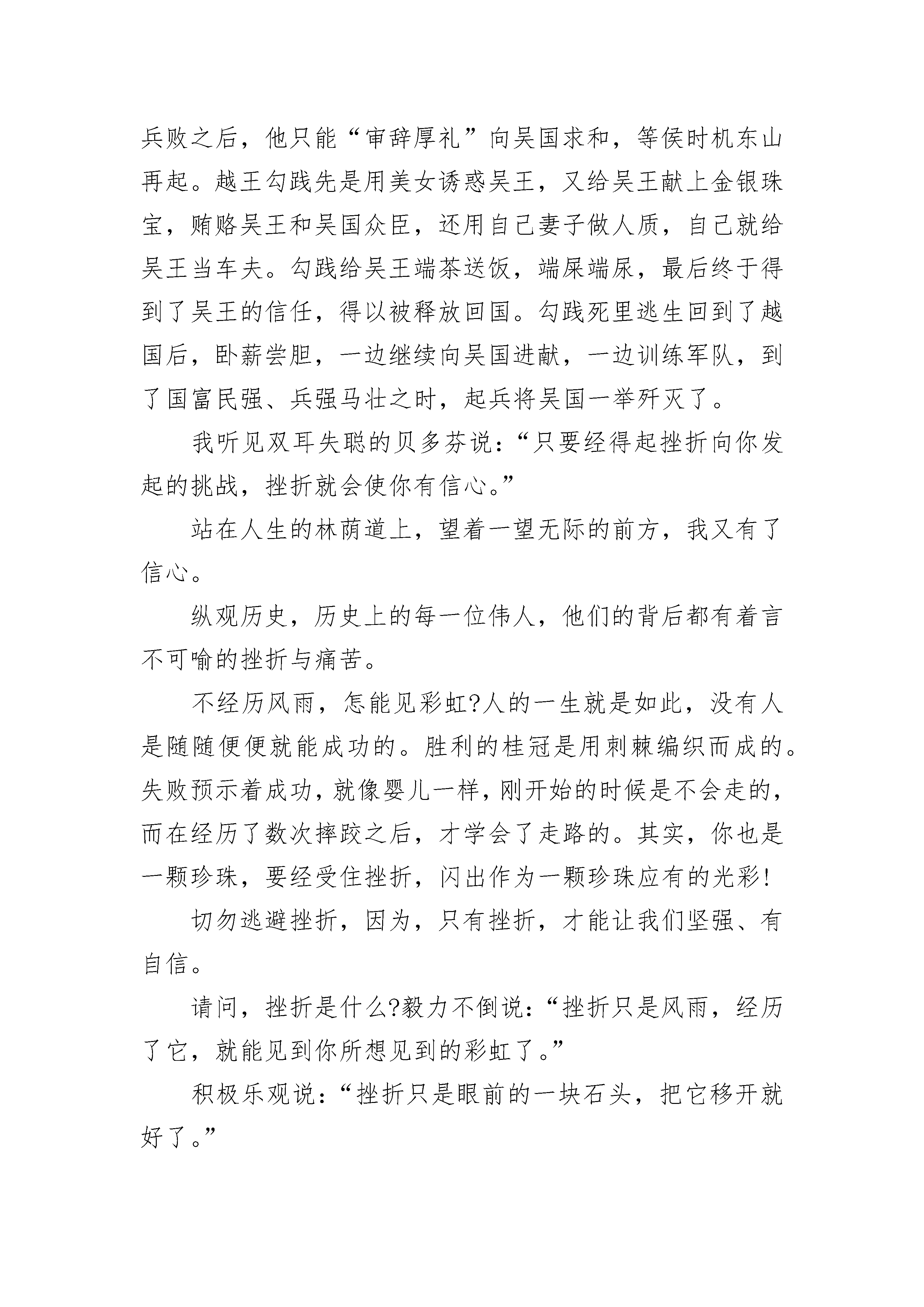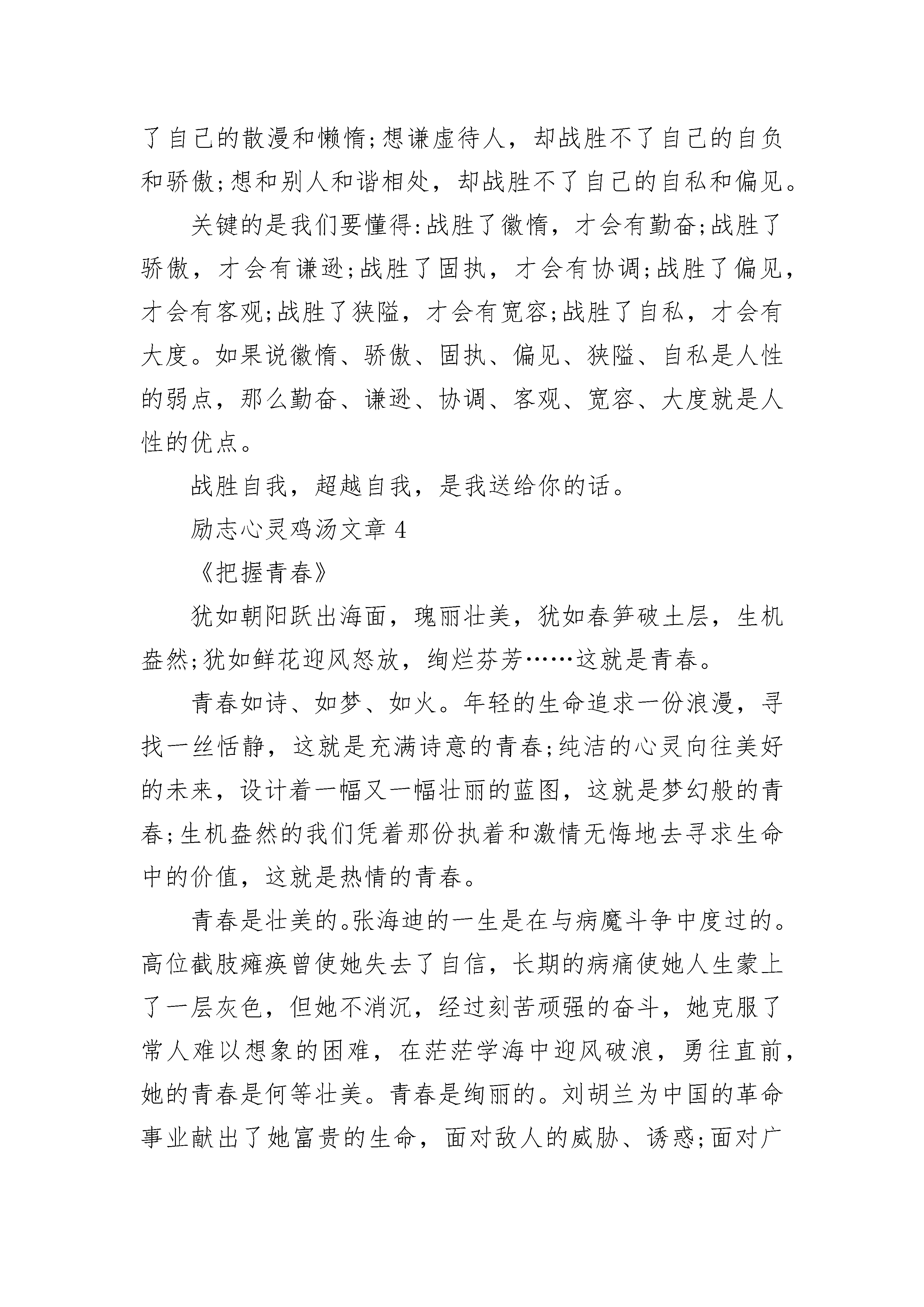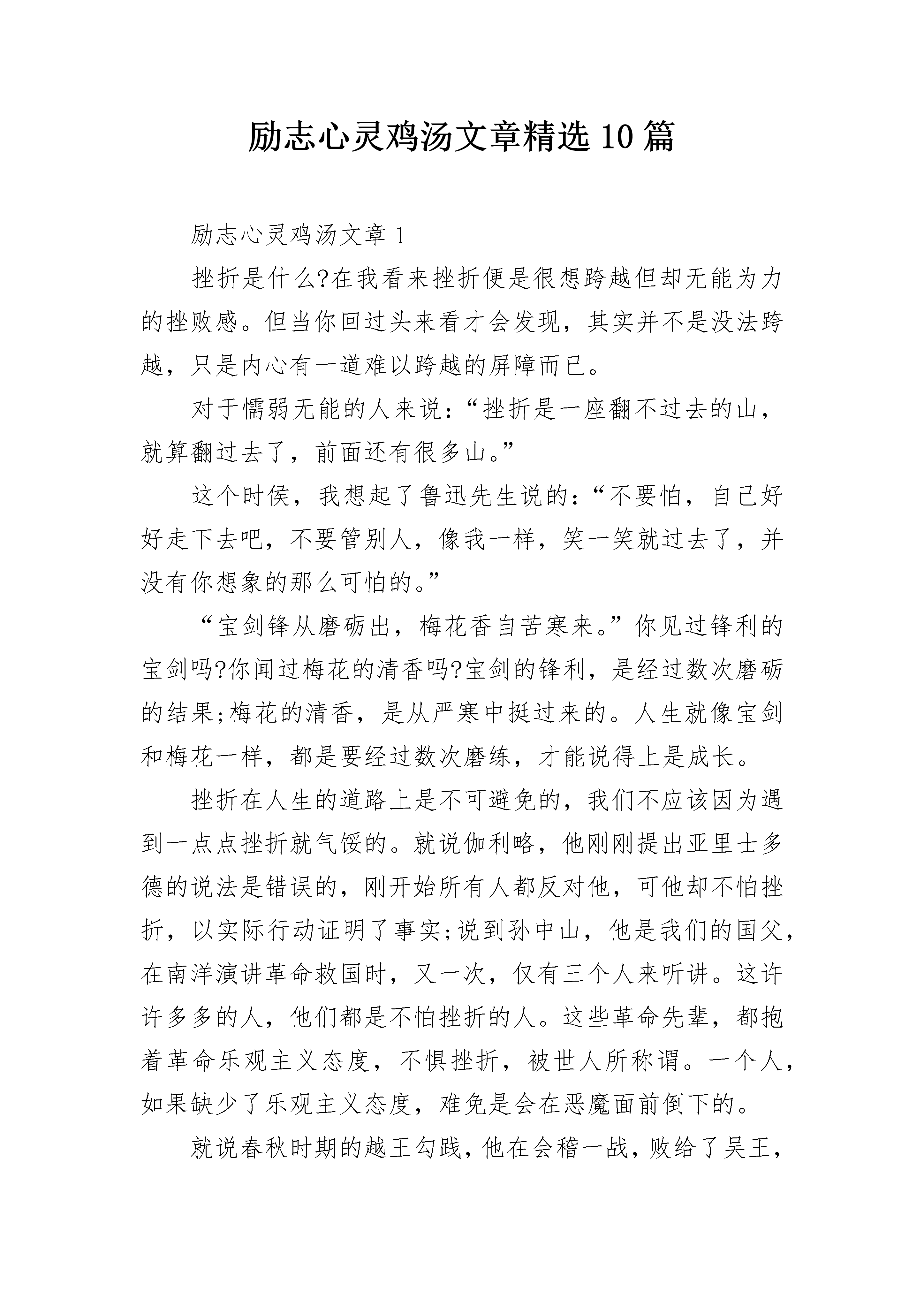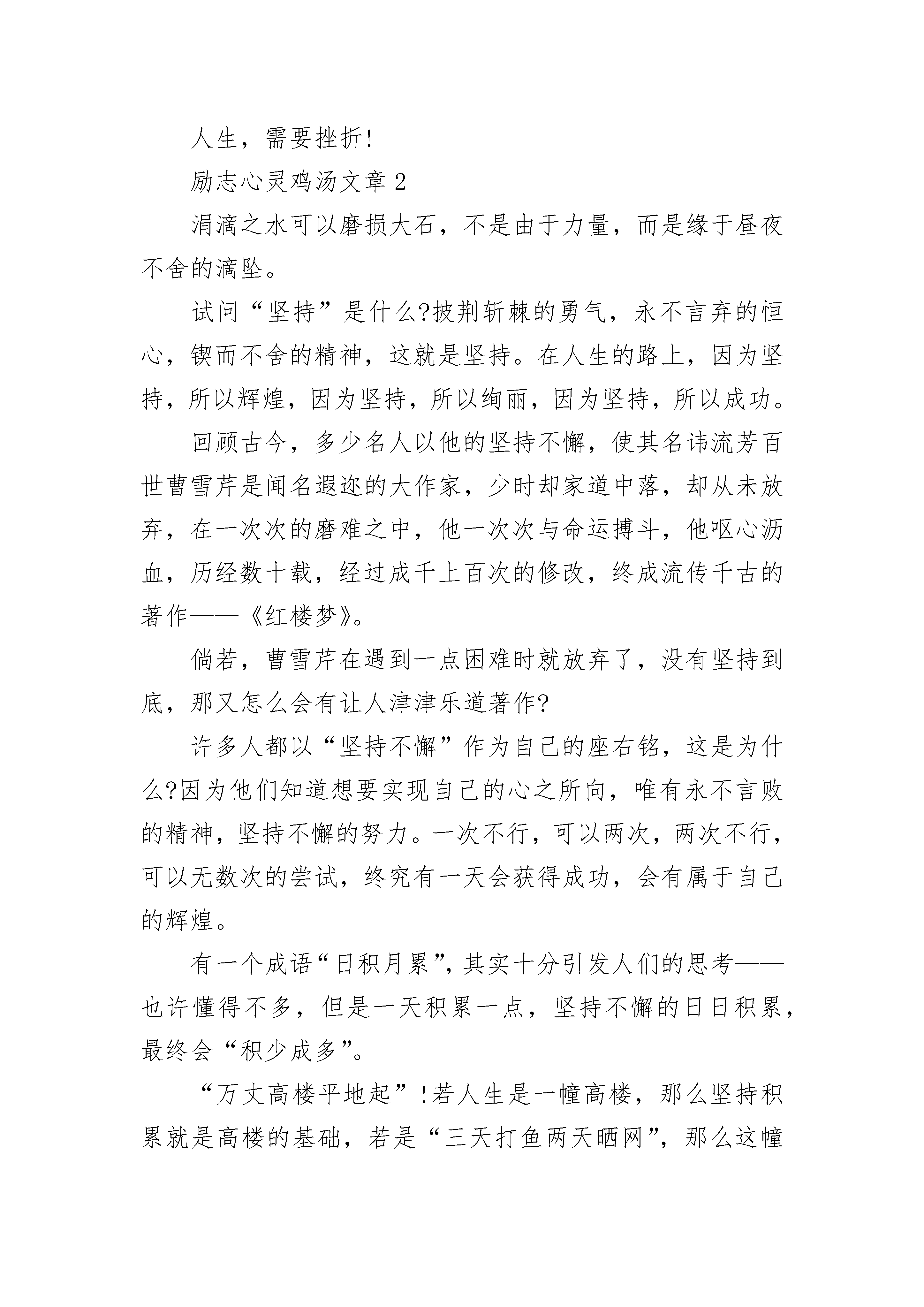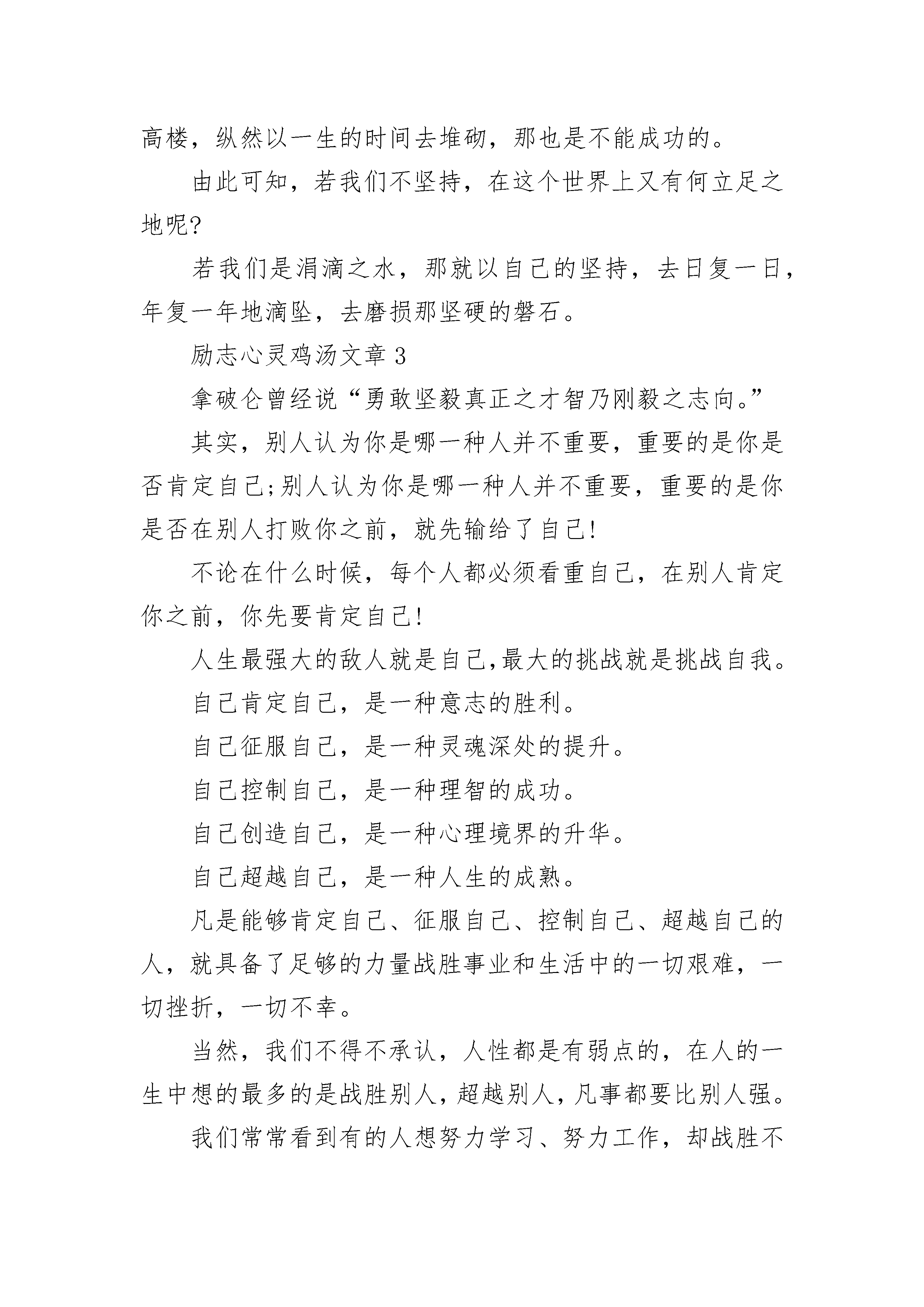 励志心灵鸡汤文章精选10篇励志心灵鸡汤文章1挫折是什么?在我看来挫折便是很想跨越但却无能为力的挫败感。但当你回过头来看才会发现,其实并不是没法跨越,只是内心有一道难以跨越的屏障而已。对于懦弱无能的人来说:“挫折是一座翻不过去的山,就算翻过去了,前面还有很多山。”这个时侯,我想起了鲁迅先生说的:“不要怕,自己好好走下去吧,不要管别人,像我一样,笑一笑就过去了,并没有你想象的那么可怕的。”“宝剑锋从磨砺出,梅花香自苦寒来。”你见过锋利的宝剑吗?你闻过梅花的清香吗?宝剑的锋利,是经过数次磨砺的结果;梅花的清香,是从严寒中挺过来的。人生就像宝剑和梅花一样,都是要经过数次磨练,才能说得上是成长。挫折在人生的道路上是不可避免的,我们不应该因为遇到一点点挫折就气馁的。就说伽利略,他刚刚提出亚里士多德的说法是错误的,刚开始所有人都反对他,可他却不怕挫折,以实际行动证明了事实;说到孙中山,他是我们的国父,在南洋演讲革命救国时,又一次,仅有三个人来听讲。这许许多多的人,他们都是不怕挫折的人。这些革命先辈,都抱着革命乐观主义态度,不惧挫折,被世人所称谓。一个人,如果缺少了乐观主义态度,难免是会在恶魔面前倒下的。就说春秋时期的越王勾践,他在会稽一战,败给了吴王,兵败之后,他只能“审辞厚礼”向吴国求和,等侯时机东山再起。越王勾践先是用美女诱惑吴王,又给吴王献上金银珠宝,贿赂吴王和吴国众臣,还用自己妻子做人质,自己就给吴王当车夫。勾践给吴王端茶送饭,端屎端尿,最后终于得到了吴王的信任,得以被释放回国。勾践死里逃生回到了越国后,卧薪尝胆,一边继续向吴国进献,一边训练军队,到了国富民强、兵强马壮之时,起兵将吴国一举歼灭了。我听见双耳失聪的贝多芬说:“只要经得起挫折向你发起的挑战,挫折就会使你有信心。”站在人生的林荫道上,望着一望无际的前方,我又有了信心。纵观历史,历史上的每一位伟人,他们的背后都有着言不可喻的挫折与痛苦。不经历风雨,怎能见彩虹?人的一生就是如此,没有人是随随便便就能成功的。胜利的桂冠是用刺棘编织而成的。失败预示着成功,就像婴儿一样,刚开始的时候是不会走的,而在经历了数次摔跤之后,才学会了走路的。其实,你也是一颗珍珠,要经受住挫折,闪出作为一颗珍珠应有的光彩!切勿逃避挫折,因为,只有挫折,才能让我们坚强、有自信。请问,挫折是什么?毅力不倒说:“挫折只是风雨,经历了它,就能见到你所想见到的彩虹了。”积极乐观说:“挫折只是眼前的一块石头,把它移开就好了。”人生,需要挫折!励志心灵鸡汤文章2涓滴之水可以磨损大石,不是由于力量,而是缘于昼夜不舍的滴坠。试问“坚持”是什么?披荆斩棘的勇气,永不言弃的恒心,锲而不舍的精神,这就是坚持。在人生的路上,因为坚持,所以辉煌,因为坚持,所以绚丽,因为坚持,所以成功。回顾古今,多少名人以他的坚持不懈,使其名讳流芳百世曹雪芹是闻名遐迩的大作家,少时却家道中落,却从未放弃,在一次次的磨难之中,他一次次与命运搏斗,他呕心沥血,历经数十载,经过成千上百次的修改,终成流传千古的著作——《红楼梦》。倘若,曹雪芹在遇到一点困难时就放弃了,没有坚持到底,那又怎么会有让人津津乐道著作?许多人都以“坚持不懈”作为自己的座右铭,这是为什么?因为他们知道想要实现自己的心之所向,唯有永不言败的精神,坚持不懈的努力。一次不行,可以两次,两次不行,可以无数次的尝试,终究有一天会获得成功,会有属于自己的辉煌。有一个成语“日积月累”,其实十分引发人们的思考——也许懂得不多,但是一天积累一点,坚持不懈的日日积累,最终会“积少成多”。“万丈高楼平地起”!若人生是一幢高楼,那么坚持积累就是高楼的基础,若是“三天打鱼两天晒网”,那么这幢高楼,纵然以一生的时间去堆砌,那也是不能成功的。由此可知,若我们不坚持,在这个世界上又有何立足之地呢?若我们是涓滴之水,那就以自己的坚持,去日复一日,年复一年地滴坠,去磨损那坚硬的磐石。励志心灵鸡汤文章3拿破仑曾经说“勇敢坚毅真正之才智乃刚毅之志向。”其实,别人认为你是哪一种人并不重要,重要的是你是否肯定自己;别人认为你是哪一种人并不重要,重要的是你是否在别人打败你之前,就先输给了自己!不论在什么时候,每个人都必须看重自己,在别人肯定你之前,你先要肯定自己!人生最强大的敌人就是自己,最大的挑战就是挑战自我。自己肯定自己,是一种意志的胜利。自己征服自己,是一种灵魂深处的提升。自己控制自己,是一种理智的成功。自己创造自己,是一种心理境界的升华。自己超越自己,是一种人生的成熟。凡是能够肯定自己、征服自己、控制自己、超越自己的人,就具备了足够的力量战胜事业和生活中的一切艰难,一切挫折,一切不幸。当然,我们不得不承认,人性都是有弱点的,在人的一生中想的最多的是战胜别人,超越别人,凡事都要比别人强。我们常常看到有的人想努力学习、努力工