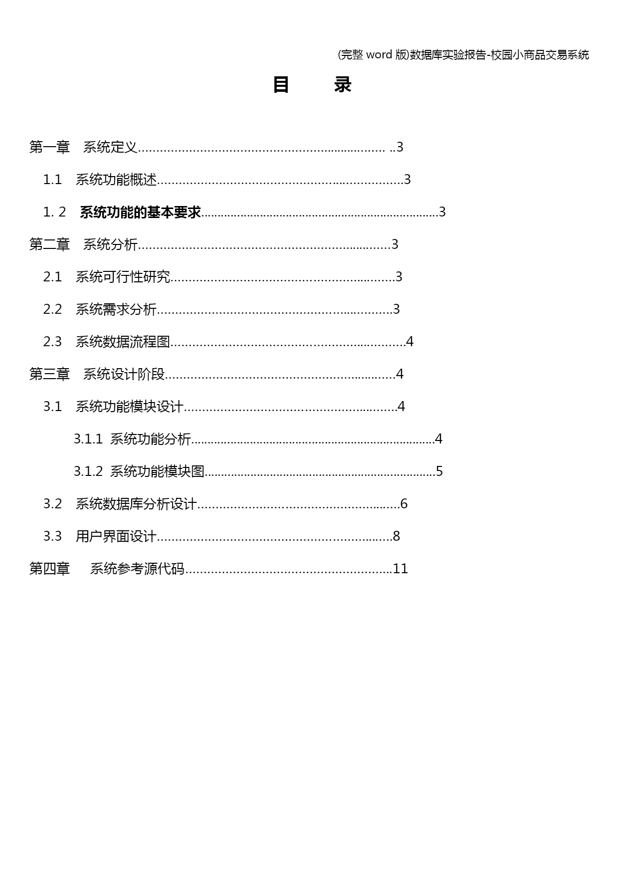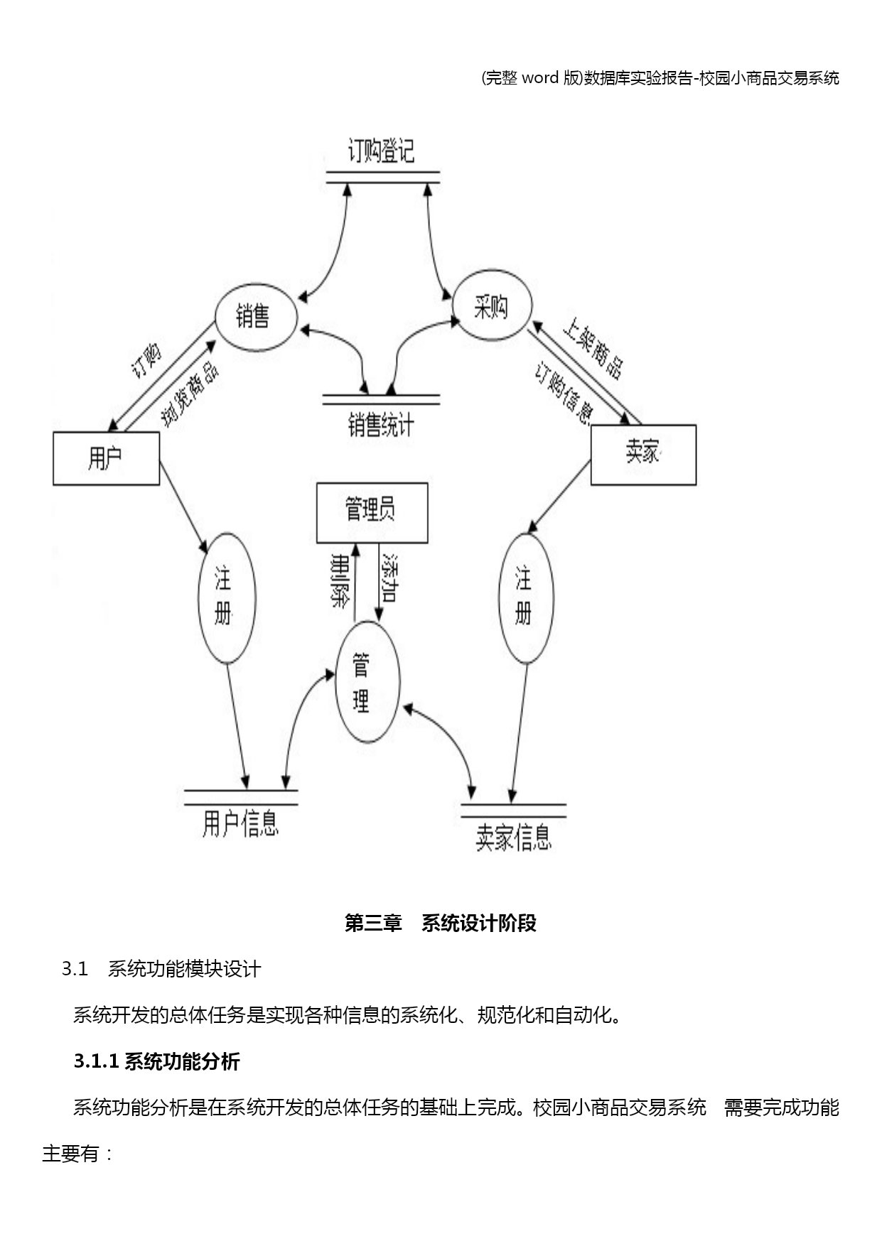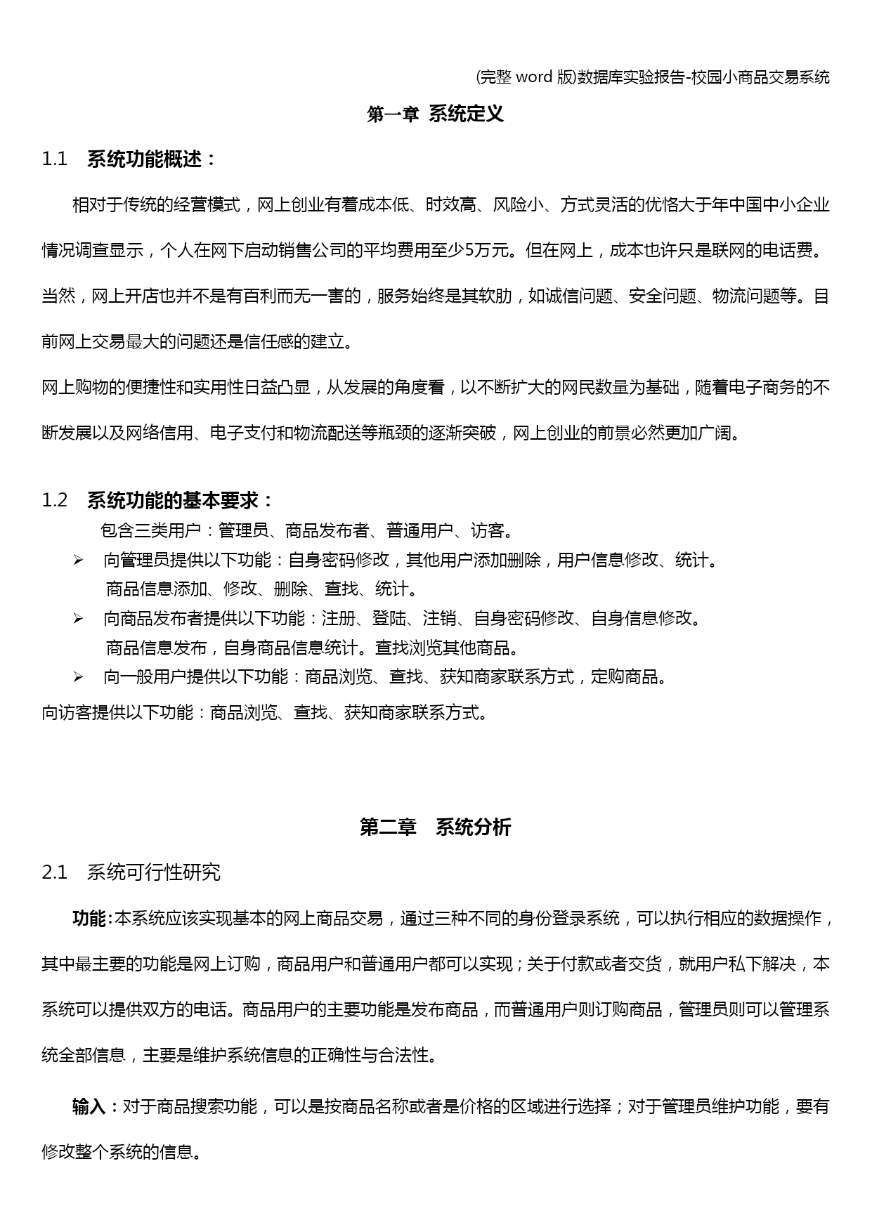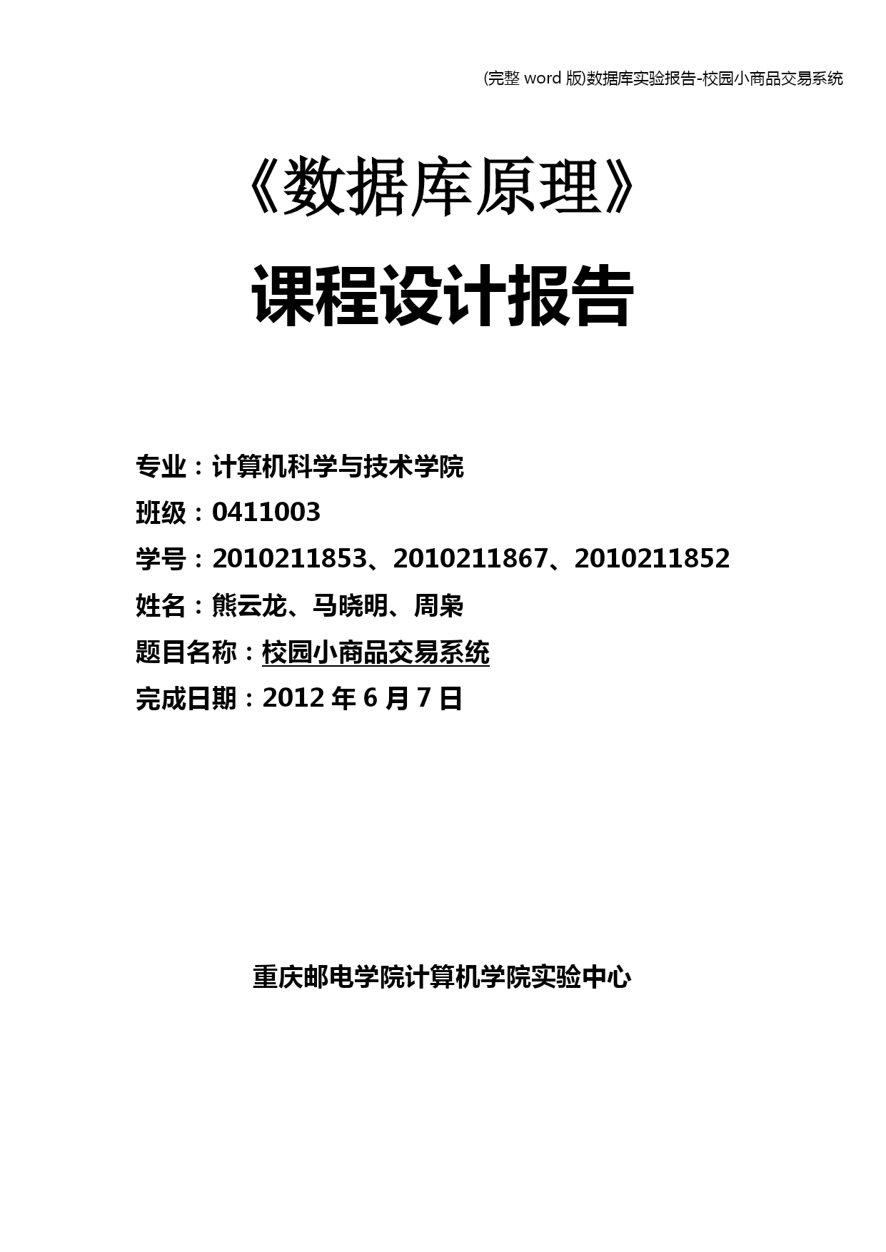 (完整word版)数据库实验报告-校园小商品交易系统 (完整word版)数据库实验报告-校园小商品交易系统 (完整word版)数据库实验报告-校园小商品交易系统 《数据库原理》 课程设计报告 专业:计算机科学与技术学院 班级:0411003 学号:2010211853、2010211867、2010211852 姓名:熊云龙、马晓明、周枭 题目名称:校园小商品交易系统 完成日期:2012年6月7日 重庆邮电学院计算机学院实验中心 目录 第一章系统定义……………………………………………..........….…...3 1.1系统功能概述…………………………………………....…………….3 1.2系统功能的基本要求.........................................................................3 第二章系统分析………………………………………………….......……3 2.1系统可行性研究……………………………………………....…….3 2.2系统需求分析……………………………………………....……….3 2.3系统数据流程图……………………………………………....……….4 第三章系统设计阶段…………………………………………….......……4 3.1系统功能模块设计…………………………………………....…….4 3.1.1系统功能分析...........................................................................4 3.1.2系统功能模块图.......................................................................5 3.2系统数据库分析设计…………………………………………....….6 3.3用户界面设计…………………………………………………....….8 第四章系统参考源代码………………………………………………...11 系统定义 1.1系统功能概述: 相对于传统的经营模式,网上创业有着成本低、时效高、风险小、方式灵活的优恪大于年中国中小企业情况调查显示,个人在网下启动销售公司的平均费用至少5万元。但在网上,成本也许只是联网的电话费。当然,网上开店也并不是有百利而无一害的,服务始终是其软肋,如诚信问题、安全问题、物流问题等。目前网上交易最大的问题还是信任感的建立。 网上购物的便捷性和实用性日益凸显,从发展的角度看,以不断扩大的网民数量为基础,随着电子商务的不断发展以及网络信用、电子支付和物流配送等瓶颈的逐渐突破,网上创业的前景必然更加广阔。 1.2系统功能的基本要求: 包含三类用户:管理员、商品发布者、普通用户、访客。 向管理员提供以下功能:自身密码修改,其他用户添加删除,用户信息修改、统计。 商品信息添加、修改、删除、查找、统计。 向商品发布者提供以下功能:注册、登陆、注销、自身密码修改、自身信息修改。 商品信息发布,自身商品信息统计。查找浏览其他商品。 向一般用户提供以下功能:商品浏览、查找、获知商家联系方式,定购商品。 向访客提供以下功能:商品浏览、查找、获知商家联系方式。 第二章系统分析 2.1系统可行性研究 功能:本系统应该实现基本的网上商品交易,通过三种不同的身份登录系统,可以执行相应的数据操作,其中最主要的功能是网上订购,商品用户和普通用户都可以实现;关于付款或者交货,就用户私下解决,本系统可以提供双方的电话。商品用户的主要功能是发布商品,而普通用户则订购商品,管理员则可以管理系统全部信息,主要是维护系统信息的正确性与合法性。 输入:对于商品搜索功能,可以是按商品名称或者是价格的区域进行选择;对于管理员维护功能,要有修改整个系统的信息。 输出:能按要求在显示器上显示所需信息并能打印成有条理的表格。 安全与保密:对于不同权限用户,设置不同权限,对重要数据可以考虑加密存储。对不同身份登录也设置不同的功能。 2.2系统需求分析 基本信息的维护商品基本信息管理:包括商品基本信息的新建、修改和删除等。商品用户信息管理:包括商品用户信息的注册、修改密码和删除等。普通用户信息管理:包括普通用户信息的添加、删除和修改密码等。2)商品发布商品发布信息管理:商品发布信息包括商品id,名称,价格,商品编号,上架时间等。商品发布管理功能完成商品信息增加、修改等。分类查看:可以根据商品名称或者价格所在区域来查看某种商品的详细信息和卖家情况。最近更新:商品信息的变动可以显示你的商品新鲜度。已有商品:列出当前商品用户已发布的商品。3)订购管理商品订购管理:商品的订购包含商品id