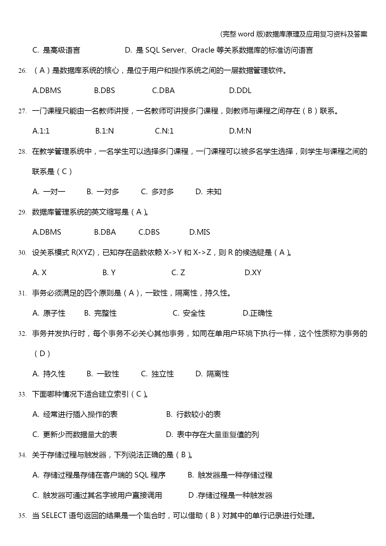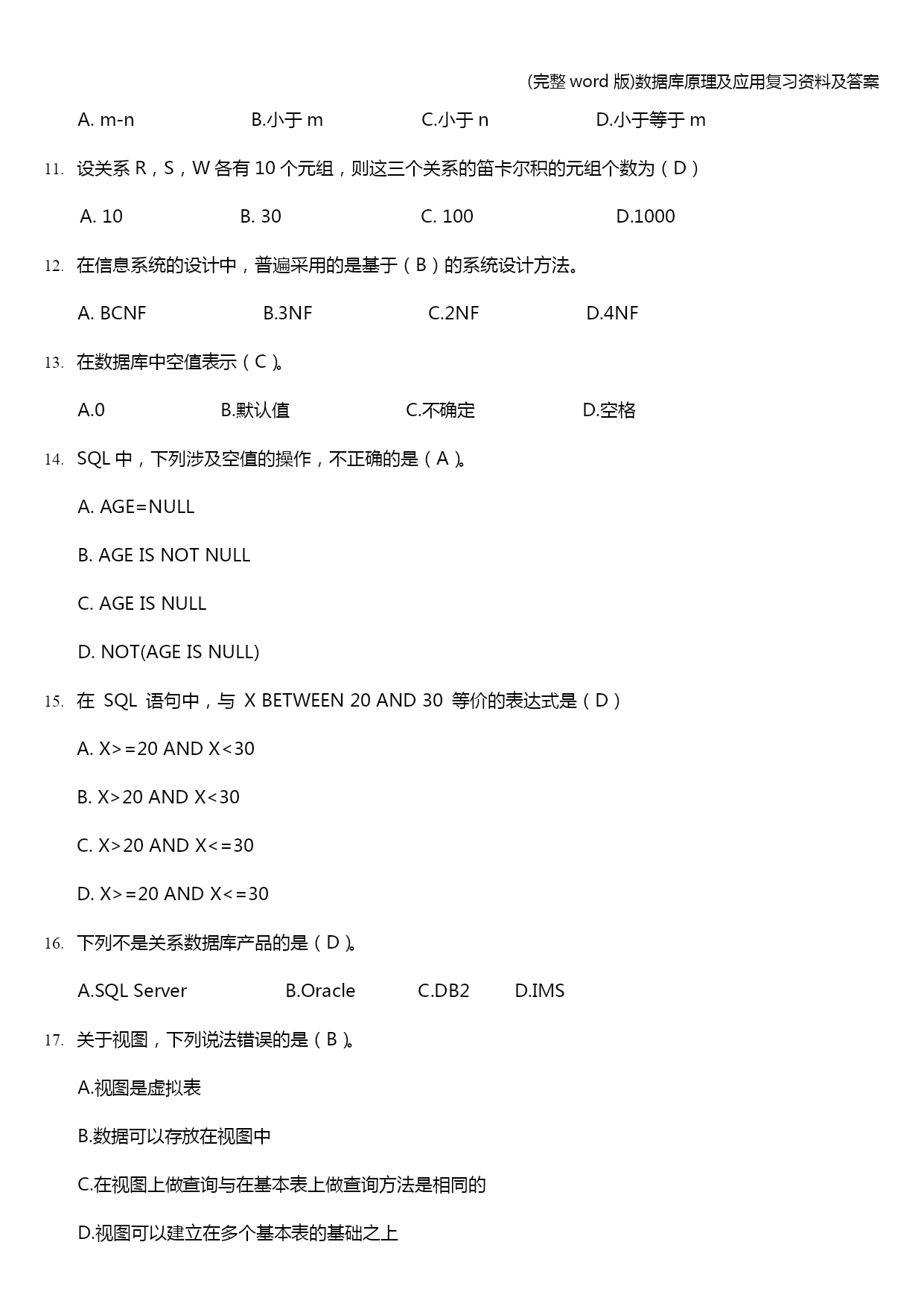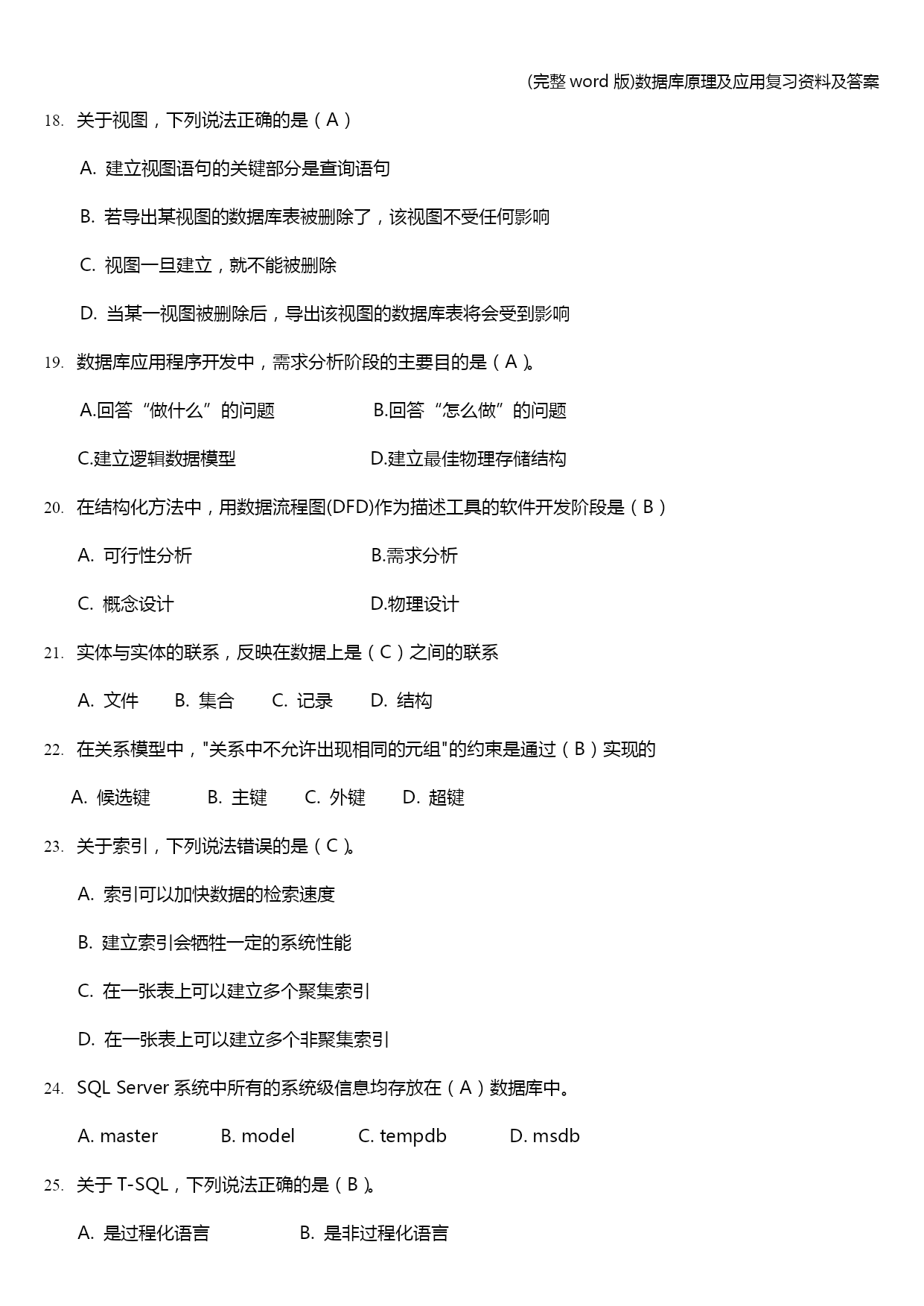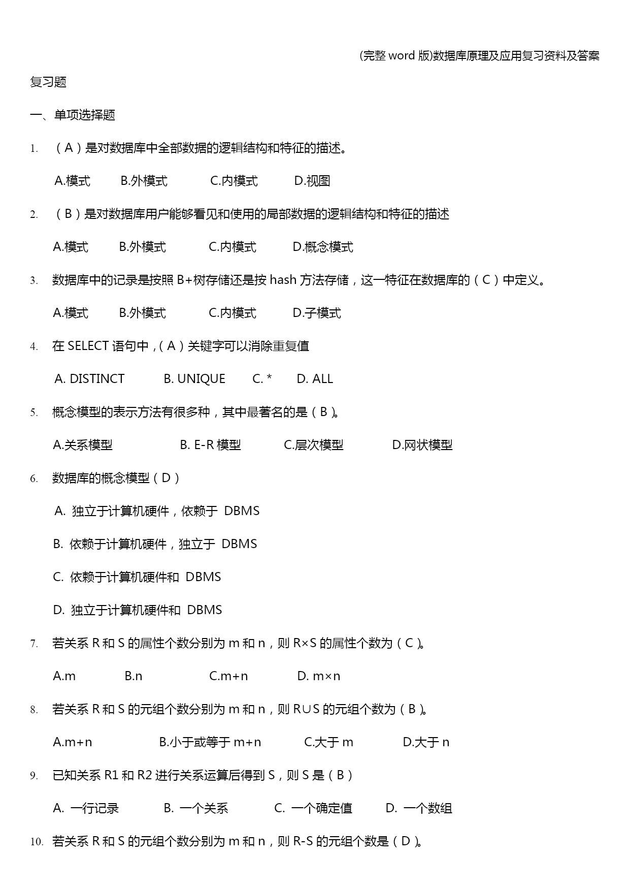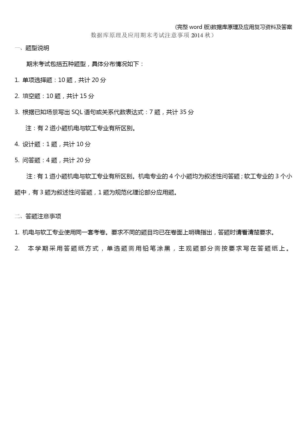 (完整word版)数据库原理及应用复习资料及答案 (完整word版)数据库原理及应用复习资料及答案 (完整word版)数据库原理及应用复习资料及答案 数据库原理及应用期末考试注意事项(2014秋) 题型说明 期末考试包括五种题型,具体分布情况如下: 1.单项选择题:10题,共计20分 2.填空题:10题,共计15分 3.根据已知场景写出SQL语句或关系代数表达式:7题,共计35分 注:有2道小题机电与软工专业有所区别。 4.设计题:1题,共计10分 5.问答题:4题,共计20分 注:有1道小题机电与软工专业有所区别。机电专业的4个小题均为叙述性问答题;软工专业的3个小题中,有3题为叙述性问答题,1题为规范化理论部分应用题。 答题注意事项 1.机电与软工专业使用同一套考卷。要求不同的题目均已在卷面上明确指出,答题时请看清楚要求。 2.本学期采用答题纸方式,单选题需用铅笔涂黑,主观题部分需按要求写在答题纸上。复习题 一、单项选择题 (A)是对数据库中全部数据的逻辑结构和特征的描述。 A.模式B.外模式C.内模式D.视图 (B)是对数据库用户能够看见和使用的局部数据的逻辑结构和特征的描述 A.模式B.外模式C.内模式D.概念模式 数据库中的记录是按照B+树存储还是按hash方法存储,这一特征在数据库的(C)中定义。 A.模式B.外模式C.内模式D.子模式 在SELECT语句中,(A)关键字可以消除重复值 A.DISTINCT B.UNIQUE C.* D.ALL 概念模型的表示方法有很多种,其中最著名的是(B)。 A.关系模型B.E-R模型C.层次模型D.网状模型 数据库的概念模型(D) A.独立于计算机硬件,依赖于DBMS B.依赖于计算机硬件,独立于DBMS C.依赖于计算机硬件和DBMS D.独立于计算机硬件和DBMS 若关系R和S的属性个数分别为m和n,则R×S的属性个数为(C)。 A.mB.nC.m+nD.m×n 若关系R和S的元组个数分别为m和n,则R∪S的元组个数为(B)。 A.m+nB.小于或等于m+nC.大于mD.大于n 已知关系R1和R2进行关系运算后得到S,则S是(B) A.一行记录 B.一个关系 C.一个确定值 D.一个数组 若关系R和S的元组个数分别为m和n,则R-S的元组个数是(D)。 A.m-nB.小于mC.小于nD.小于等于m 设关系R,S,W各有10个元组,则这三个关系的笛卡尔积的元组个数为(D) A.10 B.30 C.100 D.1000 在信息系统的设计中,普遍采用的是基于(B)的系统设计方法。 A.BCNFB.3NFC.2NFD.4NF 在数据库中空值表示(C)。 A.0B.默认值C.不确定D.空格 SQL中,下列涉及空值的操作,不正确的是(A)。 A.AGE=NULL B.AGEISNOTNULL C.AGEISNULL D.NOT(AGEISNULL) 在SQL语句中,与XBETWEEN20AND30等价的表达式是(D) A.X>=20ANDX<30 B.X>20ANDX<30 C.X>20ANDX<=30 D.X>=20ANDX<=30 下列不是关系数据库产品的是(D)。 A.SQLServerB.OracleC.DB2D.IMS 关于视图,下列说法错误的是(B)。 A.视图是虚拟表 B.数据可以存放在视图中 C.在视图上做查询与在基本表上做查询方法是相同的 D.视图可以建立在多个基本表的基础之上 关于视图,下列说法正确的是(A) A.建立视图语句的关键部分是查询语句 B.若导出某视图的数据库表被删除了,该视图不受任何影响 C.视图一旦建立,就不能被删除 D.当某一视图被删除后,导出该视图的数据库表将会受到影响 数据库应用程序开发中,需求分析阶段的主要目的是(A)。 A.回答“做什么”的问题B.回答“怎么做”的问题 C.建立逻辑数据模型D.建立最佳物理存储结构 在结构化方法中,用数据流程图(DFD)作为描述工具的软件开发阶段是(B) A.可行性分析B.需求分析 C.概念设计D.物理设计 实体与实体的联系,反映在数据上是(C)之间的联系 A.文件 B.集合 C.记录 D.结构 在关系模型中,"关系中不允许出现相同的元组"的约束是通过(B)实现的 A.候选键 B.主键 C.外键 D.超键 关于索引,下列说法错误的是(C)。 A.索引可以加快数据的检索速度 B.建立索引会牺牲一定的系统性能 C.在一张表上可以建立多个聚集索引 D.在一张表上可以建立多个非聚集索引 SQLServer系统中所有的系统级信息均存放在(A)数据库中。 A.masterB.modelC.tempdbD.msdb 关于T-SQL,下列说法正确的是(B)。 A.是过程化语言B.是非过程化语言