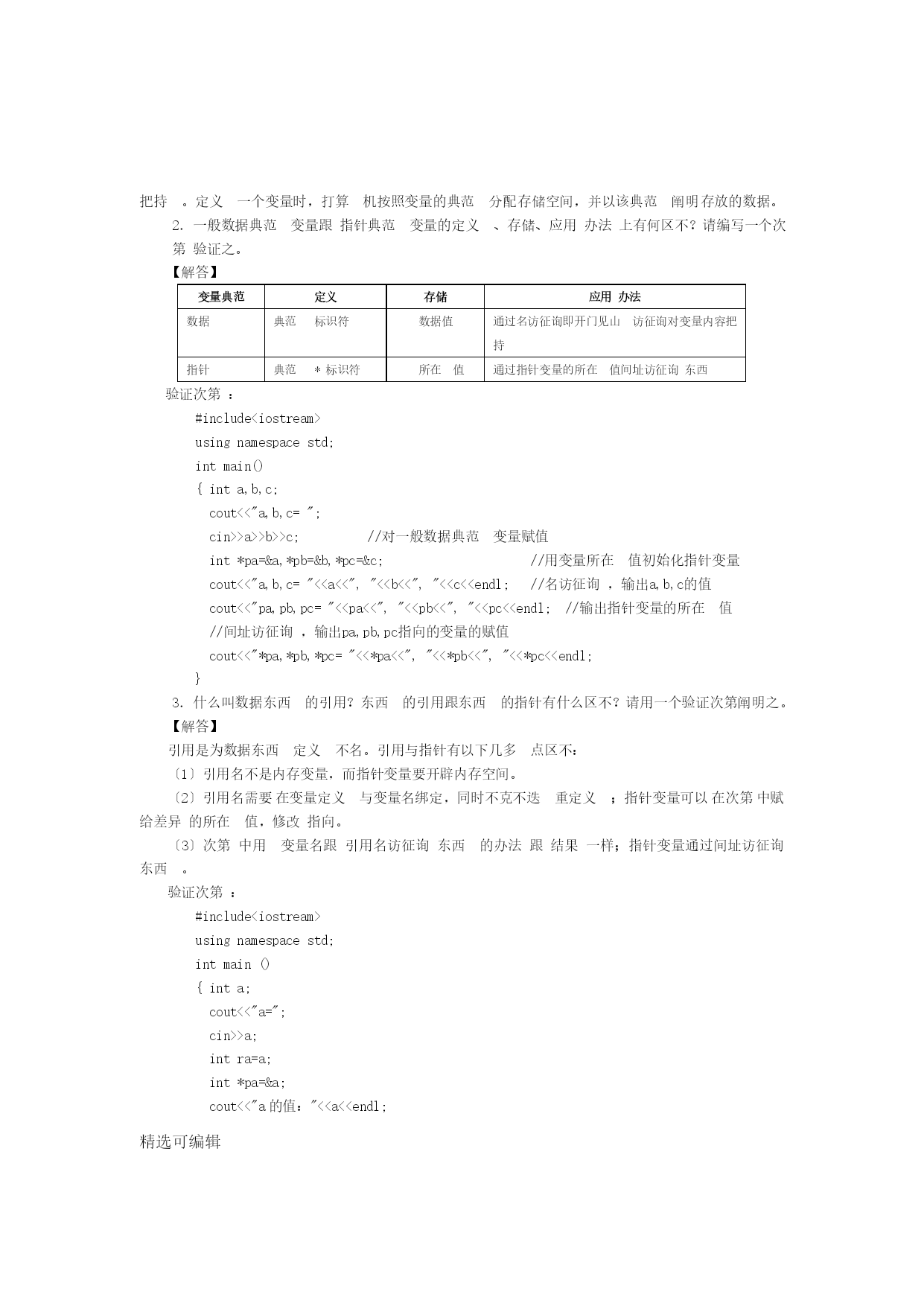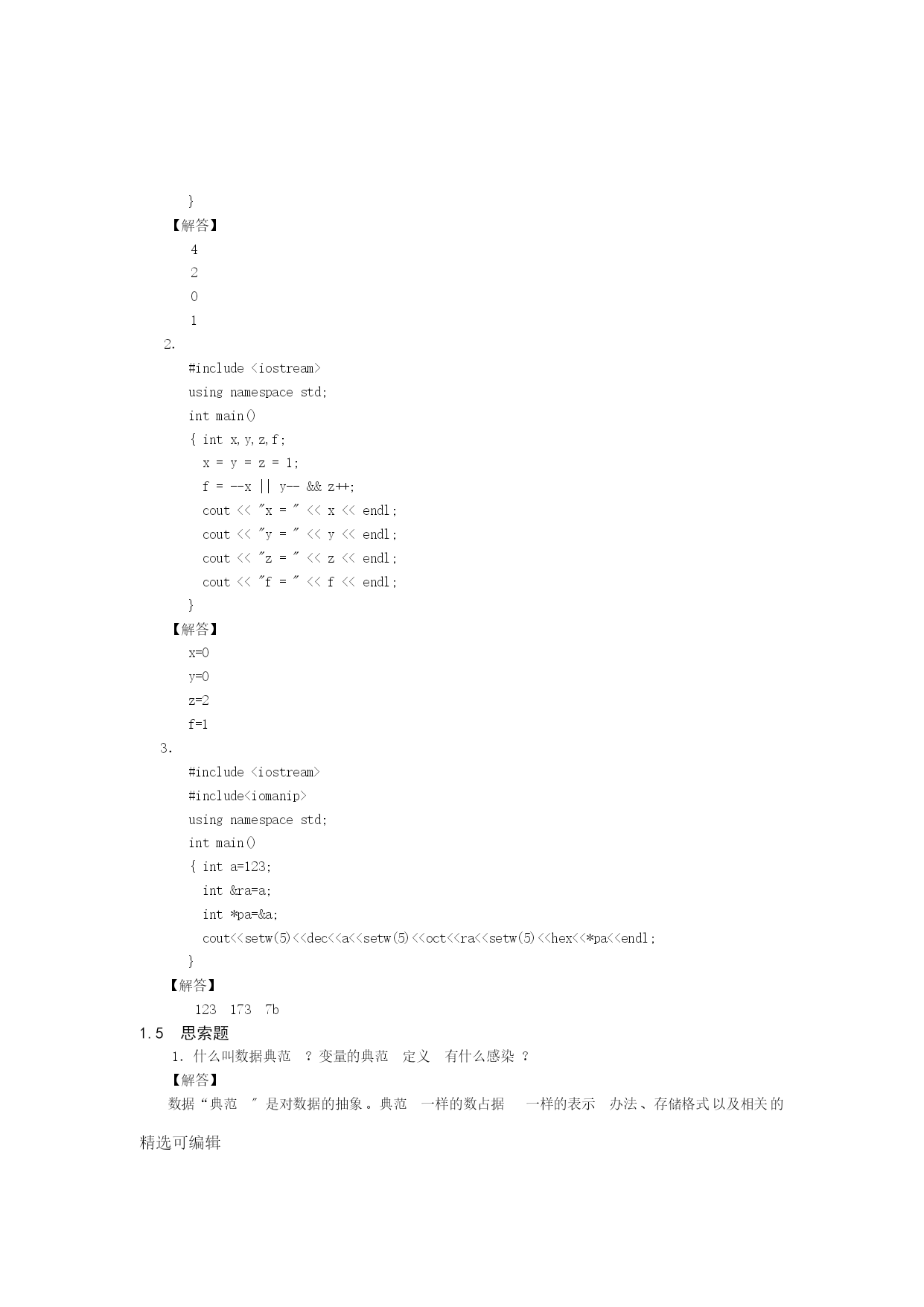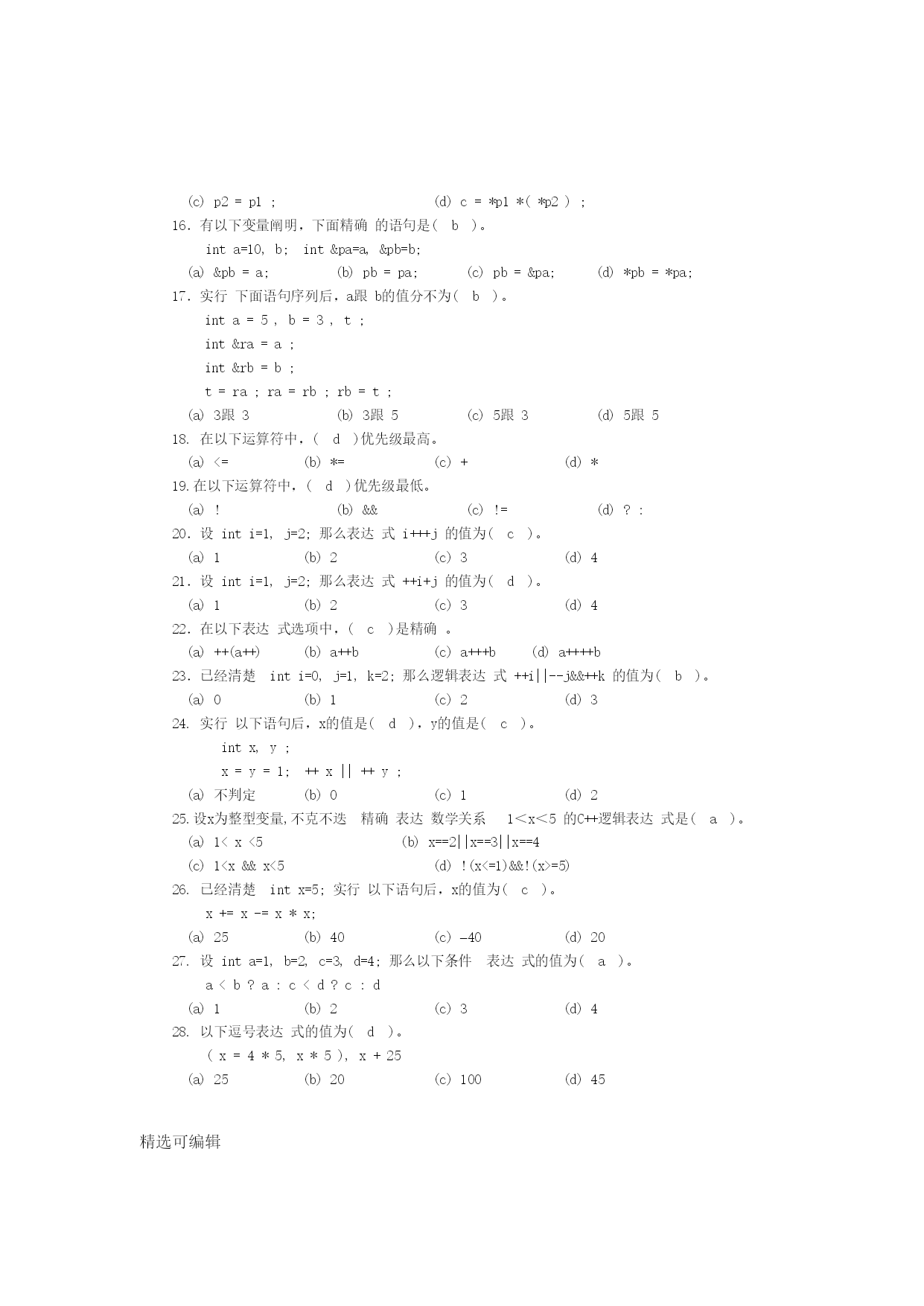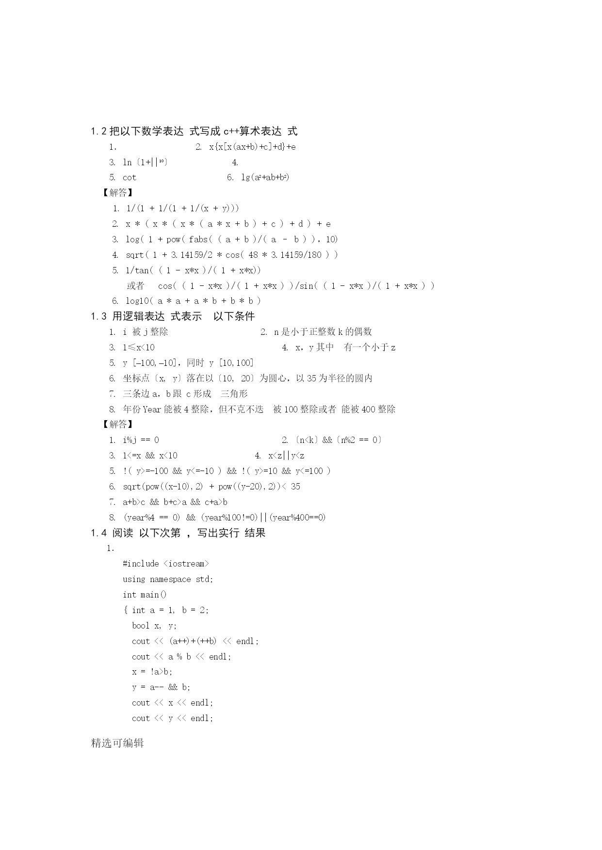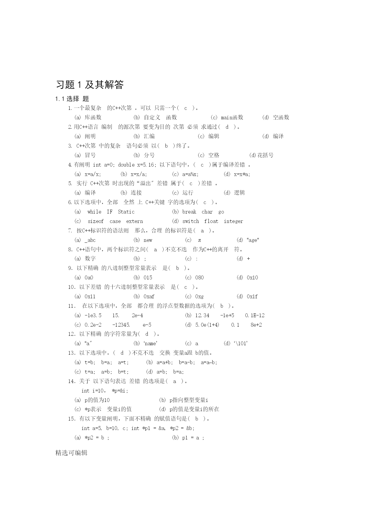 精选可编辑 习题1及其解答 1.1选择题 1.一个最复杂的C++次第,可以只需一个(c)。 (a)库函数 (b)自定义函数 (c)main函数 (d)空函数 2.用C++语言编制的源次第要变为目的次第必须求通过(d)。 (a)阐明 (b)汇编 (c)编辑 (d)编译 3.C++次第中的复杂语句必须以(b)终了。 (a)冒号 (b)分号 (c)空格 (d)花括号 4.有阐明inta=0;doublex=5.16;以下语句中,(c)属于编译差错。 (a)x=a/x; (b)x=x/a; (c)a=a%x; (d)x=x*a; 5.实行C++次第时出现的“溢出〞差错属于(c)差错。 (a)编译 (b)连接 (c)运行 (d)逻辑 6.以下选项中,全部全然上C++关键字的选项为(c)。 (a)whileIFStatic (b)breakchargo (c)sizeofcaseextern (d)switchfloatinteger 7.按C++标识符的语法则那么,合理的标识符是(a)。 (a)_abc (b)new (c)π (d)“age“ 8.C++语句中,两个标识符之间(a)不克不迭作为C++的离开符。 (a)数字 (b); (c): (d)+ 9.以下精确的八进制整型常量表示是(b)。 (a)0a0 (b)015 (c)080 (d)0x10 10.以下差错的十六进制整型常量表示是(c)。 (a)0x11 (b)0xaf (c)0xg (d)0x1f 11.在以下选项中,全部都合理的浮点型数据的选项为(b)。 (a)-1e3.515.2e-4 (b)12.34-1e+50.1E-12 (c)0.2e-2-12345.e-5 (d)5.0e(1+4)0.18e+2 12.以下精确的字符常量为(d)。 (a)“a〞 (b)‘name’ (c)a (d)‘\101’ 13.以下选项中,(d)不克不迭交换变量a跟b的值。 (a)t=b;b=a;a=t; (b)a=a+b;b=a-b;a=a–b; (c)t=a;a=b;b=t; (d)a=b;b=a; 14.关于以下语句表达差错的选项是(a)。 inti=10,*p=&i; (a)p的值为10 (b)p指向整型变量i (c)*p表示变量i的值 (d)p的值是变量i的所在 15.有以下变量阐明,下面不精确的赋值语句是(b)。 inta=5,b=10,c;int*p1=&a,*p2=&b; (a)*p2=b; (b)p1=a; (c)p2=p1; (d)c=*p1*(*p2); 16.有以下变量阐明,下面精确的语句是(b)。 inta=10,b;int&pa=a,&pb=b; (a)&pb=a; (b)pb=pa; (c)pb=&pa; (d)*pb=*pa; 17.实行下面语句序列后,a跟b的值分不为(b)。 inta=5,b=3,t; int&ra=a; int&rb=b; t=ra;ra=rb;rb=t; (a)3跟3 (b)3跟5 (c)5跟3 (d)5跟5 18.在以下运算符中,(d)优先级最高。 (a)<= (b)*= (c)+ (d)* 19.在以下运算符中,(d)优先级最低。 (a)! (b)&& (c)!= (d)?: 20.设inti=1,j=2;那么表达式i+++j的值为(c)。 (a)1 (b)2 (c)3 (d)4 21.设inti=1,j=2;那么表达式++i+j的值为(d)。 (a)1 (b)2 (c)3 (d)4 22.在以下表达式选项中,(c)是精确。 (a)++(a++) (b)a++b (c)a+++b (d)a++++b 23.已经清楚inti=0,j=1,k=2;那么逻辑表达式++i||--j&&++k的值为(b)。 (a)0 (b)1 (c)2 (d)3 24.实行以下语句后,x的值是(d),y的值是(c)。 intx,y; x=y=1;++x||++y; (a)不判定 (b)0 (c)1 (d)2 25.设x为整型变量,不克不迭精确表达数学关系1<x<5的C++逻辑表达式是(a)。 (a)1<x<5 (b)x==2||x==3||x==4 (c)1<x&&x<5 (d)!(x<=1)&&!(x>=5) 26.已经清楚intx=5;实行以下语句后,x的值为(c)。 x+=x-=x*x; (a)25 (b)40 (c)–40 (d)20 27.设inta=1,b=2,c=3,