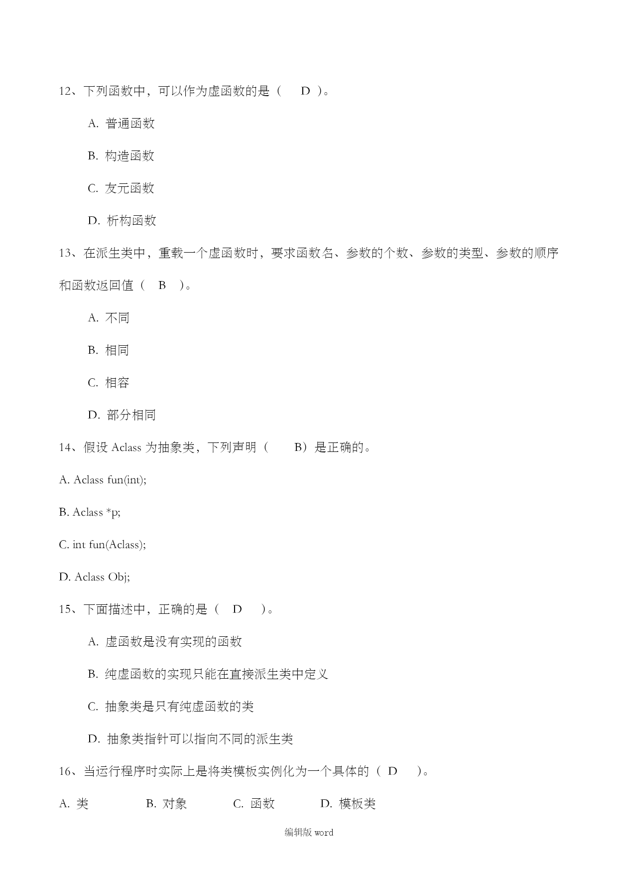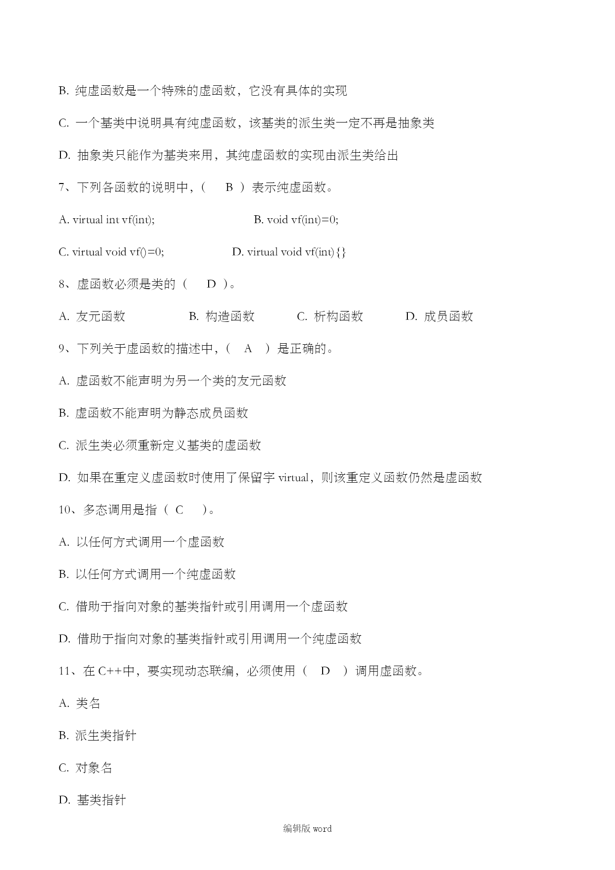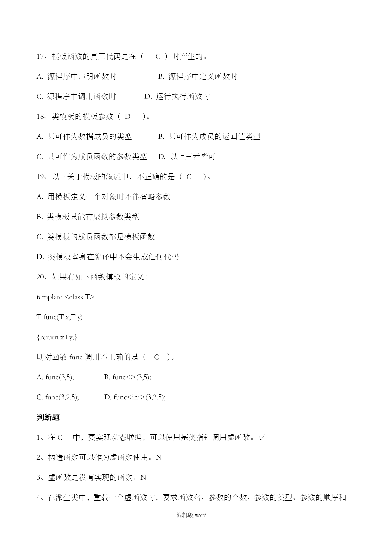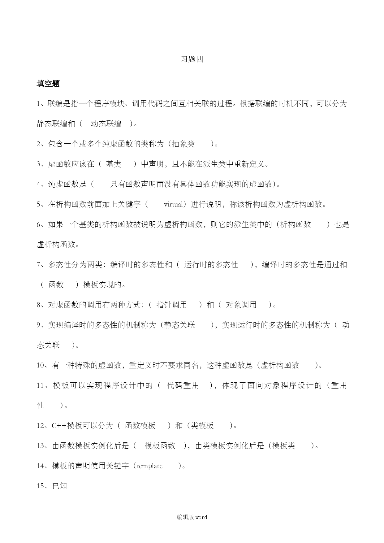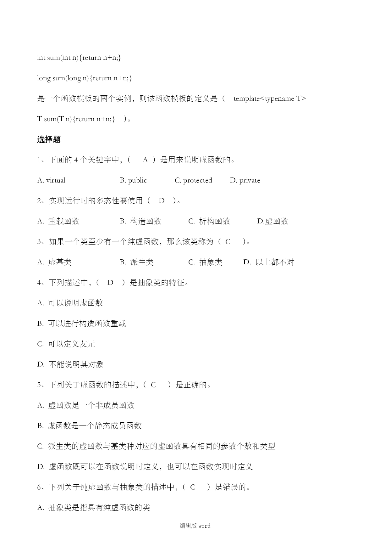 编辑版word 编辑版word 编辑版word 习题四 填空题 1、联编是指一个程序模块、调用代码之间互相关联的过程。根据联编的时机不同,可以分为静态联编和(动态联编)。 2、包含一个或多个纯虚函数的类称为(抽象类)。 3、虚函数应该在(基类)中声明,且不能在派生类中重新定义。 4、纯虚函数是(只有函数声明而没有具体函数功能实现的虚函数)。 5、在析构函数前面加上关键字(virtual)进行说明,称该析构函数为虚析构函数。 6、如果一个基类的析构函数被说明为虚析构函数,则它的派生类中的(析构函数)也是虚析构函数。 7、多态性分为两类:编译时的多态性和(运行时的多态性),编译时的多态性是通过和(函数)模板实现的。 8、对虚函数的调用有两种方式:(指针调用)和(对象调用)。 9、实现编译时的多态性的机制称为(静态关联),实现运行时的多态性的机制称为(动态关联)。 10、有一种特殊的虚函数,重定义时不要求同名,这种虚函数是(虚析构函数)。 11、模板可以实现程序设计中的(代码重用),体现了面向对象程序设计的(重用性)。 12、C++模板可以分为(函数模板)和(类模板)。 13、由函数模板实例化后是(模板函数),由类模板实例化后是(模板类)。 14、模板的声明使用关键字(template)。 15、已知 intsum(intn){returnn+n;} longsum(longn){returnn+n;} 是一个函数模板的两个实例,则该函数模板的定义是(template<typenameT> Tsum(Tn){returnn+n;})。 选择题 1、下面的4个关键字中,(A)是用来说明虚函数的。 A.virtual B.public C.protected D.private 2、实现运行时的多态性要使用(D)。 A.重载函数 B.构造函数 C.析构函数 D.虚函数 3、如果一个类至少有一个纯虚函数,那么该类称为(C)。 A.虚基类 B.派生类 C.抽象类 D.以上都不对 4、下列描述中,(D)是抽象类的特征。 A.可以说明虚函数 B.可以进行构造函数重载 C.可以定义友元 D.不能说明其对象 5、下列关于虚函数的描述中,(C)是正确的。 A.虚函数是一个非成员函数 B.虚函数是一个静态成员函数 C.派生类的虚函数与基类种对应的虚函数具有相同的参数个数和类型 D.虚函数既可以在函数说明时定义,也可以在函数实现时定义 6、下列关于纯虚函数与抽象类的描述中,(C)是错误的。 A.抽象类是指具有纯虚函数的类 B.纯虚函数是一个特殊的虚函数,它没有具体的实现 C.一个基类中说明具有纯虚函数,该基类的派生类一定不再是抽象类 D.抽象类只能作为基类来用,其纯虚函数的实现由派生类给出 7、下列各函数的说明中,(B)表示纯虚函数。 A.virtualintvf(int); B.voidvf(int)=0; C.virtualvoidvf()=0; D.virtualvoidvf(int){} 8、虚函数必须是类的(D)。 A.友元函数 B.构造函数 C.析构函数 D.成员函数 9、下列关于虚函数的描述中,(A)是正确的。 A.虚函数不能声明为另一个类的友元函数 B.虚函数不能声明为静态成员函数 C.派生类必须重新定义基类的虚函数 D.如果在重定义虚函数时使用了保留字virtual,则该重定义函数仍然是虚函数 10、多态调用是指(C)。 A.以任何方式调用一个虚函数 B.以任何方式调用一个纯虚函数 C.借助于指向对象的基类指针或引用调用一个虚函数 D.借助于指向对象的基类指针或引用调用一个纯虚函数 11、在C++中,要实现动态联编,必须使用(D)调用虚函数。 A.类名 B.派生类指针 C.对象名 D.基类指针 12、下列函数中,可以作为虚函数的是(D)。 A.普通函数 B.构造函数 C.友元函数 D.析构函数 13、在派生类中,重载一个虚函数时,要求函数名、参数的个数、参数的类型、参数的顺序和函数返回值(B)。 A.不同 B.相同 C.相容 D.部分相同 14、假设Aclass为抽象类,下列声明(B)是正确的。 A.Aclassfun(int); B.Aclass*p; C.intfun(Aclass); D.AclassObj; 15、下面描述中,正确的是(D)。 A.虚函数是没有实现的函数 B.纯虚函数的实现只能在直接派生类中定义 C.抽象类是只有纯虚函数的类 D.抽象类指针可以指向不同的派生类 16、当运行程序时实际上是将类模板实例化为一个具体的(D)。 A.类 B.对象 C.函数 D.模板类 17、模板函数的真正代码是在(C)时产生的。 A.源程序中声明函数时 B.源程序中