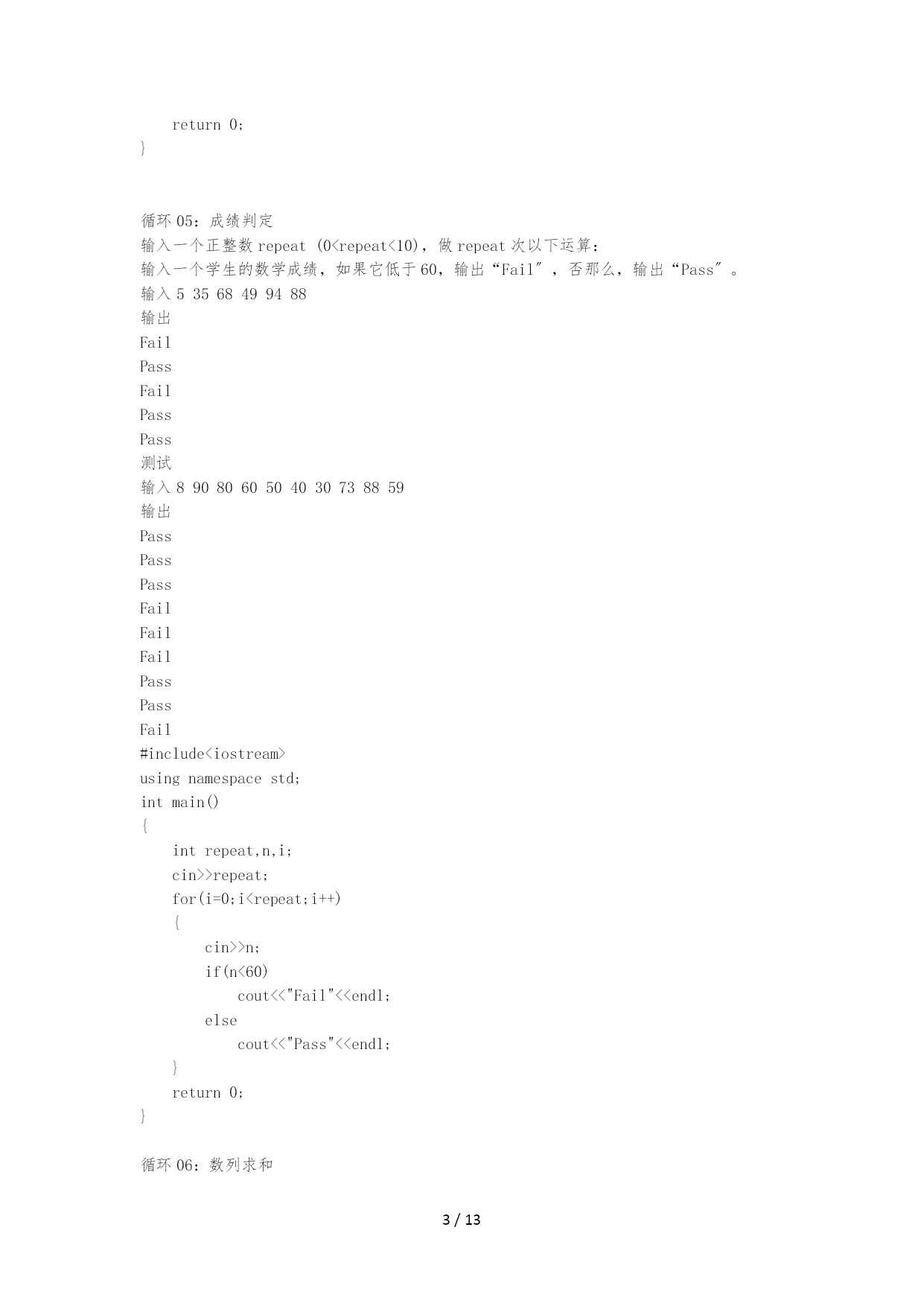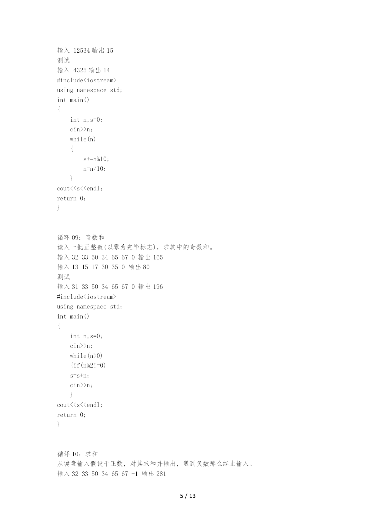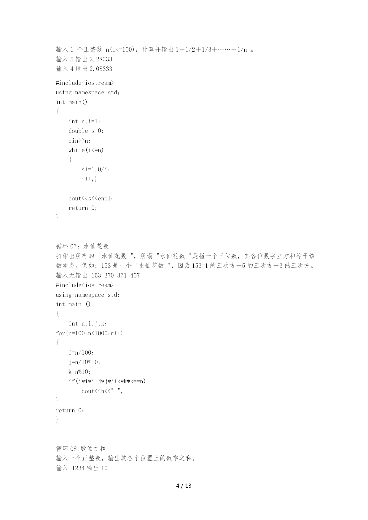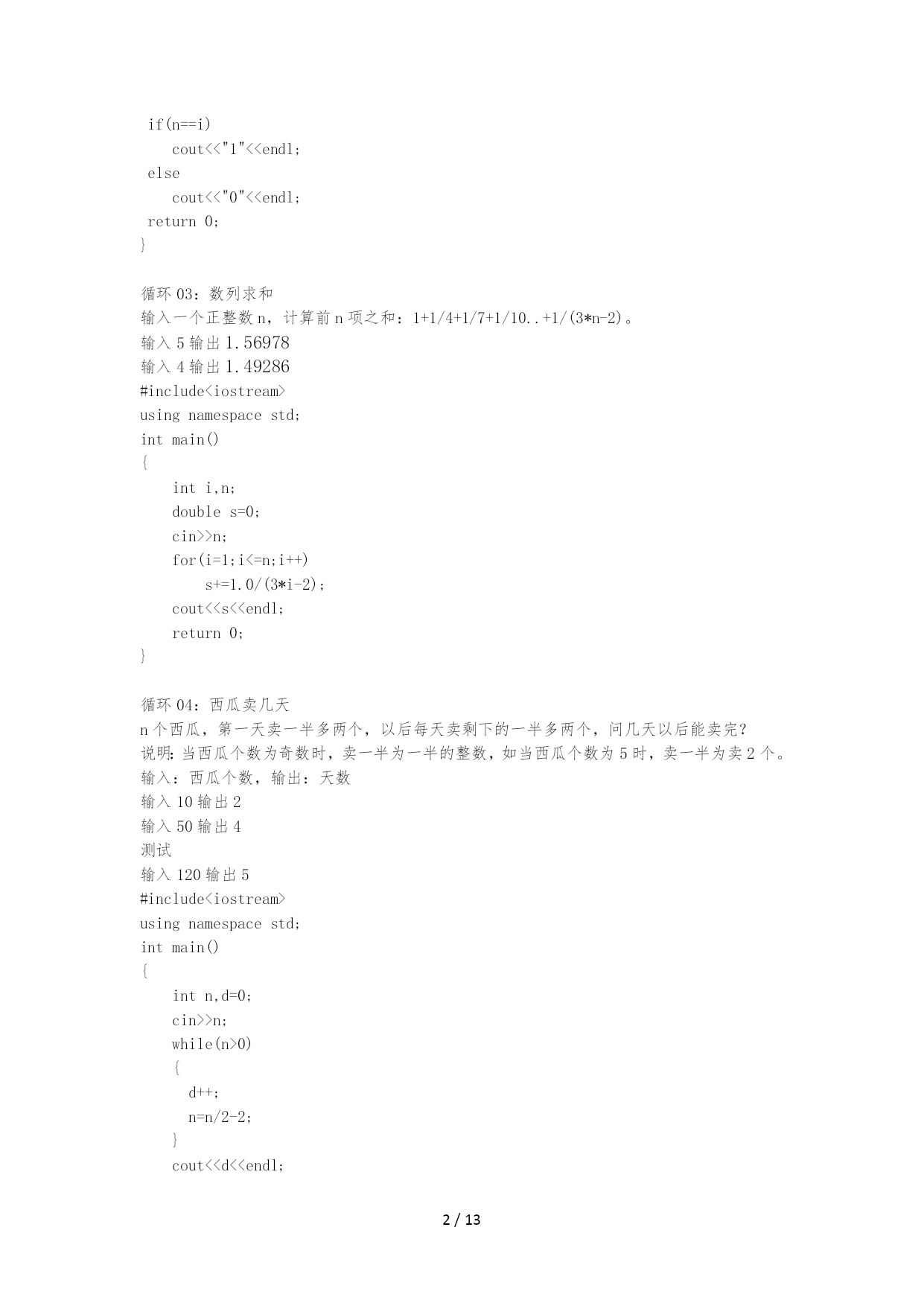 /NUMPAGES13 题目、描述、输入、输出、输入样例、输出样例、测试输入、测试输出 循环01:最大数 写一个程序,可以输入一批正数,输入0时完毕循环,并且输出最大的正数。 输入392856318270 输出63 测试: 输入153269632875901560 输出963 #include<iostream> usingnamespacestd; intmain() { inti,max=0; cin>>i; while(i!=0) { if(i>max) max=i; cin>>i; } cout<<max<<endl; return0; } 循环02:素数 输入正数n,判断n是否为素数。假设为素数那么输出1,否那么输出0。〔提示:素数是指只可以被1和其本身整除的正数〔1除外〕〕 输入10输出0 输入7输出1 测试: 输入9输出0 #include<iostream> usingnamespacestd; intmain() { intn,i,d; cin>>n; for(i=2;i<n;i++) {d=n%i; if(n%i==0) break; } if(n==i) cout<<"1"<<endl; else cout<<"0"<<endl; return0; } 循环03:数列求和 输入一个正整数n,计算前n项之和:1+1/4+1/7+1/10..+1/(3*n-2)。 输入5输出1.56978 输入4输出1.49286 #include<iostream> usingnamespacestd; intmain() { inti,n; doubles=0; cin>>n; for(i=1;i<=n;i++) s+=1.0/(3*i-2); cout<<s<<endl; return0; } 循环04:西瓜卖几天 n个西瓜,第一天卖一半多两个,以后每天卖剩下的一半多两个,问几天以后能卖完? 说明:当西瓜个数为奇数时,卖一半为一半的整数,如当西瓜个数为5时,卖一半为卖2个。 输入:西瓜个数,输出:天数 输入10输出2 输入50输出4 测试 输入120输出5 #include<iostream> usingnamespacestd; intmain() { intn,d=0; cin>>n; while(n>0) { d++; n=n/2-2; } cout<<d<<endl; return0; } 循环05:成绩判定 输入一个正整数repeat(0<repeat<10),做repeat次以下运算: 输入一个学生的数学成绩,如果它低于60,输出“Fail〞,否那么,输出“Pass〞。 输入53568499488 输出 Fail Pass Fail Pass Pass 测试 输入8908060504030738859 输出 Pass Pass Pass Fail Fail Fail Pass Pass Fail #include<iostream> usingnamespacestd; intmain() { intrepeat,n,i; cin>>repeat; for(i=0;i<repeat;i++) { cin>>n; if(n<60) cout<<"Fail"<<endl; else cout<<"Pass"<<endl; } return0; } 循环06:数列求和 输入1个正整数n(n<=100),计算并输出1+1/2+1/3+……+1/n。 输入5输出2.28333输入4输出2.08333 #include<iostream> usingnamespacestd; intmain() { intn,i=1; doubles=0; cin>>n; while(i<=n) { s+=1.0/i; i++;} cout<<s<<endl; return0; } 循环07:水仙花数 打印出所有的"水仙花数",所谓"水仙花数"是指一个三位数,其各位数字立方和等于该 数本身。例如:153是一个"水仙花数",因为153=1的三次方+5的三次方+3的三次方。 输入无输出153370371407 #include<iostream> usingnamespacestd; intmain() { intn,i,j,k; for(n=100;n<1000;n++) { i=n/100; j=n/10%10; k=n%10; if(i*i*i+j*j*j+k*k*k==n) cout<<n<<""; } return0; } 循环08:数位之和 输入一个正整数,输出其各个位置上的数字之和。 输入1234输出10 输入12534输出15 测试 输入4325输出14 #include<iostream>