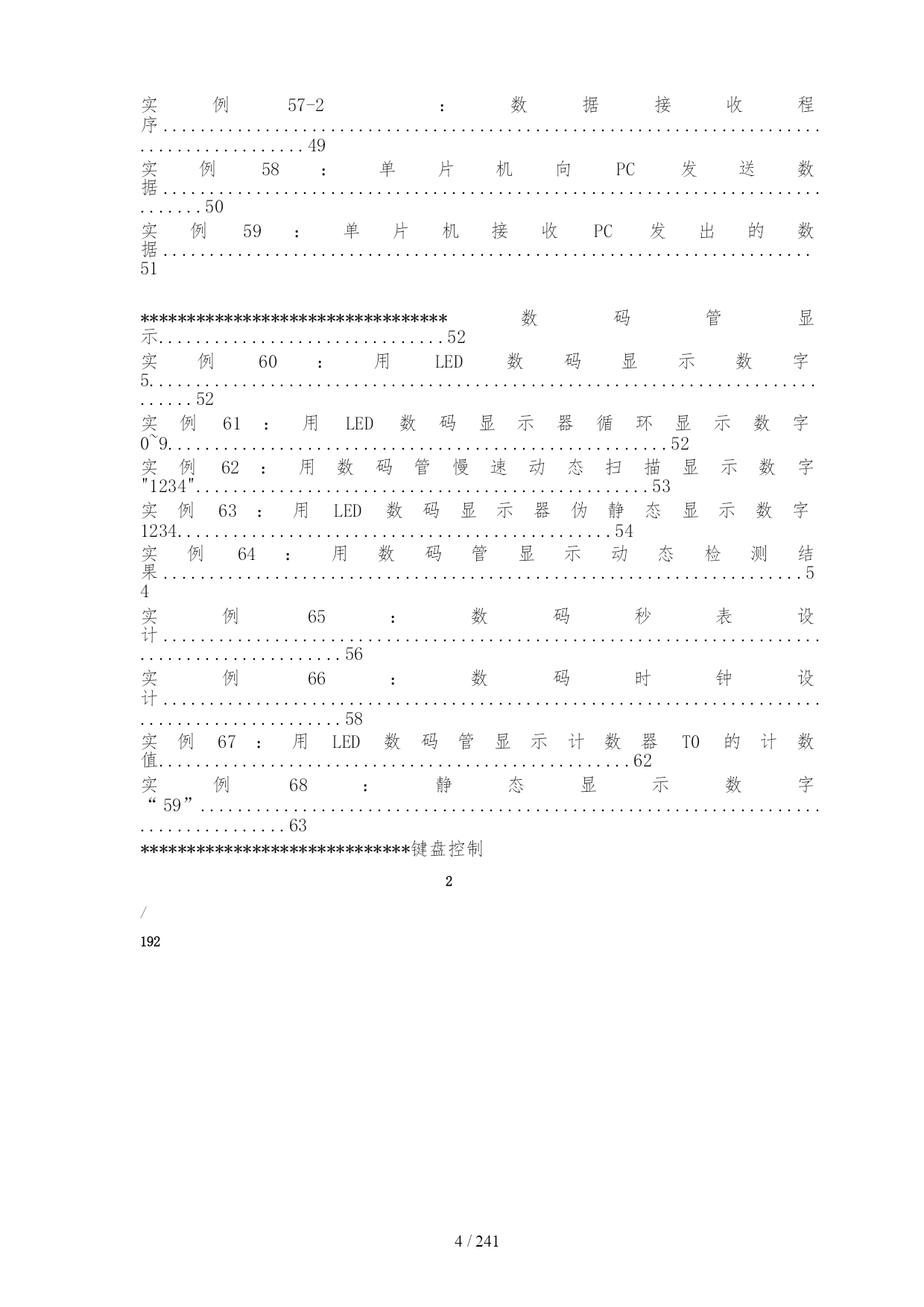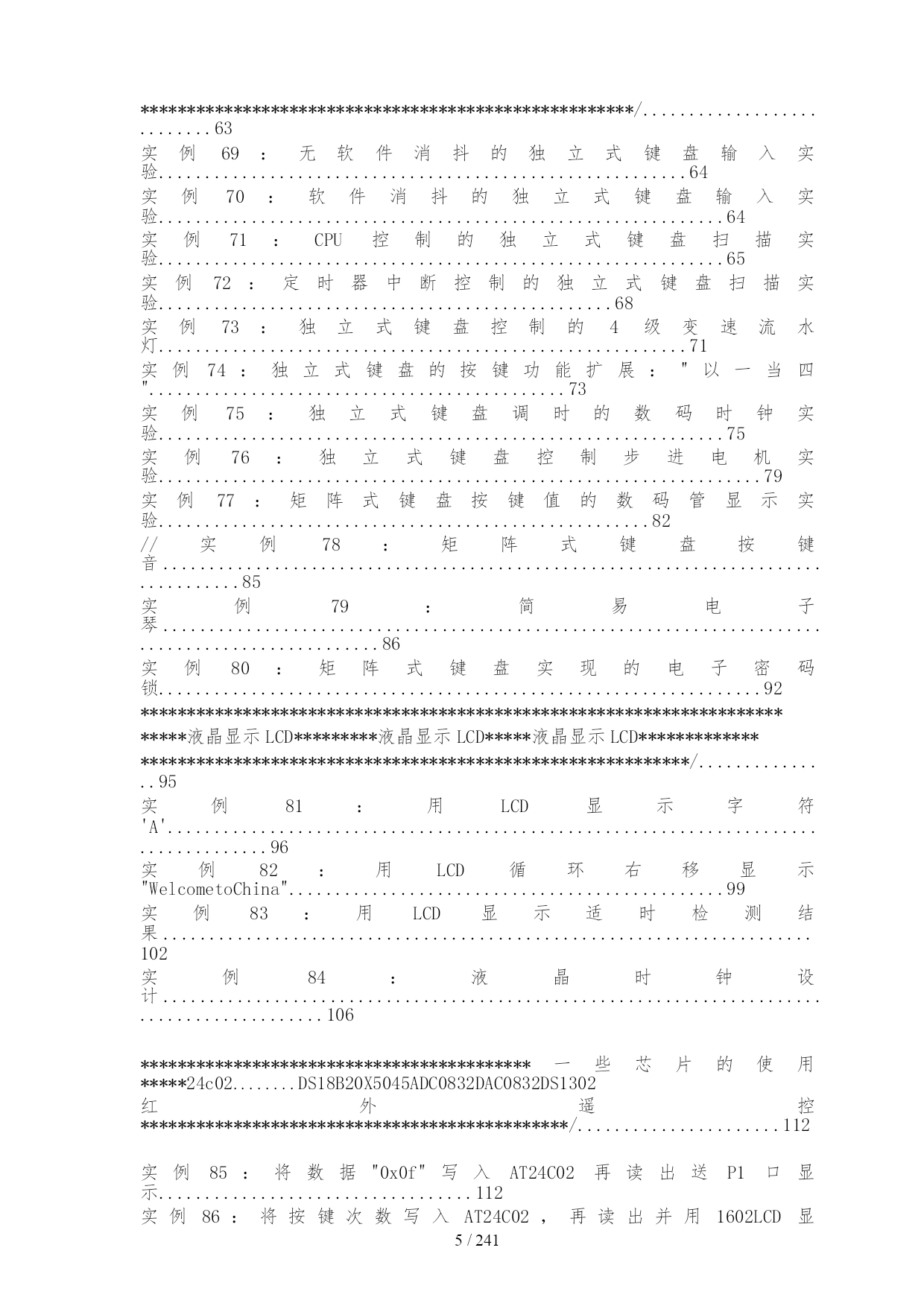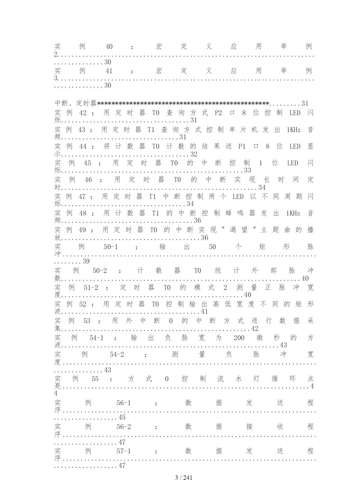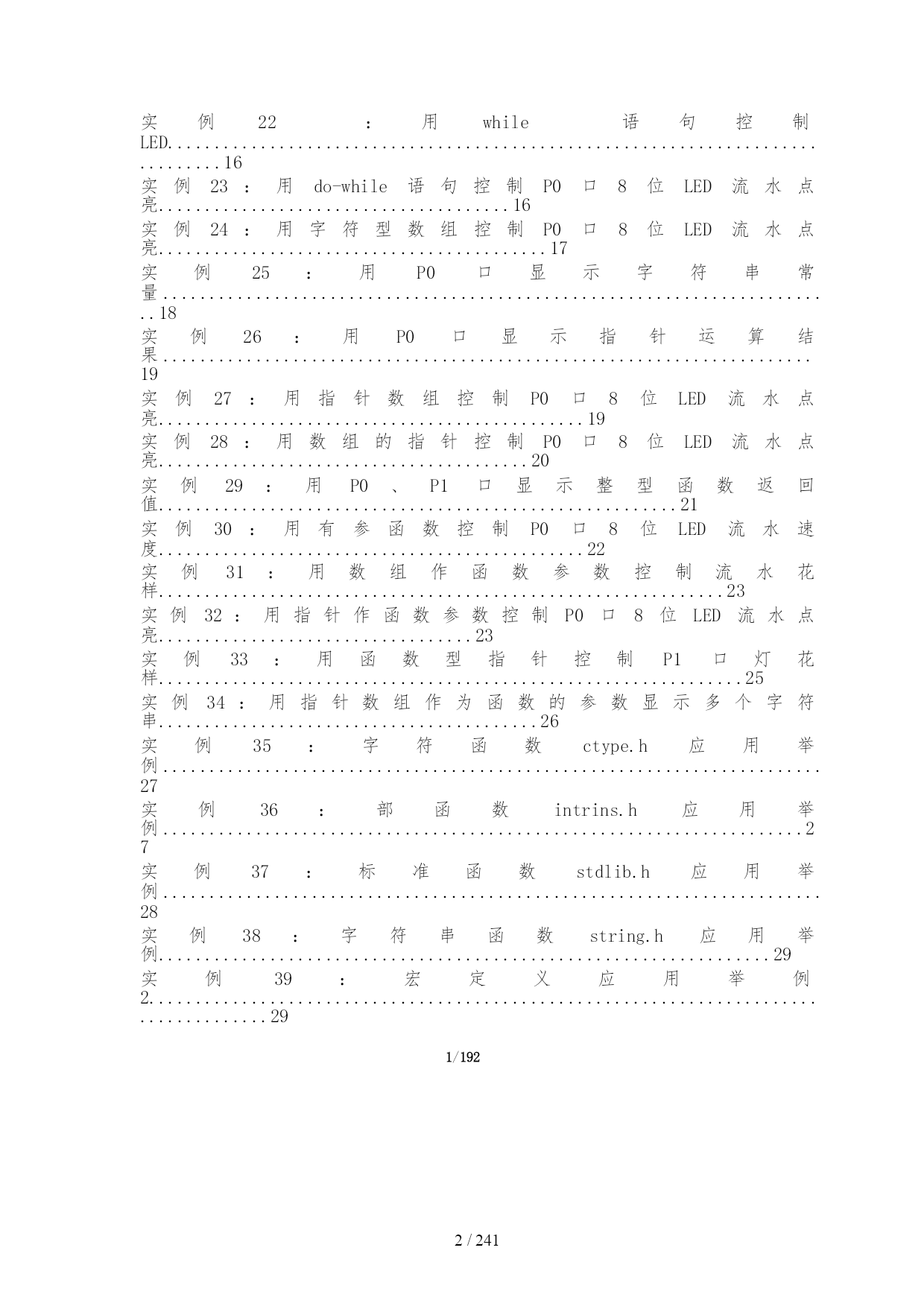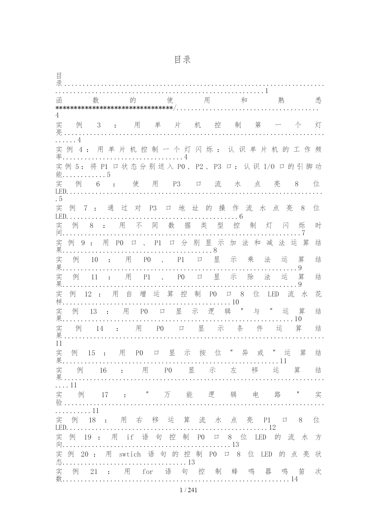/NUMPAGES241 目录 目录................................................................................................................................1 函数的使用和熟悉********************************/.......................................4 实例3:用单片机控制第一个灯亮.............................................................................4 实例4:用单片机控制一个灯闪烁:认识单片机的工作频率.................................4 实例5:将P1口状态分别送入P0、P2、P3口:认识I/O口的引脚功能............5 实例6:使用P3口流水点亮8位LED.......................................................................5 实例7:通过对P3口地址的操作流水点亮8位LED...............................................6 实例8:用不同数据类型控制灯闪烁时间.................................................................7 实例9:用P0口、P1口分别显示加法和减法运算结果.........................................8 实例10:用P0、P1口显示乘法运算结果................................................................9 实例11:用P1、P0口显示除法运算结果................................................................9 实例12:用自增运算控制P0口8位LED流水花样..............................................10 实例13:用P0口显示逻辑"与"运算结果...............................................................10 实例14:用P0口显示条件运算结果.......................................................................11 实例15:用P0口显示按位"异或"运算结果...........................................................11 实例16:用P0显示左移运算结果...........................................................................11 实例17:"万能逻辑电路"实验.................................................................................11 实例18:用右移运算流水点亮P1口8位LED.......................................................12 实例19:用if语句控制P0口8位LED的流水方向..............................................13 实例20:用swtich语句的控制P0口8位LED的点亮状态..................................13 实例21:用for语句控制蜂鸣器鸣笛次数..............................................................14 实例22:用while语句控制LED...............................................................................16 实例23:用do-while语句控制P0口8位LED流水点亮......................................16 实例24:用字符型数组控制P0口8位LED流水点亮..........................................17
