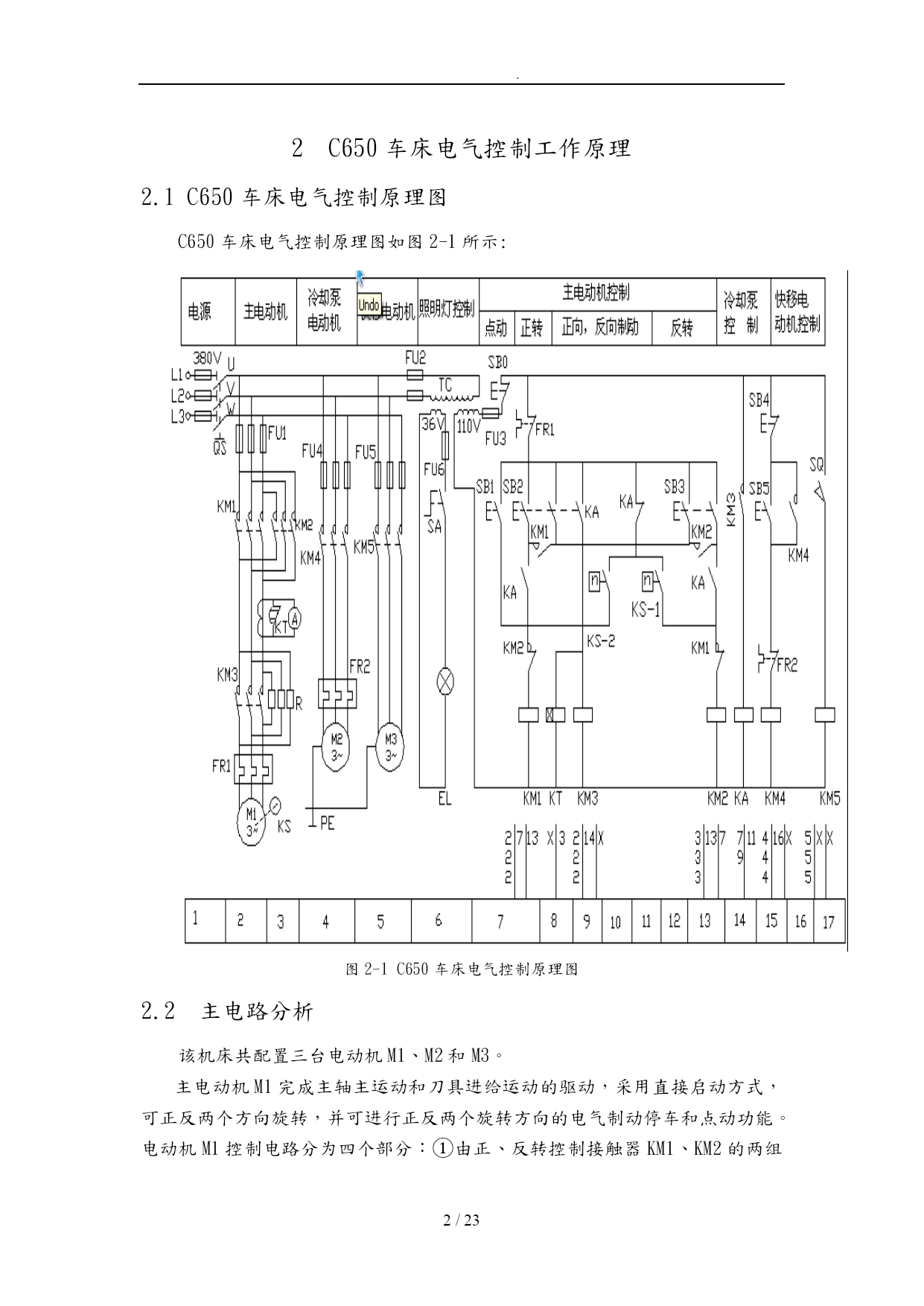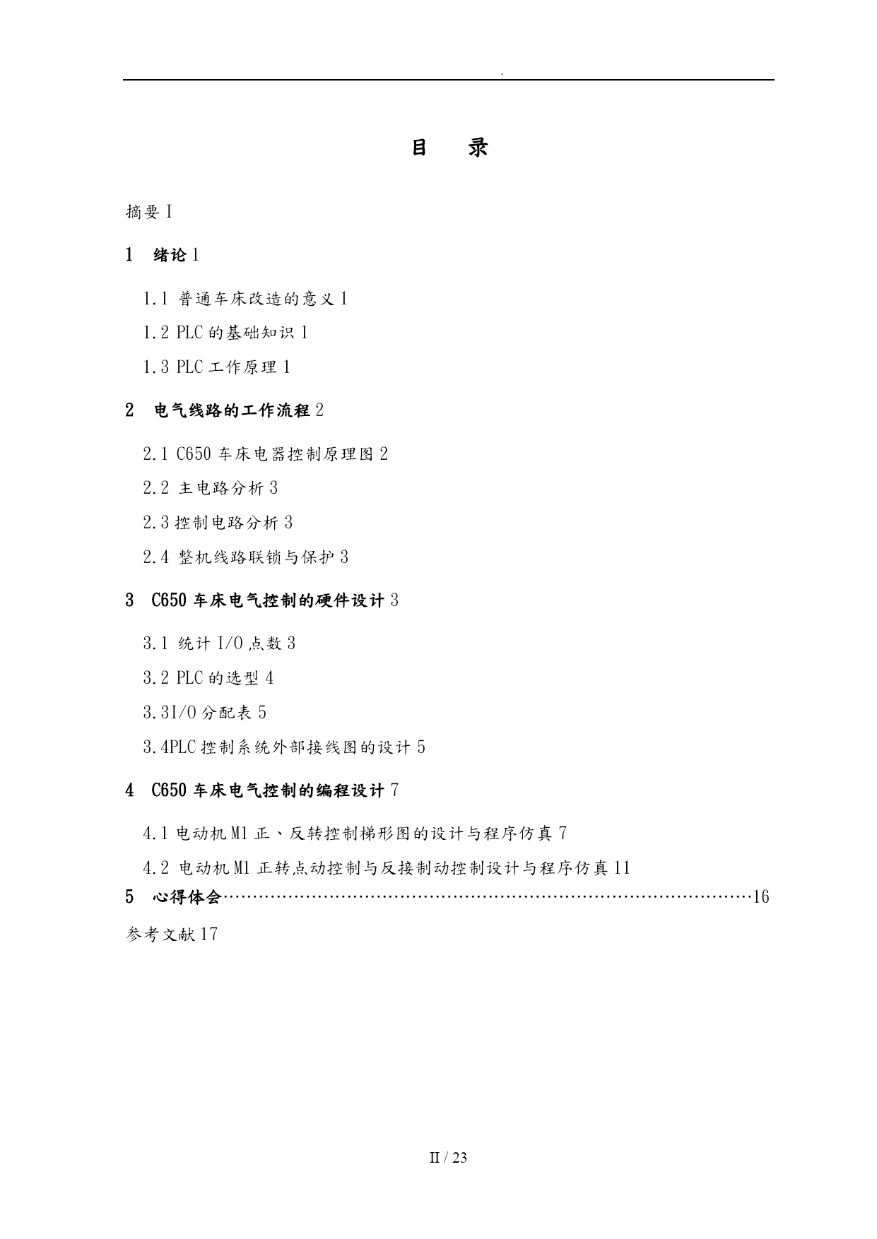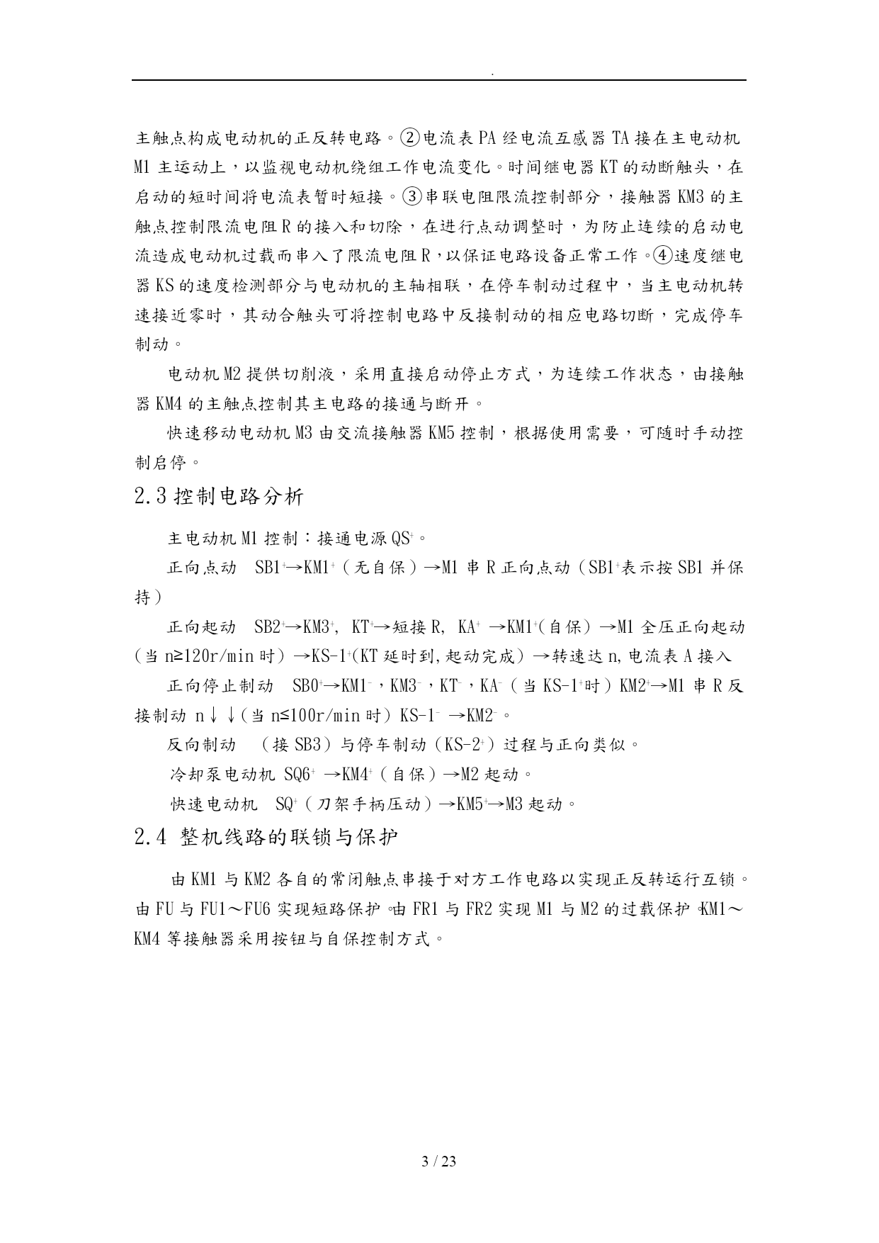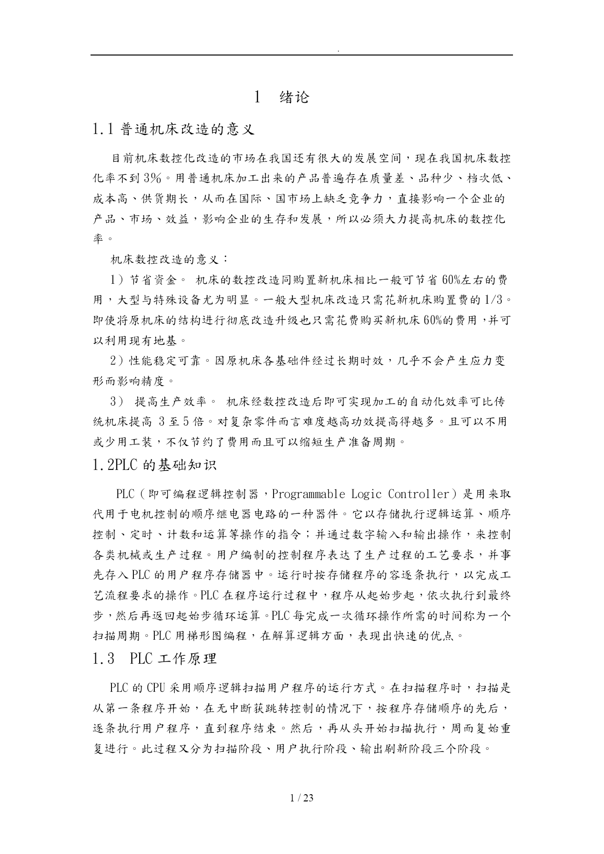 . /NUMPAGES23 摘要 可编程控制器是在继电器控制和计算机技术的基础上,逐渐发展起来的一种数字运算操作的电子系统,专为在工业环境下应用而设计的。它采用可编程序逻辑控制的存储器,在其部存储和执行逻辑运算、顺序控制、定时、技术和算术运算等操作的指令,并通过数字式和模拟式的输入和输出,控制各种类型的机械或生产过程。 本次设计的容主要是利用PLC(ProgrammableLogicController)对C650型车床的电器部分进行改造。首先我对本设计进行总体的分析,使自己有一个大致的总体概念,然后仔细分析C650车床,对车床主运动和进给运动还有其它的辅助运动,进行分析。最后根据控制电路的线路图,编译PLC的梯形图,编译通过后,利用PLC实验台进行实验仿真。 关键词:可编程序控制器,C650车床,电气控制,梯形图 目录TOC\o"1-3"\h\z\u HYPERLINK\l"_Toc264307253"摘要I HYPERLINK\l"_Toc264307232"1绪论1 HYPERLINK\l"_Toc264307233"1.1普通车床改造的意义1 HYPERLINK\l"_Toc264307234"1.2PLC的基础知识1 HYPERLINK\l"_Toc264307235"1.3PLC工作原理1 HYPERLINK\l"_Toc264307241"2电气线路的工作流程2 HYPERLINK\l"_Toc264307242"2.1C650车床电器控制原理图2 HYPERLINK\l"_Toc264307243"2.2主电路分析3 HYPERLINK\l"_Toc264307244"2.3控制电路分析3 HYPERLINK\l"_Toc264307245"2.4整机线路联锁与保护3 HYPERLINK\l"_Toc264307248"3C650车床电气控制的硬件设计3 HYPERLINK\l"_Toc264307249"3.1统计I/O点数3 HYPERLINK\l"_Toc264307250"3.2PLC的选型4 HYPERLINK\l"_Toc264307251"3.3I/O分配表5 HYPERLINK\l"_Toc264307252"3.4PLC控制系统外部接线图的设计5 HYPERLINK\l"_Toc264307253"4C650车床电气控制的编程设计7 HYPERLINK\l"_Toc264307254"4.1电动机M1正、反转控制梯形图的设计与程序仿真7 HYPERLINK\l"_Toc264307255"4.2电动机M1正转点动控制与反接制动控制设计与程序仿真11 HYPERLINK\l"_Toc264307261"5心得体会………………………………………………………………………………16 HYPERLINK\l"_Toc264307253"参考文献17 1绪论 1.1普通机床改造的意义 目前机床数控化改造的市场在我国还有很大的发展空间,现在我国机床数控化率不到3%。用普通机床加工出来的产品普遍存在质量差、品种少、档次低、成本高、供货期长,从而在国际、国市场上缺乏竞争力,直接影响一个企业的产品、市场、效益,影响企业的生存和发展,所以必须大力提高机床的数控化率。 机床数控改造的意义: 1)节省资金。机床的数控改造同购置新机床相比一般可节省60%左右的费用,大型与特殊设备尤为明显。一般大型机床改造只需花新机床购置费的1/3。即使将原机床的结构进行彻底改造升级也只需花费购买新机床60%的费用,并可以利用现有地基。 2)性能稳定可靠。因原机床各基础件经过长期时效,几乎不会产生应力变形而影响精度。 3)提高生产效率。机床经数控改造后即可实现加工的自动化效率可比传统机床提高3至5倍。对复杂零件而言难度越高功效提高得越多。且可以不用或少用工装,不仅节约了费用而且可以缩短生产准备周期。 1.2PLC的基础知识 PLC(即可编程逻辑控制器,ProgrammableLogicController)是用来取代用于电机控制的顺序继电器电路的一种器件。它以存储执行逻辑运算、顺序控制、定时、计数和运算等操作的指令;并通过数字输入和输出操作,来控制各类机械或生产过程。用户编制的控制程序表达了生产过程的工艺要求,并事先存入PLC的用户程序存储器中。运行时按存储程序的容逐条执行,以完成工艺流程要求的操作。PLC在程序运行过程中,程序从起始步起,依次执行到最终步,然后再返回起始步循环运算。PLC每完成一次循环操作所需的时间称为一个扫描周期。PLC用梯形图编