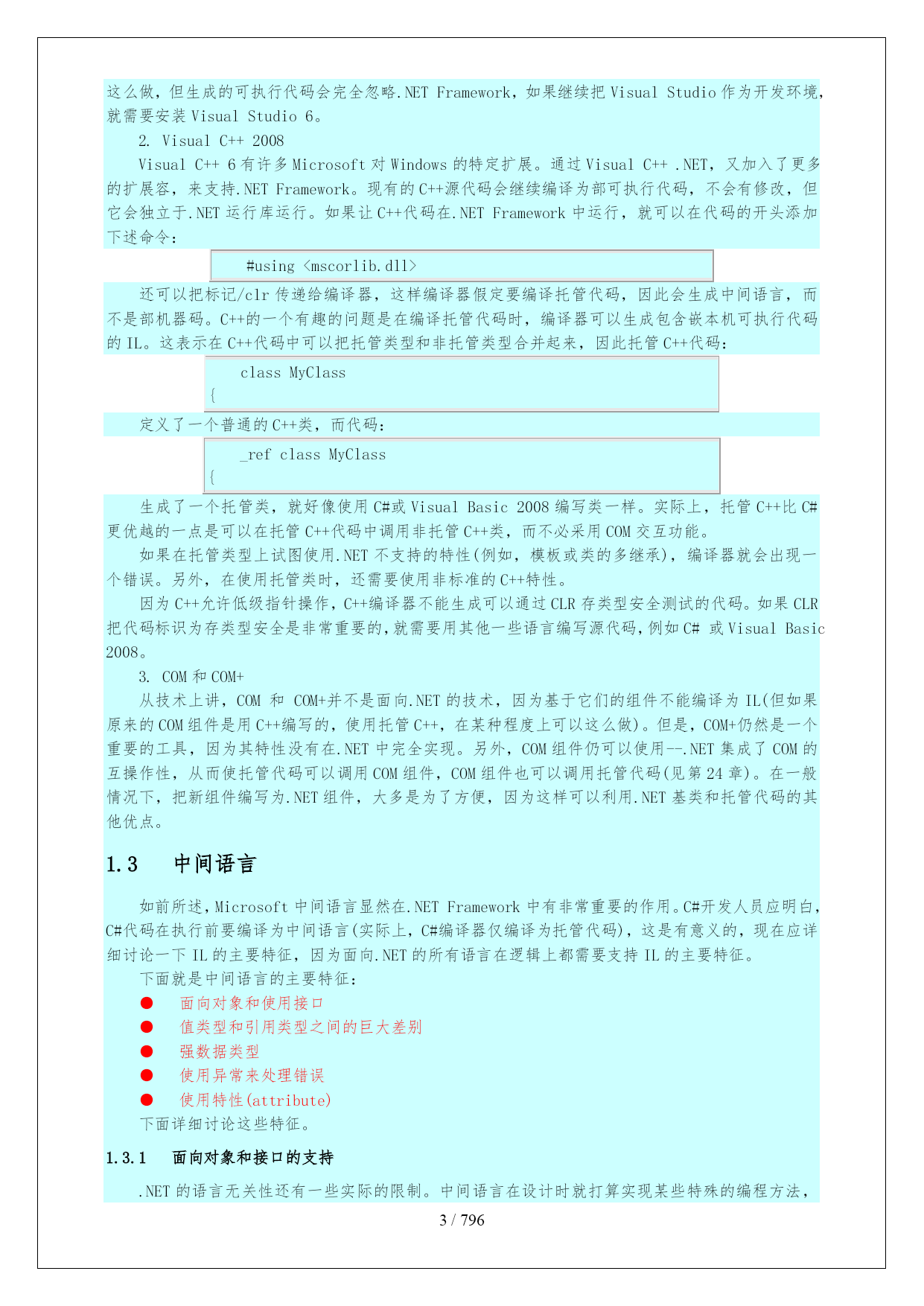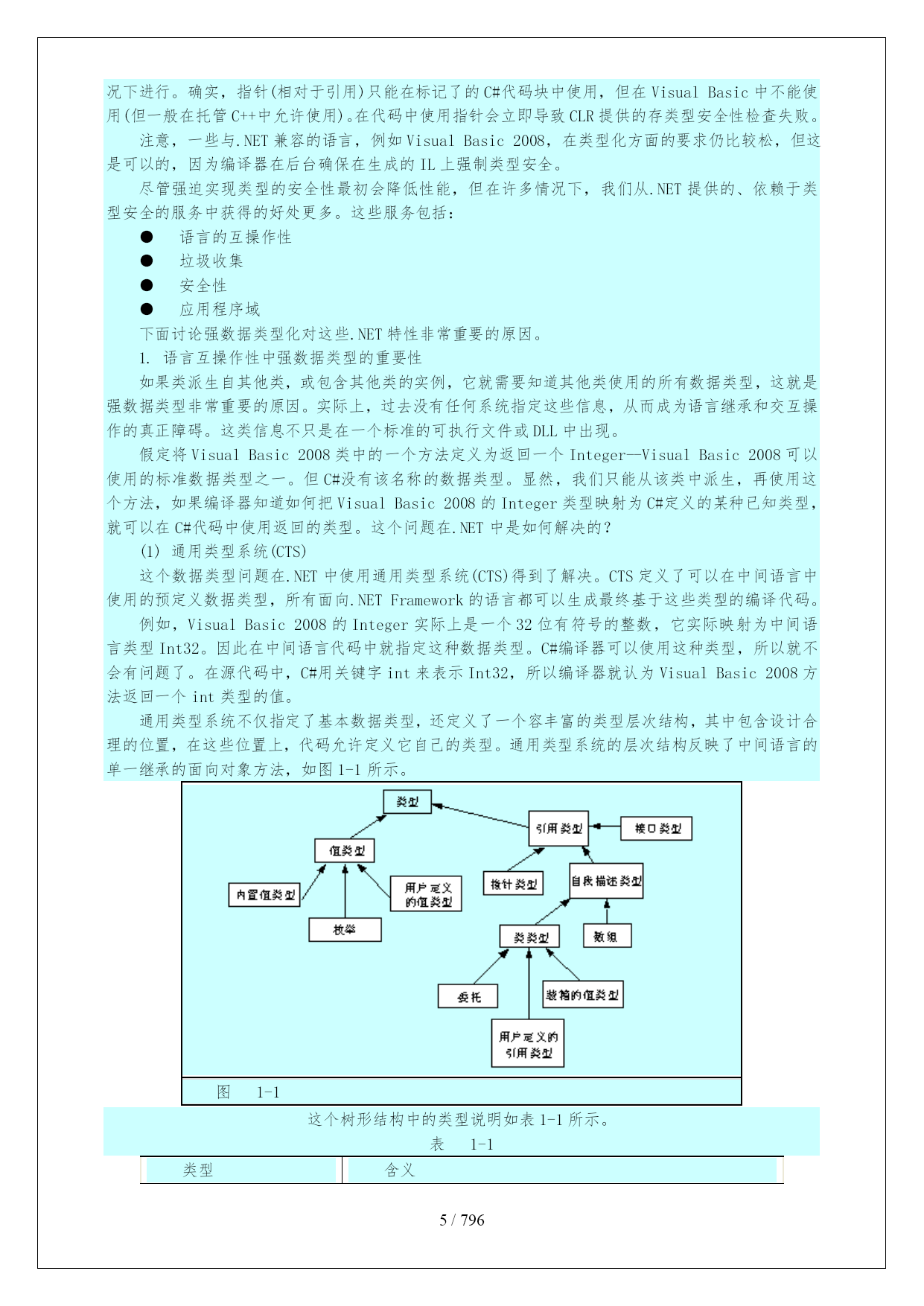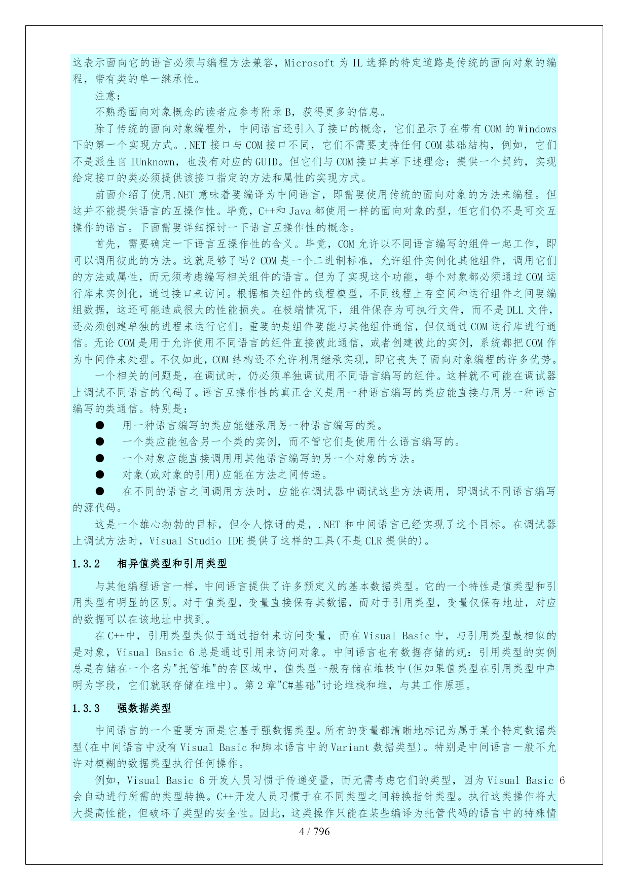 /NUMPAGES796 C#高级编程(权威版) 第1章.NET体系结构 我们不能孤立地使用C#语言,而必须和.NETFramework一起考虑。C#编译器专门用于.NET,这表示用C#编写的所有代码总是在.NETFramework中运行。对于C#语言来说,可以得出两个重要的结论: (1)C#的结构和方法论反映了.NET基础方法论。 (2)在许多情况下,C#的特定语言功能取决于.NET的功能,或依赖于.NET基类。 由于这种依赖性,在开始使用C#编程前,了解.NET的结构和方法论就非常重要了,这就是本章的目的。下面是本章的容: ●本章首先了解在.NET编译和运行所有的代码(包括C#)时通常会出现什么情况。 ●对这些容进行概述之后,就要详细阐述Microsoft中间语言(MicrosoftIntermediateLanguage,MSIL或简称为IL),.NET上所有编译好的代码都要使用这种语言。本章特别要介绍IL、通用类型系统(CommonTypeSystem,CTS)与公共语言规(CommonLanguageSpecification,CLS)如何提供.NET语言之间的互操作性。最后解释各种语言如何使用.NET,包括VisualBasic和C++。 ●之后,我们将介绍.NET的其他特性,包括程序集、命名空间和.NET基类。 ●最后本章简要探讨一下C#开发人员可以创建的应用程序类型。 1.1C#与.NET的关系 C#是一种相当新的编程语言,C#的重要性体现在以下两个方面: ●它是专门为与Microsoft的.NETFramework一起使用而设计的。(.NETFramework是一个功能非常丰富的平台,可开发、部署和执行分布式应用程序)。 ●它是一种基于现代面向对象设计方法的语言,在设计它时,Microsoft还吸取了其他类似语言的经验,这些语言是近20年来面向对象规则得到广泛应用后才开发出来的。 有一个很重要的问题要弄明白:C#就其本身而言只是一种语言,尽管它是用于生成面向.NET环境的代码,但它本身不是.NET的一部分。.NET支持的一些特性,C#并不支持。而C#语言支持的另一些特性,.NET却不支持(例如运算符重载)! 但是,因为C#语言是和.NET一起使用的,所以如果要使用C#高效地开发应用程序,理解Framework就非常重要,所以本章将介绍.NET的涵。 1.2公共语言运行库 .NETFramework的核心是其运行库的执行环境,称为公共语言运行库(CLR)或.NET运行库。通常将在CLR的控制下运行的代码称为托管代码(managedcode)。 但是,在CLR执行编写好的源代码之前,需要编译它们(在C#中或其他语言中)。在.NET中,编译分为两个阶段: (1)把源代码编译为Microsoft中间语言(IL)。 (2)CLR把IL编译为平台专用的代码。 这个两阶段的编译过程非常重要,因为Microsoft中间语言(托管代码)是提供.NET的许多优点的关键。 Microsoft中间语言与Java字节代码共享一种理念:它们都是低级语言,语法很简单(使用数字代码,而不是文本代码),可以非常快速地转换为部机器码。对于代码来说,这种精心设计的通用语法有很重要的优点:平台无关性、提高性能和语言的互操作性。 1.2.1平台无关性 首先,这意味着包含字节代码指令的同一文件可以放在任一平台中,运行时编译过程的最后阶段可以很容易完成,这样代码就可以运行在特定的平台上。换言之,编译为中间语言就可以获得.NET平台无关性,这与编译为Java字节代码就会得到Java平台无关性是一样的。 1.2.2提高性能 前面把IL和Java做了比较,实际上,IL比Java字节代码的作用还要大。IL总是即时编译的(称为JIT编译),而Java字节代码常常是解释性的,Java的一个缺点是,在运行应用程序时,把Java字节代码转换为部可执行代码的过程会导致性能的损失(但在最近,Java在某些平台上能进行JIT编译)。 JIT编译器并不是把整个应用程序一次编译完(这样会有很长的启动时间),而是只编译它调用的那部分代码(这是其名称由来)。代码编译过一次后,得到的部可执行代码就存储起来,直到退出该应用程序为止,这样在下次运行这部分代码时,就不需要重新编译了。Microsoft认为这个过程要比一开始就编译整个应用程序代码的效率高得多,因为任何应用程序的大部分代码实际上并不是在每次运行过程中都执行。使用JIT编译器,从来都不会编译这种代码。 这解释了为什么托管IL代码的执行几乎和部机器代码的执行速度一样快,但是并没有说明为什么Microsoft认为这会提高性能。其原因是编译过程的最后一部分是在运行时进行的,JIT编译器确切地知道程序运行在什么类型的处理器上,可以利
