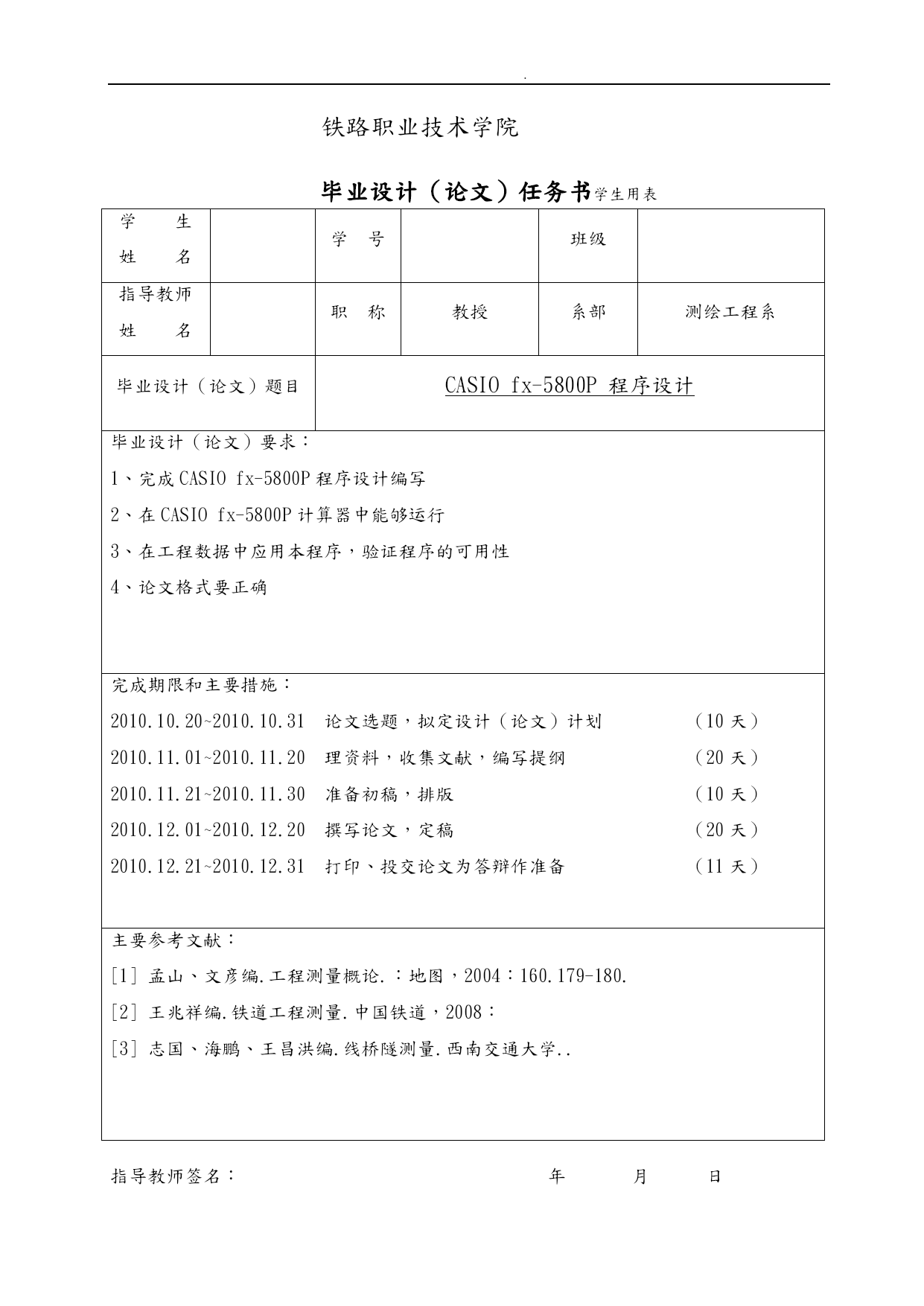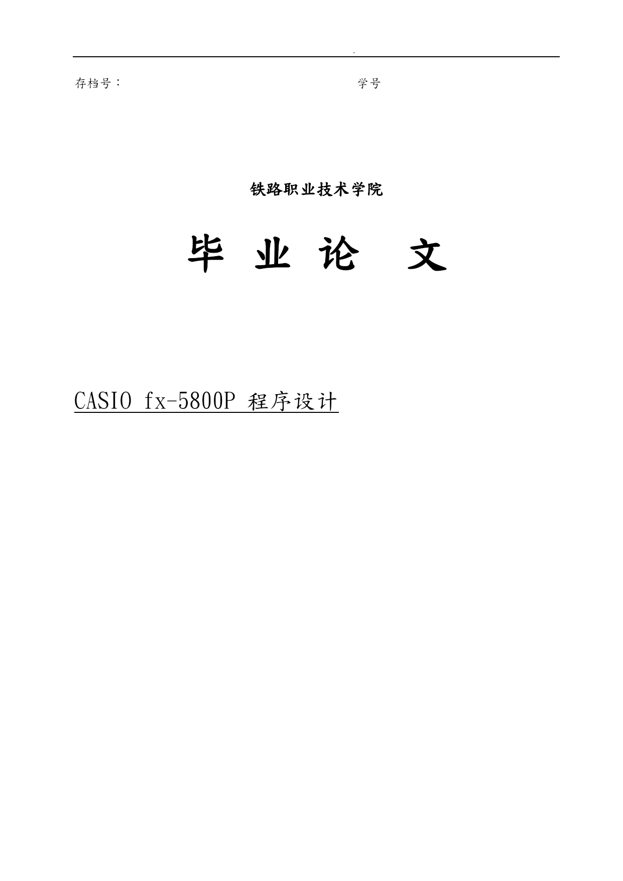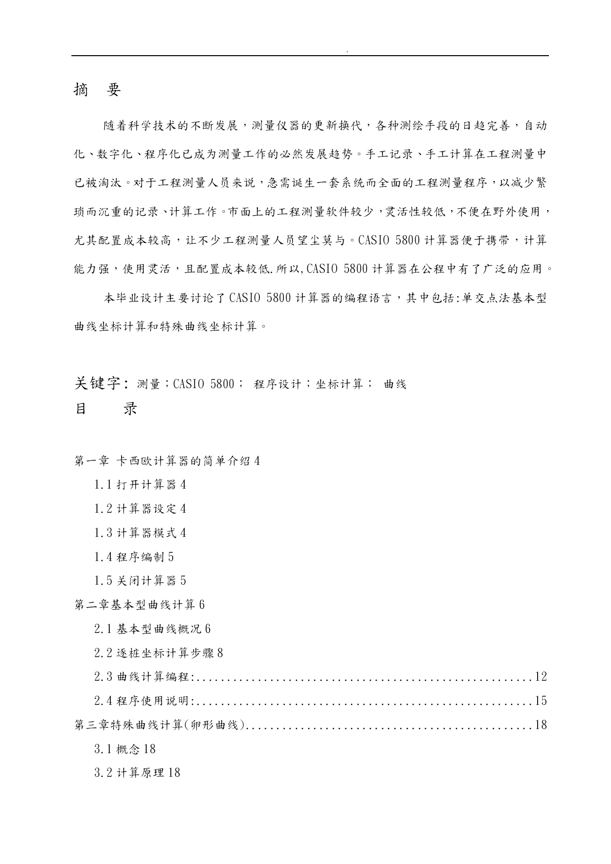 . /NUMPAGES27 . 存档号:学号 铁路职业技术学院 毕业论文 CASIOfx-5800P程序设计 毕业设计(论文)原创性声明和使用授权说明 原创性声明 本人重承诺:所呈交的毕业设计(论文),是我个人在指导教师的指导下进行的研究工作与取得的成果。尽我所知,除文中特别加以标注和致的地方外,不包含其他人或组织已经发表或公布过的研究成果,也不包含我为获得与其它教育机构的学位或学历而使用过的材料。对本研究提供过帮助和做出过贡献的个人或集体,均已在文中作了明确的说明并表示了意。 作者签名:日期: 指导教师签名:日期: 使用授权说明 本人完全了解大学关于收集、保存、使用毕业设计(论文)的规定,即:按照学校要求提交毕业设计(论文)的印刷本和电子版本;学校有权保存毕业设计(论文)的印刷本和电子版,并提供目录检索与阅览服务;学校可以采用影印、缩印、数字化或其它复制手段保存论文;在不以赢利为目的前提下,学校可以公布论文的部分或全部容。 作者签名:日期: 铁路职业技术学院 毕业设计(论文)评定表 学号存档号系别测绘工程系专业工程测量技术班级毕业论文(设计)题目CASIOfx-5800P程序设计指导教师评语: 签名:2010年月日答辩委员会意见: 签名:2010年月日备注: 铁路职业技术学院 毕业设计(论文)任务书学生用表 学生 姓名学号班级指导教师 姓名职称教授系部测绘工程系毕业设计(论文)题目CASIOfx-5800P程序设计毕业设计(论文)要求: 完成CASIOfx-5800P程序设计编写 在CASIOfx-5800P计算器中能够运行 3、在工程数据中应用本程序,验证程序的可用性 4、论文格式要正确 完成期限和主要措施: 2010.10.20~2010.10.31论文选题,拟定设计(论文)计划(10天) 2010.11.01~2010.11.20理资料,收集文献,编写提纲(20天) 2010.11.21~2010.11.30准备初稿,排版(10天) 2010.12.01~2010.12.20撰写论文,定稿(20天) 2010.12.21~2010.12.31打印、投交论文为答辩作准备(11天) 主要参考文献: [1]孟山、文彦编.工程测量概论.:地图,2004:160.179-180. [2]王兆祥编.铁道工程测量.中国铁道,2008: [3]志国、海鹏、王昌洪编.线桥隧测量.西南交通大学.. 指导教师签名: 年月日摘要 随着科学技术的不断发展,测量仪器的更新换代,各种测绘手段的日趋完善,自动化、数字化、程序化已成为测量工作的必然发展趋势。手工记录、手工计算在工程测量中已被淘汰。对于工程测量人员来说,急需诞生一套系统而全面的工程测量程序,以减少繁琐而沉重的记录、计算工作。市面上的工程测量软件较少,灵活性较低,不便在野外使用,尤其配置成本较高,让不少工程测量人员望尘莫与。CASIO5800计算器便于携带,计算能力强,使用灵活,且配置成本较低.所以,CASIO5800计算器在公程中有了广泛的应用。 本毕业设计主要讨论了CASIO5800计算器的编程语言,其中包括:单交点法基本型曲线坐标计算和特殊曲线坐标计算。 关键字:测量;CASIO5800;程序设计;坐标计算;曲线 目录 TOC\o"1-2"\h\z\uTOC\*MERGEFORMAT 第一章卡西欧计算器的简单介绍PAGEREF_Toc286245853\h4 1.1打开计算器PAGEREF_Toc286245854\h4 1.2计算器设定PAGEREF_Toc286245855\h4 1.3计算器模式PAGEREF_Toc286245856\h4 1.4程序编制PAGEREF_Toc286245857\h5 1.5关闭计算器PAGEREF_Toc286245858\h5 第二章基本型曲线计算PAGEREF_Toc286245859\h6 2.1基本型曲线概况PAGEREF_Toc286245860\h6 2.2逐桩坐标计算步骤PAGEREF_Toc286245861\h8 2.3曲线计算编程: PAGEREF_Toc286245862\h12 2.4程序使用说明: PAGEREF_Toc286245863\h15 第三章特殊曲线计算(卵形曲线) PAGEREF_Toc286245864\h18 3.1概念PAGEREF_Toc286245865\h18 3.2计算原理PAGEREF_Toc286245866\h18 3.3程序代码PAGEREF_Toc286245867\h20 3.4工程案例