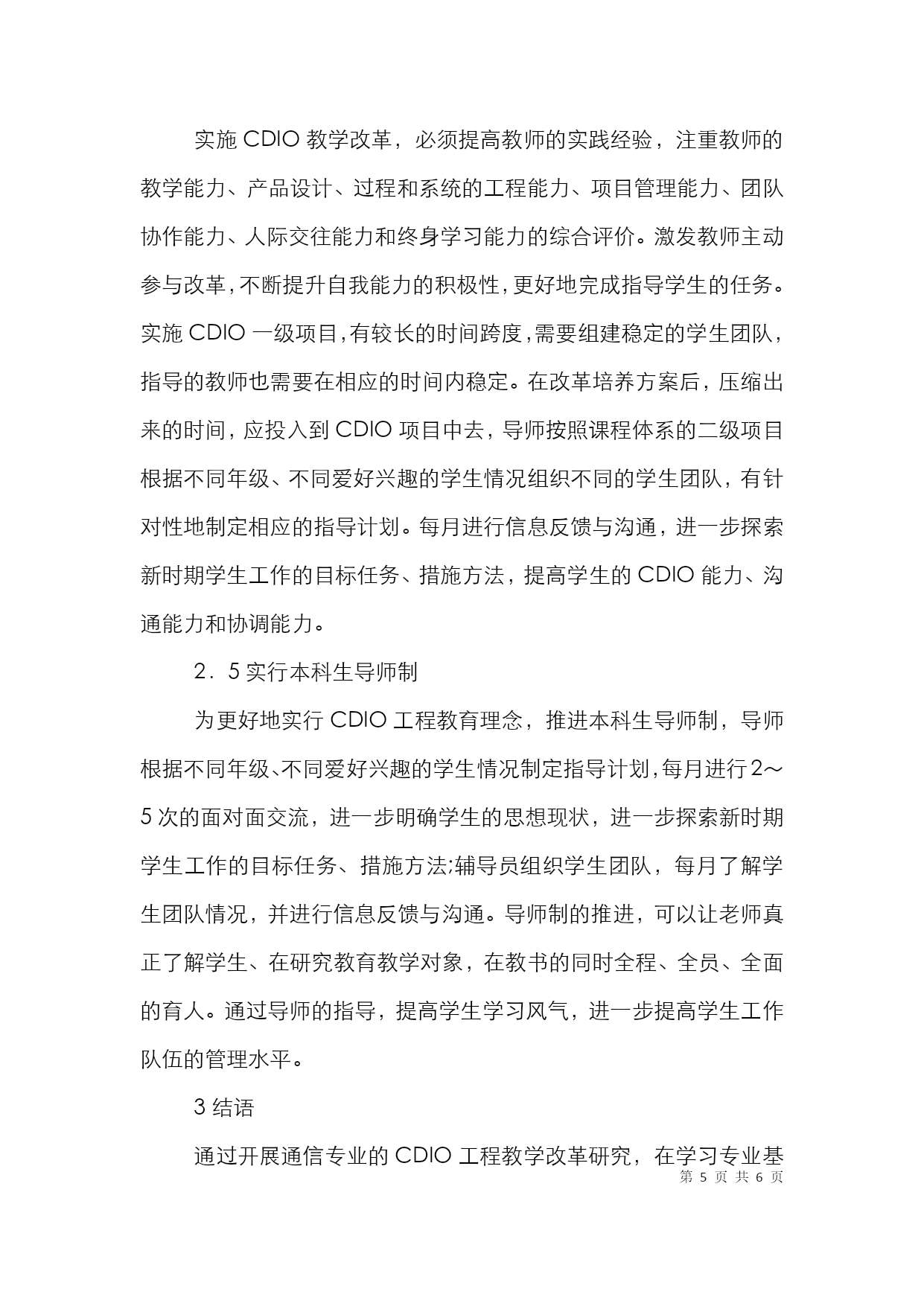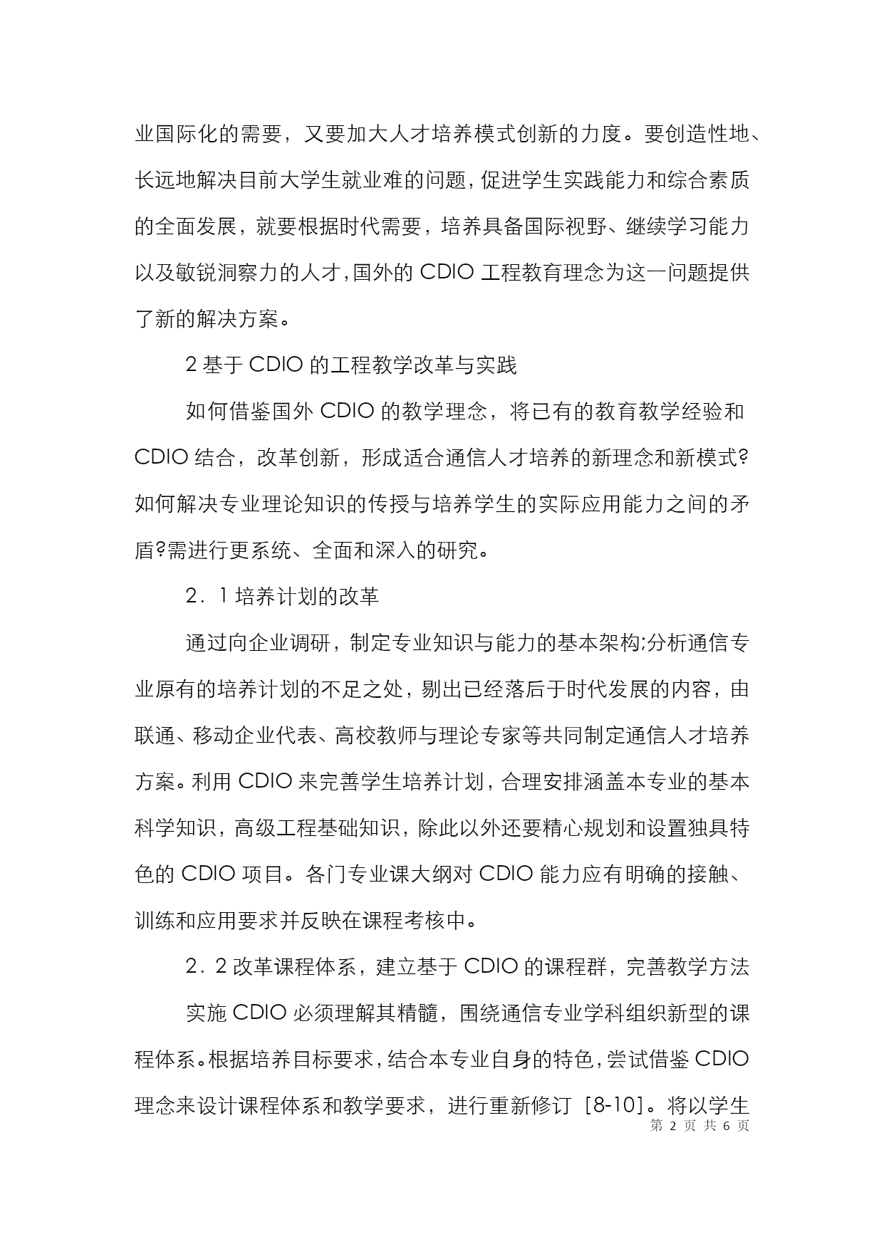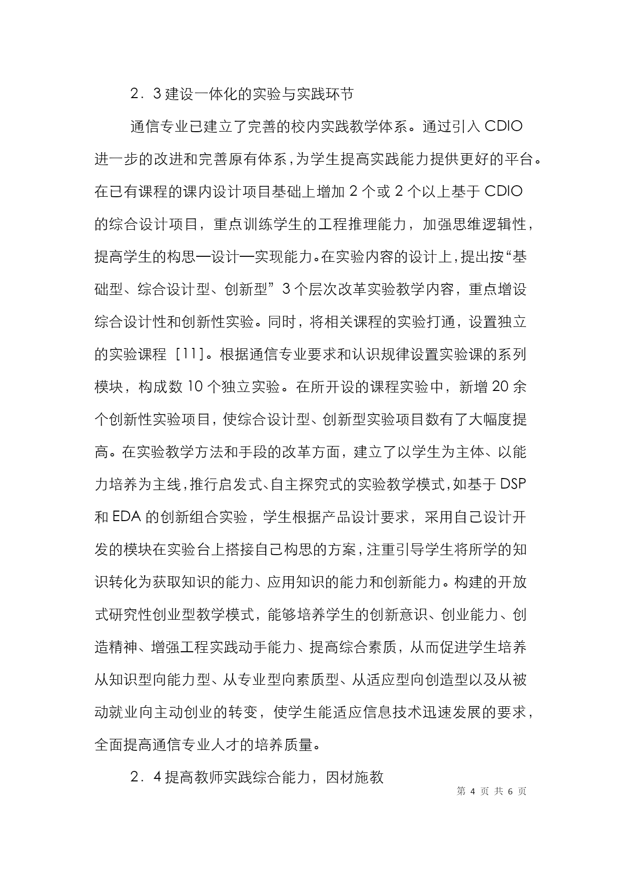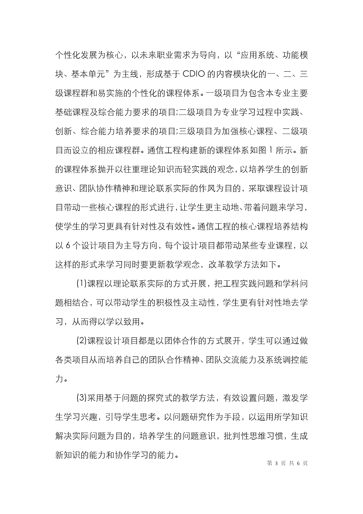 第PAGE\*MERGEFORMAT6页共NUMPAGES\*MERGEFORMAT6页 免责声明:图文来源网络征集,版权归原作者所有。若侵犯了您的合法权益,请作者持权属证明与本站联系,我们将及时更正、删除!谢谢! CDIO的通信专业教育创新及实践 目前,随着高校学生毕业生数量的增加,待就业人数与社会有效需求短期内增幅有限的供需矛盾日益突出,加上金融危机导致相当一部分企业的破产倒闭,用工日趋减少。2006~2009年,普通高校通信专业毕业生的就业率普遍低于35%,面对严峻的就业形势,通信工程专业的教育模式必须要随之改革,培养学生的CDIO能力,以提高毕业生的市场竞争力,提高就业率[1-3]。 1通信专业目前存在的问题 多年来,通信工程专业人才培养模式在不断地改革发展,但还不能完全应对当前金融危机对IT业的影响,今天学生的就业形势非常严峻,这说明通信工程专业的教育培养模式暴露出大量问题,归纳总结主要有以下几方面[4-7]。 (1)由于通信专业技术发展迅速,而学校当前的培养方案和所设置的课程体系不具特色,学生学不到最新的专业技术知识;同时通信专业理论知识难度较大,学生很难完全掌握吸收,成材率较低; (2)在教学和考核上往往重理论轻实践,虽然实验开出率达到了100%,也增加了综合性、设计性的实验内容,但是学生只是机械的操作,不能提高学生自己动手、推理能力,从而造成了学生创新能力不足; (3)在校学生大多为90后,个性较强,与人沟通能力较差,缺乏团队工作经验,社会适应能力较差。要解决这些问题,既要面向IT业国际化的需要,又要加大人才培养模式创新的力度。要创造性地、长远地解决目前大学生就业难的问题,促进学生实践能力和综合素质的全面发展,就要根据时代需要,培养具备国际视野、继续学习能力以及敏锐洞察力的人才,国外的CDIO工程教育理念为这一问题提供了新的解决方案。 2基于CDIO的工程教学改革与实践 如何借鉴国外CDIO的教学理念,将已有的教育教学经验和CDIO结合,改革创新,形成适合通信人才培养的新理念和新模式?如何解决专业理论知识的传授与培养学生的实际应用能力之间的矛盾?需进行更系统、全面和深入的研究。 2.1培养计划的改革 通过向企业调研,制定专业知识与能力的基本架构;分析通信专业原有的培养计划的不足之处,剔出已经落后于时代发展的内容,由联通、移动企业代表、高校教师与理论专家等共同制定通信人才培养方案。利用CDIO来完善学生培养计划,合理安排涵盖本专业的基本科学知识,高级工程基础知识,除此以外还要精心规划和设置独具特色的CDIO项目。各门专业课大纲对CDIO能力应有明确的接触、训练和应用要求并反映在课程考核中。 2.2改革课程体系,建立基于CDIO的课程群,完善教学方法 实施CDIO必须理解其精髓,围绕通信专业学科组织新型的课程体系。根据培养目标要求,结合本专业自身的特色,尝试借鉴CDIO理念来设计课程体系和教学要求,进行重新修订[8-10]。将以学生个性化发展为核心,以未来职业需求为导向,以“应用系统、功能模块、基本单元”为主线,形成基于CDIO的内容模块化的一、二、三级课程群和易实施的个性化的课程体系。一级项目为包含本专业主要基础课程及综合能力要求的项目;二级项目为专业学习过程中实践、创新、综合能力培养要求的项目;三级项目为加强核心课程、二级项目而设立的相应课程群。通信工程构建新的课程体系如图1所示。新的课程体系抛开以往重理论知识而轻实践的观念,以培养学生的创新意识、团队协作精神和理论联系实际的作风为目的,采取课程设计项目带动一些核心课程的形式进行,让学生更主动地、带着问题来学习,使学生的学习更具有针对性及有效性。通信工程的核心课程培养结构以6个设计项目为主导方向,每个设计项目都带动某些专业课程,以这样的形式来学习同时要更新教学观念,改革教学方法如下。 (1)课程以理论联系实际的方式开展,把工程实践问题和学科问题相结合,可以带动学生的积极性及主动性,学生更有针对性地去学习,从而得以学以致用。 (2)课程设计项目都是以团体合作的方式展开,学生可以通过做各类项目从而培养自己的团队合作精神、团队交流能力及系统调控能力。 (3)采用基于问题的探究式的教学方法,有效设置问题,激发学生学习兴趣,引导学生思考。以问题研究作为手段,以运用所学知识解决实际问题为目的,培养学生的问题意识,批判性思维习惯,生成新知识的能力和协作学习的能力。 2.3建设一体化的实验与实践环节 通信专业已建立了完善的校内实践教学体系。通过引入CDIO进一步的改进和完善原有体系,为学生提高实践能力提供更好的平台。在已有课程的课内设计项目基础上增加2个或2个以上基于CDIO的综合设计项目,重点训练学生的工程推理能力,加强思维逻辑性,提高学生的构思—设计—