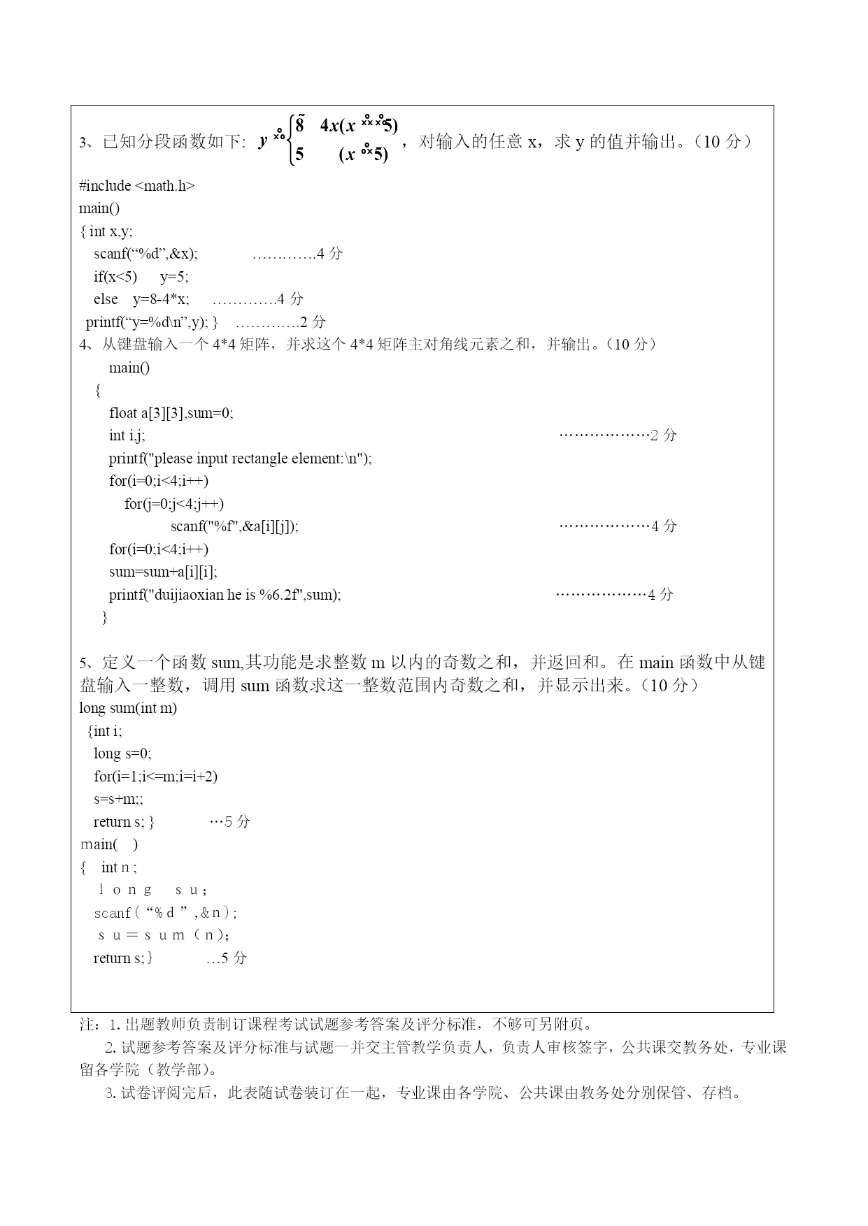 枣庄学院2021—2021学年第一学期 C语言程序设计_课程考试试题参考答案及评分标准 开课单位:机电工程学院课程类别:□公共课□√专业课□基础课 课程编号0521032学分/学时3/64试卷□A卷□√B卷出题教师蔡田芳考试方式□√闭卷□开卷□其他专业/年级机械设计制造及其自动化/2011级专升本修读方式□必修□√选修一、选择题(共10题,每题2分,共20分) 1、A2、B3、B4、B5、C6、D7、A8、C9、B10、D 二、填空题(共6题,每空2分,共20分) 1、整型实型字符型2、int23、-1124、14a 5、“a”是字符串常量,‘a’是字符常量6、a=1,b=3,c=2 三、判断题(共10题,每题1分,共10分) 1、√2、×3、√4、×5、×6、×7、×8、×9、×10、× 四、编程题(共5题,每题10分,共50分) 1、从键盘输入长方形的长和宽,求长方形的面积,并输出。(10分) #include”stdio.h” main() {floata,b,area;…2分 scanf(“%f”,&a);…2分 scanf(“%f”,&b);…2分 area=a*b;…2分 printf(“%f”,area);}…2分 2、从键盘输入三个整数,找出其中最大的数,并输出。(10分) #include“stdio.h” main() {inta,b,c,max; printf(“Pleaseinputa,b,c:”); scanf(“%d%d%d”,&a,&b,&c);………………4分 if(a>b&&a>c) max=a; if(b>a&&b>c) max=b; if(c>b&&c>a) max=c;………………4分 printf(“max=%d\n”,max);………………2分 } 3、已知分段函数如下:,对输入的任意x,求y的值并输出。(10分) #include<math.h> main() {intx,y; scanf(“%d”,&x);………….4分 if(x<5)y=5; elsey=8-4*x;………….4分 printf(“y=%d\n”,y);}………….2分 4、从键盘输入一个4*4矩阵,并求这个4*4矩阵主对角线元素之和,并输出。(10分) main() { floata[3][3],sum=0; inti,j;………………2分 printf("pleaseinputrectangleelement:\n"); for(i=0;i<4;i++) for(j=0;j<4;j++) scanf("%f",&a[i][j]);………………4分 for(i=0;i<4;i++) sum=sum+a[i][i]; printf("duijiaoxianheis%6.2f",sum);………………4分 } 5、定义一个函数sum,其功能是求整数m以内的奇数之和,并返回和。在main函数中从键盘输入一整数,调用sum函数求这一整数范围内奇数之和,并显示出来。(10分) longsum(intm) {inti; longs=0; for(i=1;i<=m;i=i+2) s=s+m;; returns;}…5分 main() {intn; longsu; scanf(“%d”,&n); su=sum(n); returns;}…5分注:1.出题教师负责制订课程考试试题参考答案及评分标准,不够可另附页。 2.试题参考答案及评分标准与试题一并交主管教学负责人,负责人审核签字,公共课交教务处,专业课留各学院(教学部)。 3.试卷评阅完后,此表随试卷装订在一起,专业课由各学院、公共课由教务处分别保管、存档。