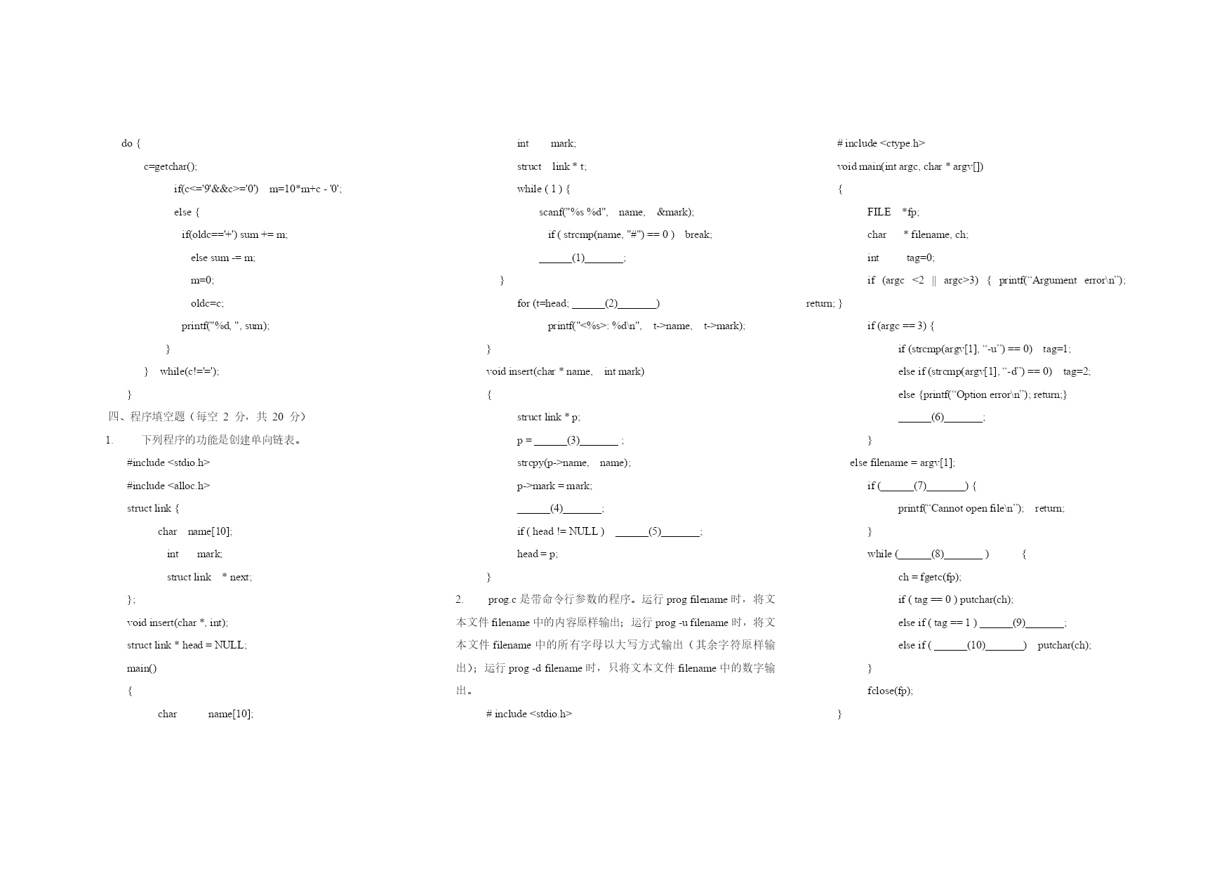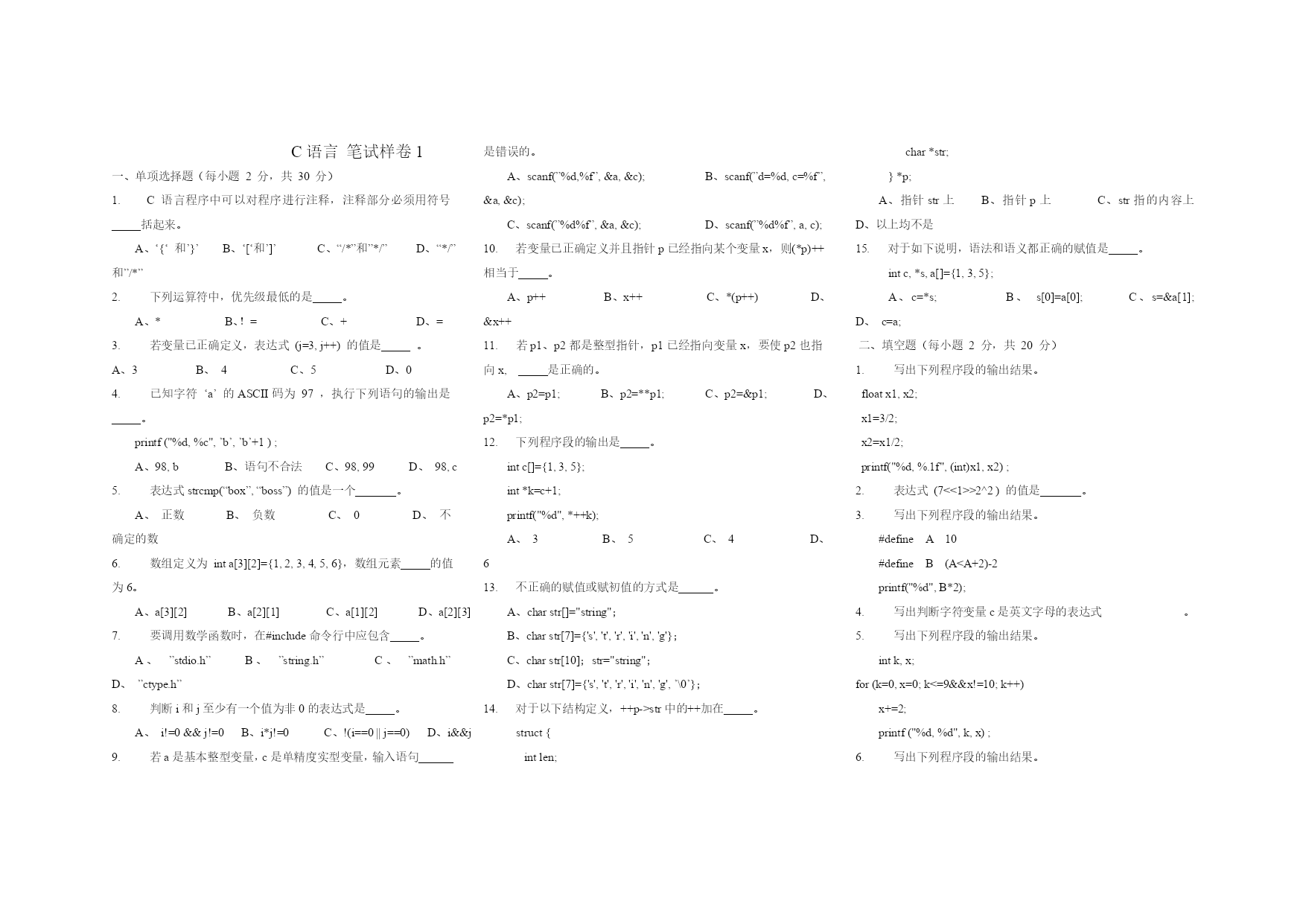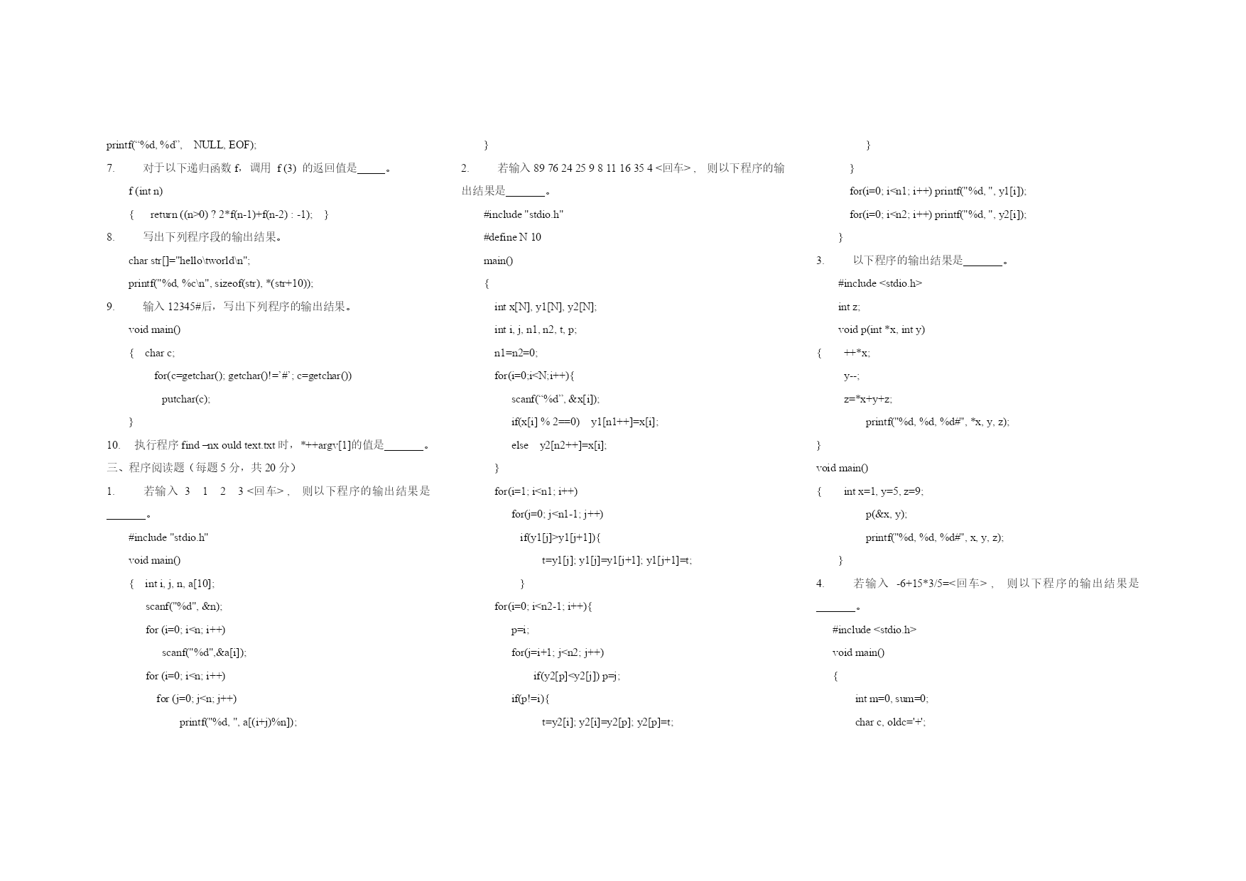 C语言笔试样卷1 一、单项选择题(每小题2分,共30分) 1.C语言程序中可以对程序进行注释,注释部分必须用符号_____括起来。 A、‘{‘和’}’B、‘[‘和’]’C、“/*”和”*/”D、“*/”和”/*” 2.下列运算符中,优先级最低的是_____。 A、*B、!=C、+D、= 3.若变量已正确定义,表达式(j=3,j++)的值是_____。 A、3B、4C、5D、0 4.已知字符‘a’的ASCII码为97,执行下列语句的输出是_____。 printf("%d,%c",’b’,’b’+1); A、98,bB、语句不合法C、98,99D、98,c 5.表达式strcmp(“box”,“boss”)的值是一个_______。 A、正数B、负数C、0D、不确定的数 6.数组定义为inta[3][2]={1,2,3,4,5,6},数组元素_____的值为6。 A、a[3][2]B、a[2][1]C、a[1][2]D、a[2][3] 7.要调用数学函数时,在#include命令行中应包含_____。 A、”stdio.h”B、”string.h”C、”math.h”D、”ctype.h” 8.判断i和j至少有一个值为非0的表达式是_____。 A、i!=0&&j!=0B、i*j!=0C、!(i==0||j==0)D、i&&j 9.若a是基本整型变量,c是单精度实型变量,输入语句______是错误的。 A、scanf(”%d,%f”,&a,&c);B、scanf(”d=%d,c=%f”,&a,&c); C、scanf(”%d%f”,&a,&c);D、scanf(”%d%f”,a,c); 10.若变量已正确定义并且指针p已经指向某个变量x,则(*p)++相当于_____。 A、p++B、x++C、*(p++)D、&x++ 11.若p1、p2都是整型指针,p1已经指向变量x,要使p2也指向x,_____是正确的。 A、p2=p1;B、p2=**p1;C、p2=&p1;D、p2=*p1; 12.下列程序段的输出是_____。 intc[]={1,3,5}; int*k=c+1; printf("%d",*++k); A、3B、5C、4D、6 13.不正确的赋值或赋初值的方式是______。 A、charstr[]="string"; B、charstr[7]={'s','t','r','i','n','g'}; C、charstr[10];str="string"; D、charstr[7]={'s','t','r','i','n','g',’\0’}; 14.对于以下结构定义,++p->str中的++加在_____。 struct{ intlen; char*str; }*p; A、指针str上B、指针p上C、str指的内容上D、以上均不是 15.对于如下说明,语法和语义都正确的赋值是_____。 intc,*s,a[]={1,3,5}; A、c=*s;B、s[0]=a[0];C、s=&a[1];D、c=a; 二、填空题(每小题2分,共20分) 1.写出下列程序段的输出结果。 floatx1,x2; x1=3/2; x2=x1/2; printf("%d,%.1f",(int)x1,x2); 2.表达式(7<<1>>2^2)的值是_______。 3.写出下列程序段的输出结果。 #defineA10 #defineB(A<A+2)-2 printf("%d",B*2); 4.写出判断字符变量c是英文字母的表达式。 5.写出下列程序段的输出结果。 intk,x; for(k=0,x=0;k<=9&&x!=10;k++) x+=2; printf("%d,%d",k,x); 6.写出下列程序段的输出结果。 printf(“%d,%d”,NULL,EOF); 7.对于以下递归函数f,调用f(3)的返回值是_____。 f(intn) {return((n>0)?2*f(n-1)+f(n-2):-1);} 8.写出下列程序段的输出结果。 charstr[]="hello\tworld\n"; printf("%d,%c\n",sizeof(str),*(str+10)); 9.输入12345#后,写出下列程序的输出结果。 voidmain() {charc; for(c=getchar();getchar()!=’#’;c=getchar()) putchar(c); } 10.执行程序find–nxouldtext.txt时,*++argv[1]的值是_______。 三、程序阅读题(每题5分,共20分) 1.若输入3123<回车>,则以下程序的输出结果是_______。 #include"stdio.h" voidmain(