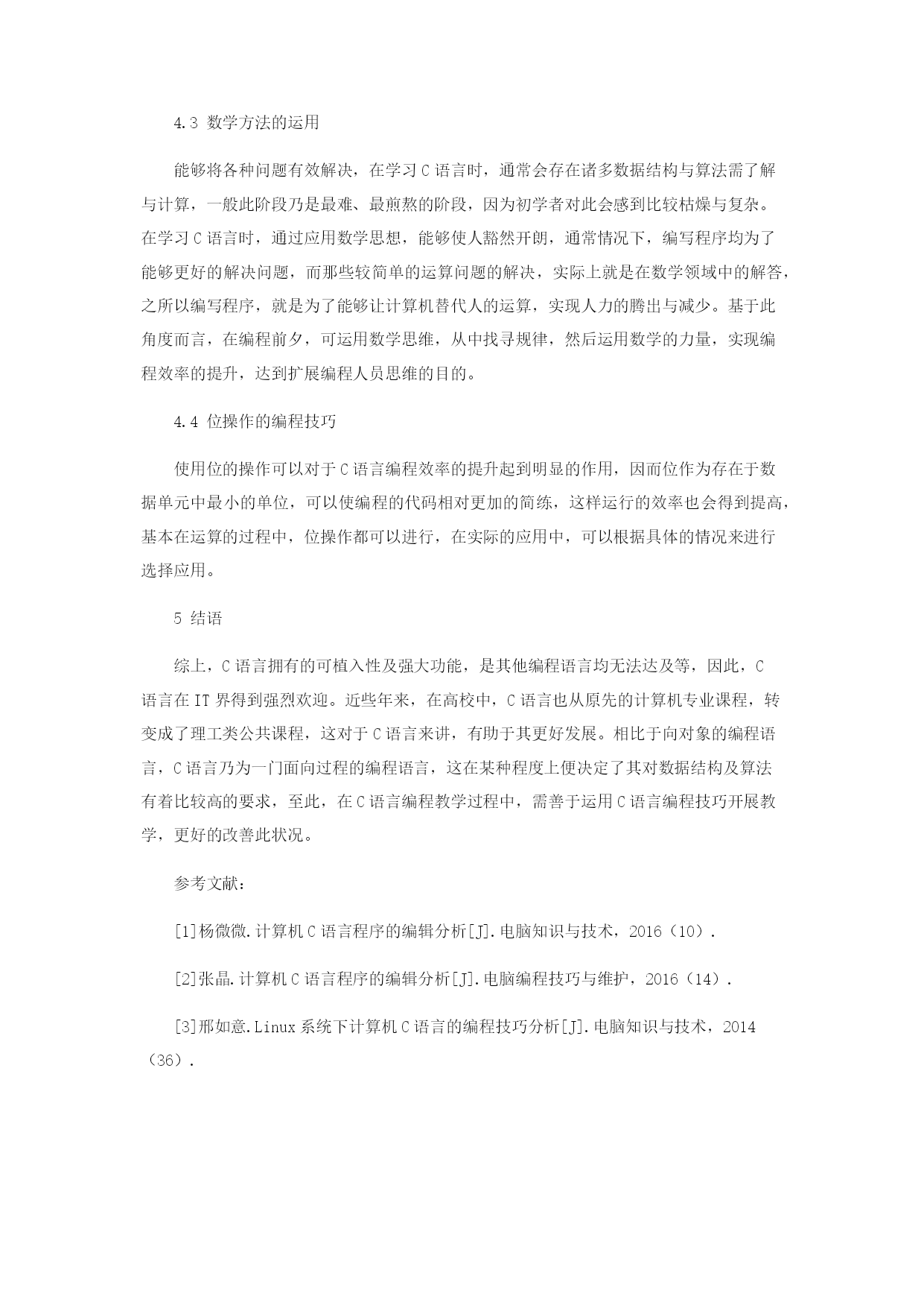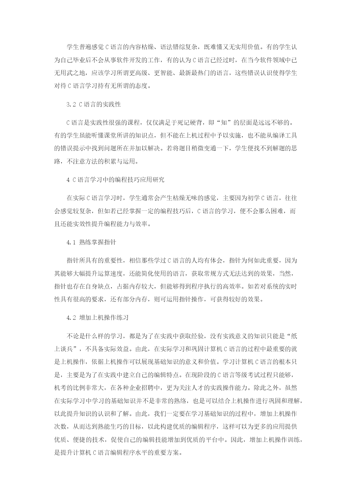 C语言编程技巧在C语言学习中的应用 HYPERLINK"https://m.zqwdw.com/wenku/renwensheke/2020/0331/151252.html" 摘要:计算机C语言编辑程序是提升计算机技术质量的重点,依据现阶段网络技术平台和计算机C语言编辑程序,结合社会环境和企业发展对于计算机技术的需求,分析計算机C语言编辑程序技巧和应用,提出优质的计算机C语言编辑程序,起到提升计算机语言编辑程序质量的效果。 关键词:C语言编程;C语言学习;应用 1引言 C语言凭借着强大的功能和广泛的应用,一直在编程领域中占着重要地位,目前许多学校也将其作为主要的课程之一,重要性显而易见,C语言是将汇编语言与编程语言融为一体,尽管C语言如此重要,但在实际教学之中往往出现学生的学习能力不强,认为C语言晦涩难懂,在学习过程中相当吃力,达不到理想的教学效果,因而,在实际的C语言学习过程中,更要注重编程技巧。 2C语言编程技术重要性 各国之间的核心技术较量也在如火如荼地进行,如何掌握计算机技术的前沿科技对于改变整个世界的经济形势都有重要影响。计算机软件结构中,不同层次都存在不同的依赖关系,分析介绍这种依赖关系,就是C语言编程技术的内涵。 为了实现对软件功能的不断完善,使其具有多样性、越来越可靠的特点,计算机软件在运行时应该确保能够具备基本的灵活性和稳定性,为后续开发和程序优化提供便利条件。将这项技术不断完善,同时应用到开发工作中去,具有明显的应用意义。这些意义主要体现在促进计算机软件系统全面提升、促进计算机软件性能和质量不断改善以及促进硬件和底层构建之间的联系。功能具备拓展性,是计算机软件开发设计中的一项重要工作,C语言编程技术的特征决定了在软件开发时,可以保证对功能的不断拓展;C语言编程技术的使用,有效改善了软件系统的稳定性,延长了计算机软件的使用寿命,为计算机性能以及质量的改善提供了更多的可能;C语言编程技术的使用,还有利于服务器跟计算机之间形成一种联系,方便两者之间相互促进相互发展。 3C语言学习中存在的问题 3.1C语言的内容枯燥、语法错综复杂 学生普遍感觉C语言的内容枯燥、语法错综复杂,既难懂又无实用价值。有的学生认为自己毕业后不会从事软件开发的工作,有的认为C语言已经过时,在当今软件领域中已无用武之地,应该学习所谓更高级、更智能、最新最热门的语言,这些错误认识使得学生对待C语言学习持有无所谓的态度。 3.2C语言的实践性 C语言是实践性很强的课程,仅仅满足于死记硬背,即“知”的层面是远远不够的。有的学生虽能听懂课堂所讲的知识点,但不能在上机过程中予以实施,也不能从编译工具的错误提示中找到问题所在并加以解决。若将题目稍微变通一下,学生便找不到解题的思路,不注意方法的积累与运用。 4C语言学习中的编程技巧应用研究 在实际C语言学习时,学生通常会产生枯燥无味的感觉,主要因为初学C语言,往往会感觉较复杂,但如若已经掌握一定的编程技巧后,C语言的学习,便不会那么困难,而且还能实效性提升编程能力与效率。 4.1熟练掌握指针 指针所具有的重要性,相信那些学过C语言的人均有体会,指针为何如此重要,因为其能够大幅提升运算速度,还能简化使用的语言,获取常规方式无法达到的效果,当然,指针也存在自身缺点,占据内存较大,但能够得到程序执行的高效率。如若对系统的实时性具有很高的要求,还有部分内存,则可运用指针操作,可获得较好的效果。 4.2增加上机操作练习 不论是什么样的学习,都是为了在实践中获取经验,没有实践意义的知识只能是“纸上谈兵”,不具备实际效益。由此,在实际学习和巩固计算机C语言的过程中最重要的就是上机操作,依据上机操作可以展现基础知识的意义和价值。学习计算机C语言的根本只是,主要是为了在实践中建立自己的编辑特点。在现阶段的C语言等级考试过程只能够,机考的比例非常大,在各种企业招聘中,更为关注人才的实践操作能力。除此之外,虽然在实际学习中学习的基础知识并不是非常的熟络,也是可以结合上机操作进行巩固和理解,以此提升知识的认识和了解。由此,我们一定要在学习基础知识的过程中,增加上机操作次数,从而达到熟能生巧的目标,以此构建优质的编辑程序,这样可以为更多的应用提供优质、便捷的技术,促使自己的编辑技能增加到优质的平台中。因此,增加上机操作训练,是提升计算机C语言编辑程序水平的重要方案。 4.3数学方法的运用 能够将各种问题有效解决,在学习C语言时,通常会存在诸多数据结构与算法需了解与计算,一般此阶段乃是最难、最煎熬的阶段,因为初学者对此会感到比较枯燥与复杂。在学习C语言时,通过应用数学思想,能够使人豁然开朗,通常情况下,编写程序均为了能够更好的解决问题,而那些较简单的运算问题的解决,实际上就是在数学领域中的解答,之所以编写程序,就是为了能够让