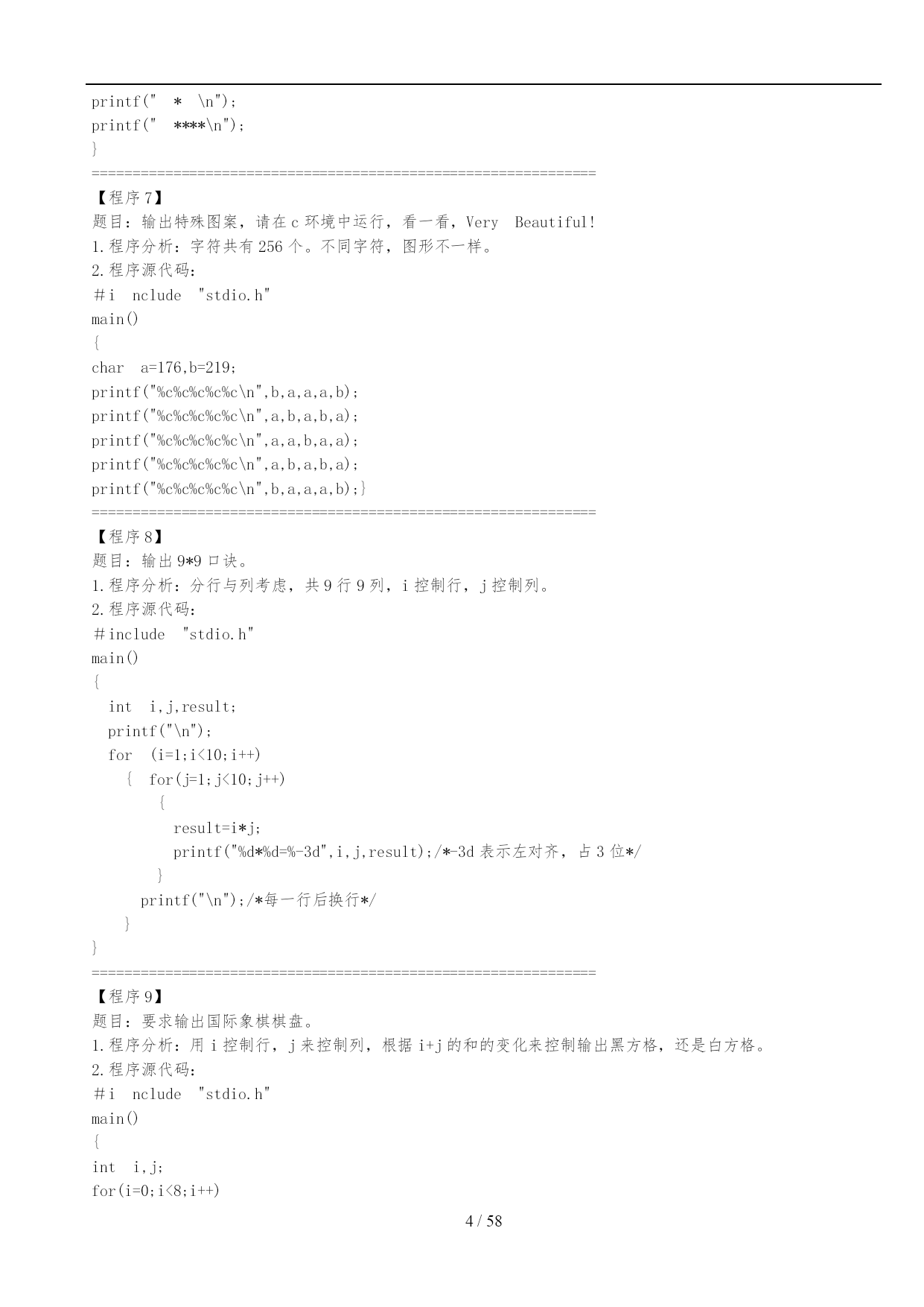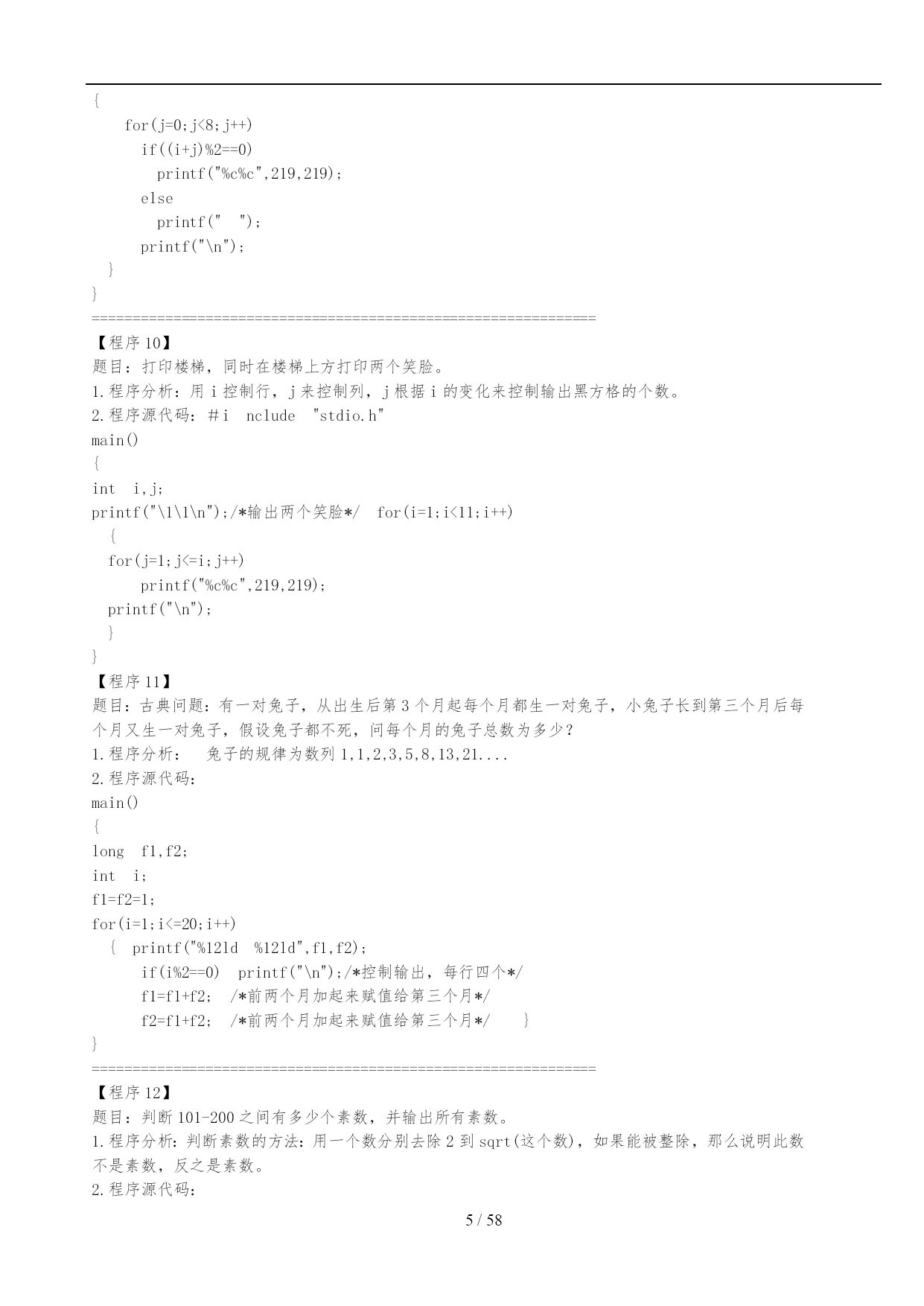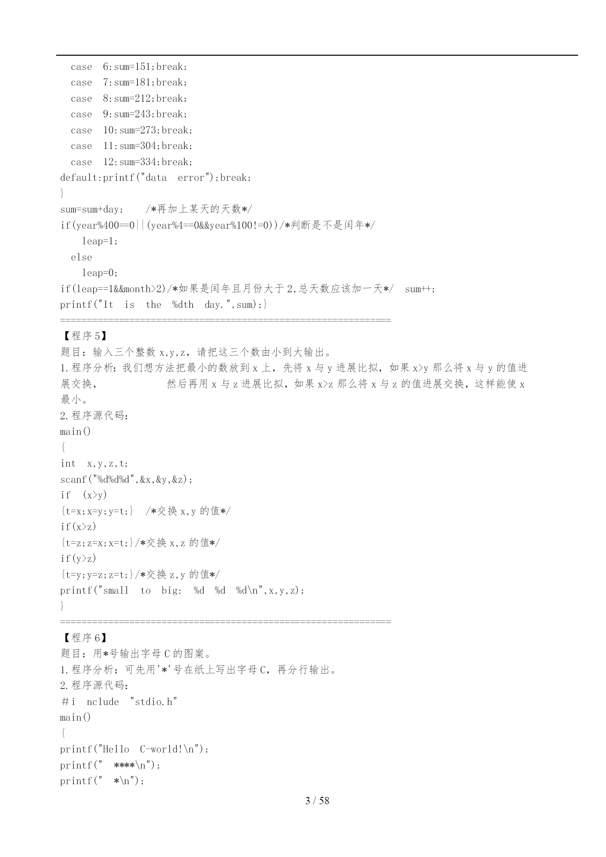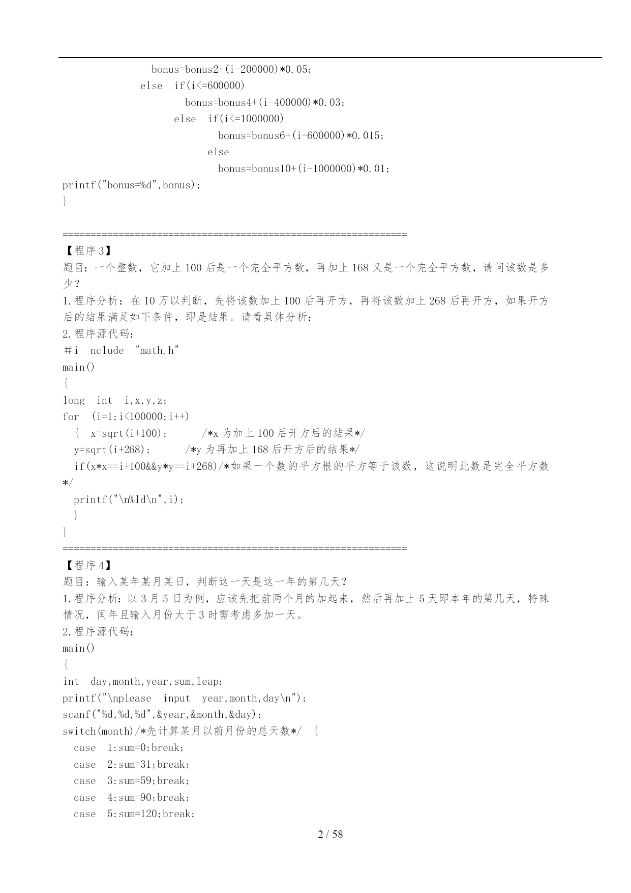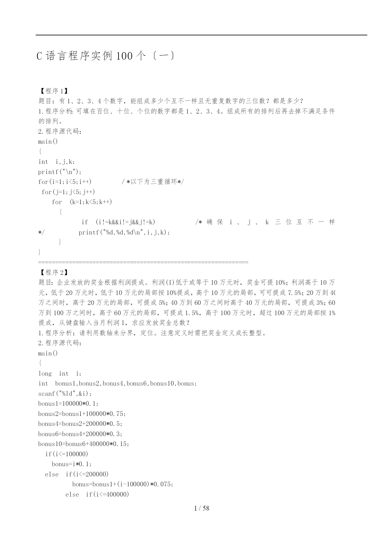 /NUMPAGES58 C语言程序实例100个〔一〕 【程序1】题目:有1、2、3、4个数字,能组成多少个互不一样且无重复数字的三位数?都是多少?1.程序分析:可填在百位、十位、个位的数字都是1、2、3、4。组成所有的排列后再去掉不满足条件的排列。2.程序源代码:main(){inti,j,k;printf("\n");for(i=1;i<5;i++)/*以下为三重循环*/ for(j=1;j<5;j++)for(k=1;k<5;k++){if(i!=k&&i!=j&&j!=k)/*确保i、j、k三位互不一样*/printf("%d,%d,%d\n",i,j,k);}}==============================================================【程序2】题目:企业发放的奖金根据利润提成。利润(I)低于或等于10万元时,奖金可提10%;利润高于10万元,低于20万元时,低于10万元的局部按10%提成,高于10万元的局部,可可提成7.5%;20万到40万之间时,高于20万元的局部,可提成5%;40万到60万之间时高于40万元的局部,可提成3%;60万到100万之间时,高于60万元的局部,可提成1.5%,高于100万元时,超过100万元的局部按1%提成,从键盘输入当月利润I,求应发放奖金总数?1.程序分析:请利用数轴来分界,定位。注意定义时需把奖金定义成长整型。2.程序源代码:main(){longinti;intbonus1,bonus2,bonus4,bonus6,bonus10,bonus;scanf("%ld",&i);bonus1=100000*0.1; bonus2=bonus1+100000*0.75;bonus4=bonus2+200000*0.5;bonus6=bonus4+200000*0.3;bonus10=bonus6+400000*0.15;if(i<=100000)bonus=i*0.1;elseif(i<=200000)bonus=bonus1+(i-100000)*0.075;elseif(i<=400000)bonus=bonus2+(i-200000)*0.05;elseif(i<=600000)bonus=bonus4+(i-400000)*0.03;elseif(i<=1000000)bonus=bonus6+(i-600000)*0.015;elsebonus=bonus10+(i-1000000)*0.01;printf("bonus=%d",bonus);}==============================================================【程序3】题目:一个整数,它加上100后是一个完全平方数,再加上168又是一个完全平方数,请问该数是多少?1.程序分析:在10万以判断,先将该数加上100后再开方,再将该数加上268后再开方,如果开方后的结果满足如下条件,即是结果。请看具体分析:2.程序源代码:#include"math.h"main(){longinti,x,y,z;for(i=1;i<100000;i++){x=sqrt(i+100);/*x为加上100后开方后的结果*/ y=sqrt(i+268);/*y为再加上168后开方后的结果*/ if(x*x==i+100&&y*y==i+268)/*如果一个数的平方根的平方等于该数,这说明此数是完全平方数*/ printf("\n%ld\n",i);}}==============================================================【程序4】题目:输入某年某月某日,判断这一天是这一年的第几天?1.程序分析:以3月5日为例,应该先把前两个月的加起来,然后再加上5天即本年的第几天,特殊情况,闰年且输入月份大于3时需考虑多加一天。2.程序源代码:main(){intday,month,year,sum,leap;printf("\npleaseinputyear,month,day\n");scanf("%d,%d,%d",&year,&month,&day);switch(month)/*先计算某月以前月份的总天数*/{case1:sum=0;break;case2:sum=31;break;case3:sum=59;break;case4:sum=90;break;case5:sum=120;break;case6:sum=151;break;case7:sum=181;break;case8:sum=212;break;case9:sum=243;break;case10:sum=273;b