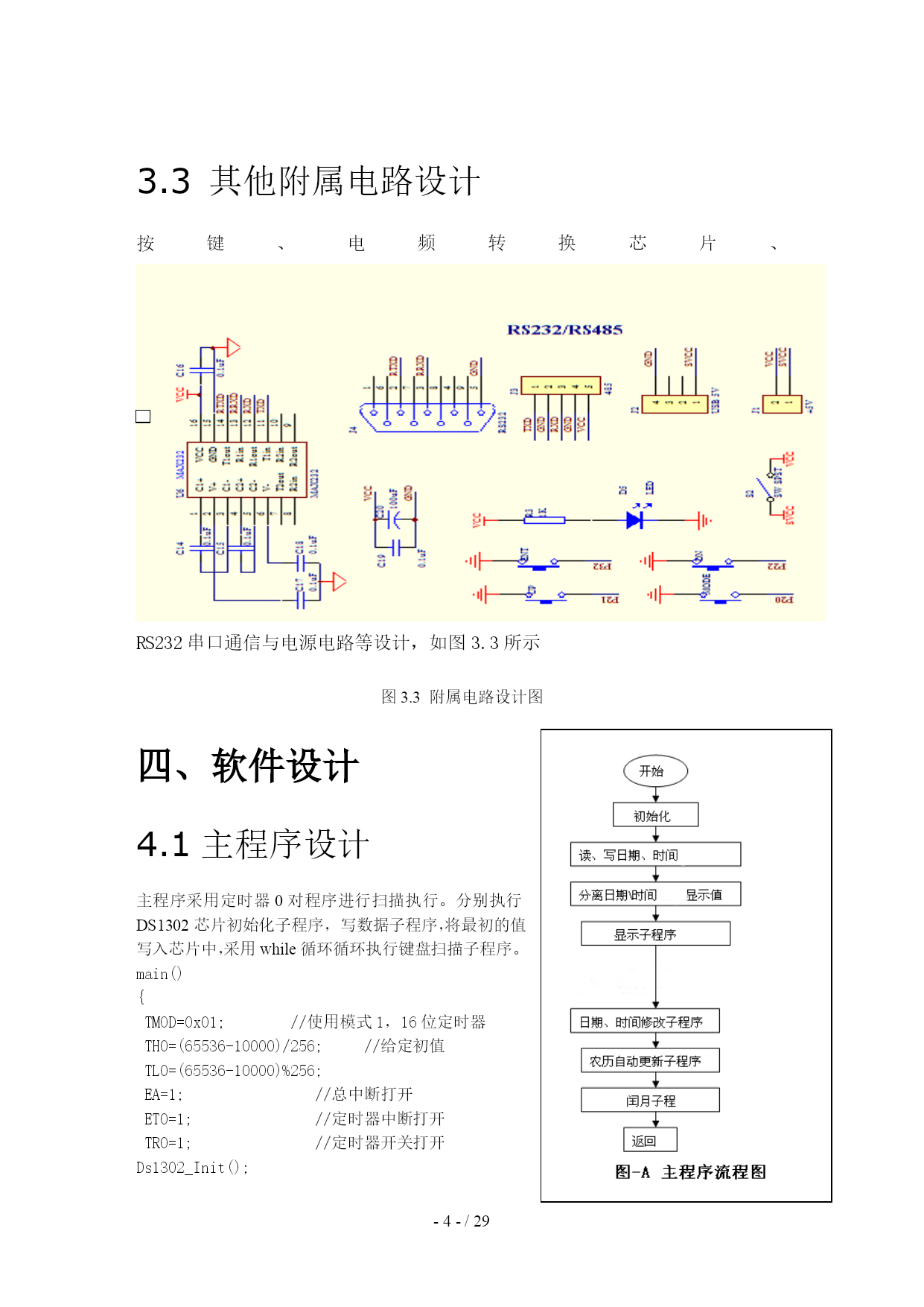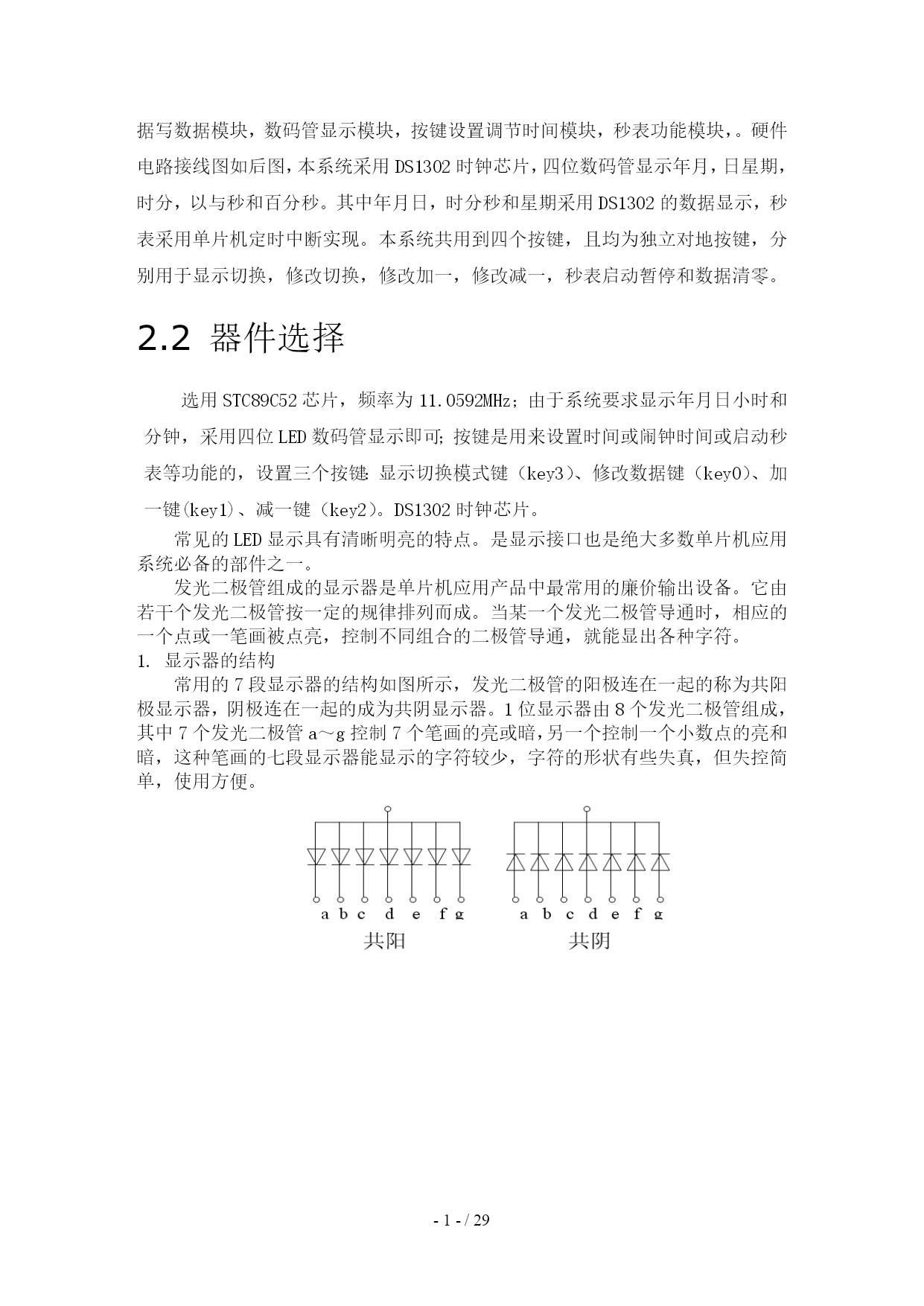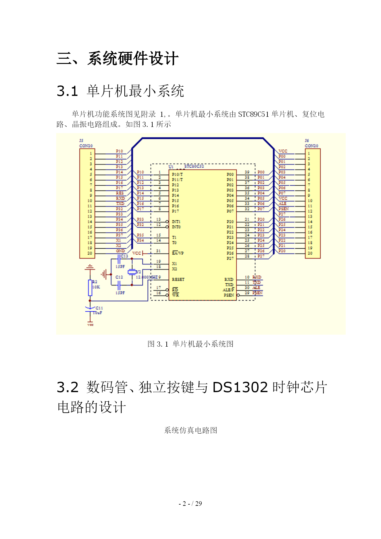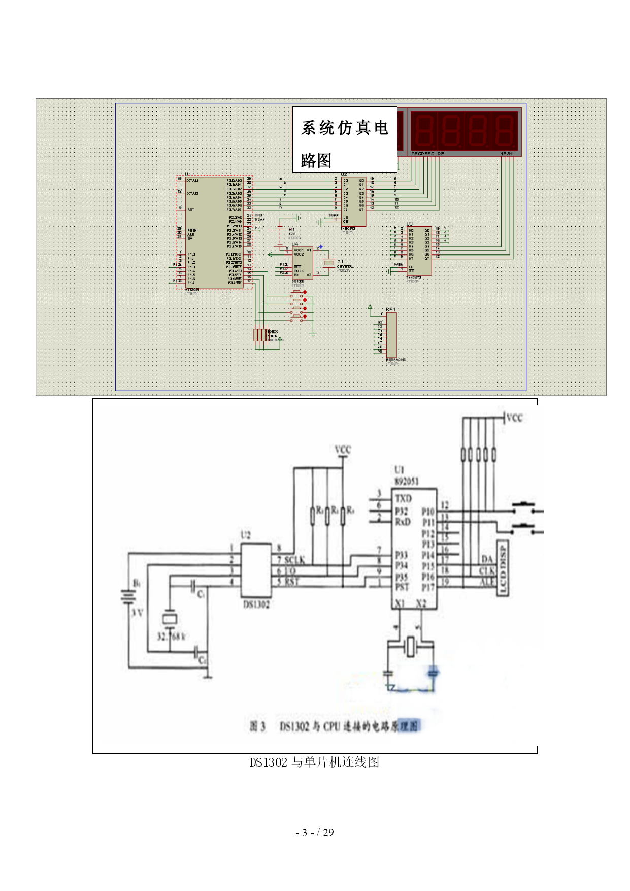 /NUMPAGES29 多功能电脑时钟设计报告 一、实训目的意义与任务要求 1.1目的意义 单片机的使用领域已十分广泛,如智能仪器仪表、实时工控、通讯设备、导航系统、家用电器等。“学好单片机,工作就不成问题了。”老师说,可见学好单片意义之重大。单片机作为一门基础学科,既是对前期学习C语言的综合运用,也是理论与实践相结合的一大体现。电脑时钟有效地检验了对DS1302时钟芯片,STC89C52单片机中断,独立键盘,数码管,蜂鸣器,LED灯的控制,同时提高了学生的工程系统设计能力。LED数字显示的日历钟显示清晰直观、走时准确、可以进行夜视,并且还可以扩展出多种功能。所以,电子万年历无论作为比赛题目还是练习题目都是很有价值。通过此次单片机系统综合训练,不仅要让学生认识了解它,而且增强学生学科积极性。 2.2任务要求 要求设计的电脑时钟完成以下功能: 1.基本功能 ①实时显示当前时间(4位数码管显示,2位显示小时,2位显示分钟,第2位小数点0.5秒亮,0.5秒灭)。 ②能用一按键依次切换显示年与月日。 ③能修改当前时钟。 ④具有秒表功能,显示秒和百分秒。 2.扩展功能 ①单片机与PC机的通讯(可选) ②可设定初值的倒计时功能(可选)③闹钟与报时功能(可选)。④显示星期(可选)。 二、实训方案 2.1系统分析 根据系统功能要求,可将系统组成结构分成四大部分:DS1302时钟芯片读数据写数据模块,数码管显示模块,按键设置调节时间模块,秒表功能模块,。硬件电路接线图如后图,本系统采用DS1302时钟芯片,四位数码管显示年月,日星期,时分,以与秒和百分秒。其中年月日,时分秒和星期采用DS1302的数据显示,秒表采用单片机定时中断实现。本系统共用到四个按键,且均为独立对地按键,分别用于显示切换,修改切换,修改加一,修改减一,秒表启动暂停和数据清零。 2.2器件选择 选用STC89C52芯片,频率为11.0592MHz;由于系统要求显示年月日小时和分钟,采用四位LED数码管显示即可;按键是用来设置时间或闹钟时间或启动秒表等功能的,设置三个按键:显示切换模式键(key3)、修改数据键(key0)、加一键(key1)、减一键(key2)。DS1302时钟芯片。 常见的LED显示具有清晰明亮的特点。是显示接口也是绝大多数单片机应用系统必备的部件之一。 发光二极管组成的显示器是单片机应用产品中最常用的廉价输出设备。它由若干个发光二极管按一定的规律排列而成。当某一个发光二极管导通时,相应的一个点或一笔画被点亮,控制不同组合的二极管导通,就能显出各种字符。 1.显示器的结构 常用的7段显示器的结构如图所示,发光二极管的阳极连在一起的称为共阳极显示器,阴极连在一起的成为共阴显示器。1位显示器由8个发光二极管组成,其中7个发光二极管a~g控制7个笔画的亮或暗,另一个控制一个小数点的亮和暗,这种笔画的七段显示器能显示的字符较少,字符的形状有些失真,但失控简单,使用方便。 三、系统硬件设计 3.1单片机最小系统 单片机功能系统图见附录1,。单片机最小系统由STC89C51单片机、复位电路、晶振电路组成。如图3.1所示 图3.1单片机最小系统图 3.2数码管、独立按键与DS1302时钟芯片电路的设计 系统仿真电路图 系统仿真电路图 DS1302与单片机连线图 3.3其他附属电路设计 按键、电频转换芯片、RS232串口通信与电源电路等设计,如图3.3所示 图3.3附属电路设计图 四、软件设计 4.1主程序设计 主程序采用定时器0对程序进行扫描执行。分别执行DS1302芯片初始化子程序,写数据子程序,将最初的值写入芯片中,采用while循环循环执行键盘扫描子程序。 main() { TMOD=0x01;//使用模式1,16位定时器 TH0=(65536-10000)/256;//给定初值 TL0=(65536-10000)%256; EA=1;//总中断打开 ET0=1;//定时器中断打开 TR0=1;//定时器开关打开 Ds1302_Init(); Ds1302_Write_Time(); while(1) { keyscan(); if(Btread==0) {Btread=1; Ds1302_Read_Time(); } display(); } 4.2DS1302子程序设计 此子程序分为初始化程序,读数据程序,写数据程序,一些数据程序为例; voidDs1302_Write_Byte(unsignedcharaddr,unsignedchard) { CE=0;_nop_(); SCLK=0;_nop_(); CE=1;_nop_(); Write1302(addr); Write1302(d); CE=0;_nop_(); I